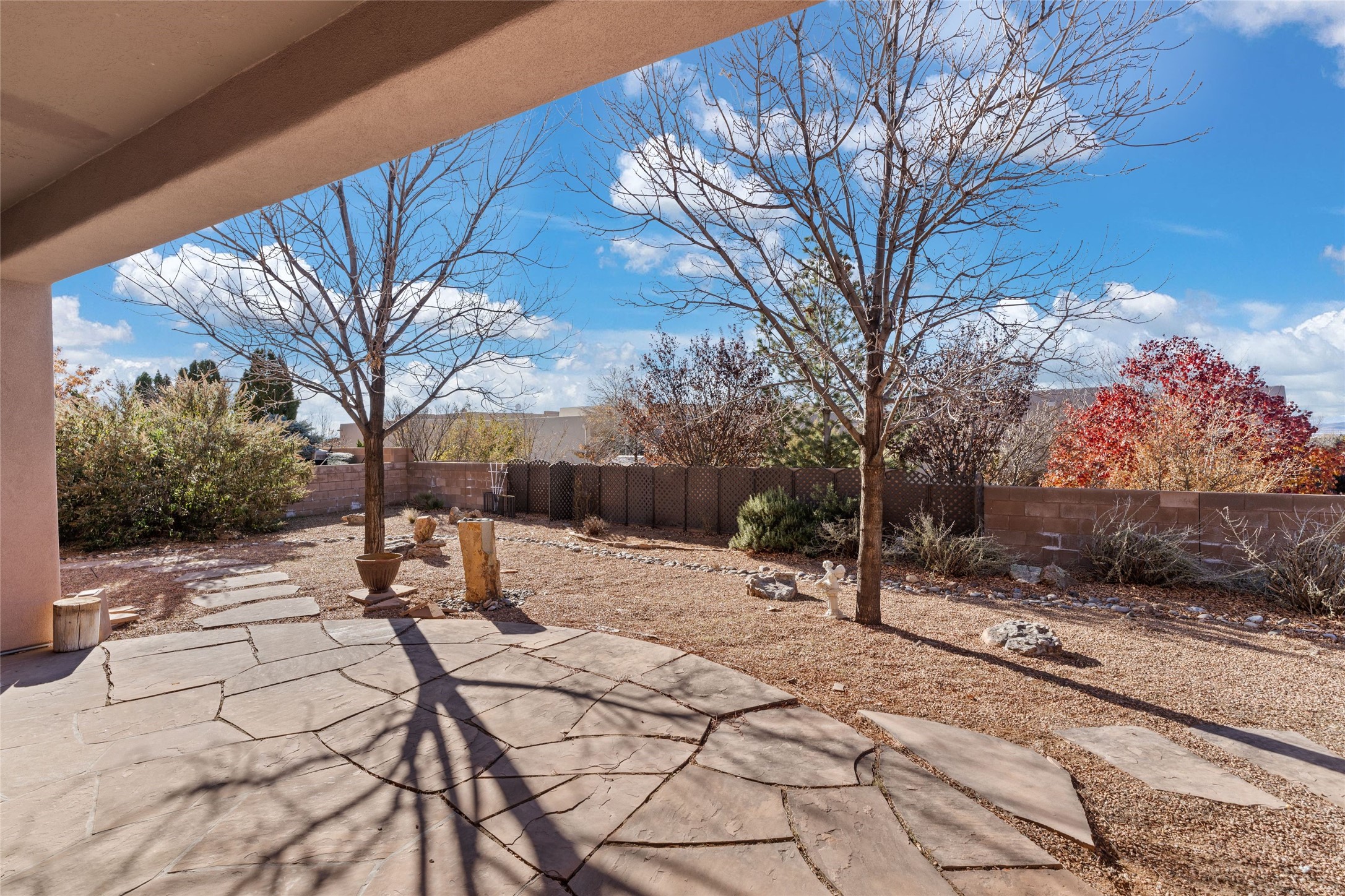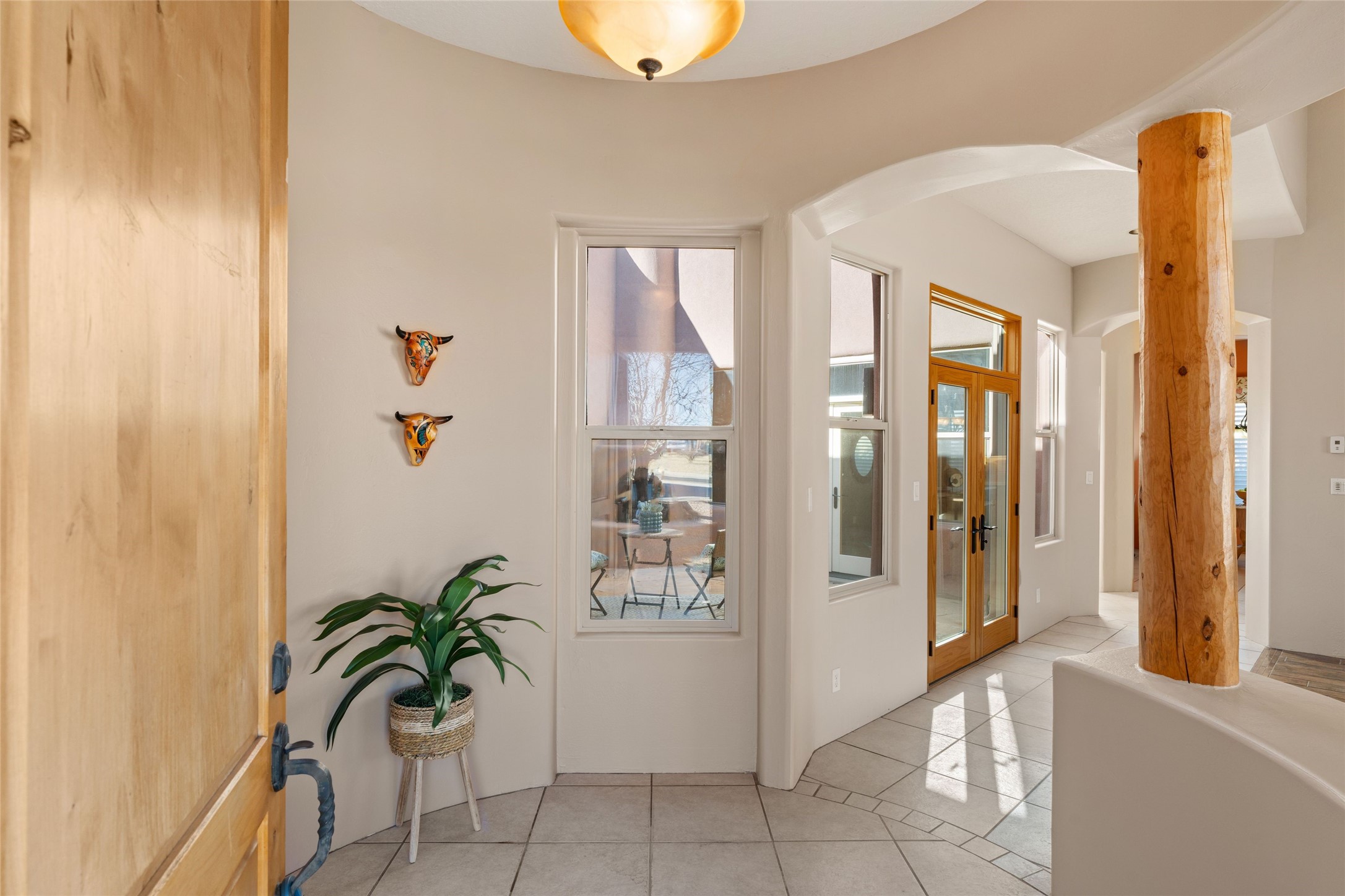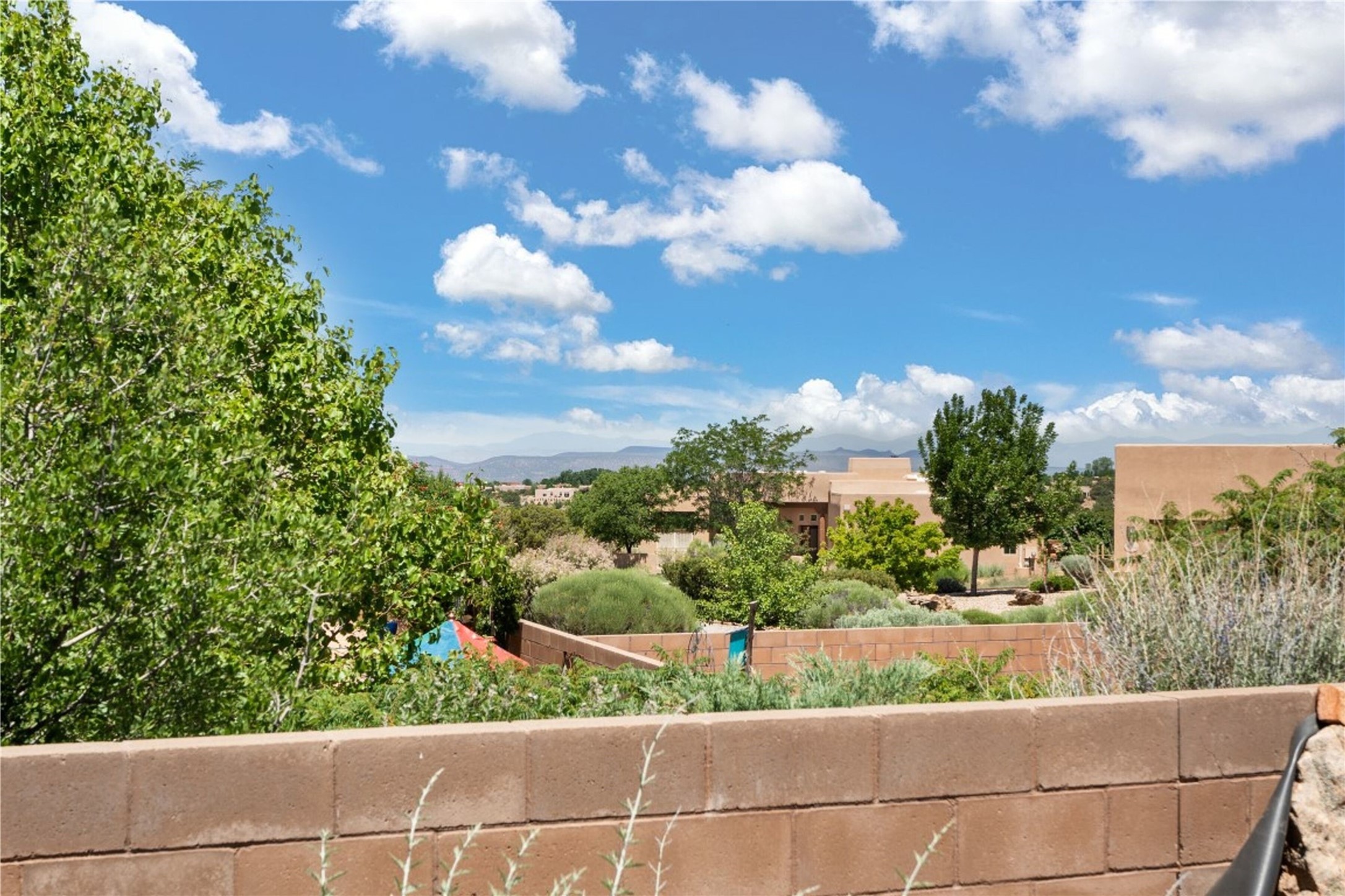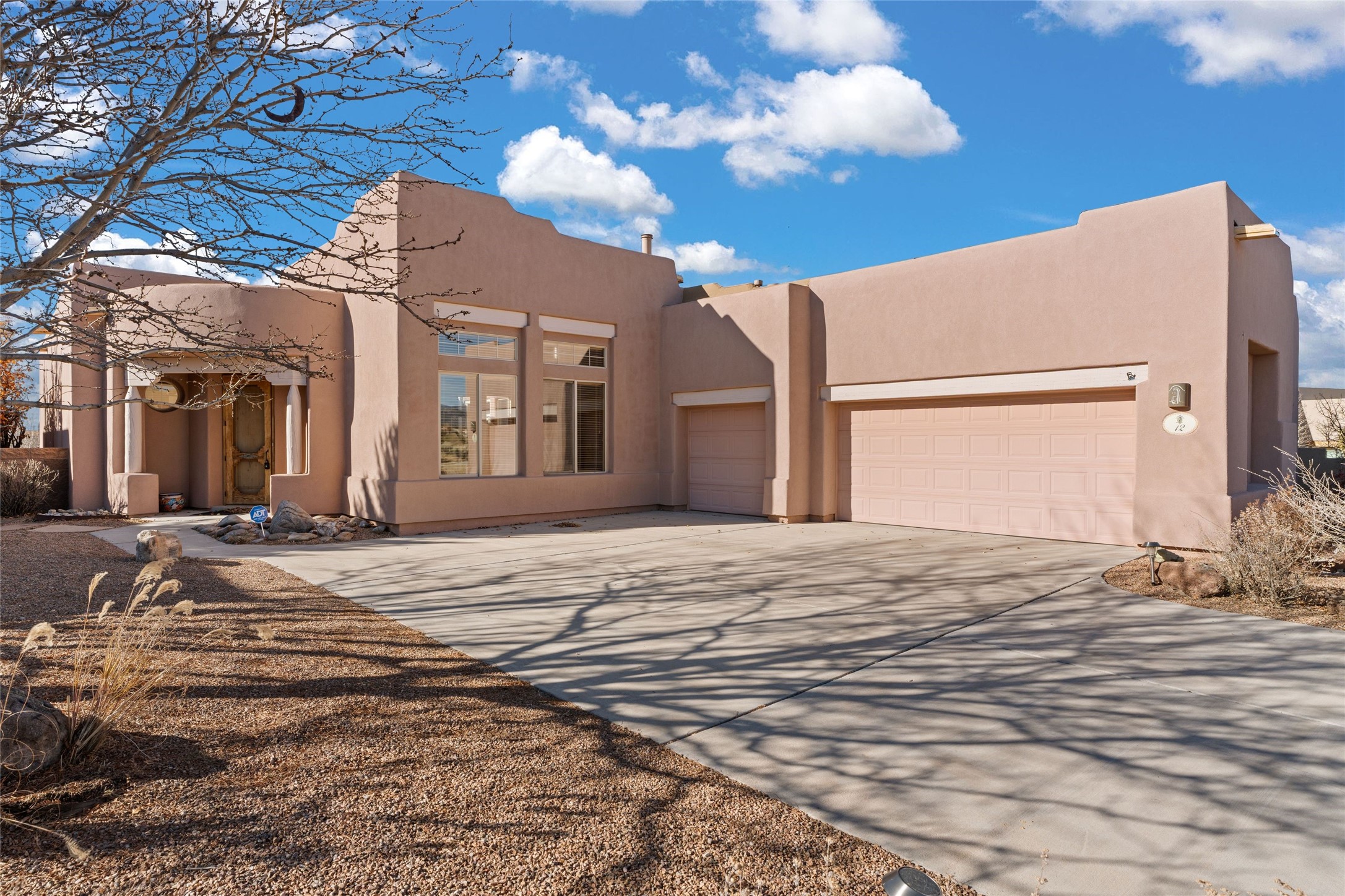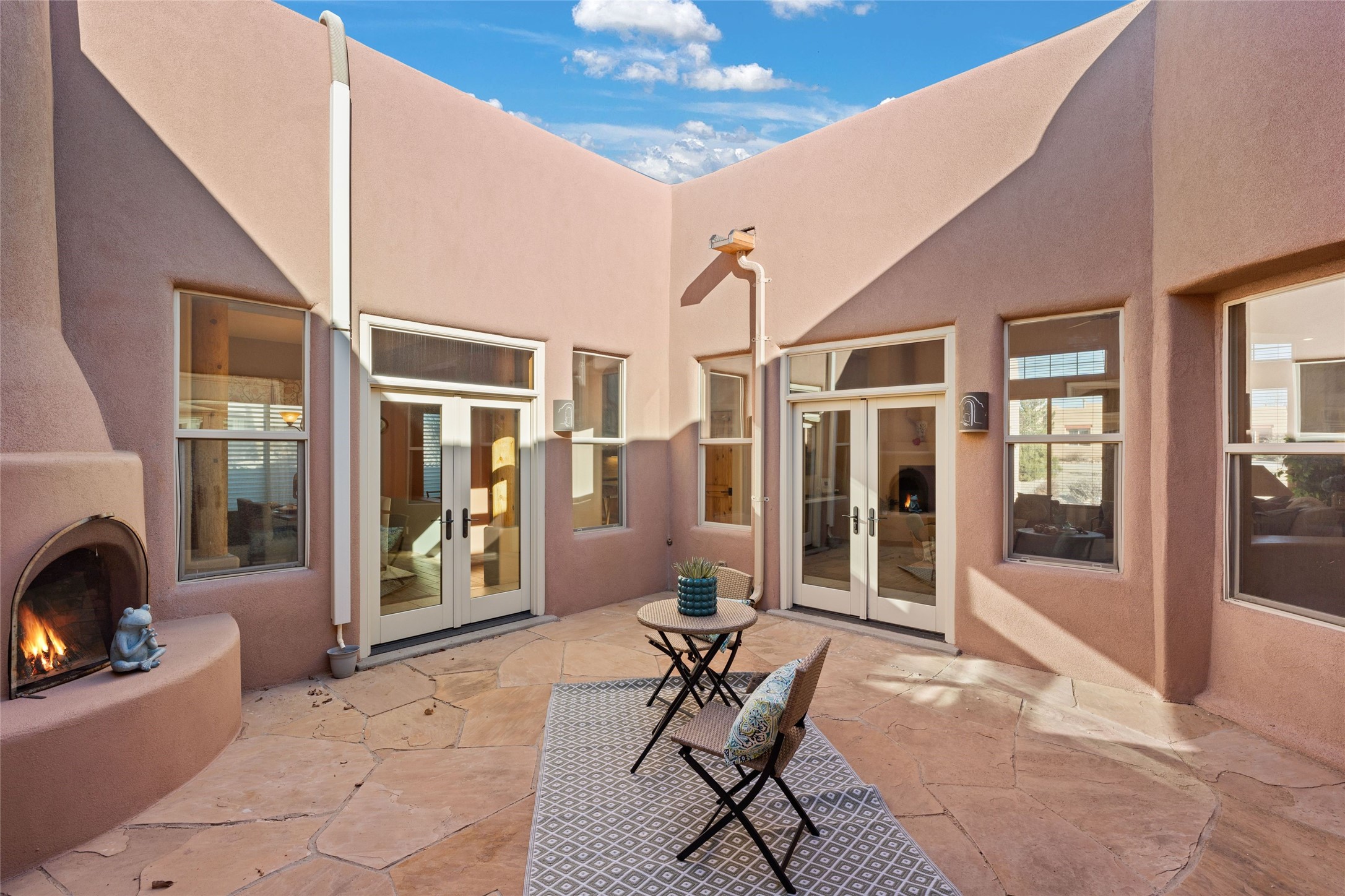 This gracious home, featuring a central courtyard, tile flooring, carpet only in primary bedroom, one gas and one wood burning Kiva fireplace, vigas in the living room, a study / TV room, formal and informal dining rooms, a gorgeous spa primary bathroom with glass blocks for soft light, a gourmet kitchen with stainless steel appliances, a new roof, and a three-car garage. Madre Mountain is a beautiful boulevard setting. This elegant home is a delight to experience!