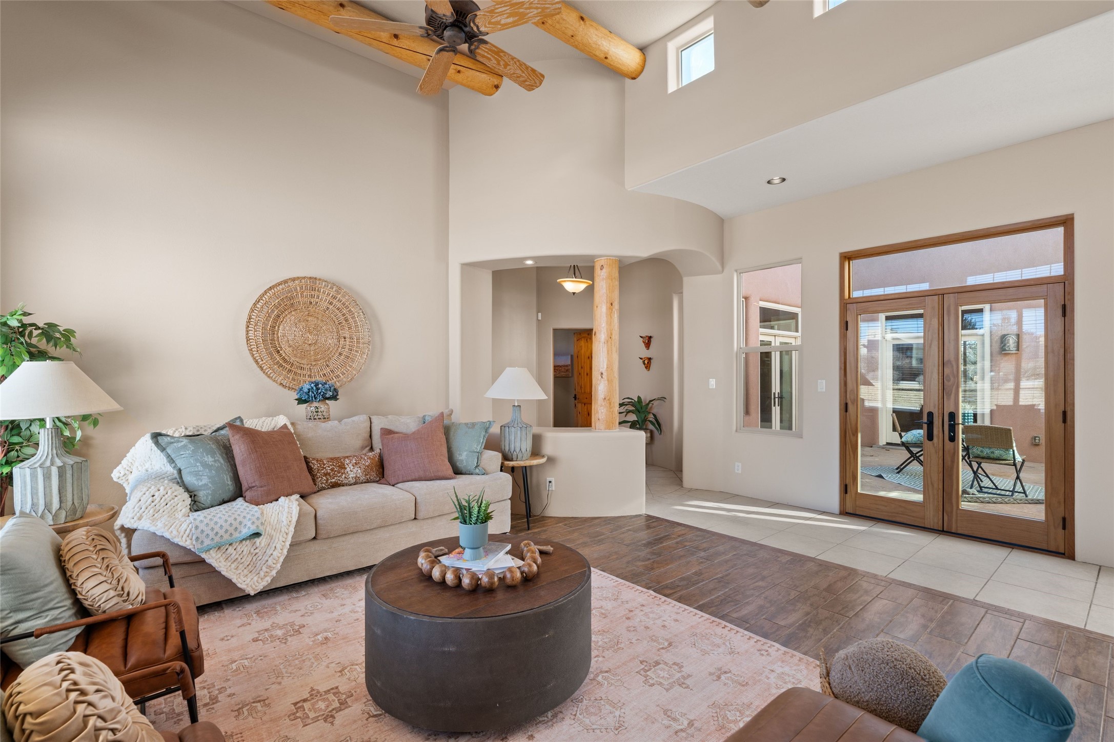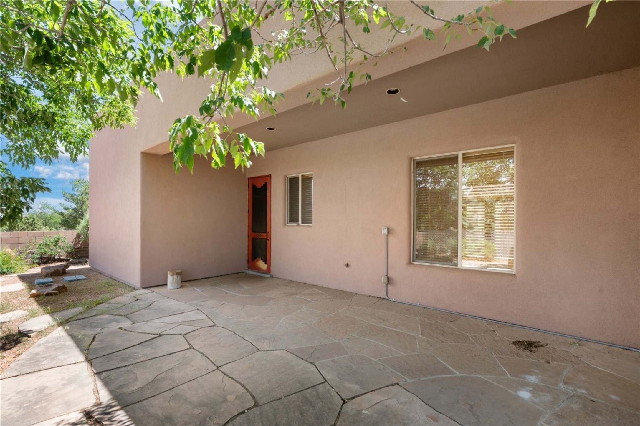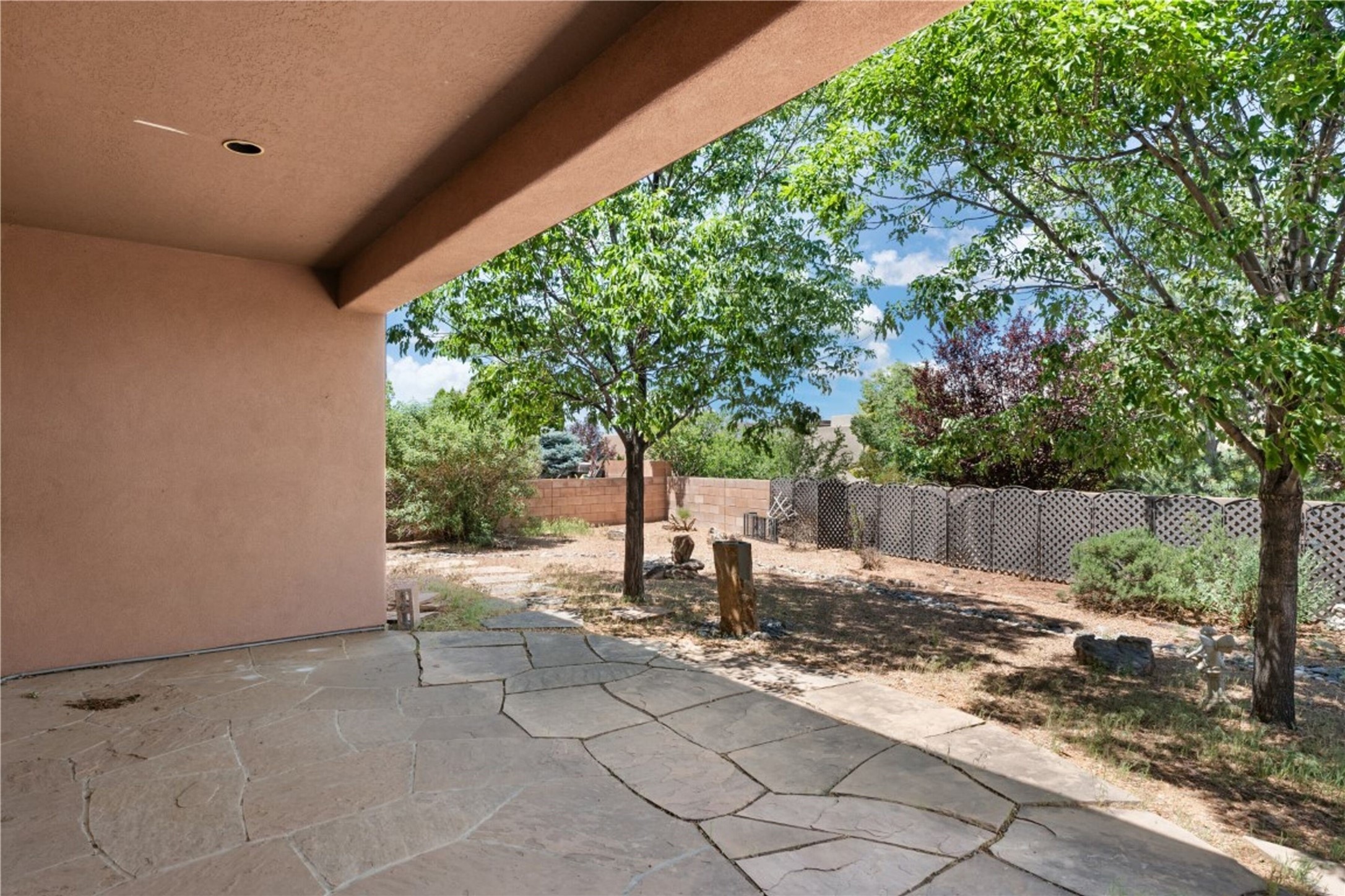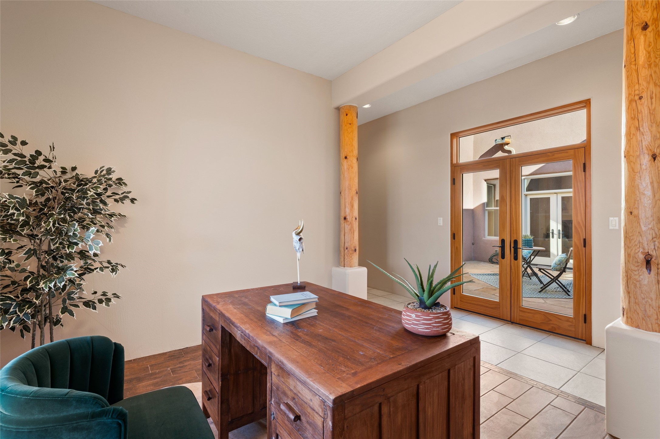 This gracious home, featuring a central courtyard, tile flooring, carpet only in primary bedroom, one gas and one wood burning Kiva fireplace, vigas in the living room, a study / TV room, formal and informal dining rooms, a gorgeous spa primary bathroom with glass blocks for soft light, a gourmet kitchen with stainless steel appliances, a new roof, and a three-car garage. Madre Mountain is a beautiful boulevard setting. This elegant home is a delight to experience!