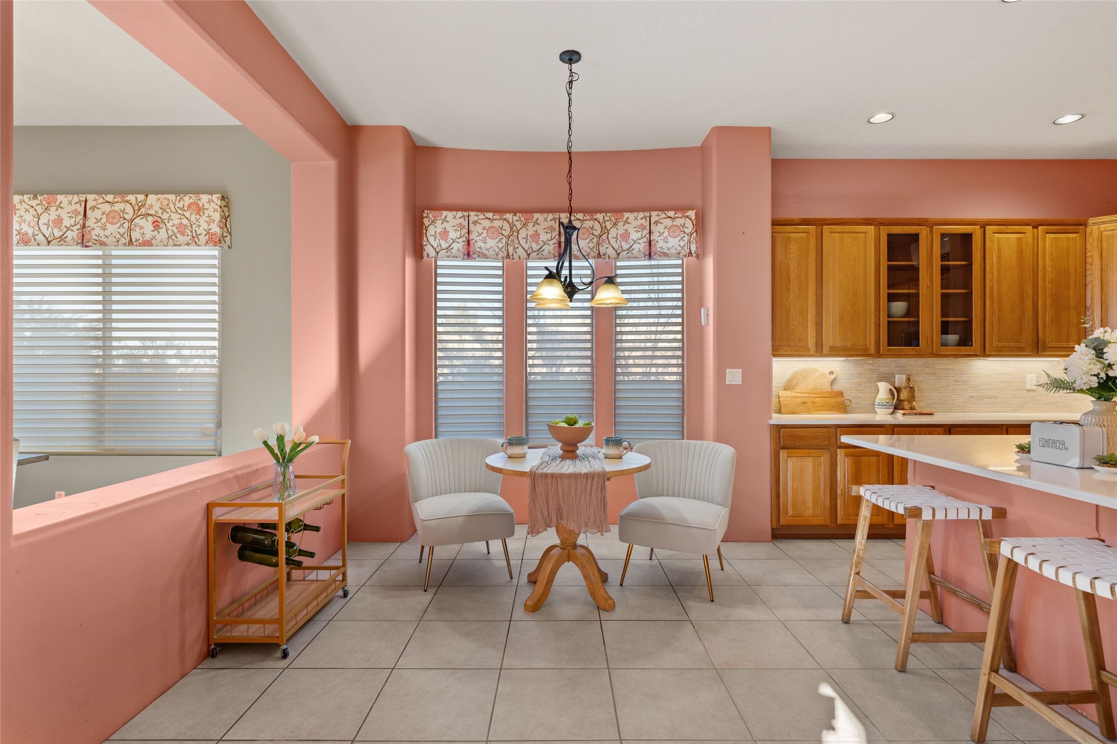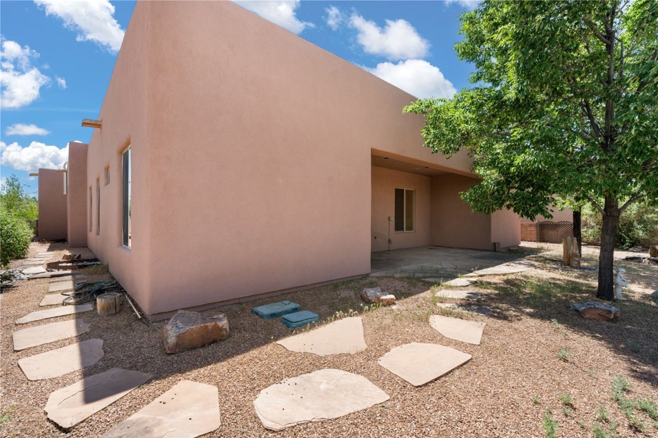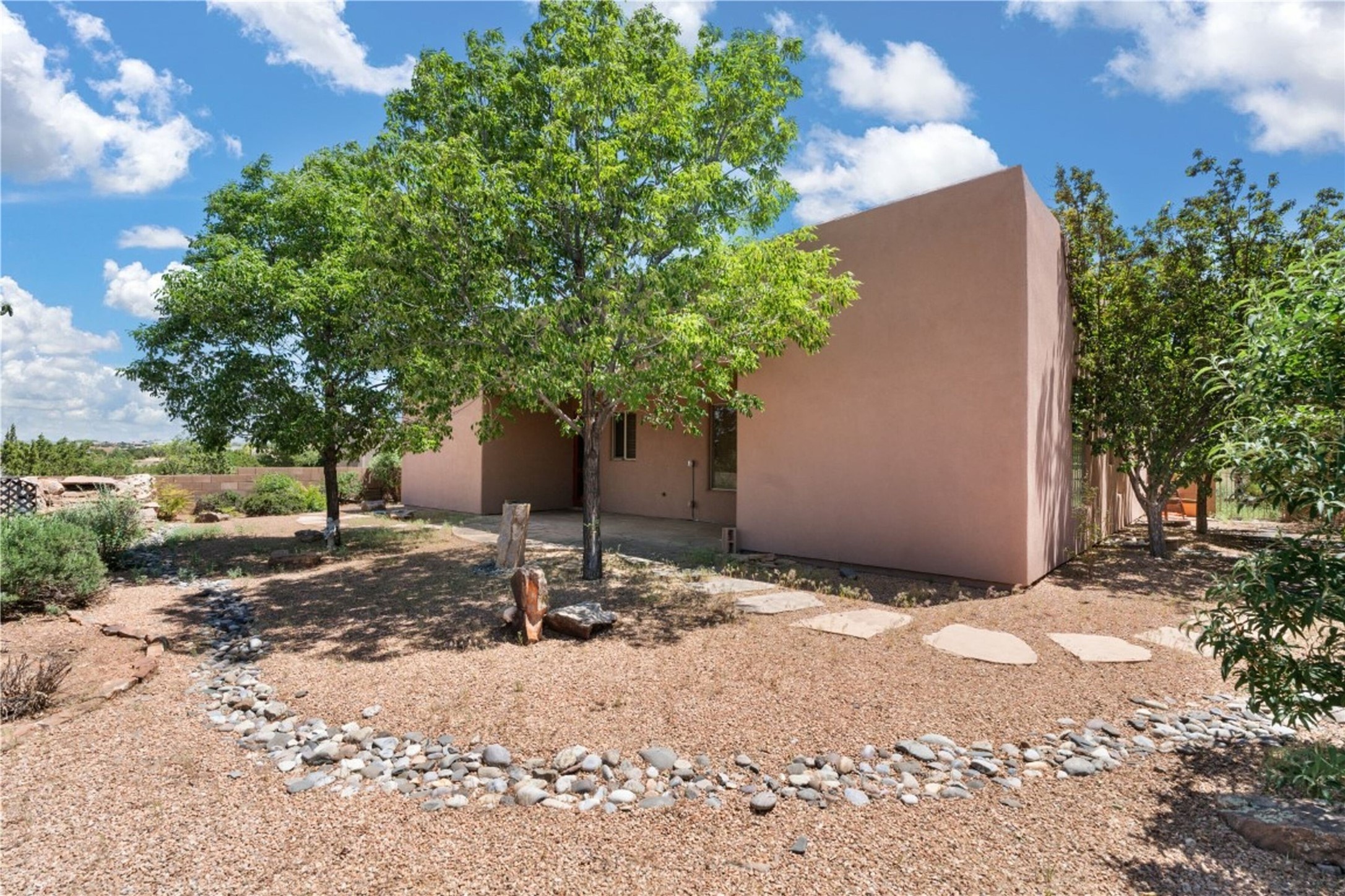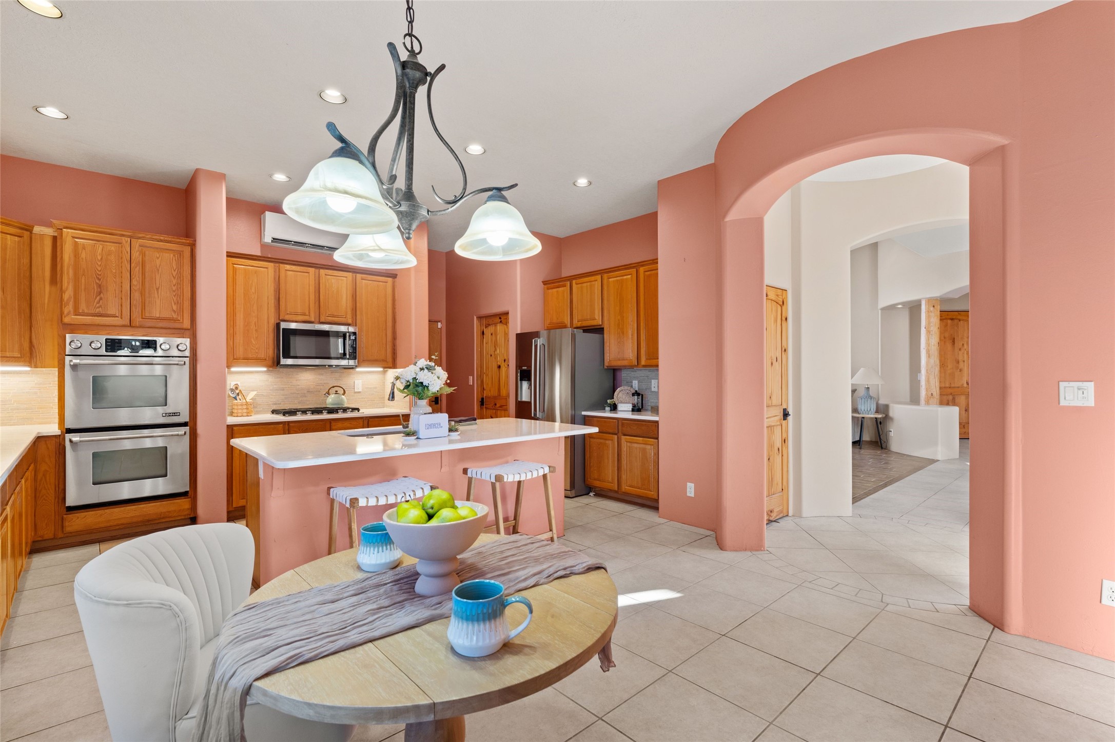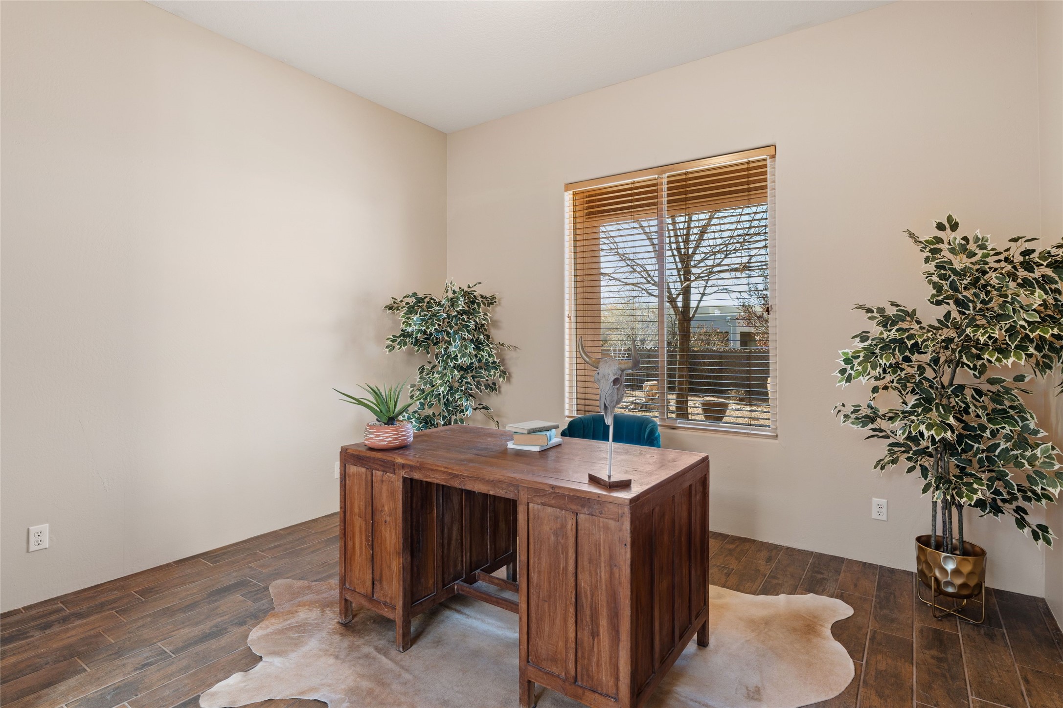 This gracious home, featuring a central courtyard, tile flooring, carpet only in primary bedroom, one gas and one wood burning Kiva fireplace, vigas in the living room, a study / TV room, formal and informal dining rooms, a gorgeous spa primary bathroom with glass blocks for soft light, a gourmet kitchen with stainless steel appliances, a new roof, and a three-car garage. Madre Mountain is a beautiful boulevard setting. This elegant home is a delight to experience!