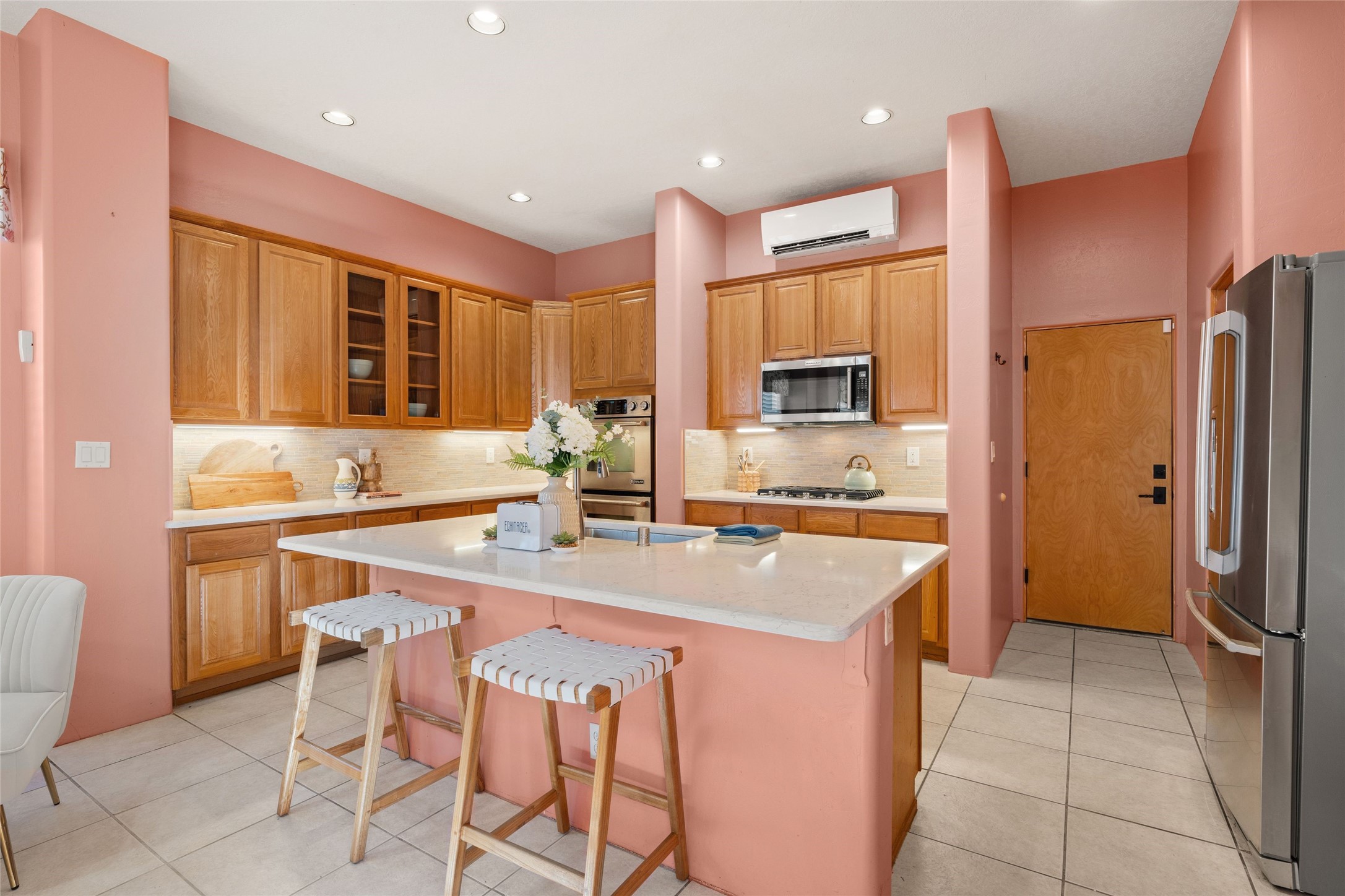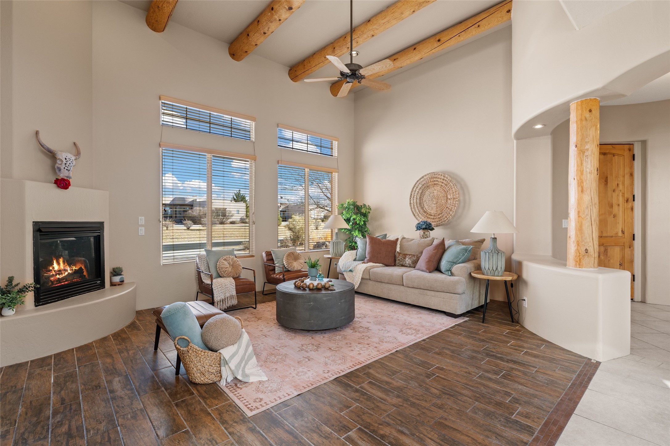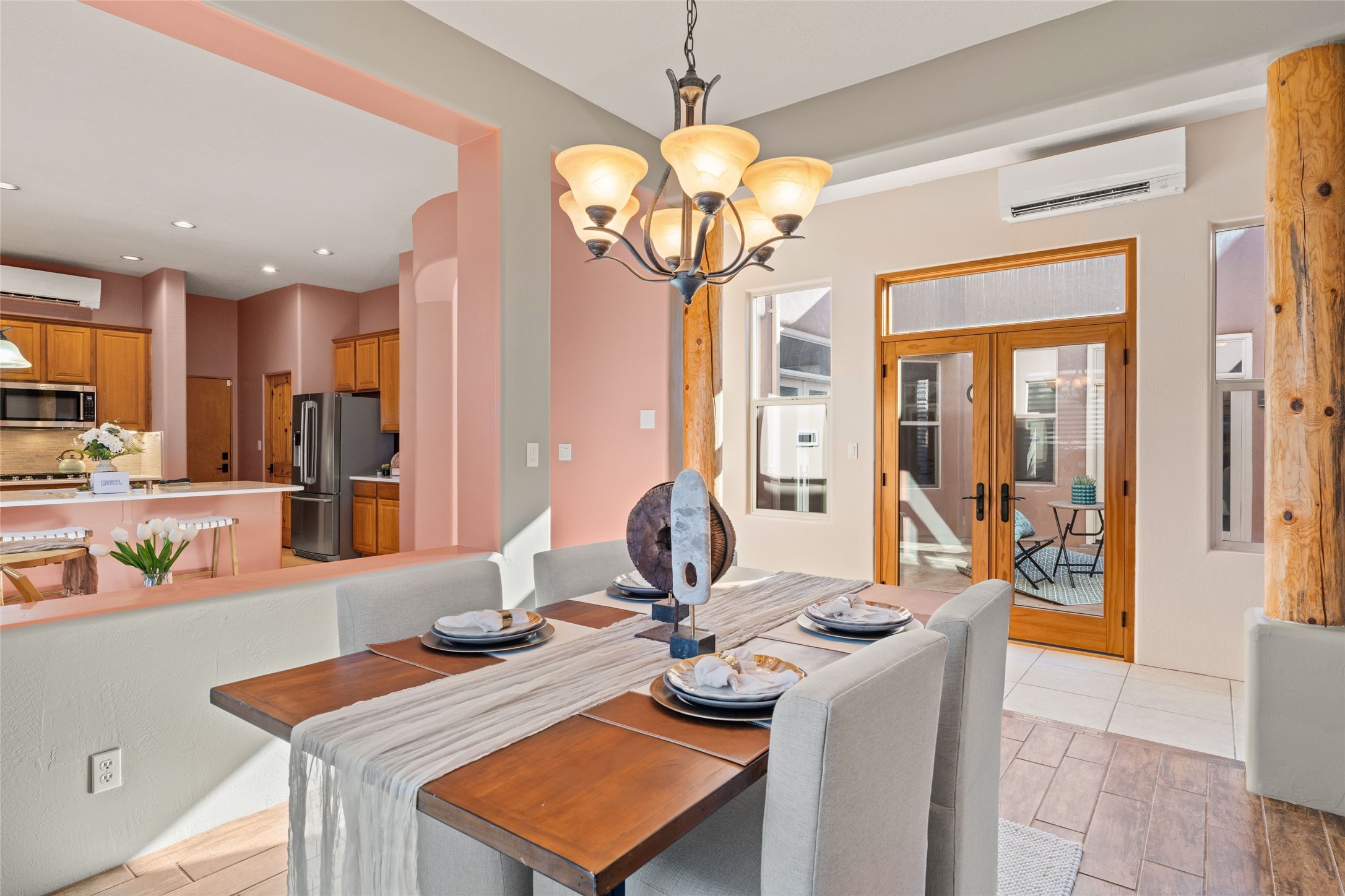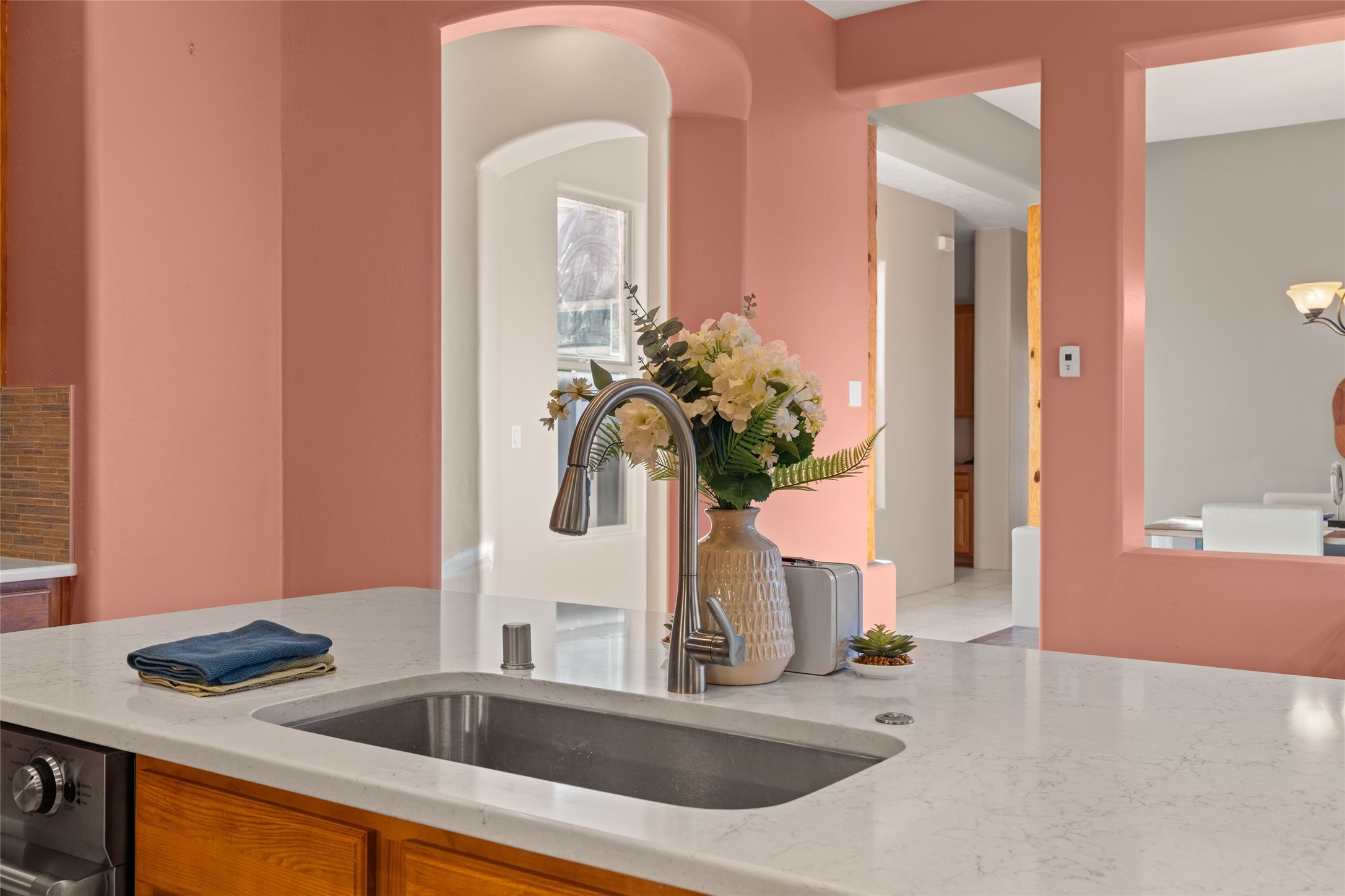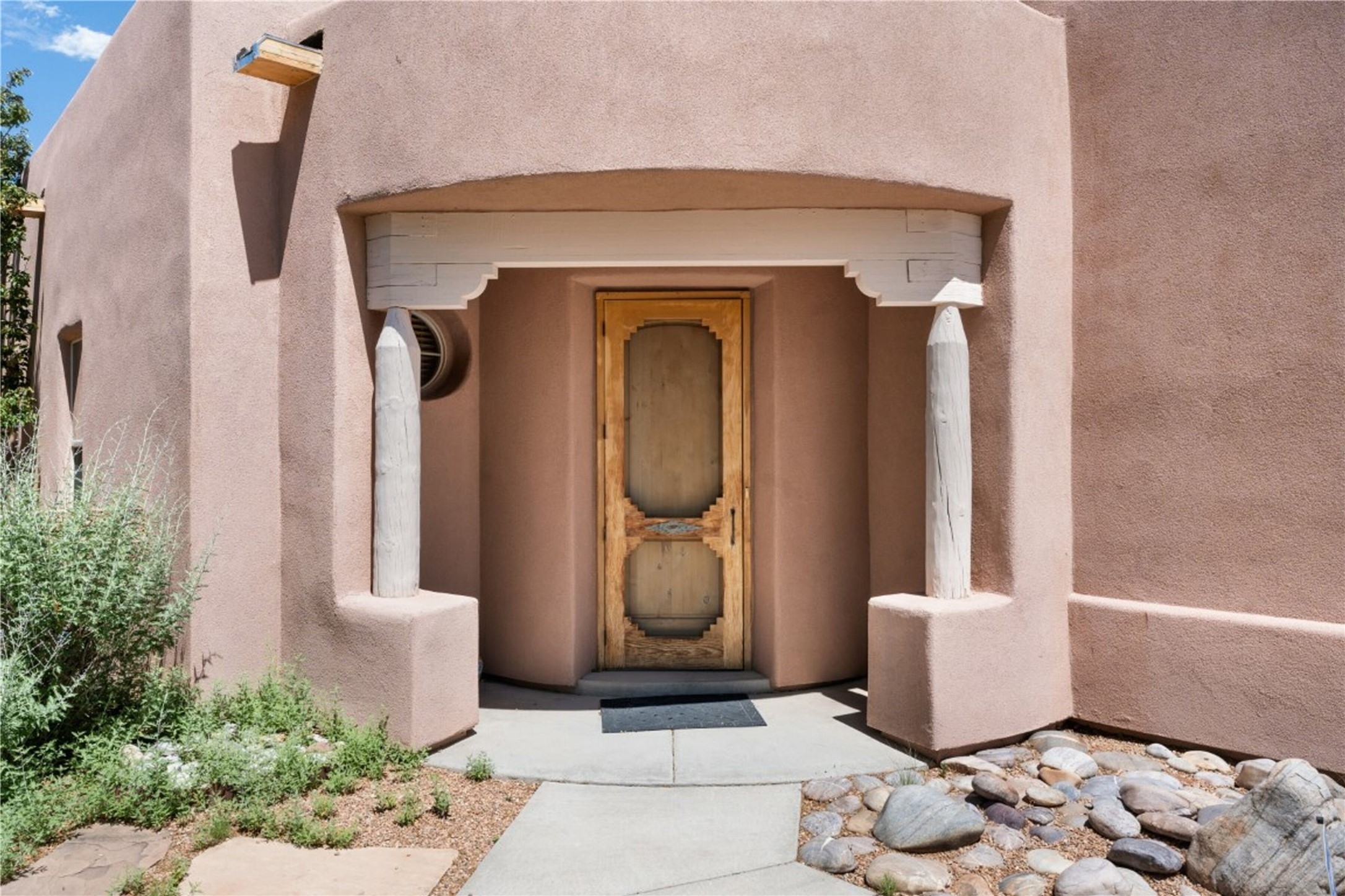 This gracious home, featuring a central courtyard, tile flooring, carpet only in primary bedroom, one gas and one wood burning Kiva fireplace, vigas in the living room, a study / TV room, formal and informal dining rooms, a gorgeous spa primary bathroom with glass blocks for soft light, a gourmet kitchen with stainless steel appliances, a new roof, and a three-car garage. Madre Mountain is a beautiful boulevard setting. This elegant home is a delight to experience!