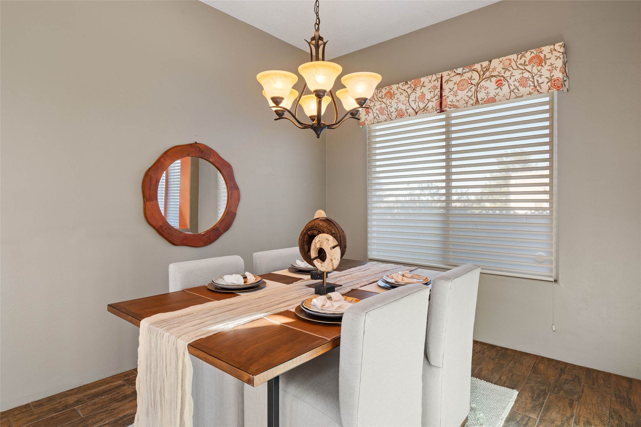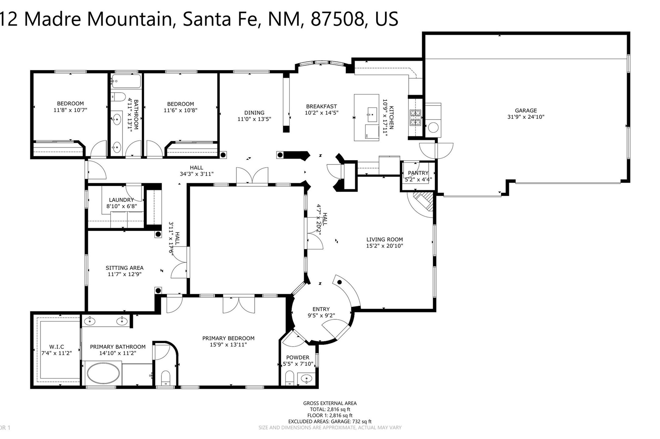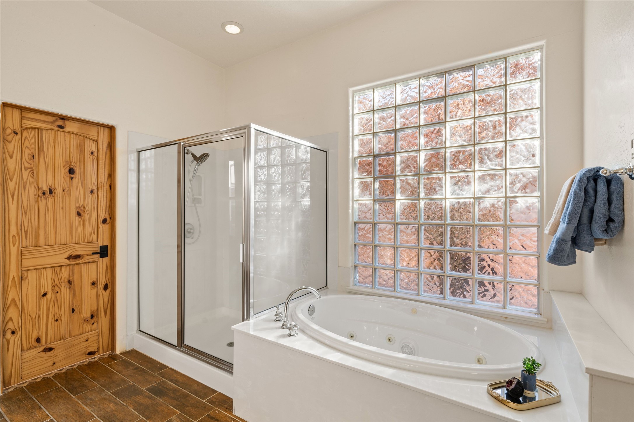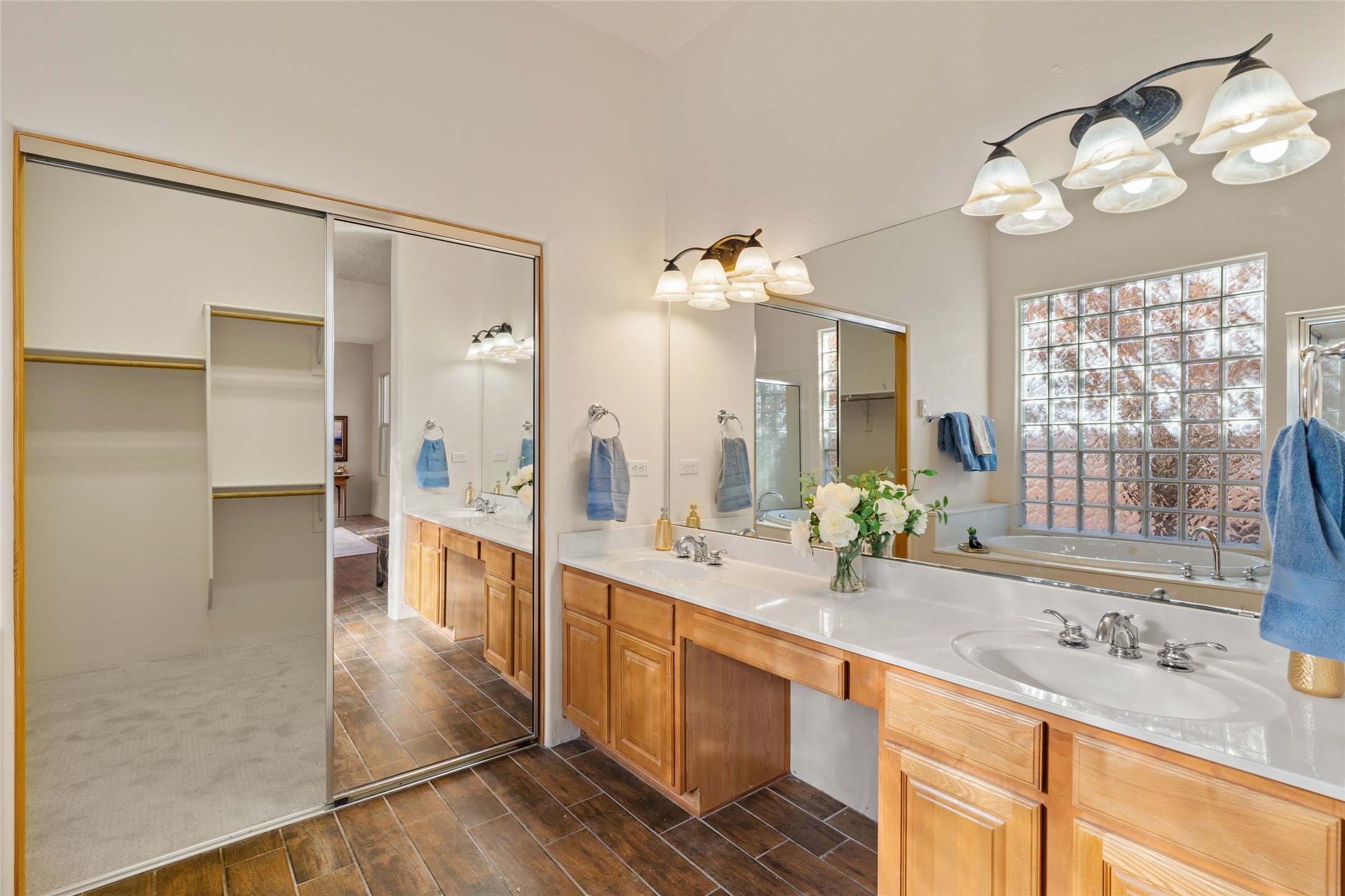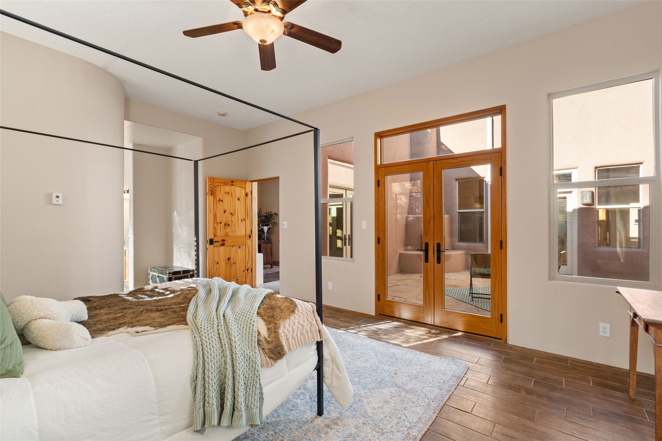 This gracious home, featuring a central courtyard, tile flooring, carpet only in primary bedroom, one gas and one wood burning Kiva fireplace, vigas in the living room, a study / TV room, formal and informal dining rooms, a gorgeous spa primary bathroom with glass blocks for soft light, a gourmet kitchen with stainless steel appliances, a new roof, and a three-car garage. Madre Mountain is a beautiful boulevard setting. This elegant home is a delight to experience!