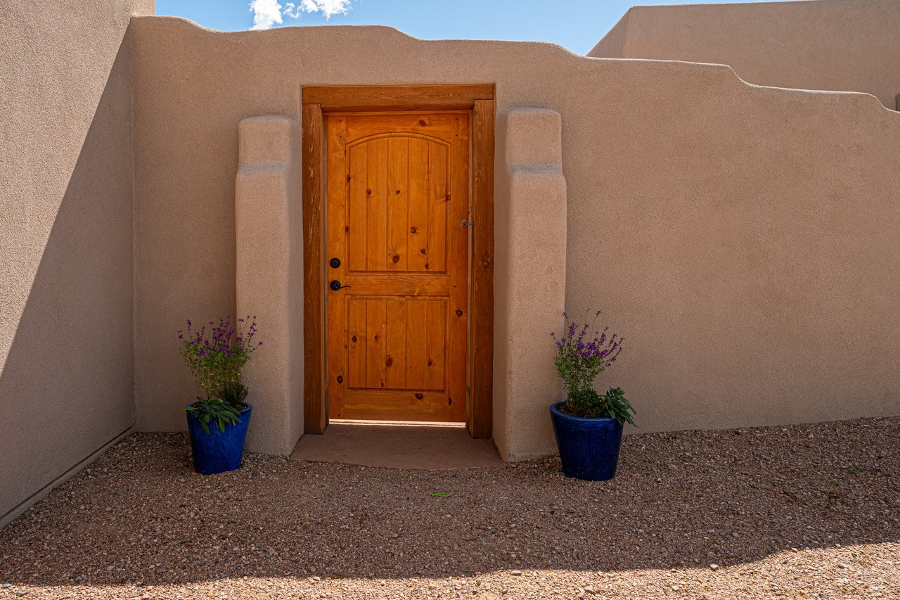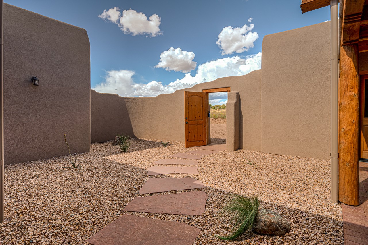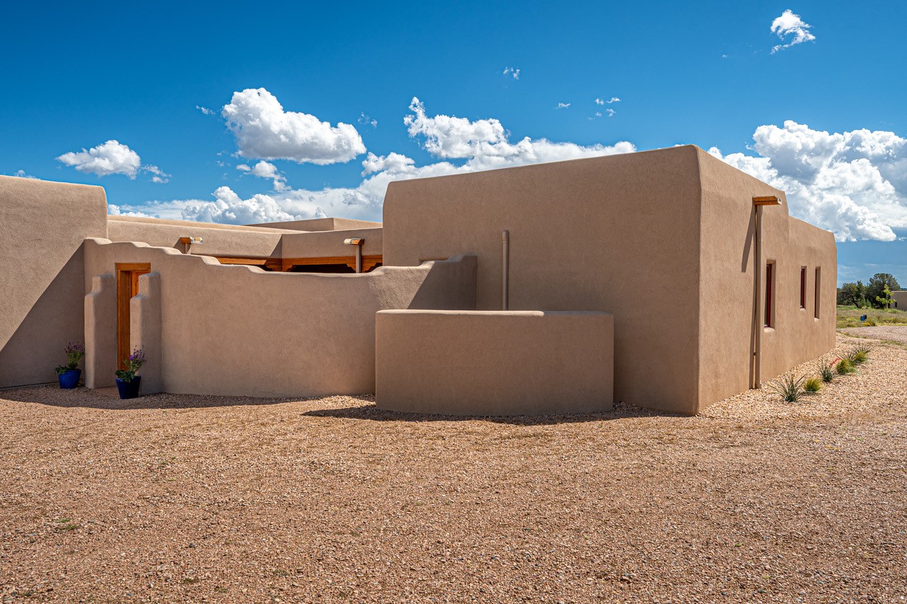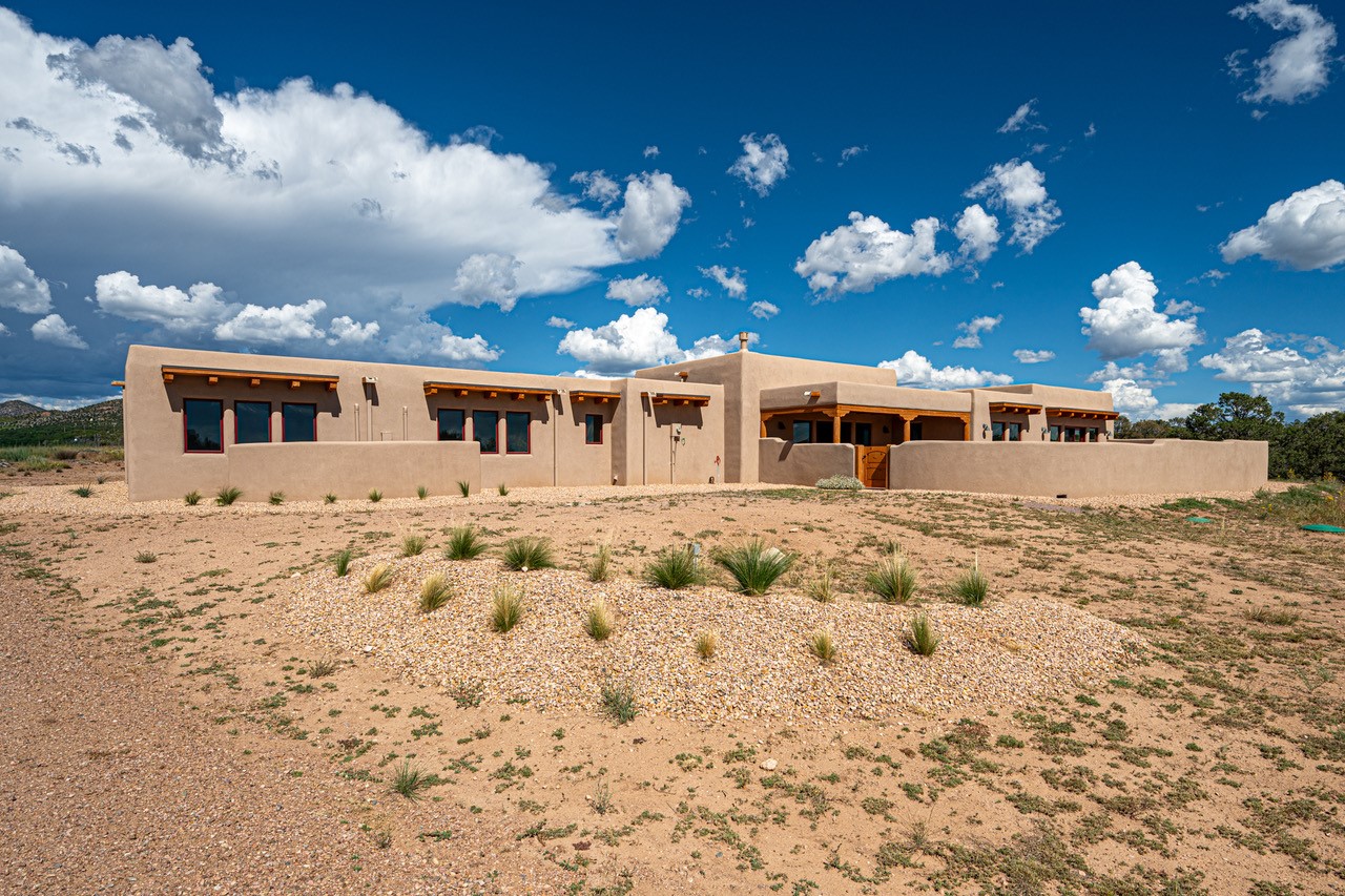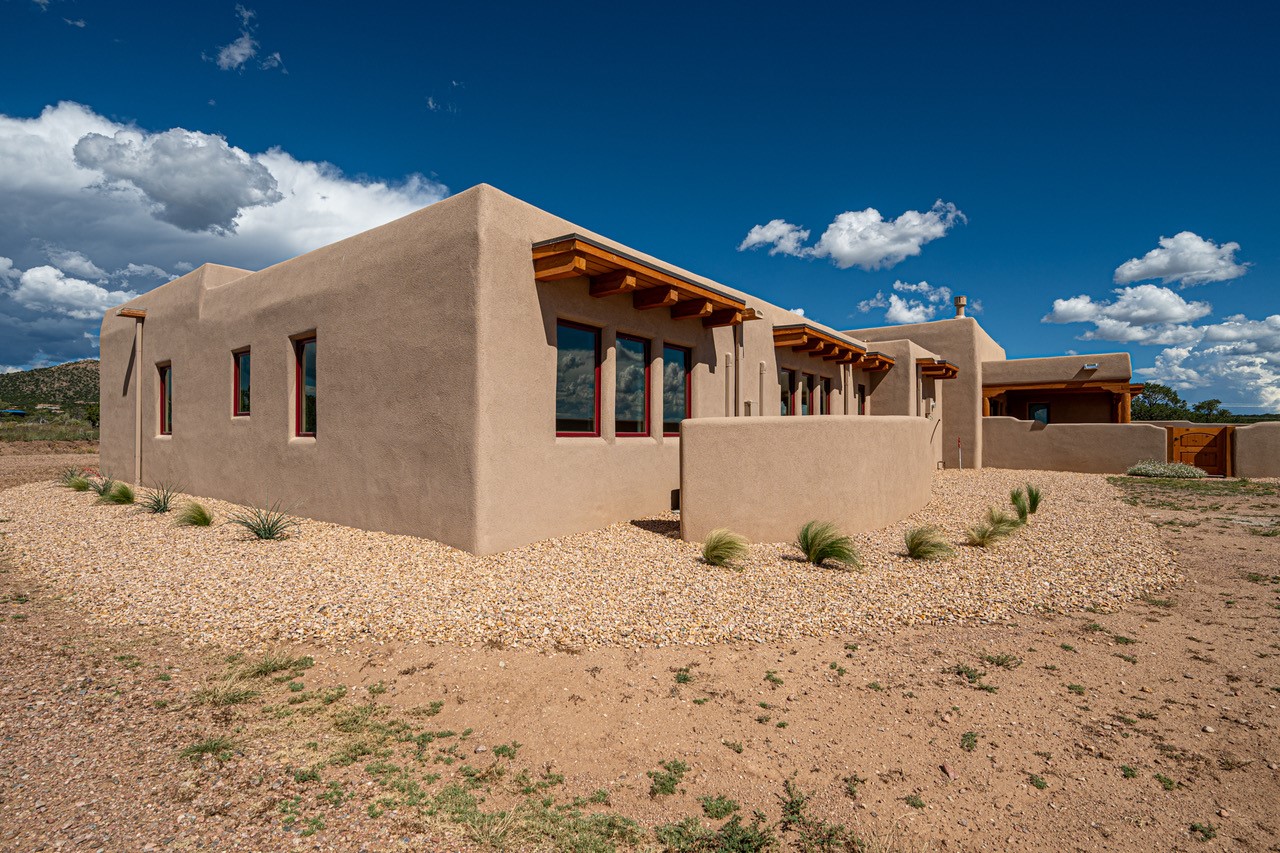 Stunning Adobe contemporary pueblo masterpiece by one of Santa Fe's premier adobe builders, Jeff Fagley of Shaylube Construction. Spec home never been lived in waiting for the first owner to enjoy. Open plan design with dramatic corbelled beam ceiling and Kiva fireplace in great room, tiled floors and gleaming thick smooth plastered walls throughout complement the classic elements of Santa Fe style. Spacious feel with high ceilings throughout, split 3 bedrooms plus office, large owners suite with private walled portal, 4 bathrooms separate guest suite. Natural gas radiant heat plus 5 mini splits for heating and cooling complementing the radiant in floor heating and passive solar design. A sunny chefs kitchen with butlers pantry and central island, large formal dining area opening to a wraparound portal for private outside dining and entertainment. A walled courtyard entry with wrap around portal also provides the access to both main home and guest quarters. There is a second privacy walled south courtyard with bricked portals accessed from living room and master suite also excellent for sunset mountain viewing. Roof drainage to 2 cisterns already installed underground catch the rainfall for landscaping. A large 3 car garage for lots of toys or hobbies, plenty of guest parking and lovely view with 7+acres to enjoy. Horses allowed. Enjoy access to local Eldorado area shopping, schools, senior center and library plus only minutes into Santa Fe.
