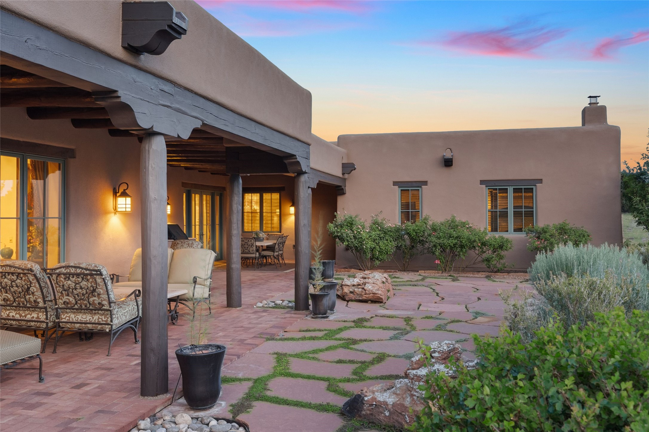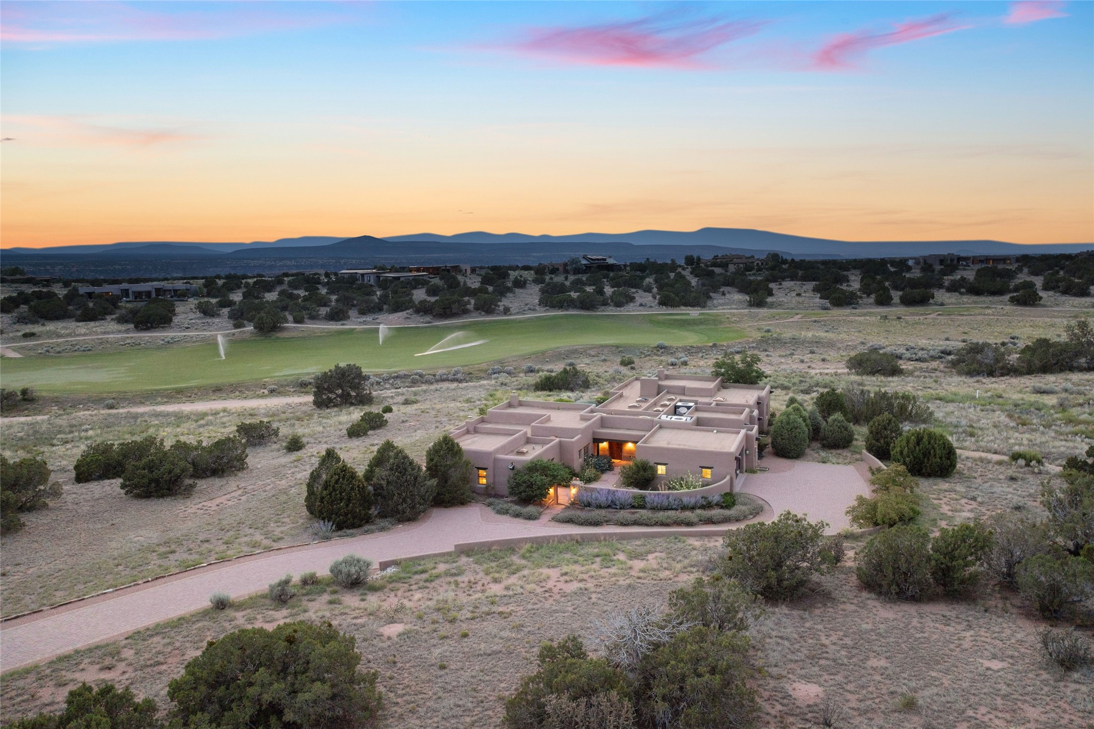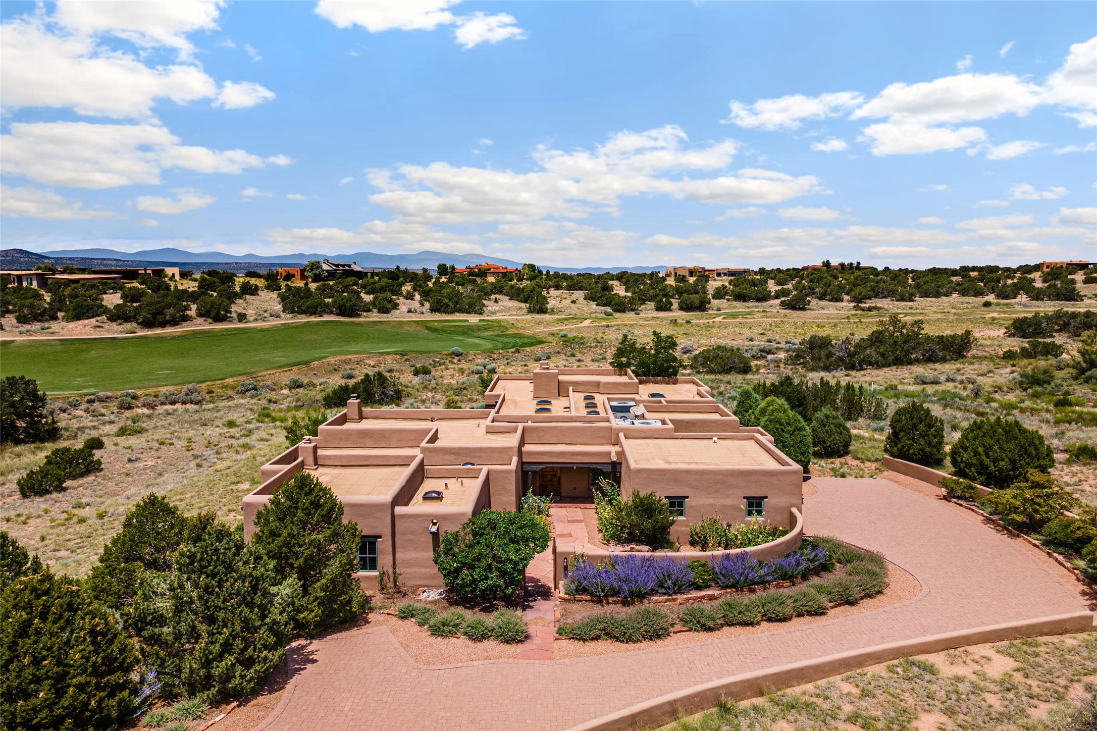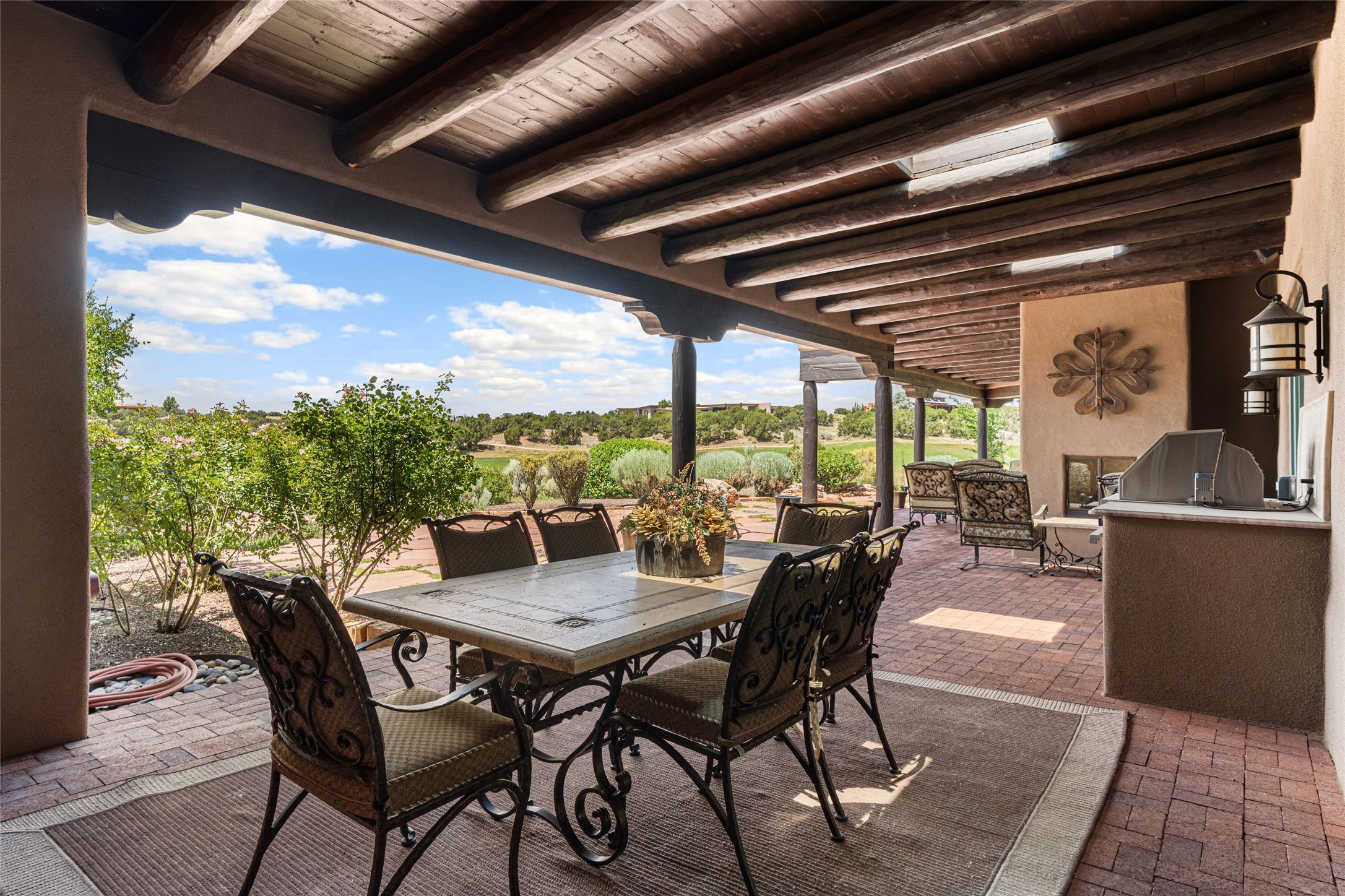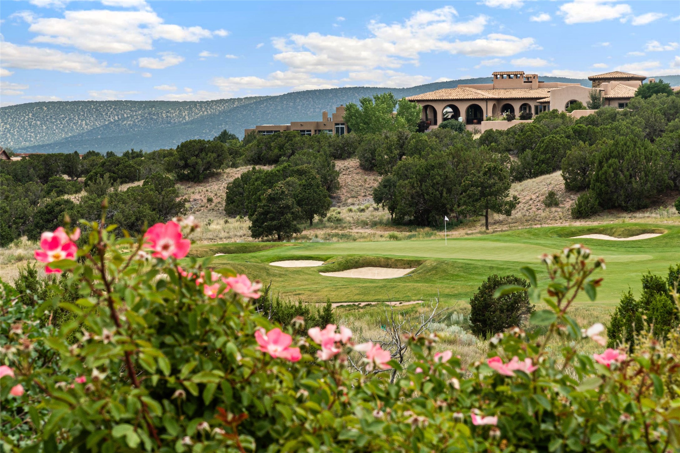 This home is the epitome of Refined Santa Fe Elegance, with 4 Bedrooms, 4.5 baths, 4 Fireplaces, No Steps and panoramic views of Sandia Mountain & the Fourth Fairway of the Sunset Golf Course, at the end of a cul-de-sac in Gated Las Campanas. An expansive hallway for artwork features 2 sets of French doors that open to the wrap-around portal for dining & relaxing which extends to the Living Room, also showcases the golf course view. The Gourmet Kitchen includes Viking appliances, an over-size island with prep sink, menu-planning desk & Butler's Pantry with wine cooler. The Main Bedroom suite offers a luxurious Spa Bath with large shower & whirlpool tub plus a walk-in closet worthy of a designer retail store. Bedroom Two is sequestered from the Main and has an en-suite bath. Bedroom Three with en-suite bath is adjacent to the Main and currently used as an office. Bedroom Four offers total privacy, as an attached Casita with en-suite bath & mini-kitchenette. The expansive brick Portal off the gallery hall includes a built-in BBQ & impressive fireplace, providing the perfect venue for entertaining, dining, relaxing or savoring the panoramic golf course & Sandia Mountain views. The Two-car Garage has eliminated garage clutter, with 29 feet of handsome cabinets plus a power wall to store bicycles, skis & other outdoor equipment. Come see why this 4-Bedroom home with Golf & Mountain views is the perfect embodiment of elegant Santa Fe resort living.