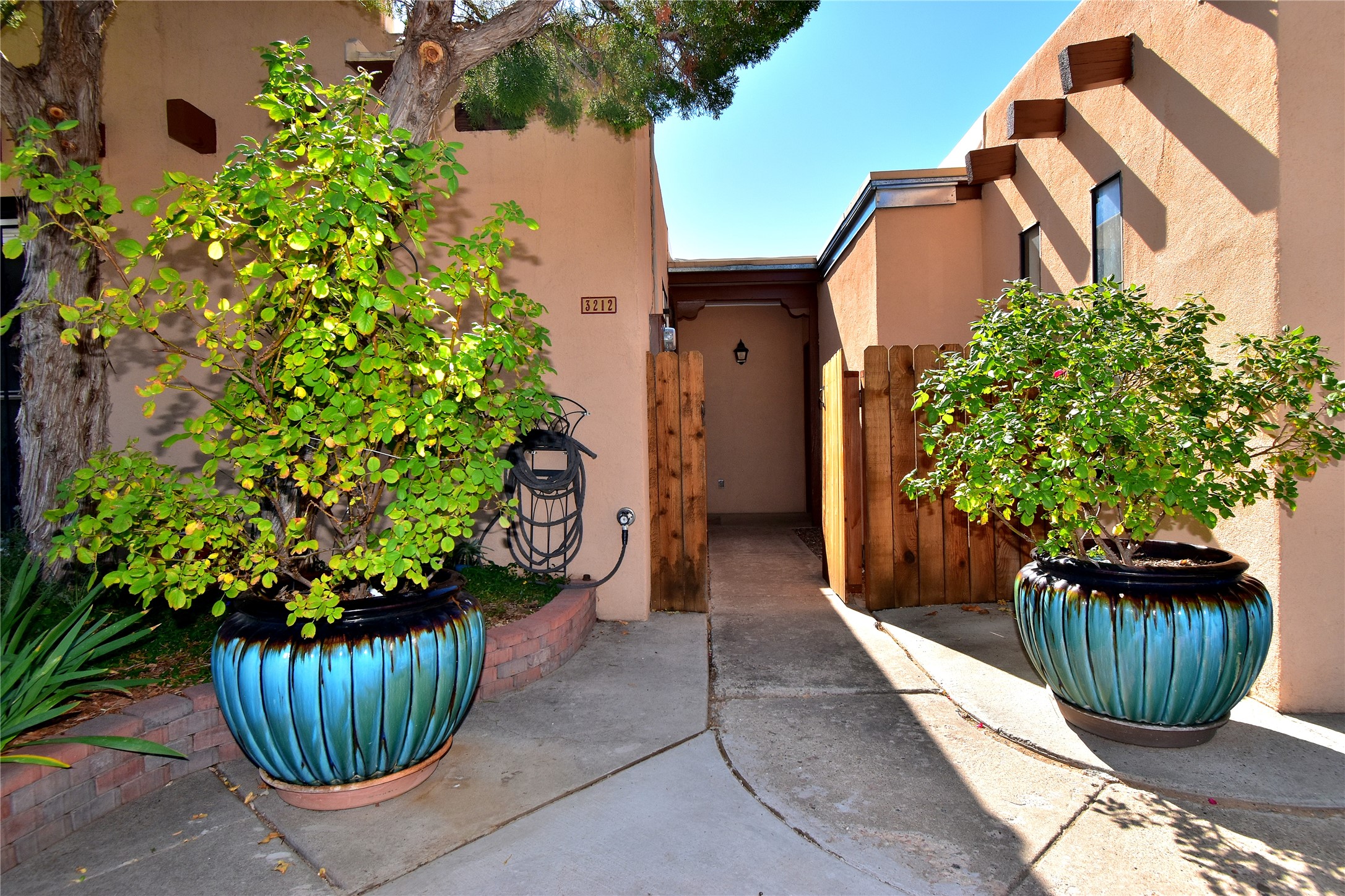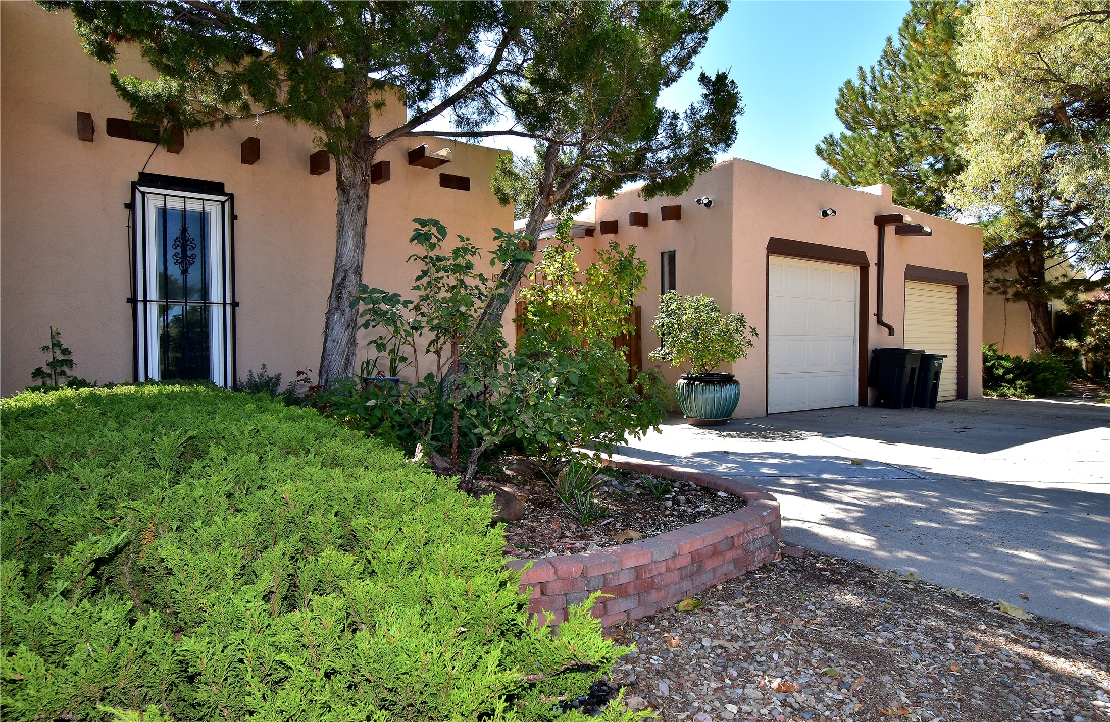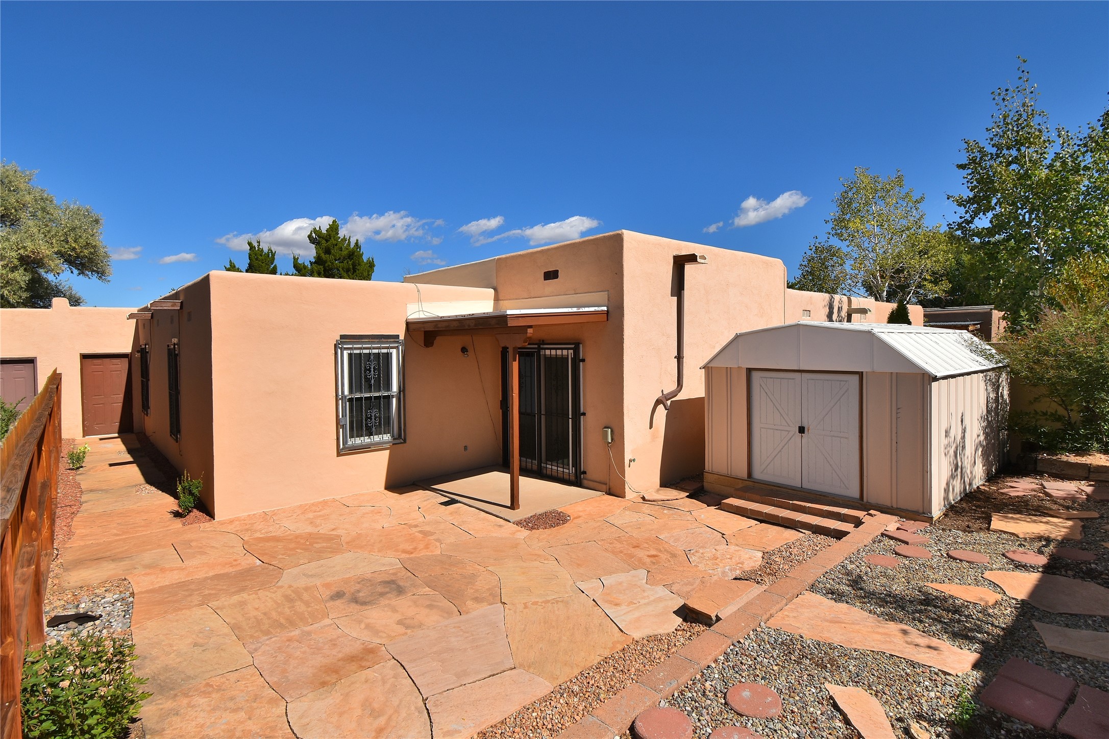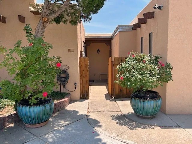 Beautiful, updated, light and bright and freshly painted home in Pueblo de Rodeo Rd. This single level home offers 3 bedrooms, 2 bathrooms and a 1-car garage with a spacious double driveway providing ample parking. An enclosed front entry courtyard welcomes you into the home. The galley kitchen features granite countertops, tile backsplash, pantry and new microwave in 2025. The backyard is private and offers a covered porch with flagstone and a large shed. Lovely features and amenities include: Newer windows-Remote Hunter Douglas top/down blinds-TPO roof-Tile and carpet floors-New washer and dryer in 2025 including water filter/softener system-Ceiling fans-Walk-in closet in primary suite-Carpet in the bedrooms. Super sweet home not to be missed.