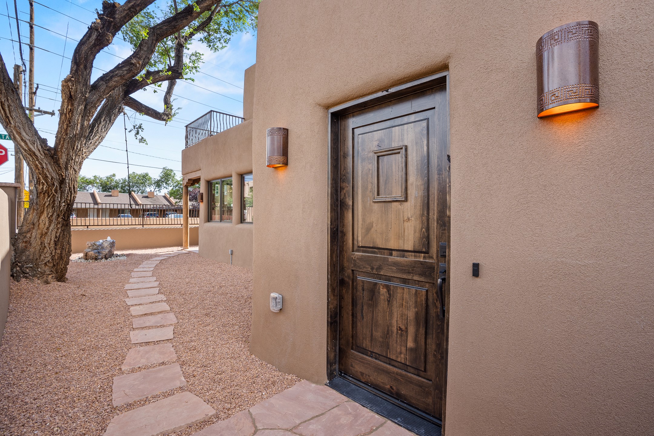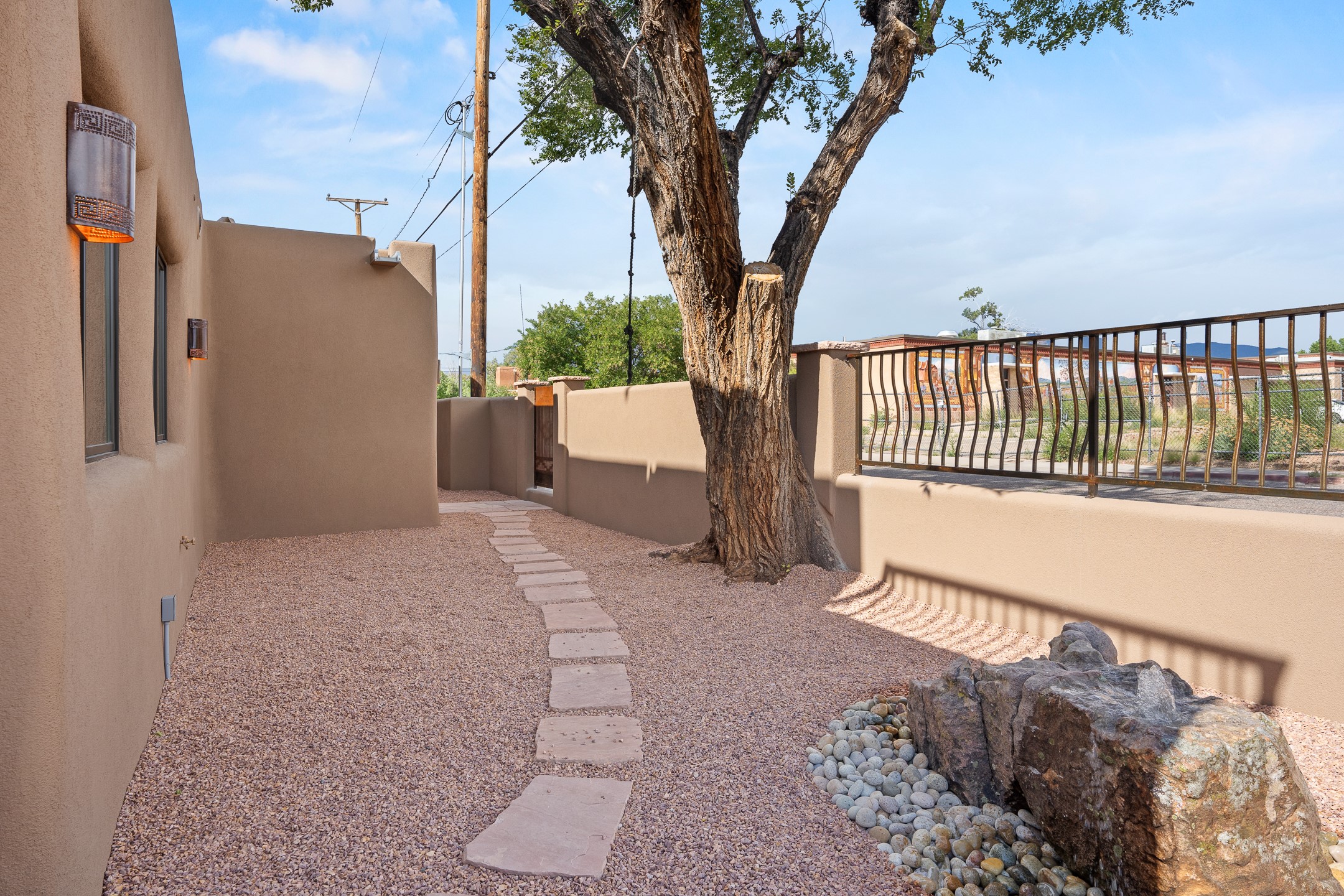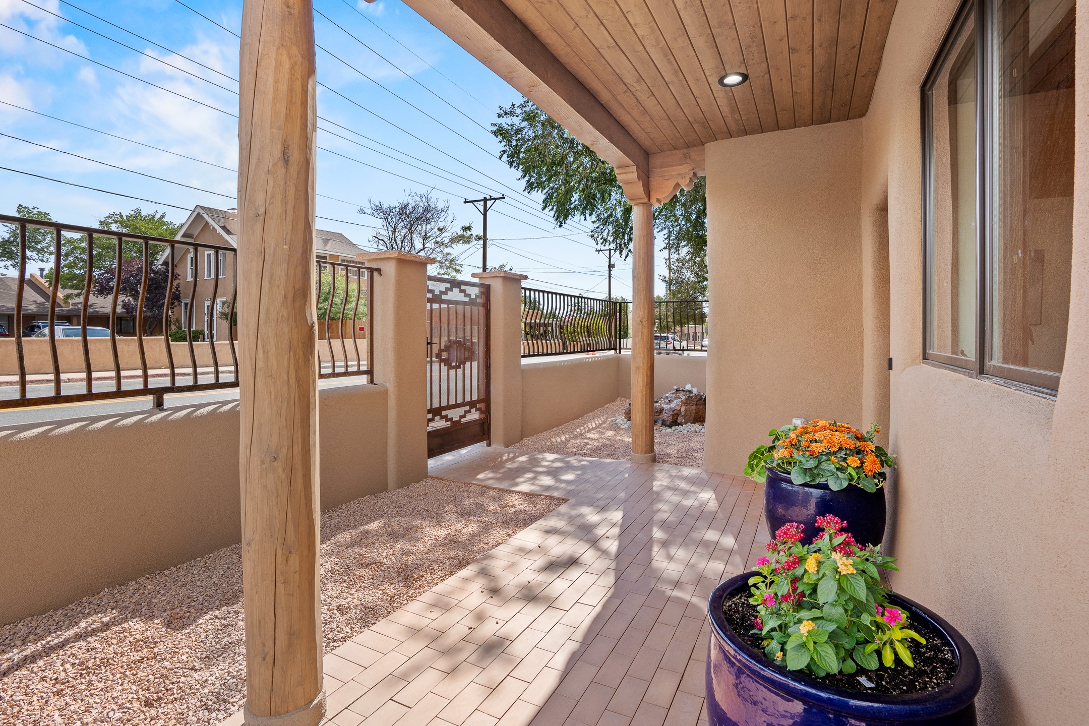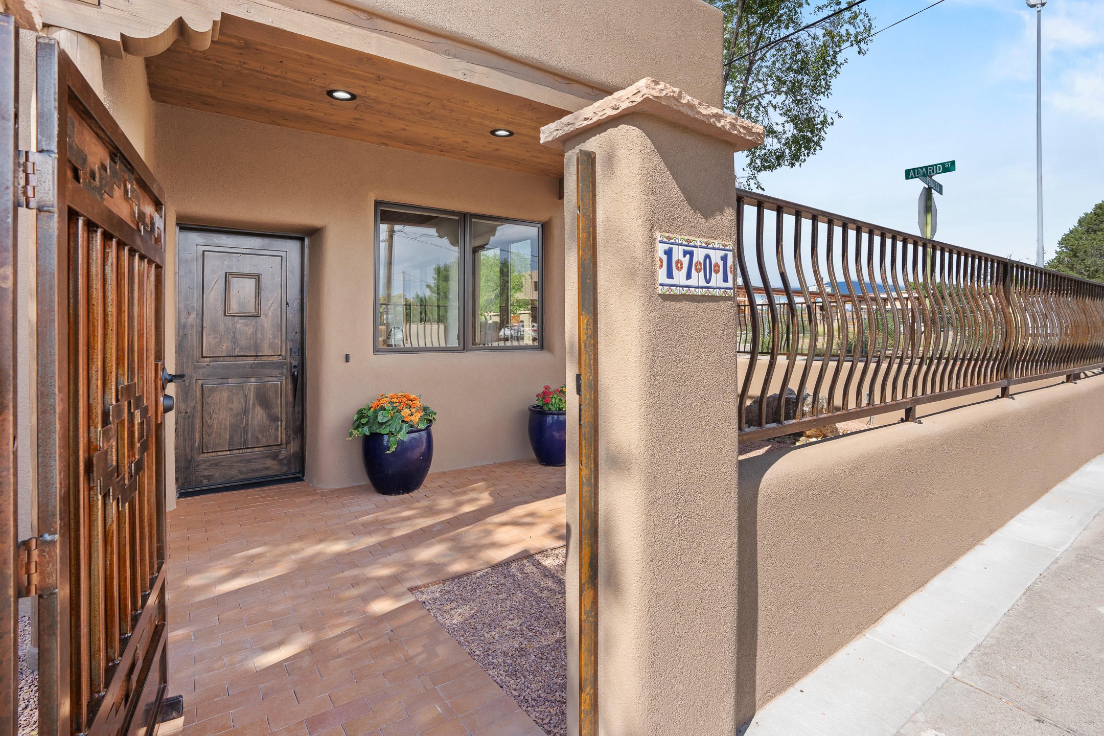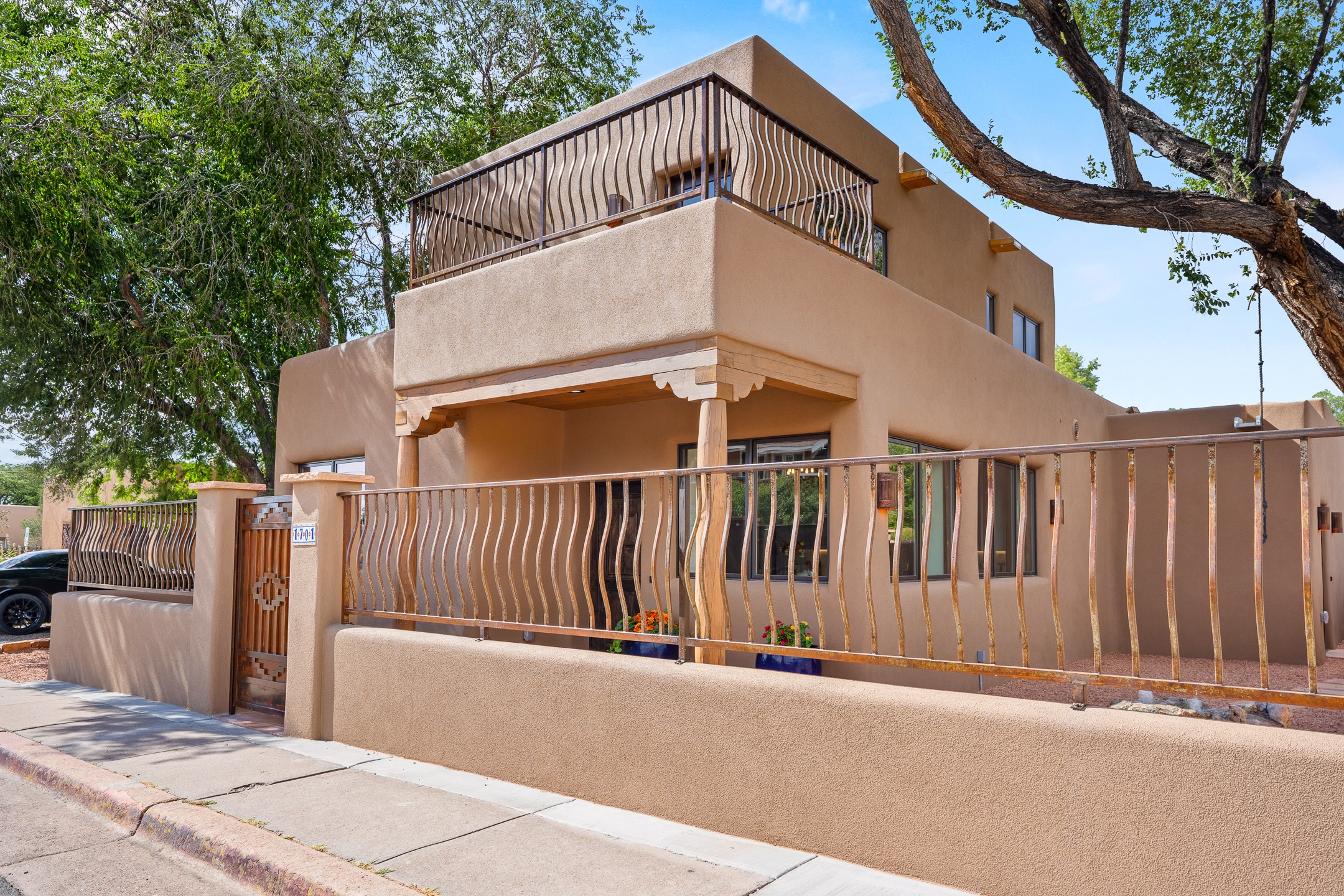 Timeless Santa Fe Charm Just Steps from the Railyard. Nestled in one of Santa Fe's most coveted locations, this beautifully restored adobe offers a rare blend of historic charm and modern luxury--just steps from the vibrant Railyard District and a short walk to the Plaza and Canyon Road. Originally constructed in the early 1900s, this 3-bedroom residence is complete with an attached studio or 4th bedroom that has been meticulously renovated to preserve its authentic character. Original vigas, flawless diamond plaster walls, arched entryways, and tongue-and-groove ceilings with recessed lighting create a warm, light-filled ambiance on a desirable corner lot. The home features two spacious primarysuites--one on each level--offering flexibility and privacy. Entire second floor is dedicated to a primary suite with spa like bathroom with views of the Sangre De Cristo Mountains, an extra large closet and oversized suite with roof topaccess and dry bar with wine fridge. The attached studio, on the main level has its own private entrance, which is perfect for guests, extended family, or a dedicated creative space. The open-concept kitchen is a true showpiece, featuring new stainless steel appliances, a custom hood, hand-painted tile backsplash, and a stunning mix of Cambria and Quartzite countertops. Custom cabinetry, artistic lighting of hand forged steel and alabaster fixtures add a refined touch throughout. Nearly every room includes an ensuite bath with marble or quartzite countertops, premium Kohler plumbing fixtures, and exceptional craftsmanship in the tile showers. Rich, hand-scraped hickory wood floors flow seamlessly throughout, completing this designer-inspired remodel where no detail was overlooked. A rare opportunity to own a timeless Santa Fe treasure--just moments from world-class restaurants, galleries, and boutique shopping Santa Fe has to offer. The house appears to be permit eligible for an STR permit subject to change should someone new apply.