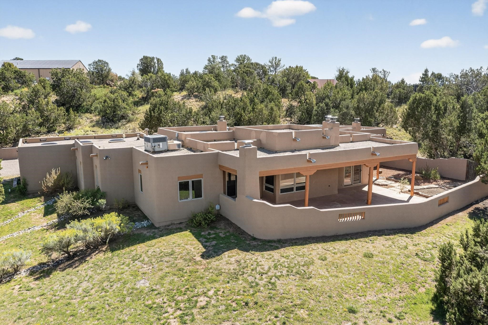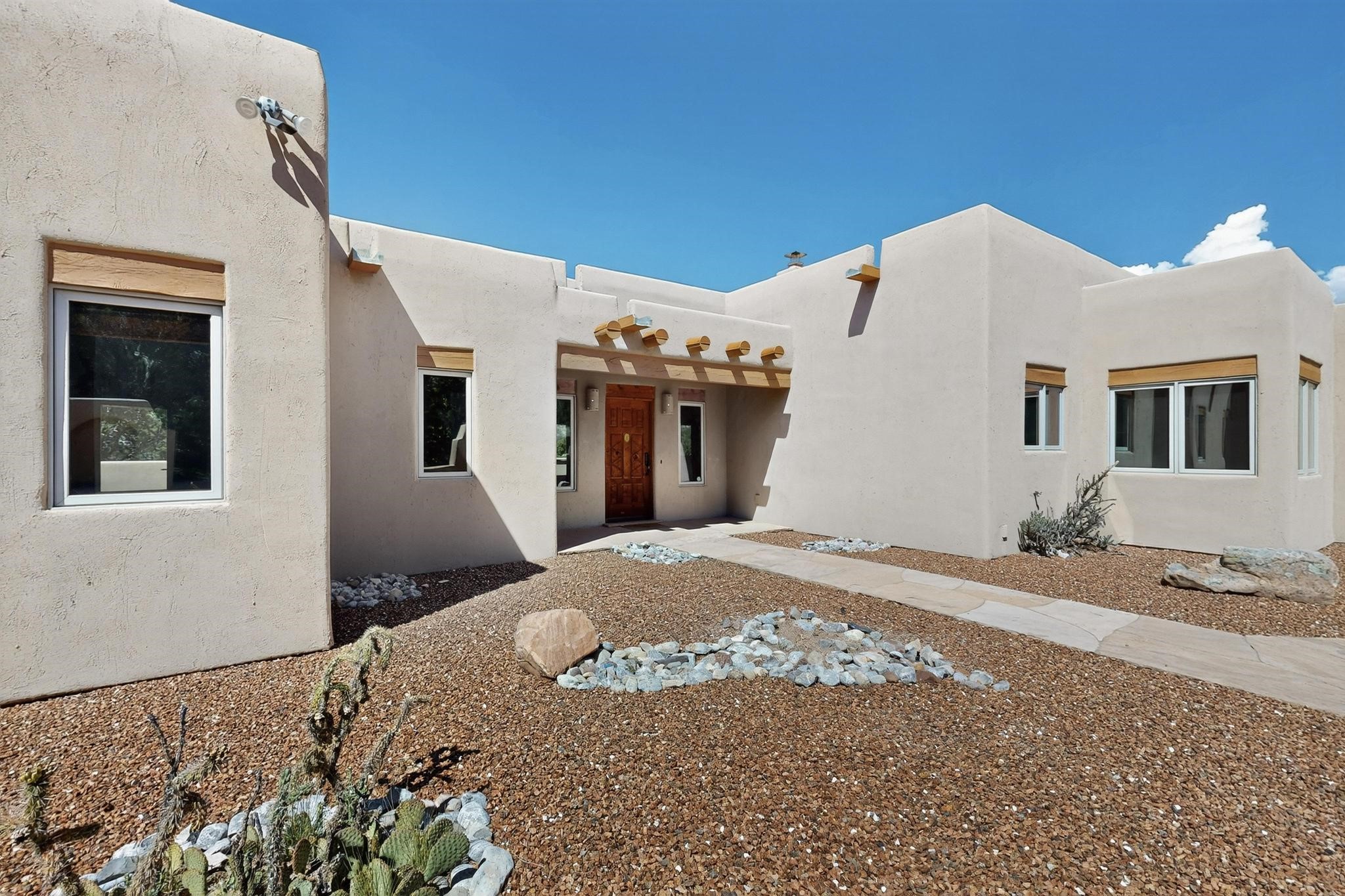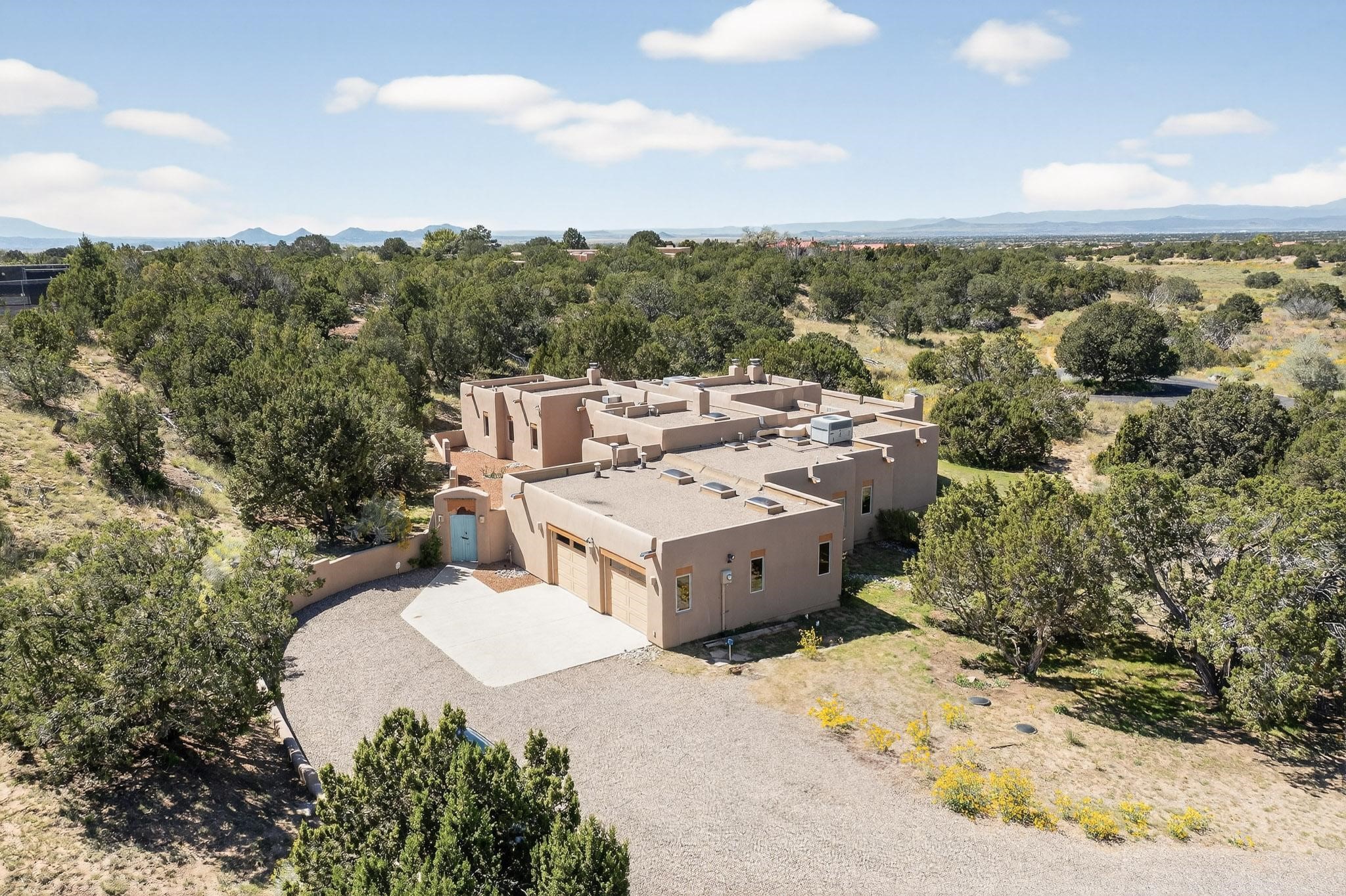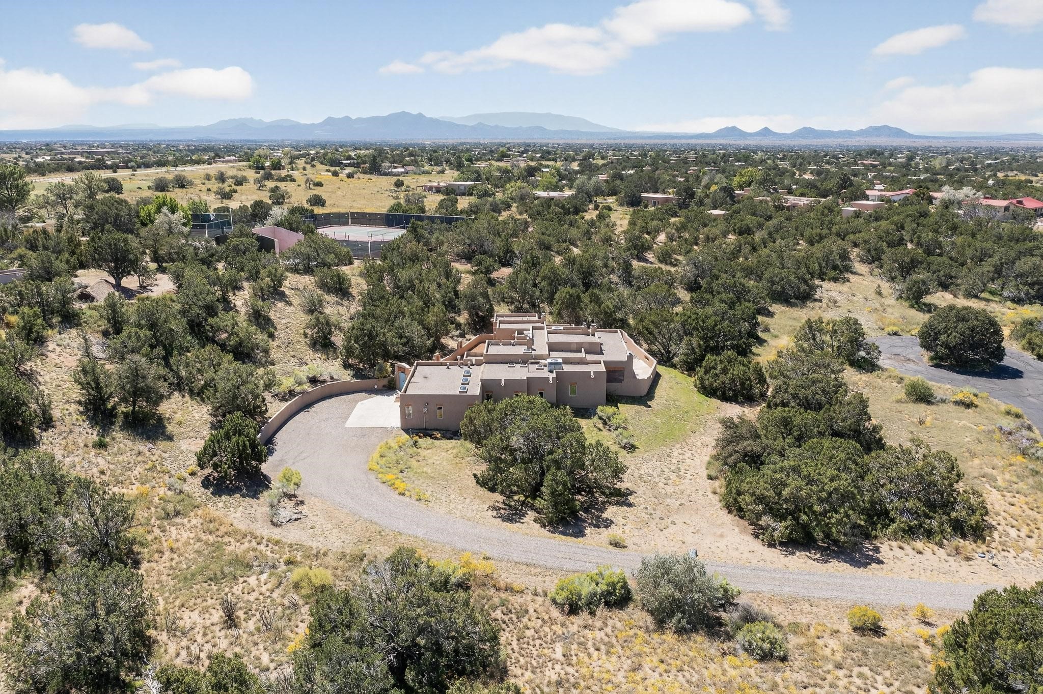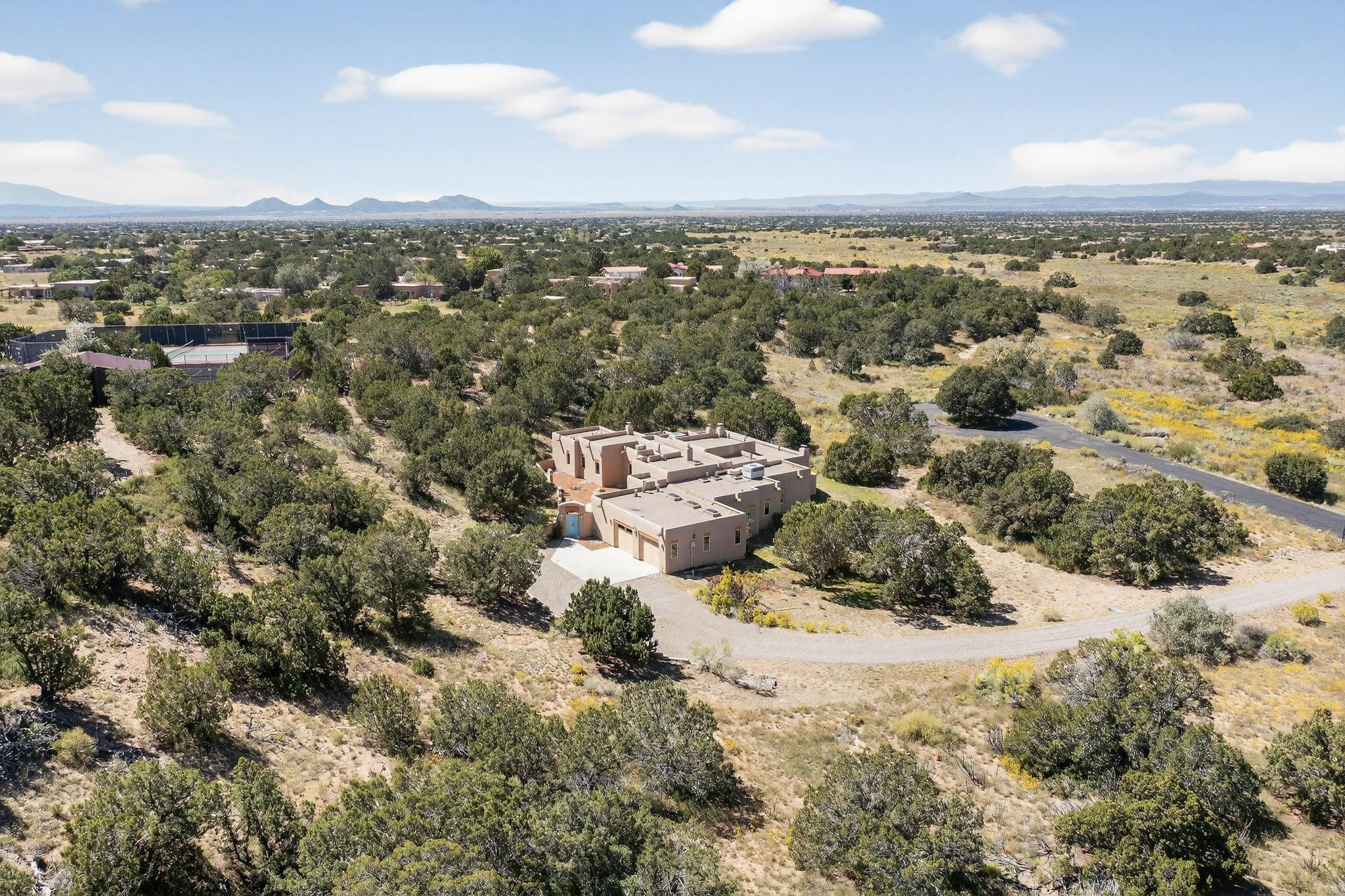 A rare offering in coveted Belicia Estates, custom designed and built this grand Santa Fe pueblo home delights the eye. From gleaming Saltillo tile floors to high viga ceilings, featuring lighted nichos, corbelled beams, 3 traditional kiva fireplaces, a pizza kiva in the kitchen plus an outside kiva for entertainment on the portal. Open plan, split bedroom floorpan creates a separate owners suite with 2 separate bathrooms, a large walk in closet and a separate study/office. There is a grand living room plus family/play room plus formal dining off the kitchen leading out to a wonderfully private walled outside entertainment area with foothill mountain views from the portal. There is a fun chefs kitchen with sunny breakfast nook and large island. There is a separate 2 bedroom and bath guest suite, and convenient laundry room which leads to the spacious 2 car garage. Positioned at the end of a paved cul de sac on 4.3acres close to the gated entry it is within easy reach to 2 local shopping centers, the Galisteo preserve and only minutes into historic Santa Fe. A must see:)