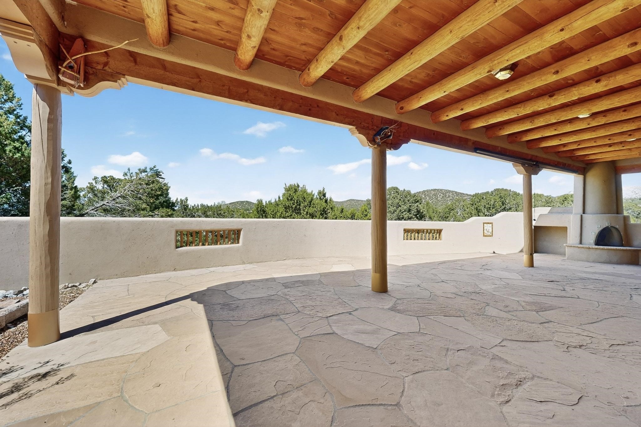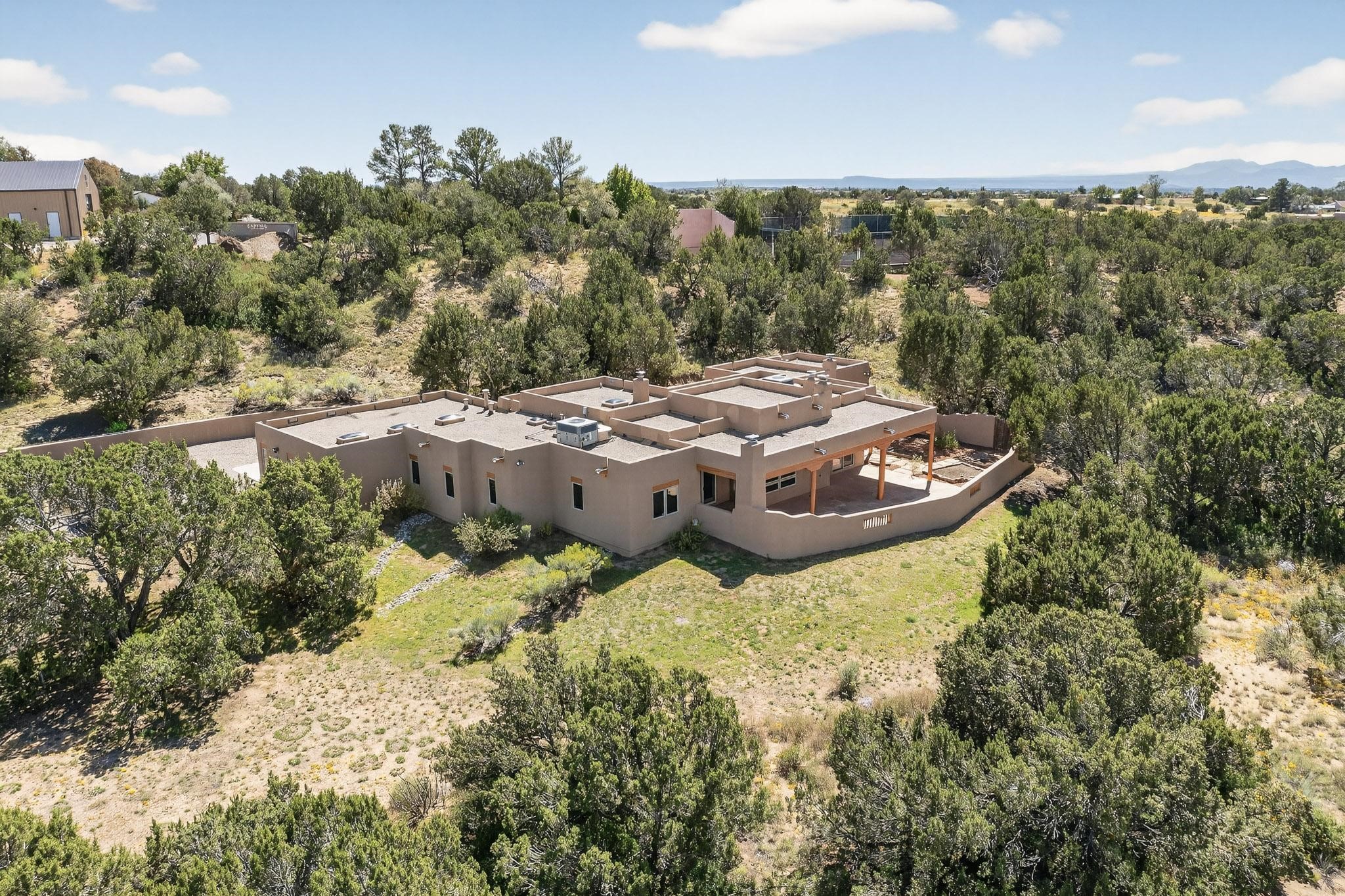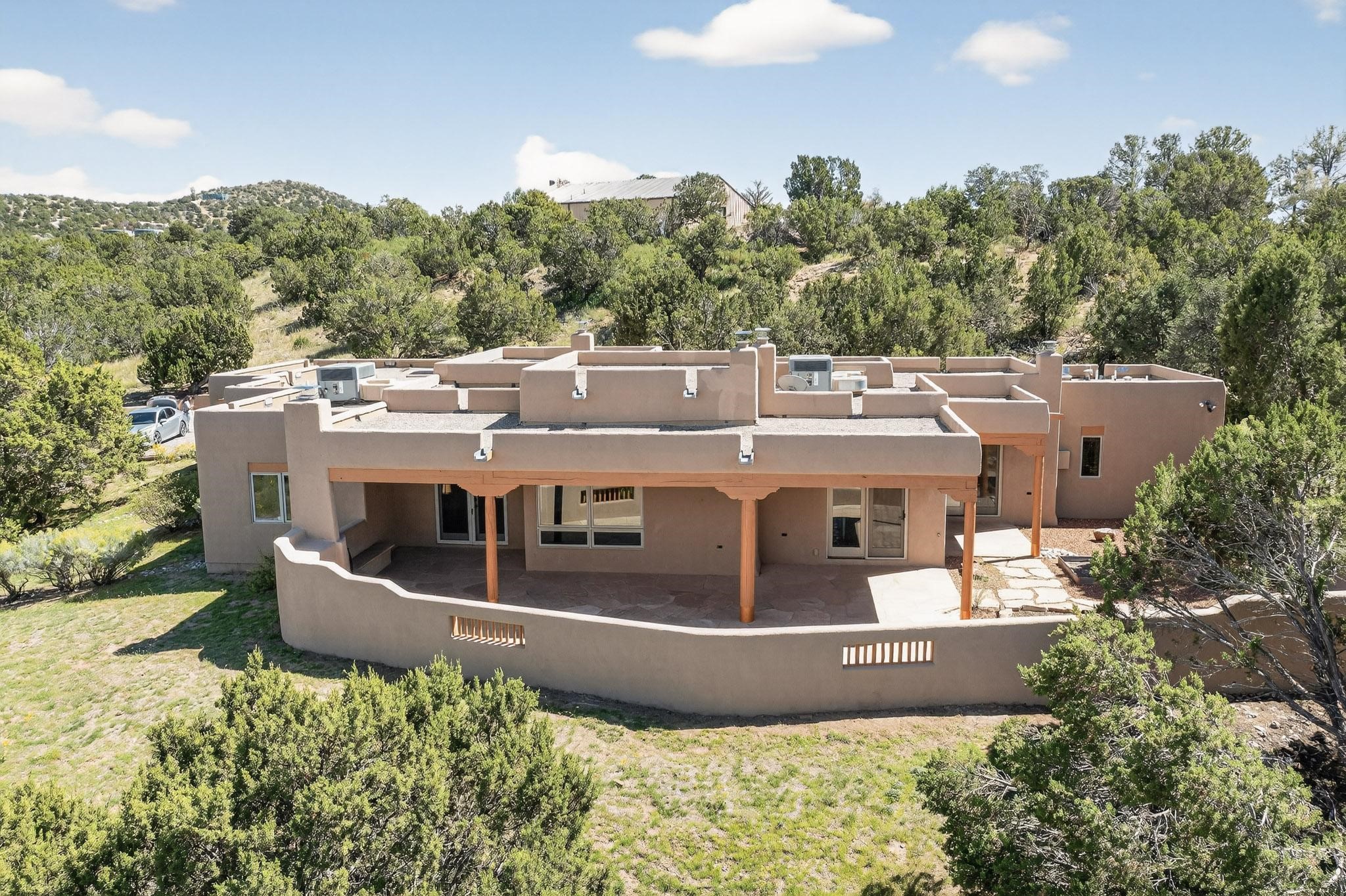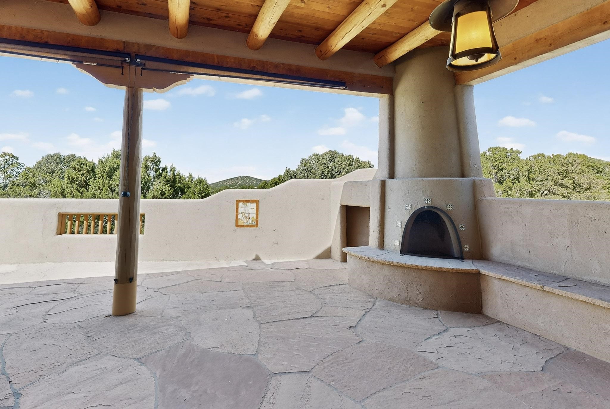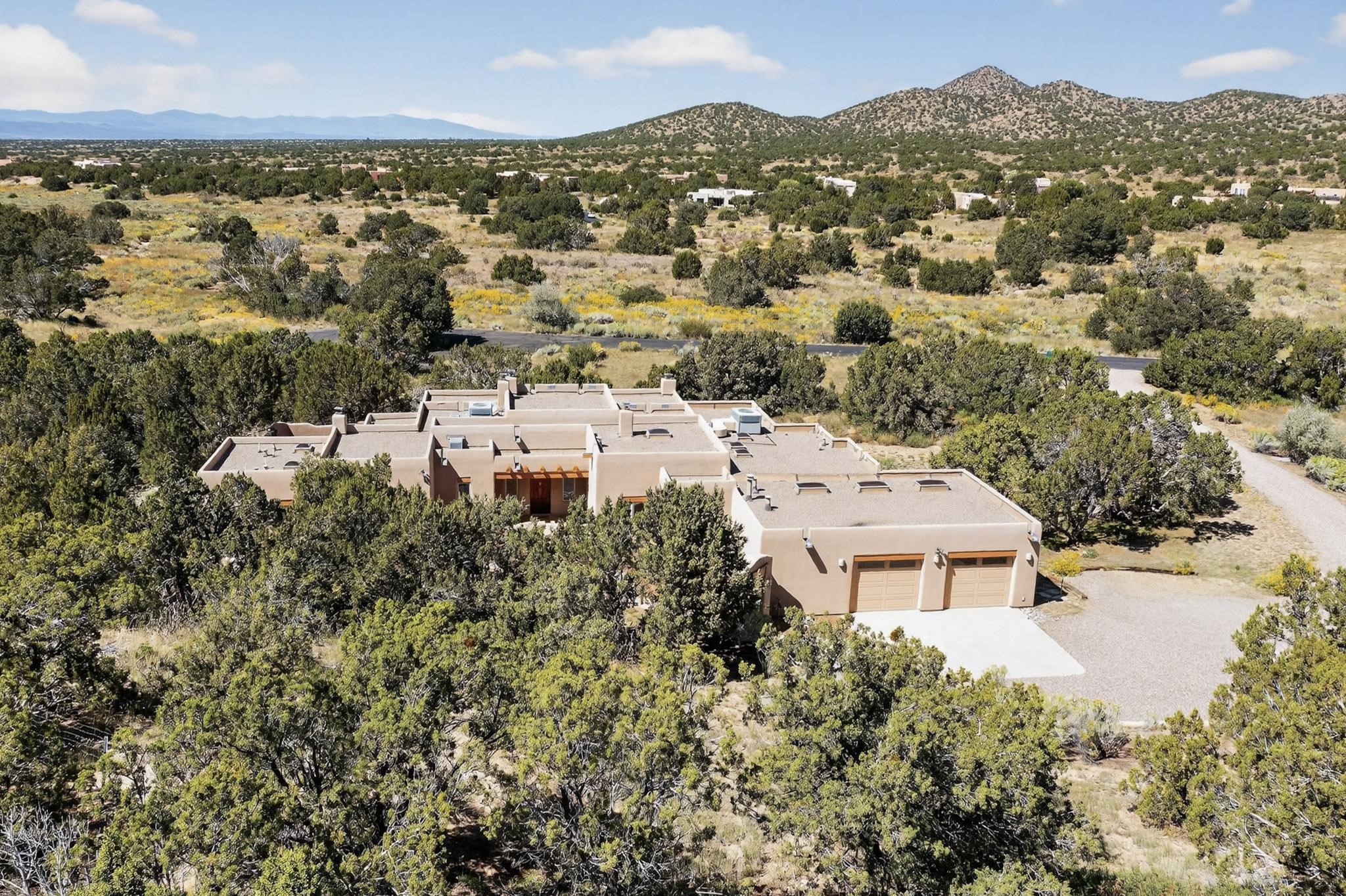 A rare offering in coveted Belicia Estates, custom designed and built this grand Santa Fe pueblo home delights the eye. From gleaming Saltillo tile floors to high viga ceilings, featuring lighted nichos, corbelled beams, 3 traditional kiva fireplaces, a pizza kiva in the kitchen plus an outside kiva for entertainment on the portal. Open plan, split bedroom floorpan creates a separate owners suite with 2 separate bathrooms, a large walk in closet and a separate study/office. There is a grand living room plus family/play room plus formal dining off the kitchen leading out to a wonderfully private walled outside entertainment area with foothill mountain views from the portal. There is a fun chefs kitchen with sunny breakfast nook and large island. There is a separate 2 bedroom and bath guest suite, and convenient laundry room which leads to the spacious 2 car garage. Positioned at the end of a paved cul de sac on 4.3acres close to the gated entry it is within easy reach to 2 local shopping centers, the Galisteo preserve and only minutes into historic Santa Fe. A must see:)