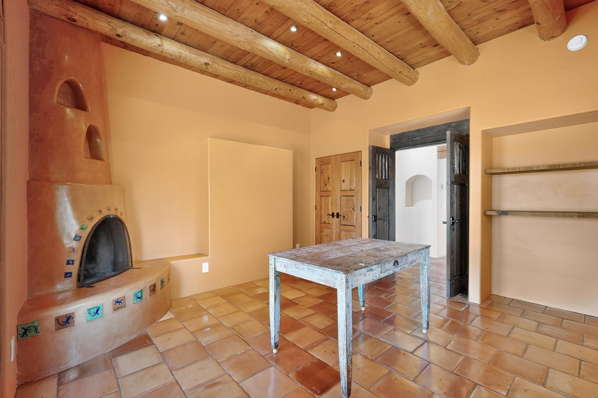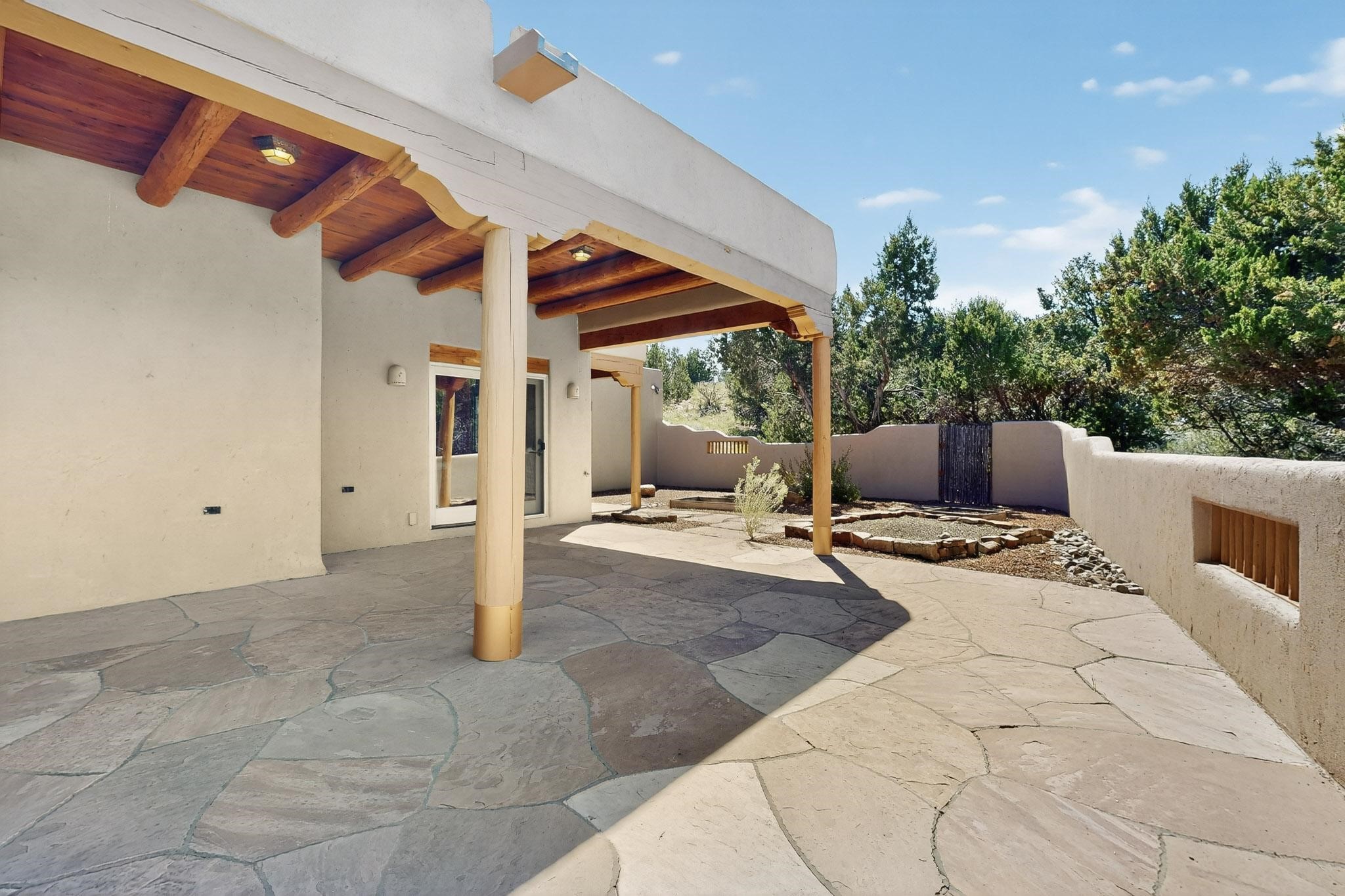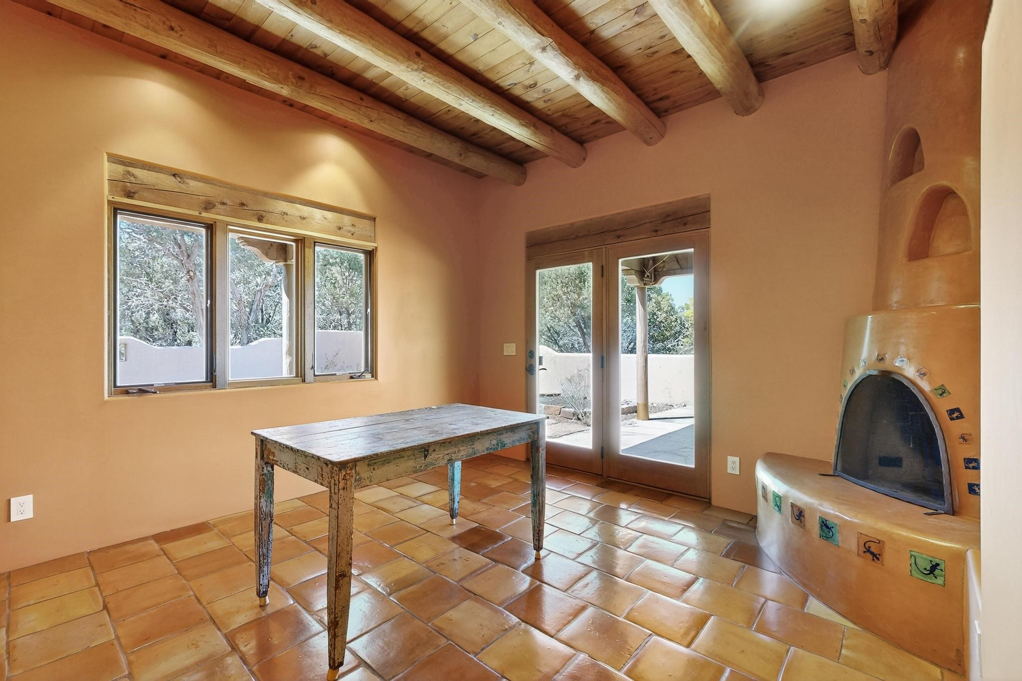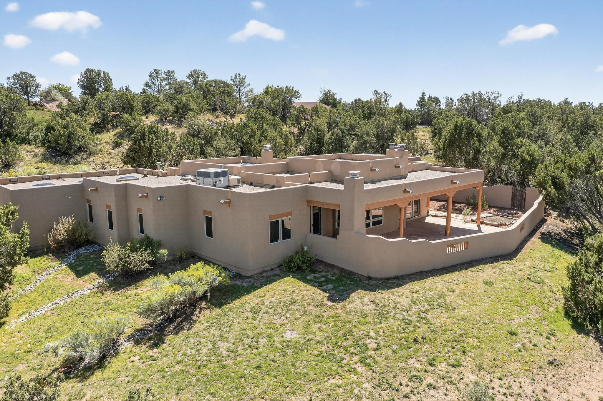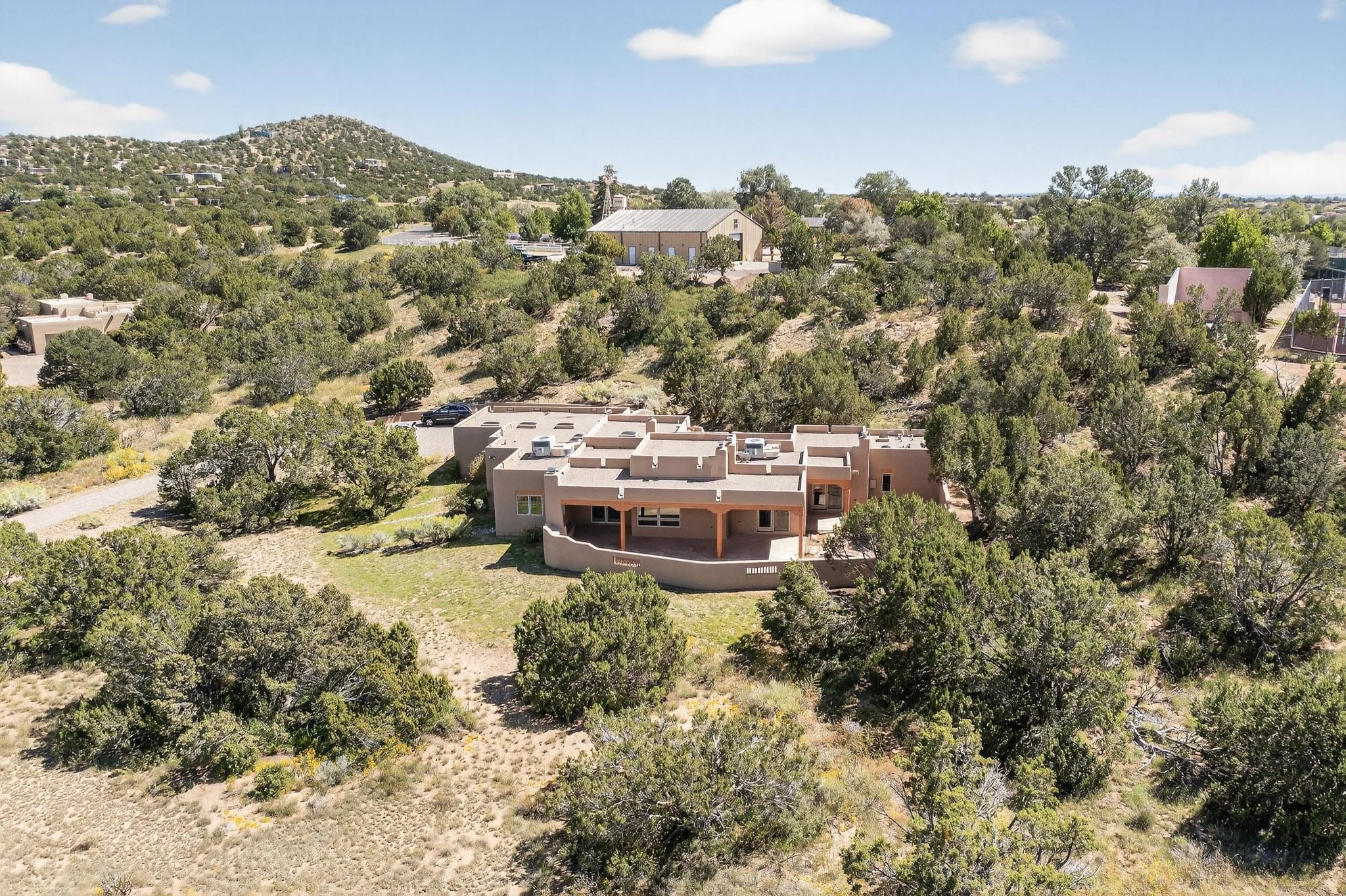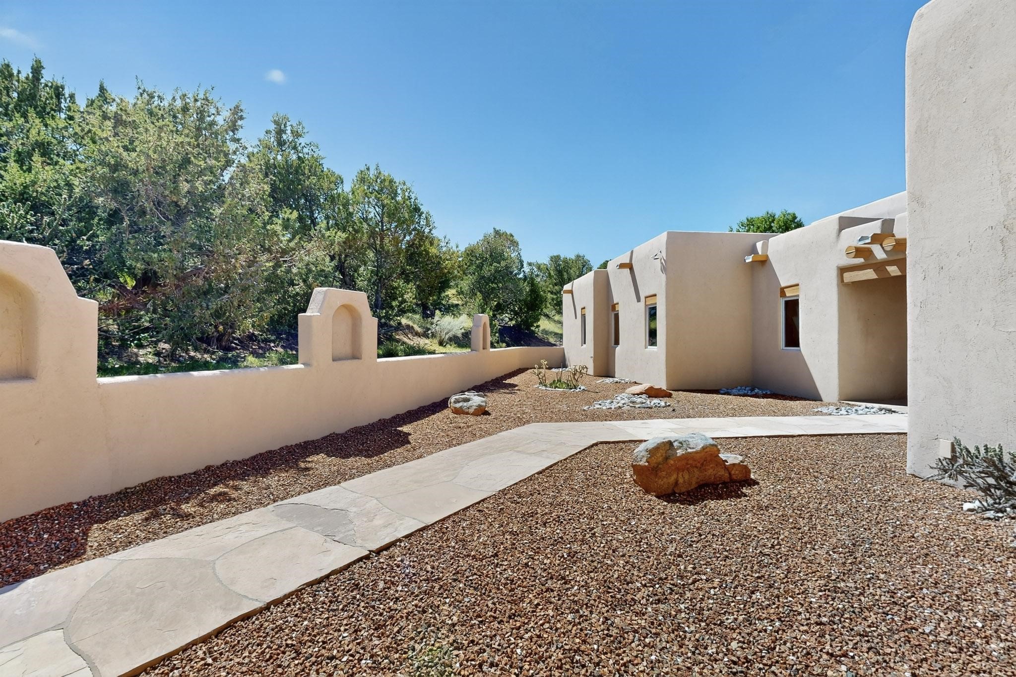 A rare offering in coveted Belicia Estates, custom designed and built this grand Santa Fe pueblo home delights the eye. From gleaming Saltillo tile floors to high viga ceilings, featuring lighted nichos, corbelled beams, 3 traditional kiva fireplaces, a pizza kiva in the kitchen plus an outside kiva for entertainment on the portal. Open plan, split bedroom floorpan creates a separate owners suite with 2 separate bathrooms, a large walk in closet and a separate study/office. There is a grand living room plus family/play room plus formal dining off the kitchen leading out to a wonderfully private walled outside entertainment area with foothill mountain views from the portal. There is a fun chefs kitchen with sunny breakfast nook and large island. There is a separate 2 bedroom and bath guest suite, and convenient laundry room which leads to the spacious 2 car garage. Positioned at the end of a paved cul de sac on 4.3acres close to the gated entry it is within easy reach to 2 local shopping centers, the Galisteo preserve and only minutes into historic Santa Fe. A must see:)