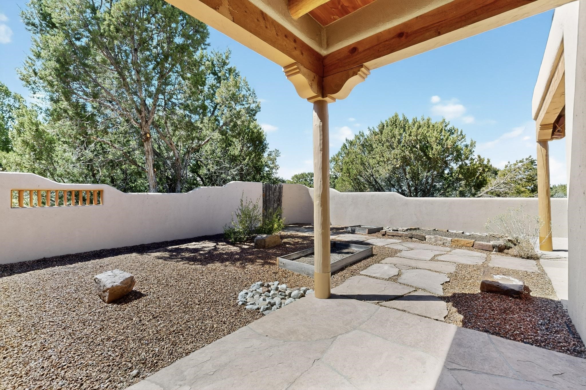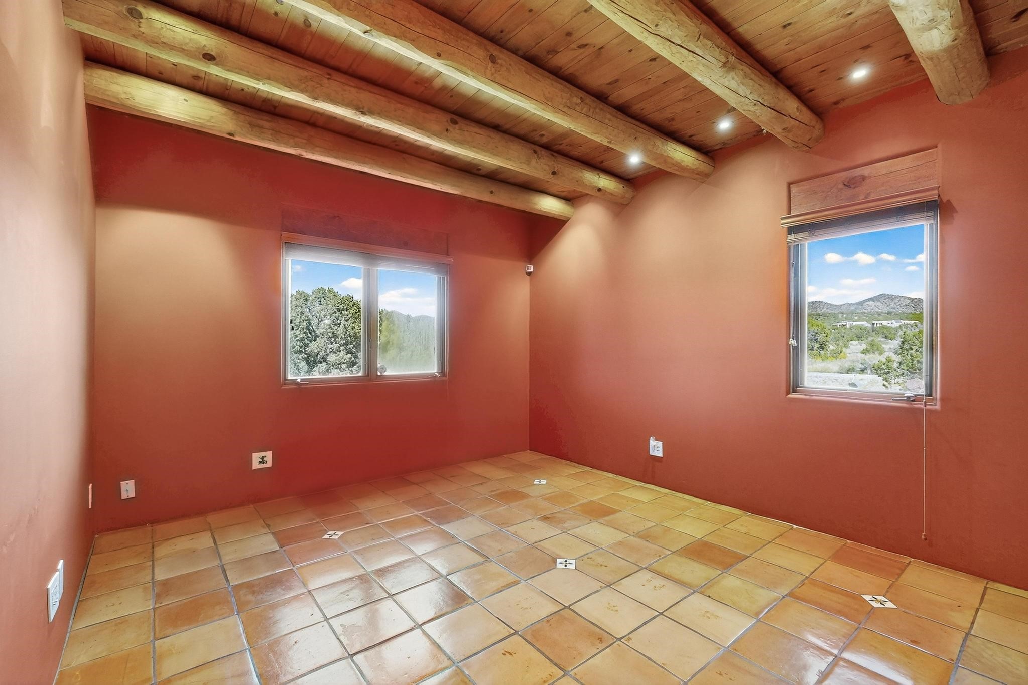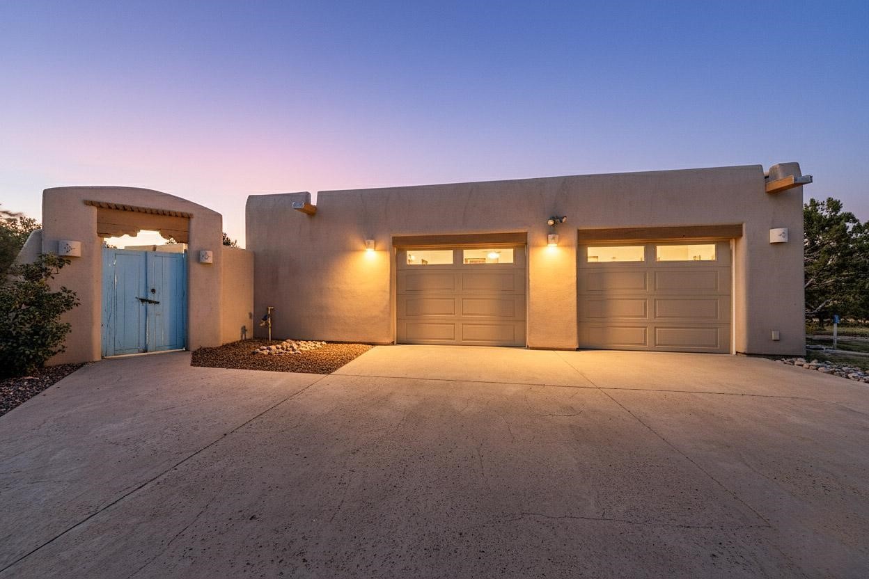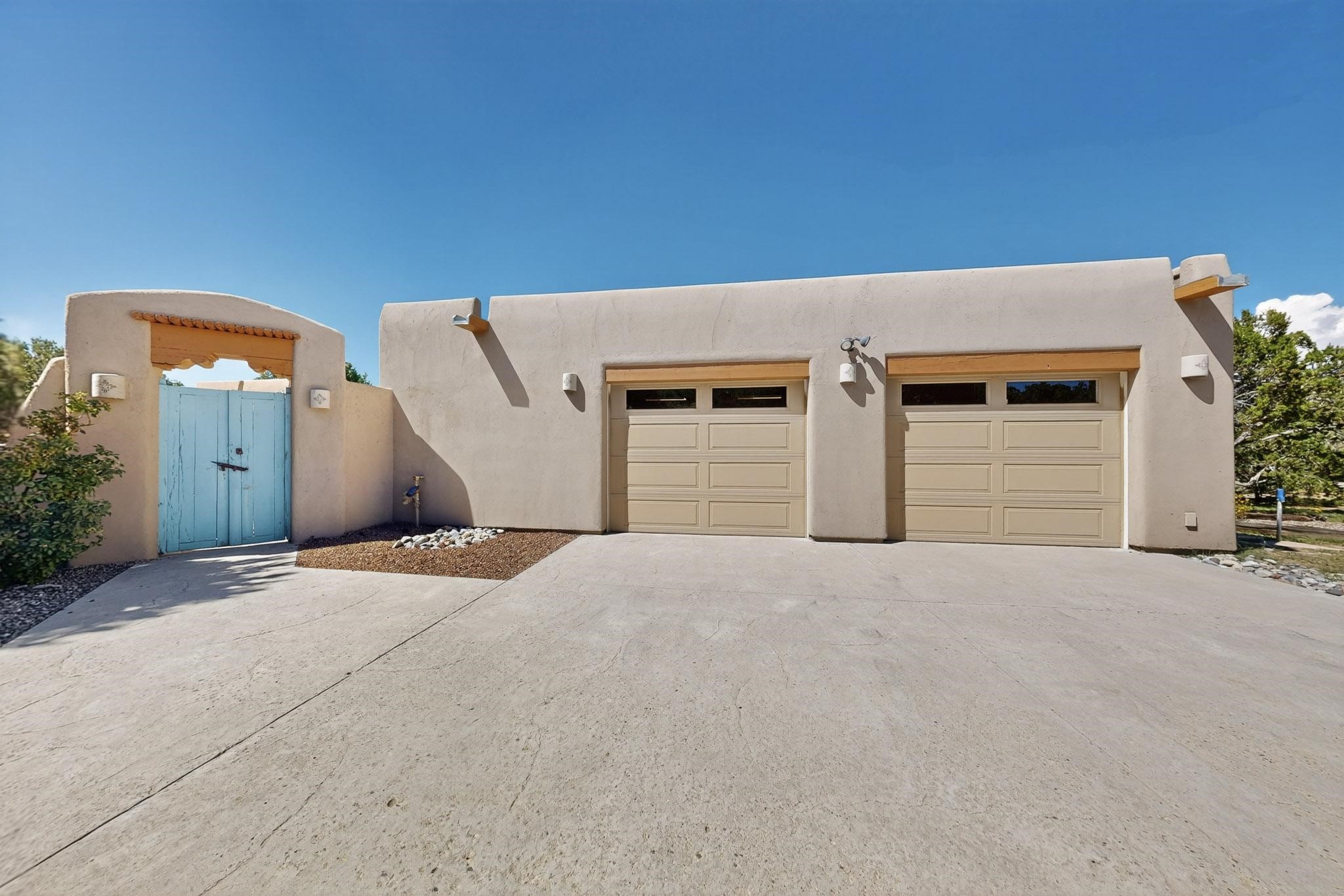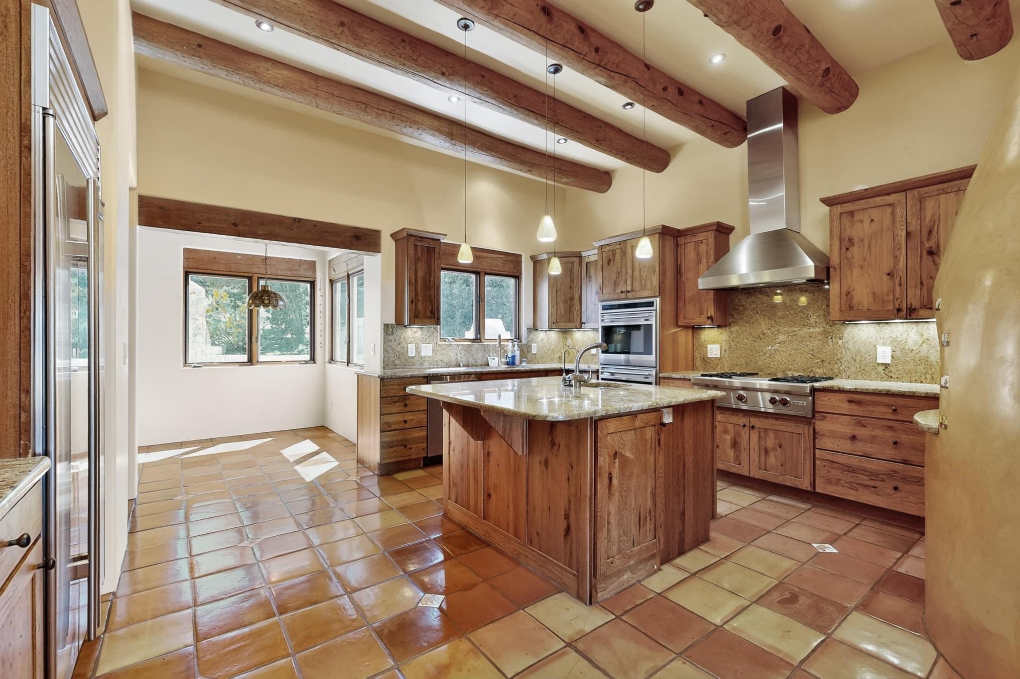 A rare offering in coveted Belicia Estates, custom designed and built this grand Santa Fe pueblo home delights the eye. From gleaming Saltillo tile floors to high viga ceilings, featuring lighted nichos, corbelled beams, 3 traditional kiva fireplaces, a pizza kiva in the kitchen plus an outside kiva for entertainment on the portal. Open plan, split bedroom floorpan creates a separate owners suite with 2 separate bathrooms, a large walk in closet and a separate study/office. There is a grand living room plus family/play room plus formal dining off the kitchen leading out to a wonderfully private walled outside entertainment area with foothill mountain views from the portal. There is a fun chefs kitchen with sunny breakfast nook and large island. There is a separate 2 bedroom and bath guest suite, and convenient laundry room which leads to the spacious 2 car garage. Positioned at the end of a paved cul de sac on 4.3acres close to the gated entry it is within easy reach to 2 local shopping centers, the Galisteo preserve and only minutes into historic Santa Fe. A must see:)