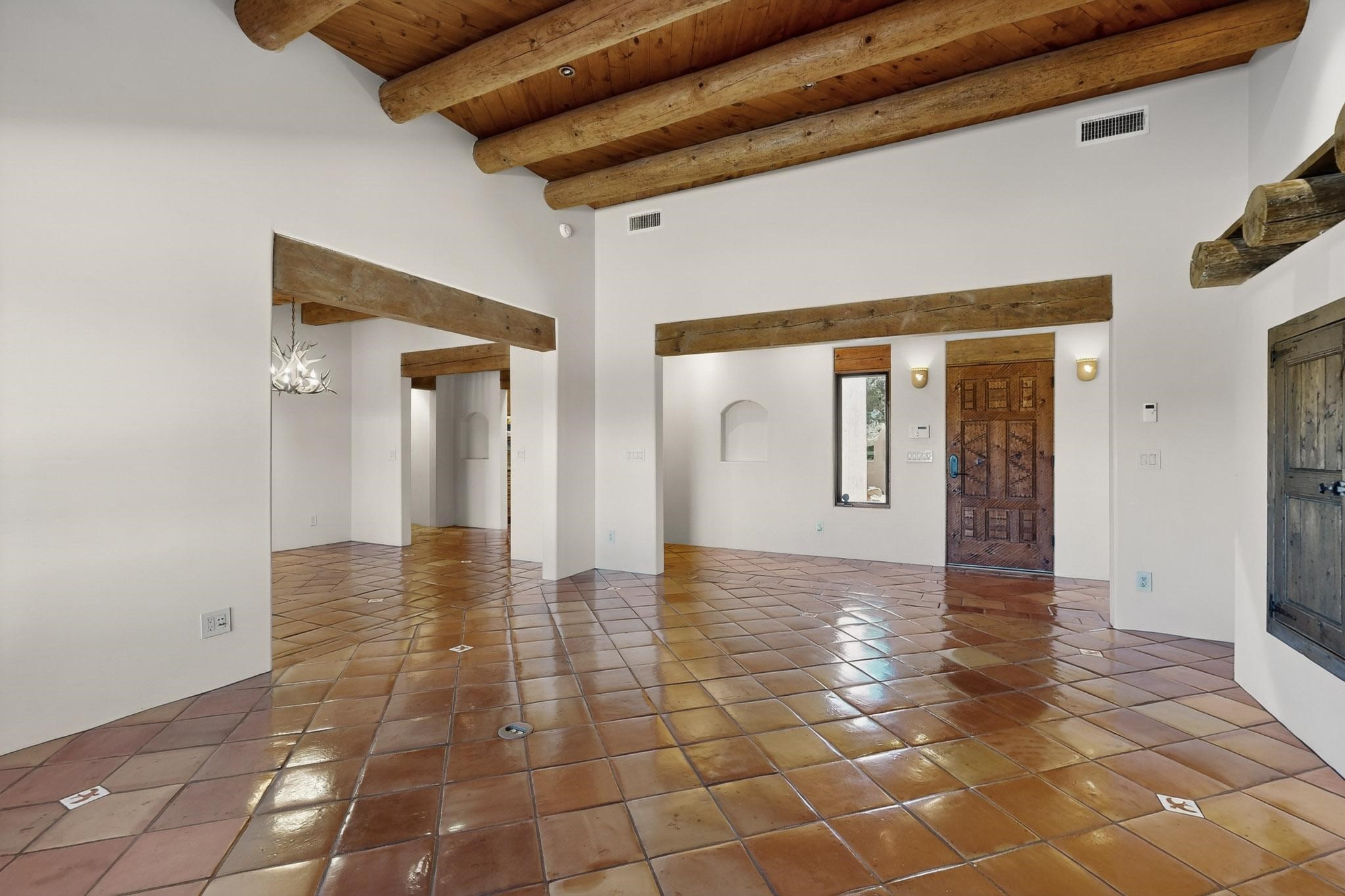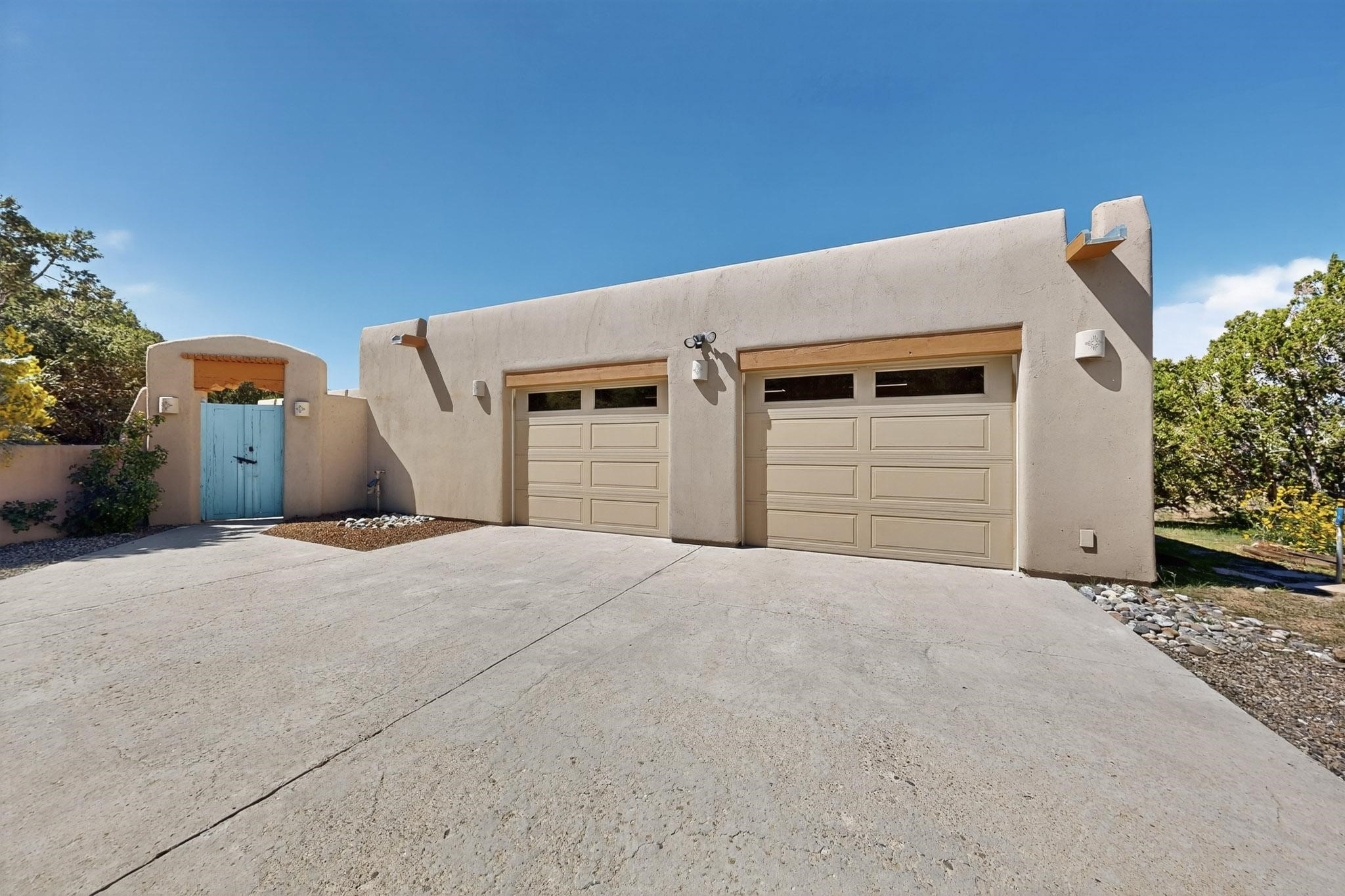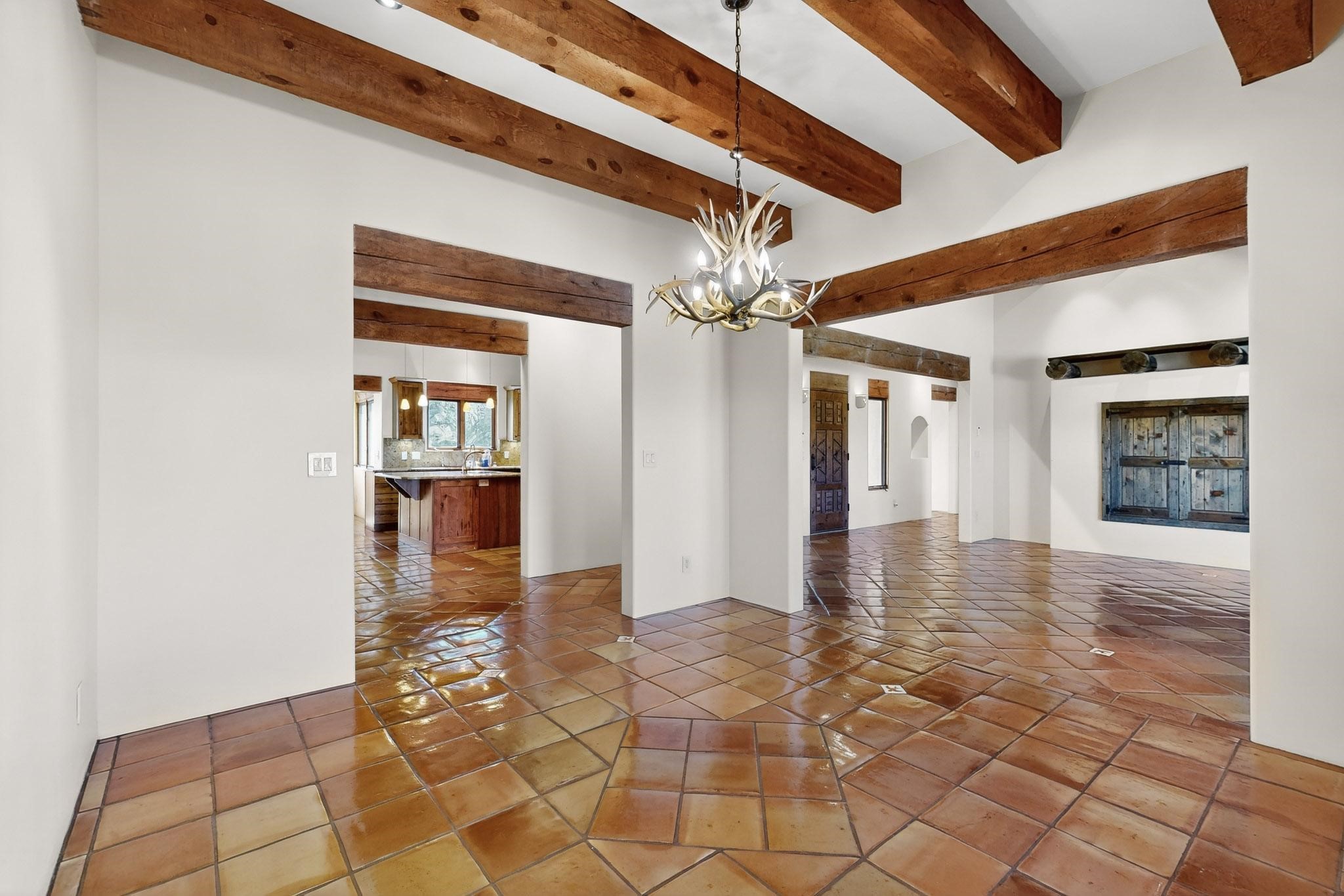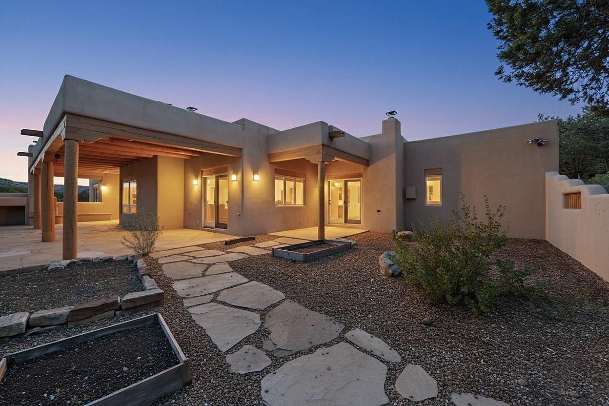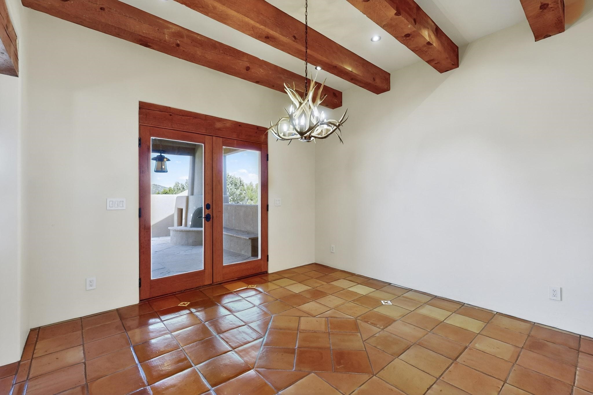 A rare offering in coveted Belicia Estates, custom designed and built this grand Santa Fe pueblo home delights the eye. From gleaming Saltillo tile floors to high viga ceilings, featuring lighted nichos, corbelled beams, 3 traditional kiva fireplaces, a pizza kiva in the kitchen plus an outside kiva for entertainment on the portal. Open plan, split bedroom floorpan creates a separate owners suite with 2 separate bathrooms, a large walk in closet and a separate study/office. There is a grand living room plus family/play room plus formal dining off the kitchen leading out to a wonderfully private walled outside entertainment area with foothill mountain views from the portal. There is a fun chefs kitchen with sunny breakfast nook and large island. There is a separate 2 bedroom and bath guest suite, and convenient laundry room which leads to the spacious 2 car garage. Positioned at the end of a paved cul de sac on 4.3acres close to the gated entry it is within easy reach to 2 local shopping centers, the Galisteo preserve and only minutes into historic Santa Fe. A must see:)