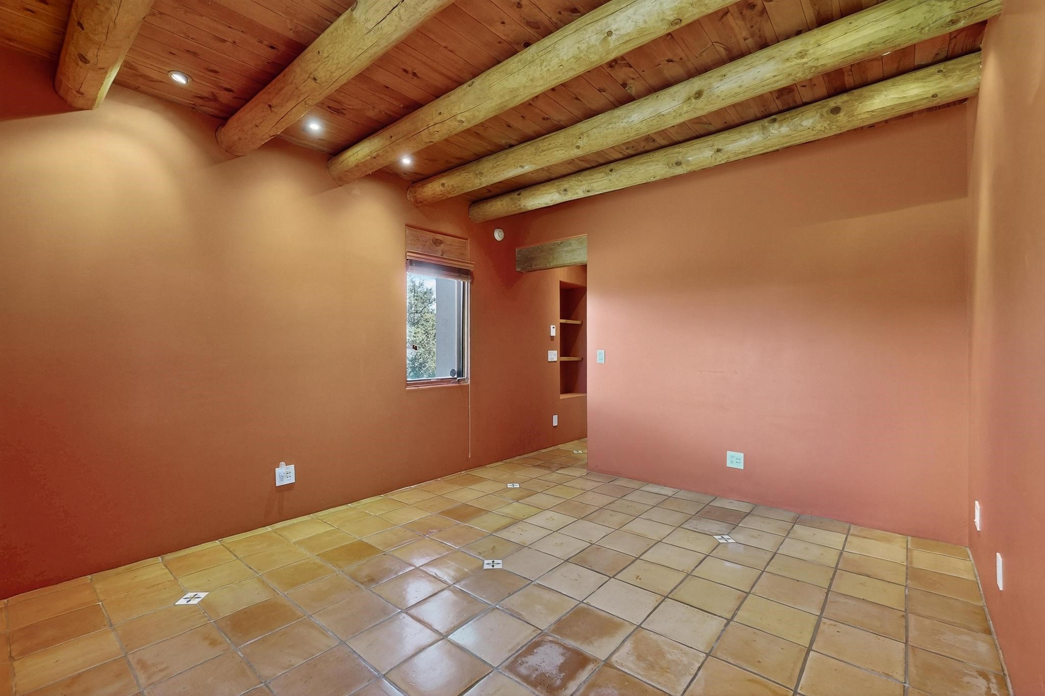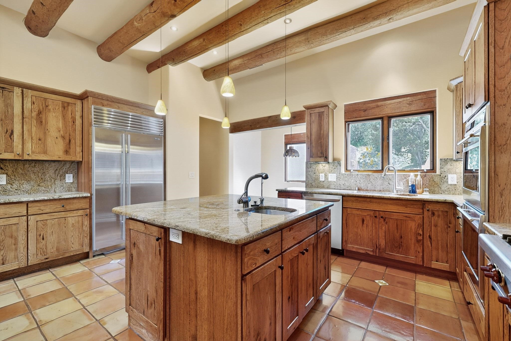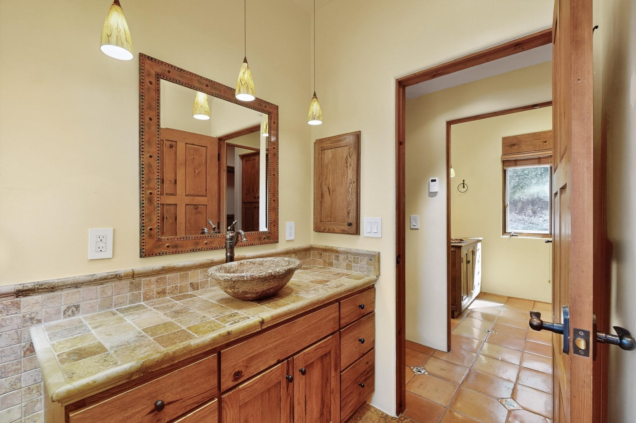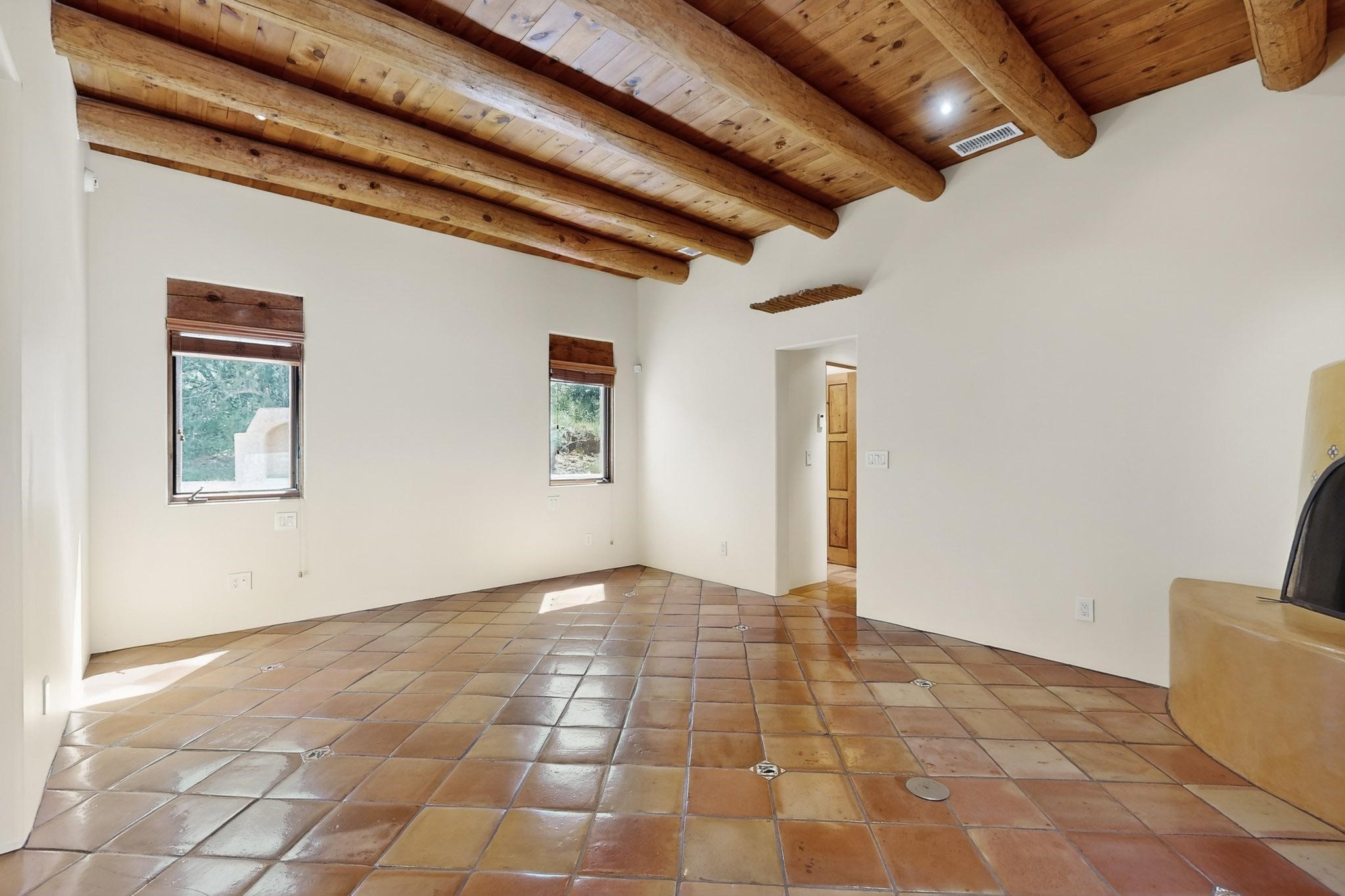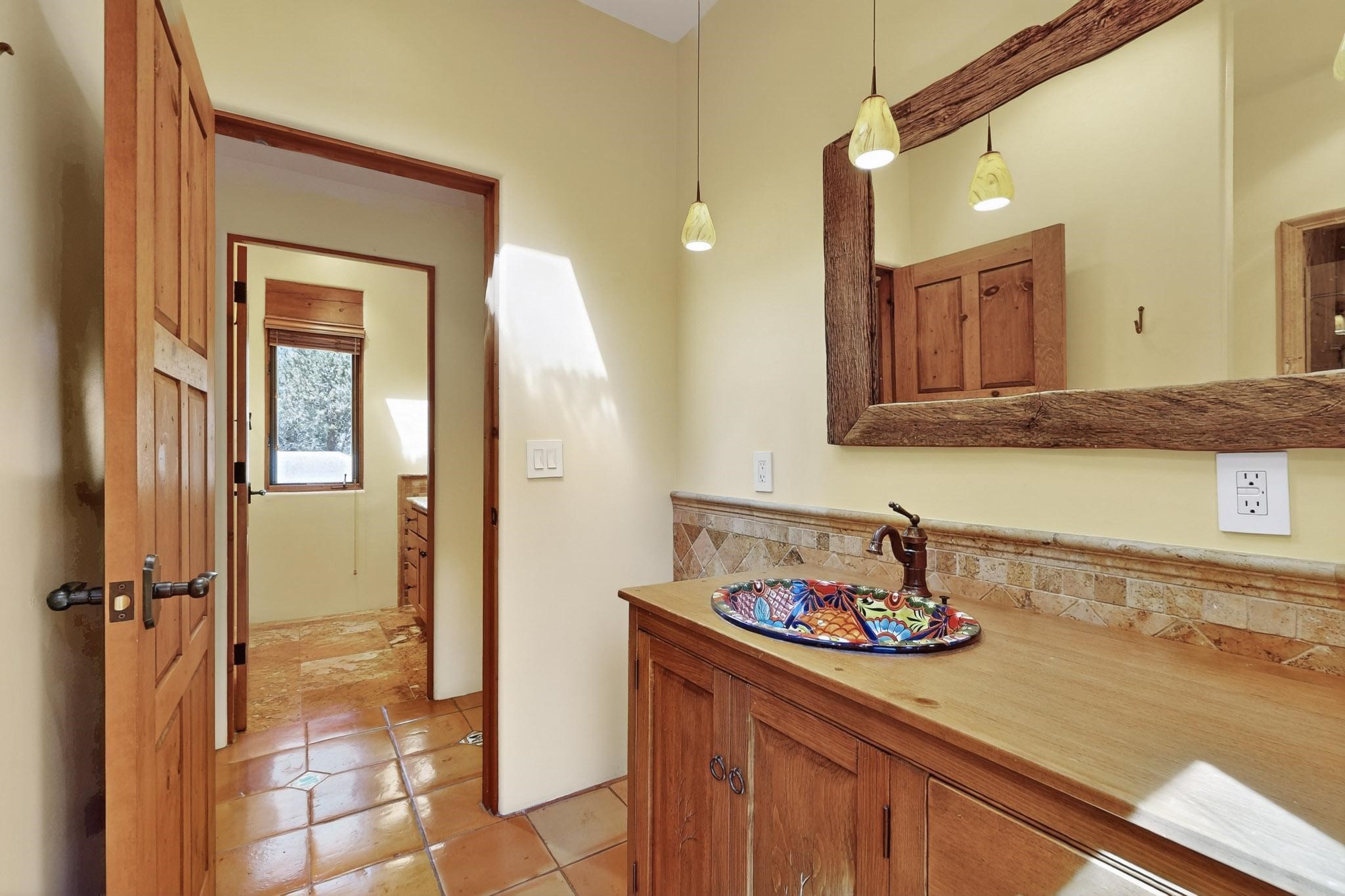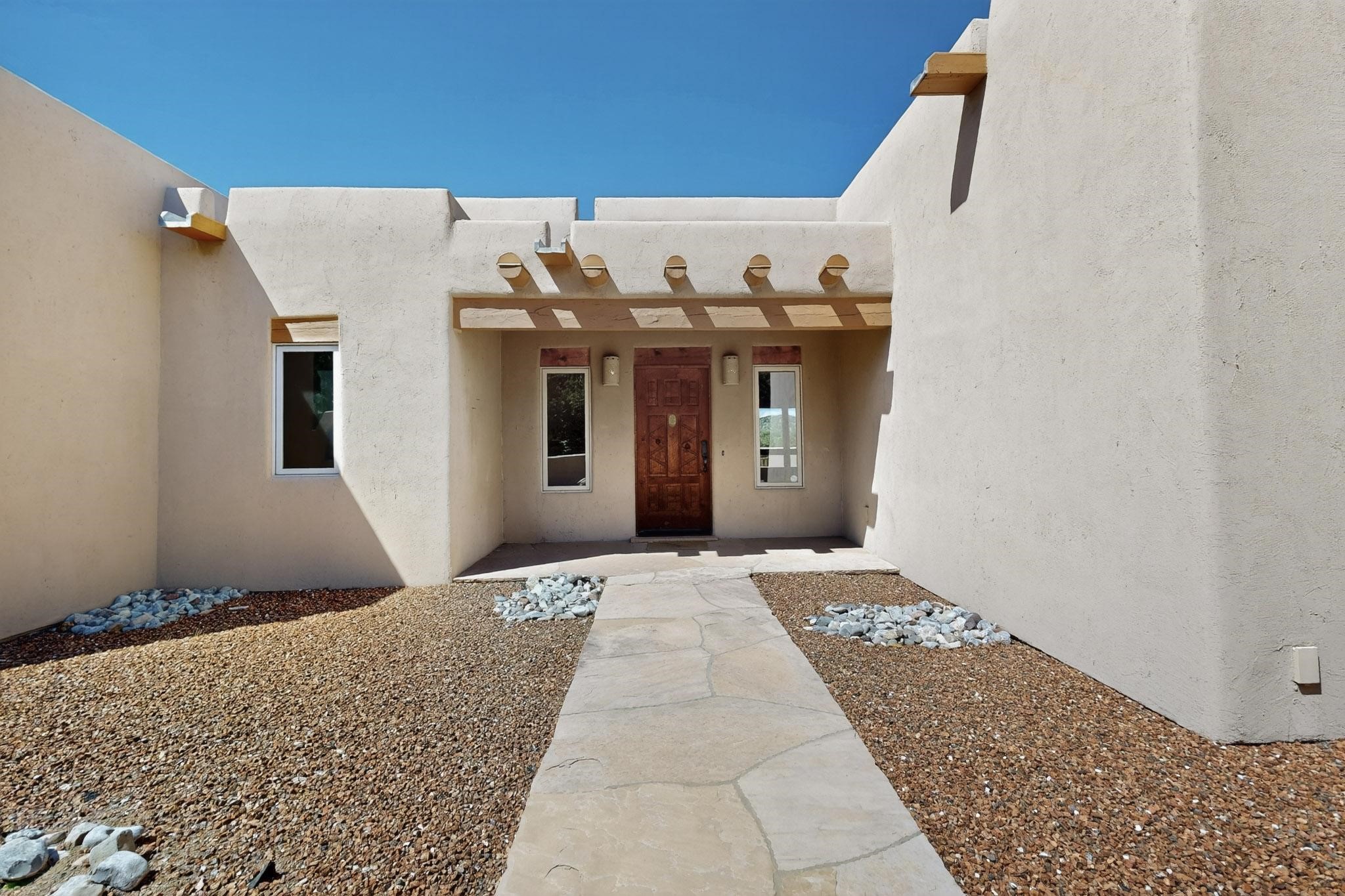 A rare offering in coveted Belicia Estates, custom designed and built this grand Santa Fe pueblo home delights the eye. From gleaming Saltillo tile floors to high viga ceilings, featuring lighted nichos, corbelled beams, 3 traditional kiva fireplaces, a pizza kiva in the kitchen plus an outside kiva for entertainment on the portal. Open plan, split bedroom floorpan creates a separate owners suite with 2 separate bathrooms, a large walk in closet and a separate study/office. There is a grand living room plus family/play room plus formal dining off the kitchen leading out to a wonderfully private walled outside entertainment area with foothill mountain views from the portal. There is a fun chefs kitchen with sunny breakfast nook and large island. There is a separate 2 bedroom and bath guest suite, and convenient laundry room which leads to the spacious 2 car garage. Positioned at the end of a paved cul de sac on 4.3acres close to the gated entry it is within easy reach to 2 local shopping centers, the Galisteo preserve and only minutes into historic Santa Fe. A must see:)