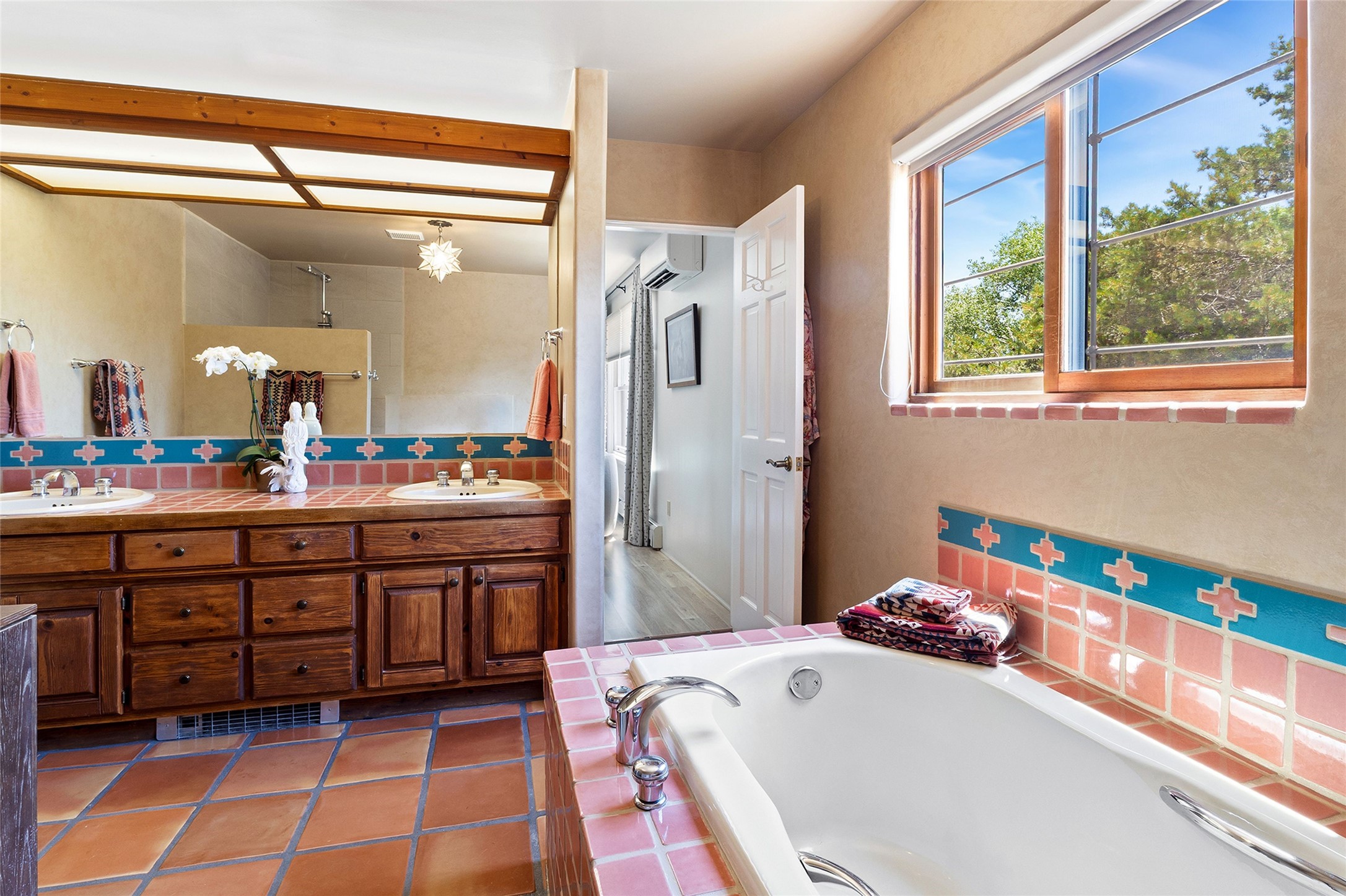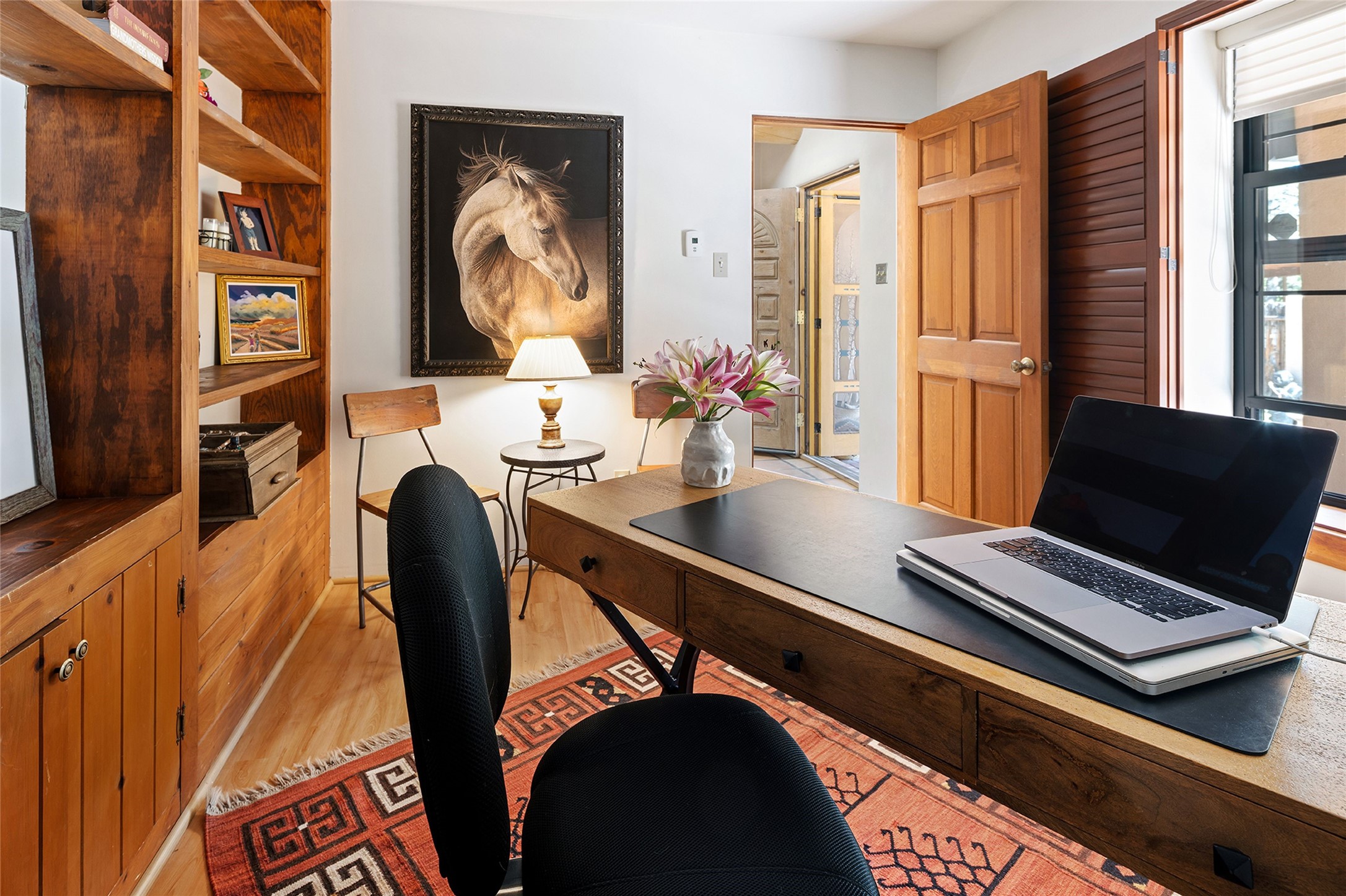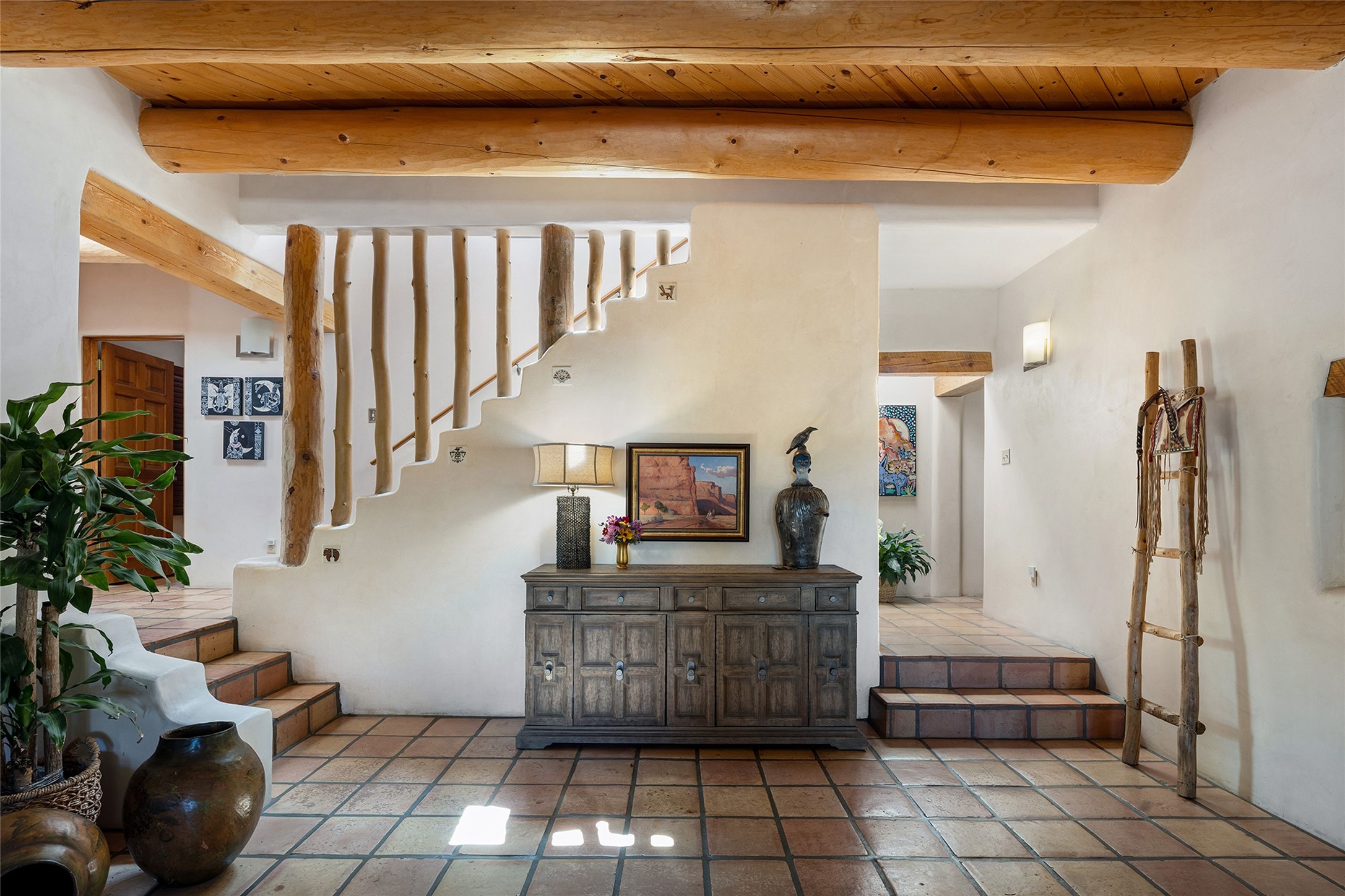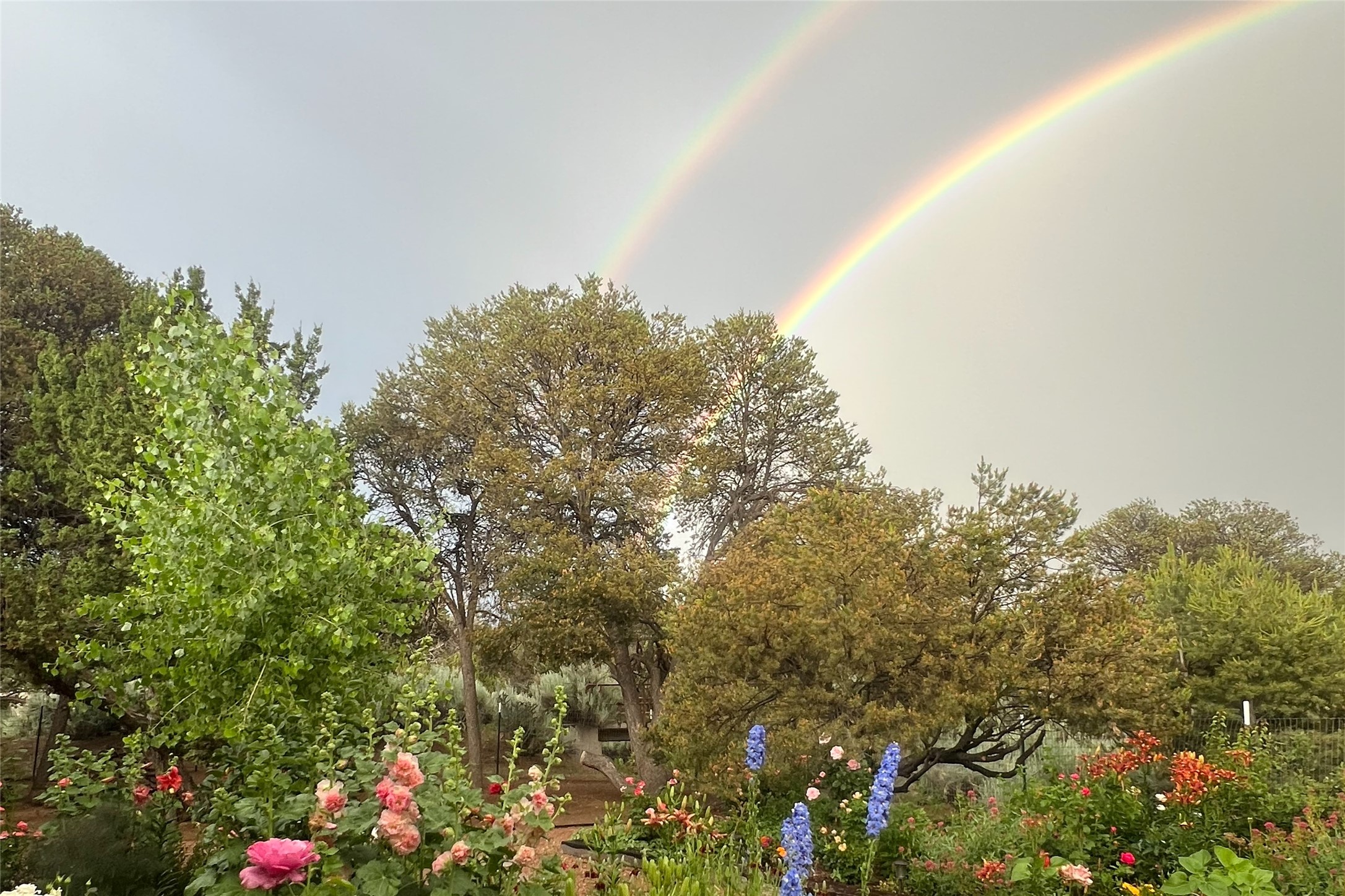 Welcome to 104 Calle Paula in highly coveted Sol y Lomas, an exquisitely appointed 4-bed, 3.5-bath home on 1.12 private, flourishing acres in the heart of Santa Fe. Seamlessly blending refined interiors with expansive outdoor living, this property is the perfect retreat for quiet living or elegant entertaining. The updated chef's kitchen features Wolf and Viking appliances, custom cabinetry, and sleek stone countertops, ideal for culinary creativity. Each bedroom is thoughtfully designed, including a serene primary suite with a spa-like bath, walk-in closet, and private patio with views to the north, east, and west. High ceilings with large vigas, artisanal finishes, and multiple kiva fireplaces, indoors and out, infuse the home with timeless Santa Fe warmth and charm. Outdoor living is equally inviting, with shaded portals, peaceful patios, and lush gardens featuring mature trees, a small orchard, and beautifully crafted gathering spaces. A charming detached studio offers flexible space for art or work, adding even more versatility to the property. Set on an expansive lot, the home offers abundant room to unwind, cultivate, or simply savor the tranquility of its surroundings. Tucked in a quiet enclave just minutes from the historic Santa Fe Plaza, top restaurants, medical facilities, and grocery stores, this home offers a rare blend of privacy, style, and convenience. This is Santa Fe living at its finest. Schedule your private showing today.