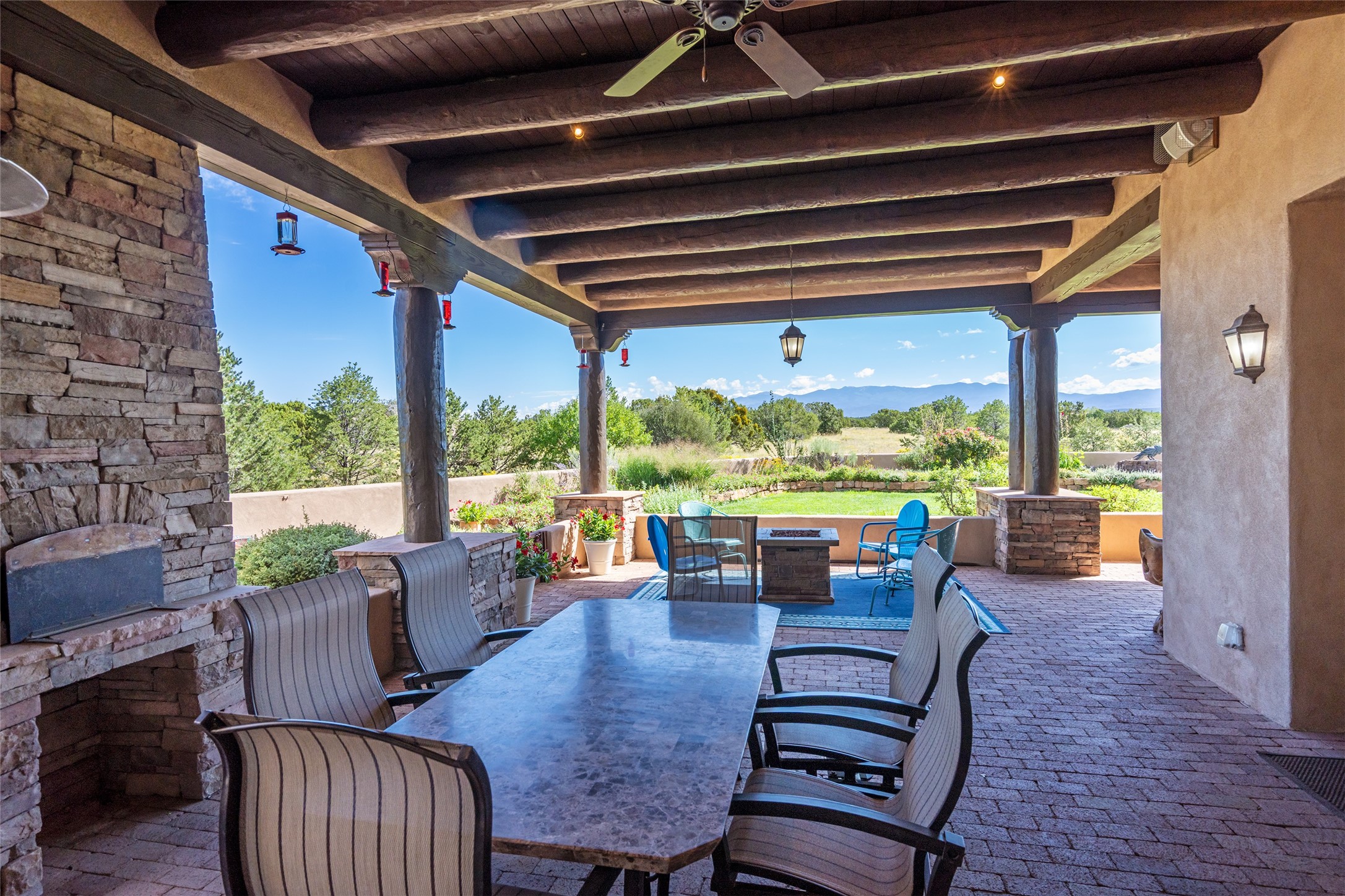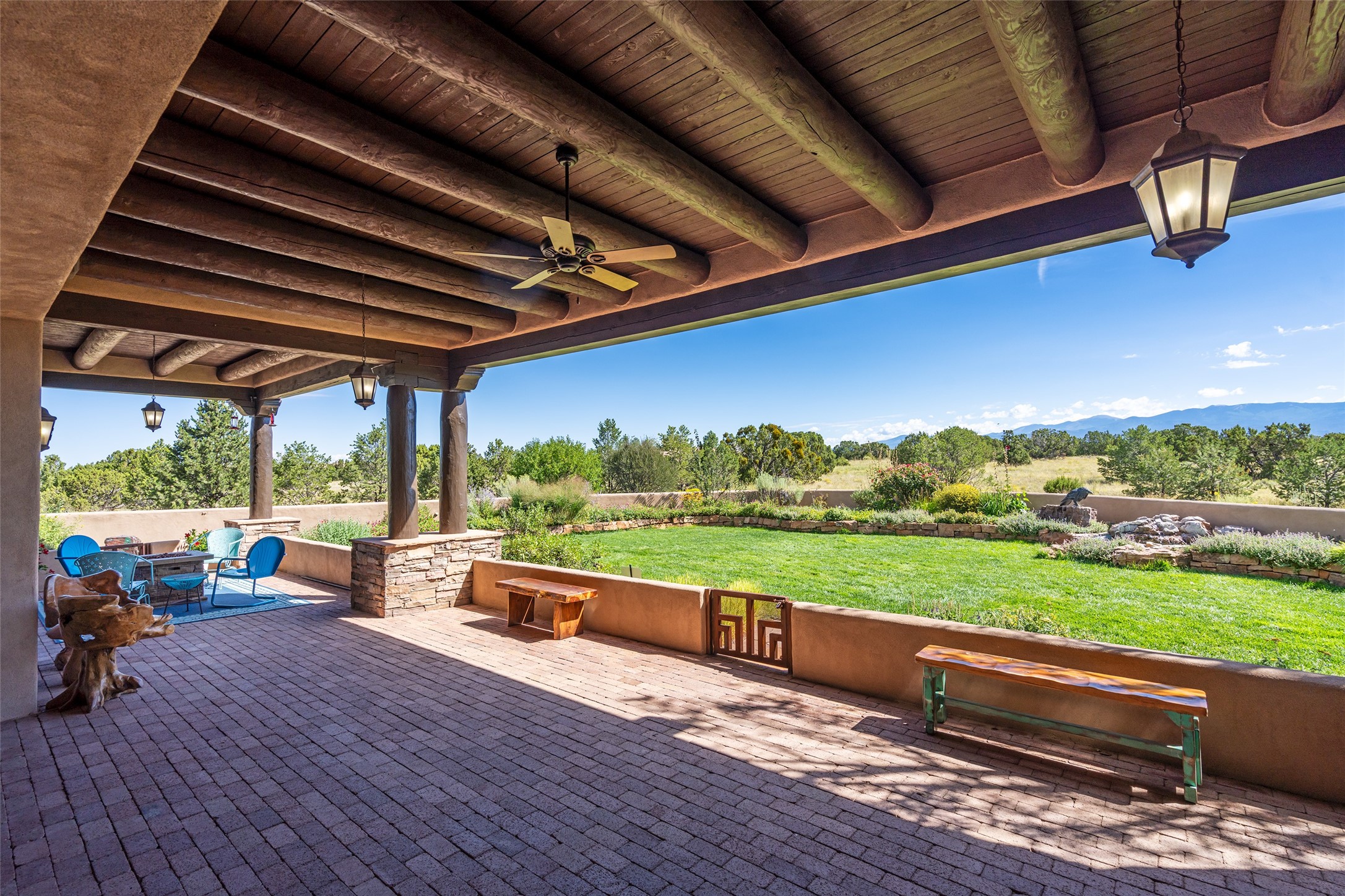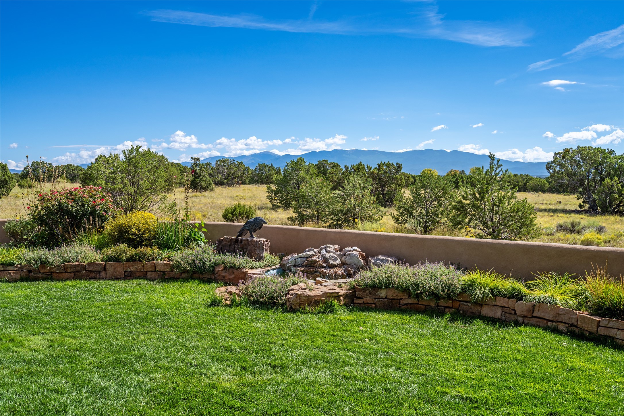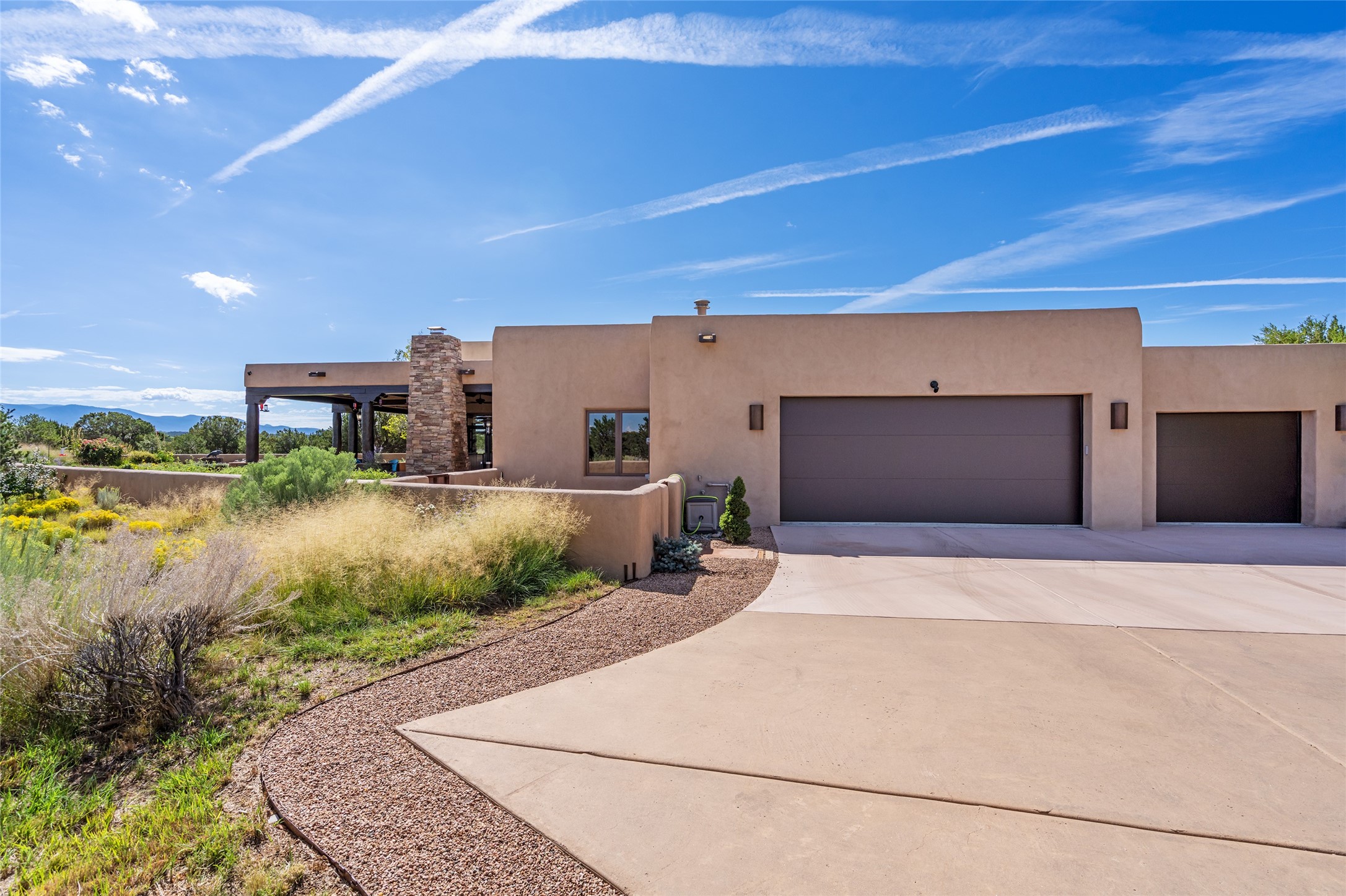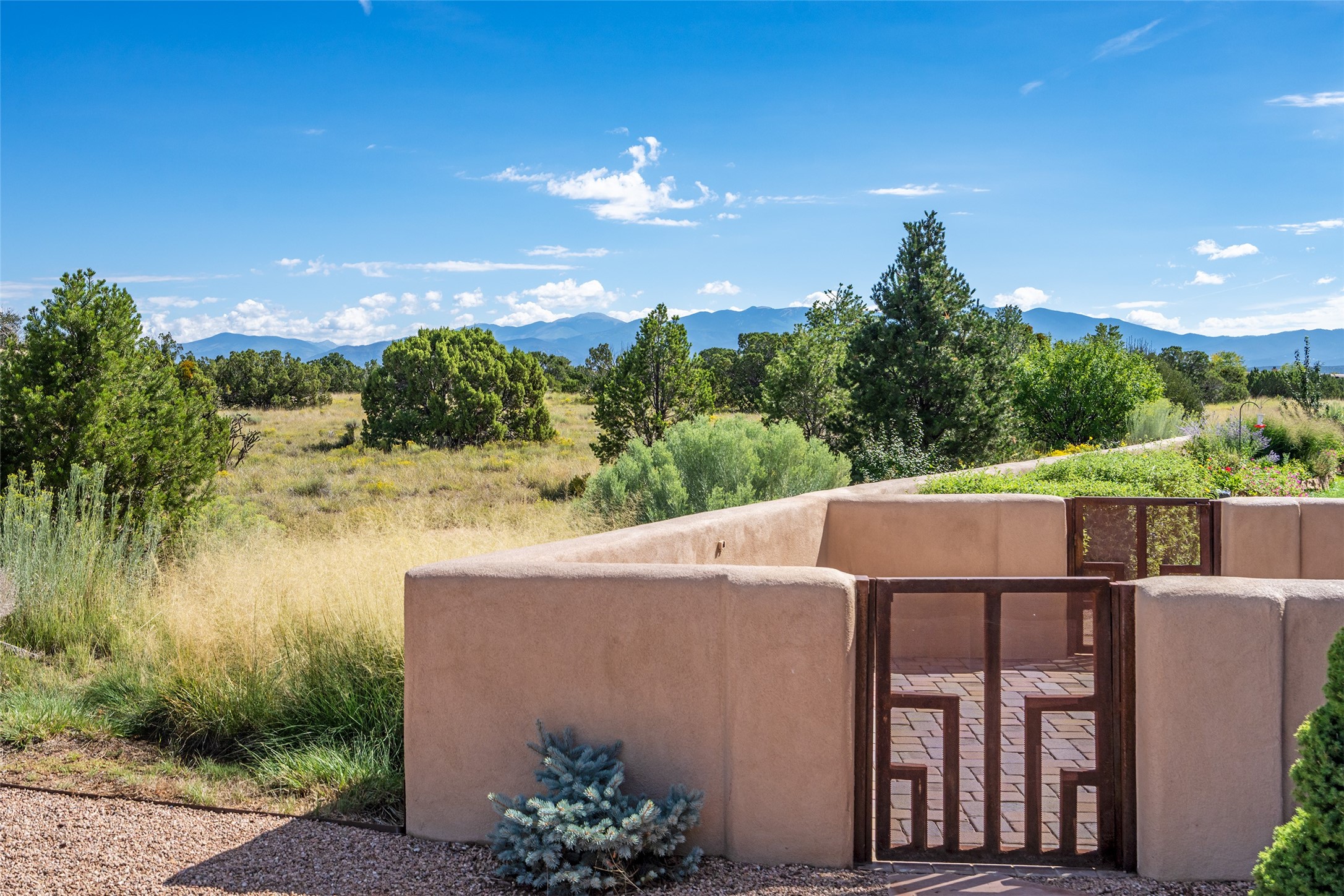 PANORAMIC VIEWS AND TIMELESS DESIGN IN LAS CAMPANAS. This refined residence in the Las Campanas community combines sweeping mountain vistas with many updates and enduring style in a hard-to-find 4 bedroom with a dramatic architecture. An inviting courtyard entry opens to generous living spaces framed by a dramatic sliding glass wall, creating seamless indoor-outdoor living. Towering viga-lined ceilings and plaster walls frame the spaces. The gourmet kitchen features dual Sub-Zero refrigerators, a Sub-Zero ice maker, and expanded storage. The owner's suite offers a quiet and spacious retreat, while a large media/game room provides flexibility for entertainment or relaxation. Recent enhancements include upgraded landscaping, refreshed interiors, and mechanical improvements that elevate both comfort and efficiency. Outdoor areas are designed for year-round enjoyment, with covered dining spaces, a pizza oven, and xeric, drip-irrigated gardens that are both lush and easy to maintain. Residents enjoy close proximity to The Club at Las Campanas, with spa, fitness, and dining amenities (membership available through the private Club at Las Campanas) as well as direct access to miles of walking paths. A move-in ready home blending elegant finishes, multiple upgrades, and the best of Santa Fe living.