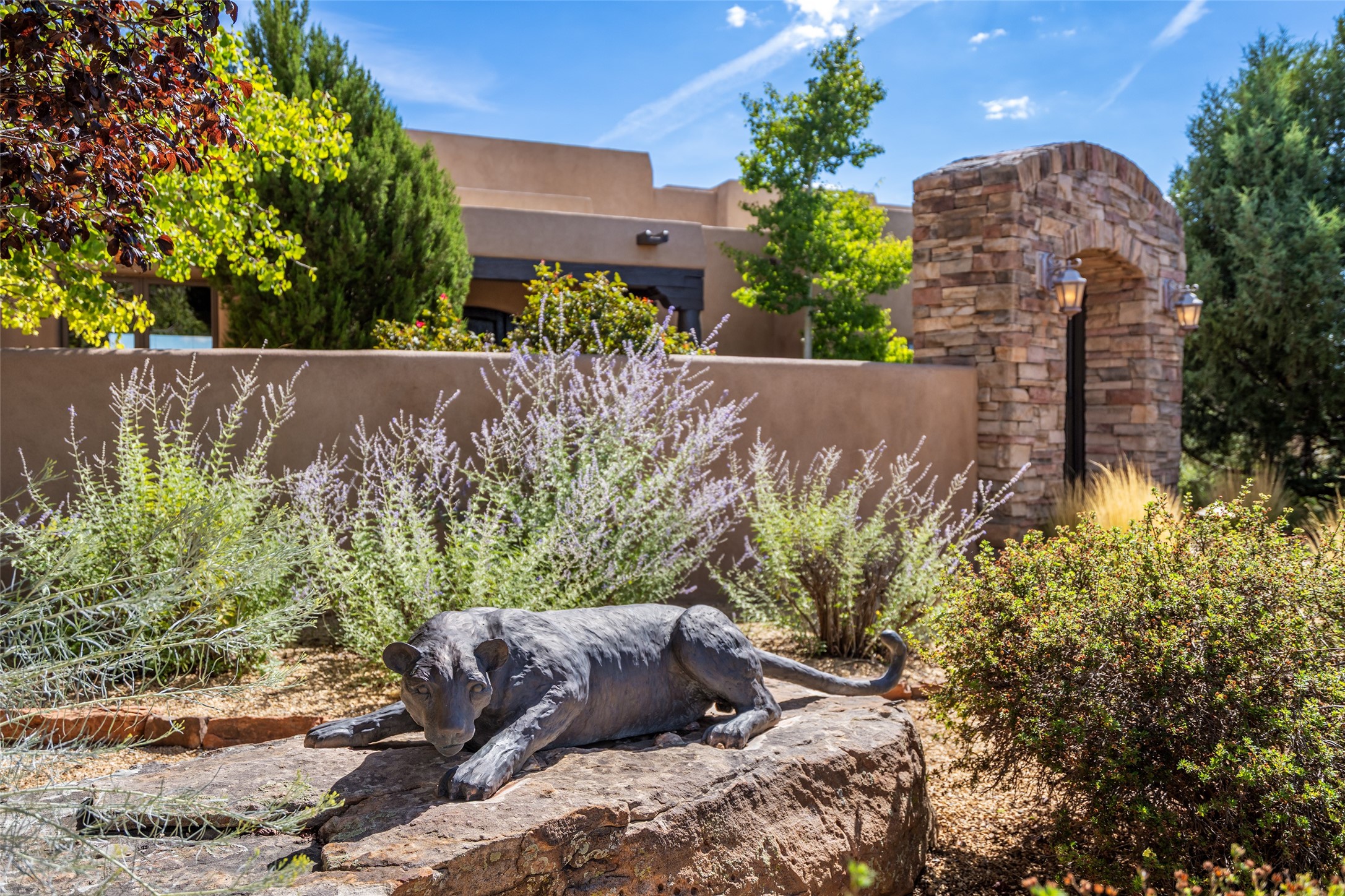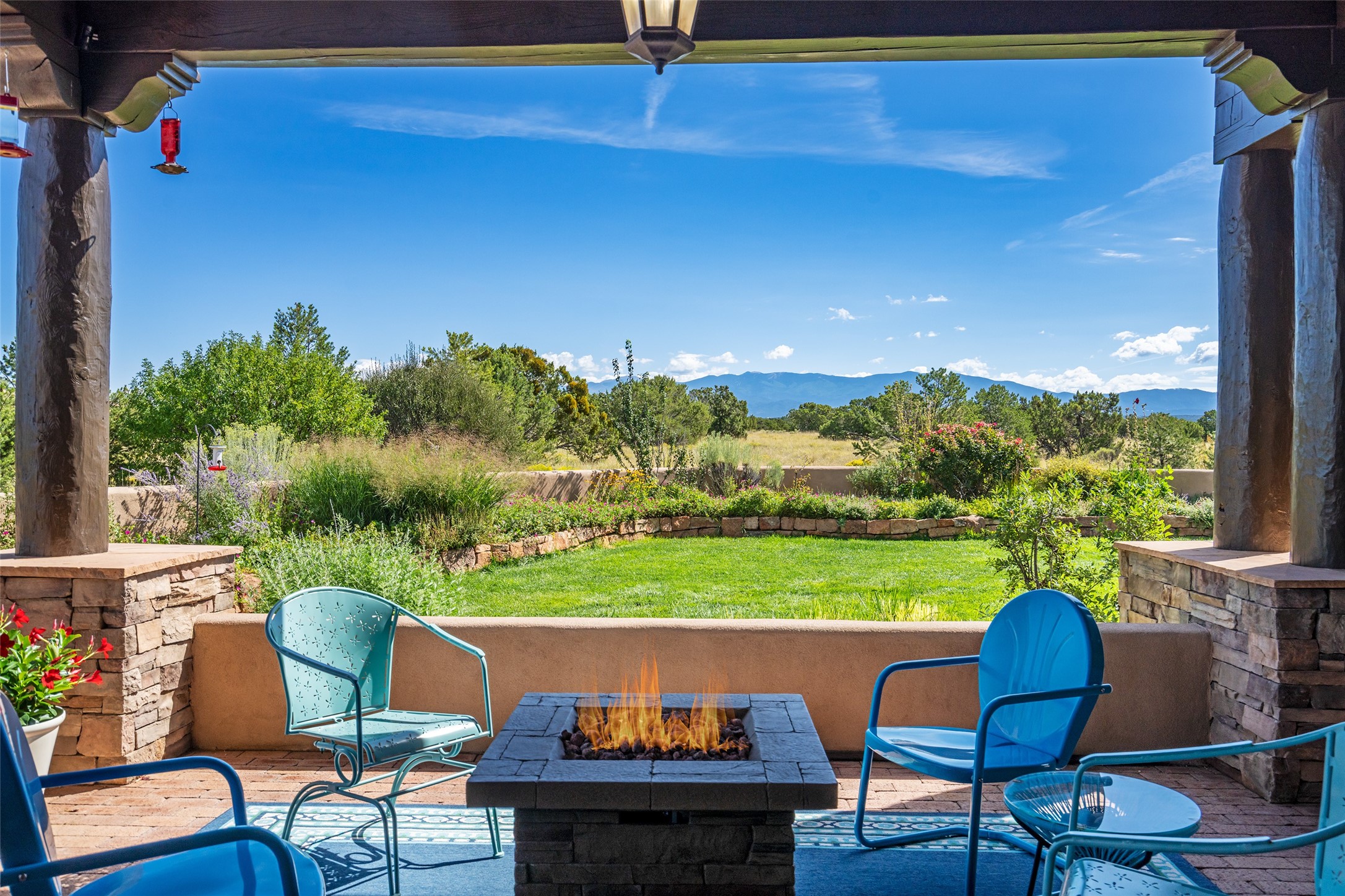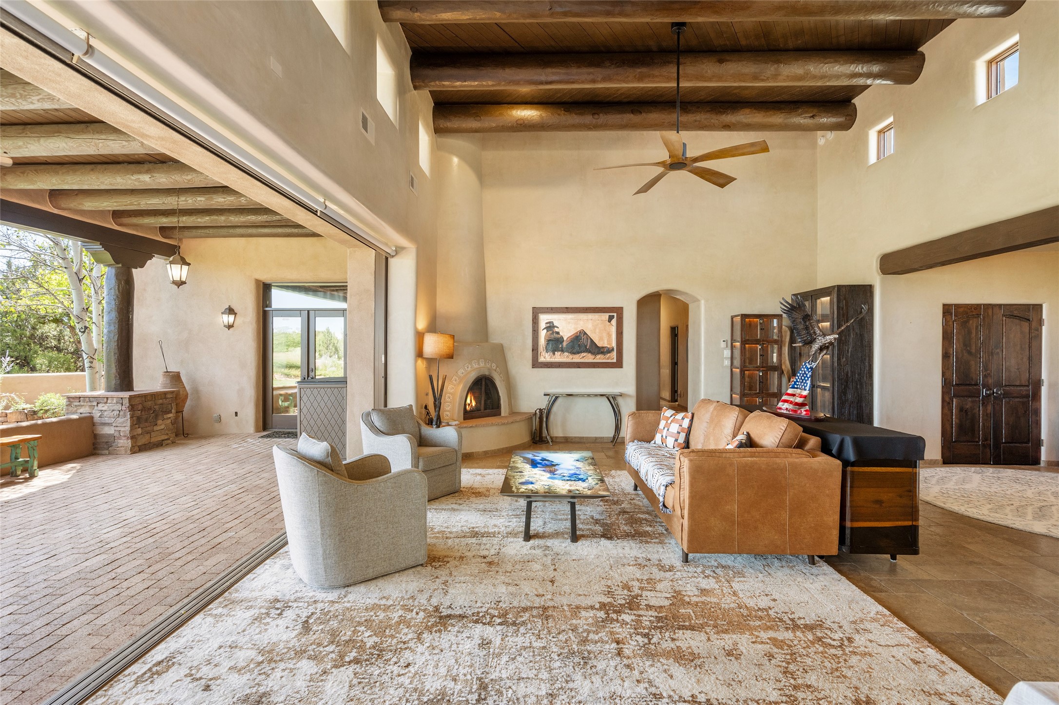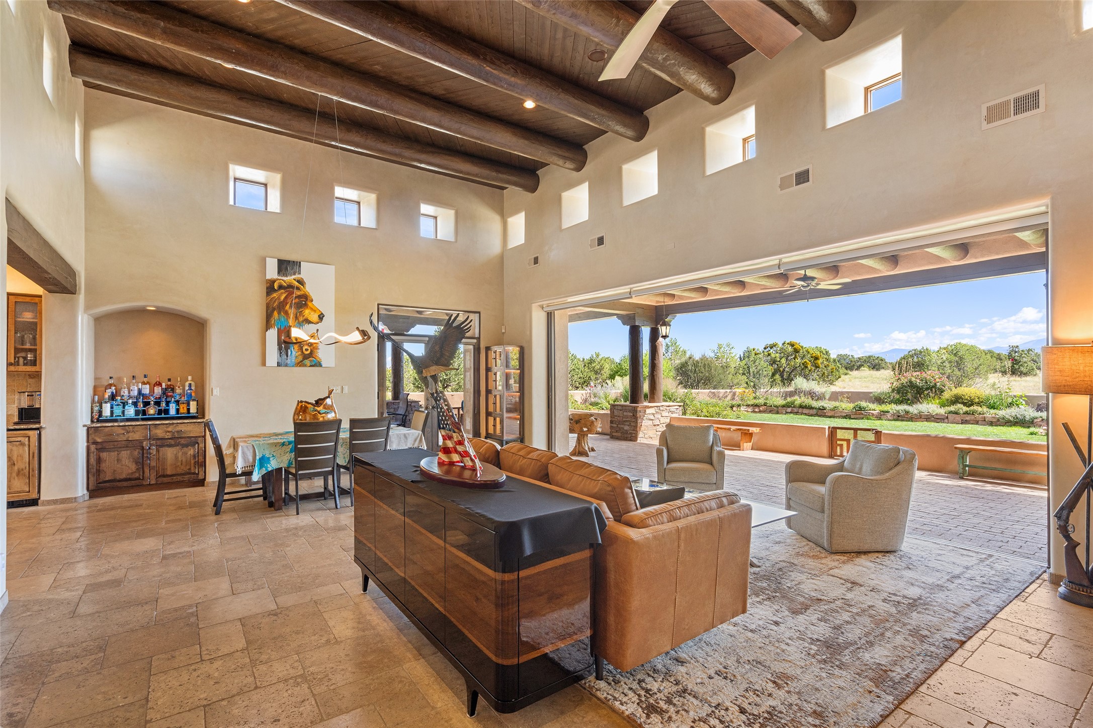 PANORAMIC VIEWS AND TIMELESS DESIGN IN LAS CAMPANAS. This refined residence in the Las Campanas community combines sweeping mountain vistas with many updates and enduring style in a hard-to-find 4 bedroom with a dramatic architecture. An inviting courtyard entry opens to generous living spaces framed by a dramatic sliding glass wall, creating seamless indoor-outdoor living. Towering viga-lined ceilings and plaster walls frame the spaces. The gourmet kitchen features dual Sub-Zero refrigerators, a Sub-Zero ice maker, and expanded storage. The owner's suite offers a quiet and spacious retreat, while a large media/game room provides flexibility for entertainment or relaxation. Recent enhancements include upgraded landscaping, refreshed interiors, and mechanical improvements that elevate both comfort and efficiency. Outdoor areas are designed for year-round enjoyment, with covered dining spaces, a pizza oven, and xeric, drip-irrigated gardens that are both lush and easy to maintain. Residents enjoy close proximity to The Club at Las Campanas, with spa, fitness, and dining amenities (membership available through the private Club at Las Campanas) as well as direct access to miles of walking paths. A move-in ready home blending elegant finishes, multiple upgrades, and the best of Santa Fe living.
