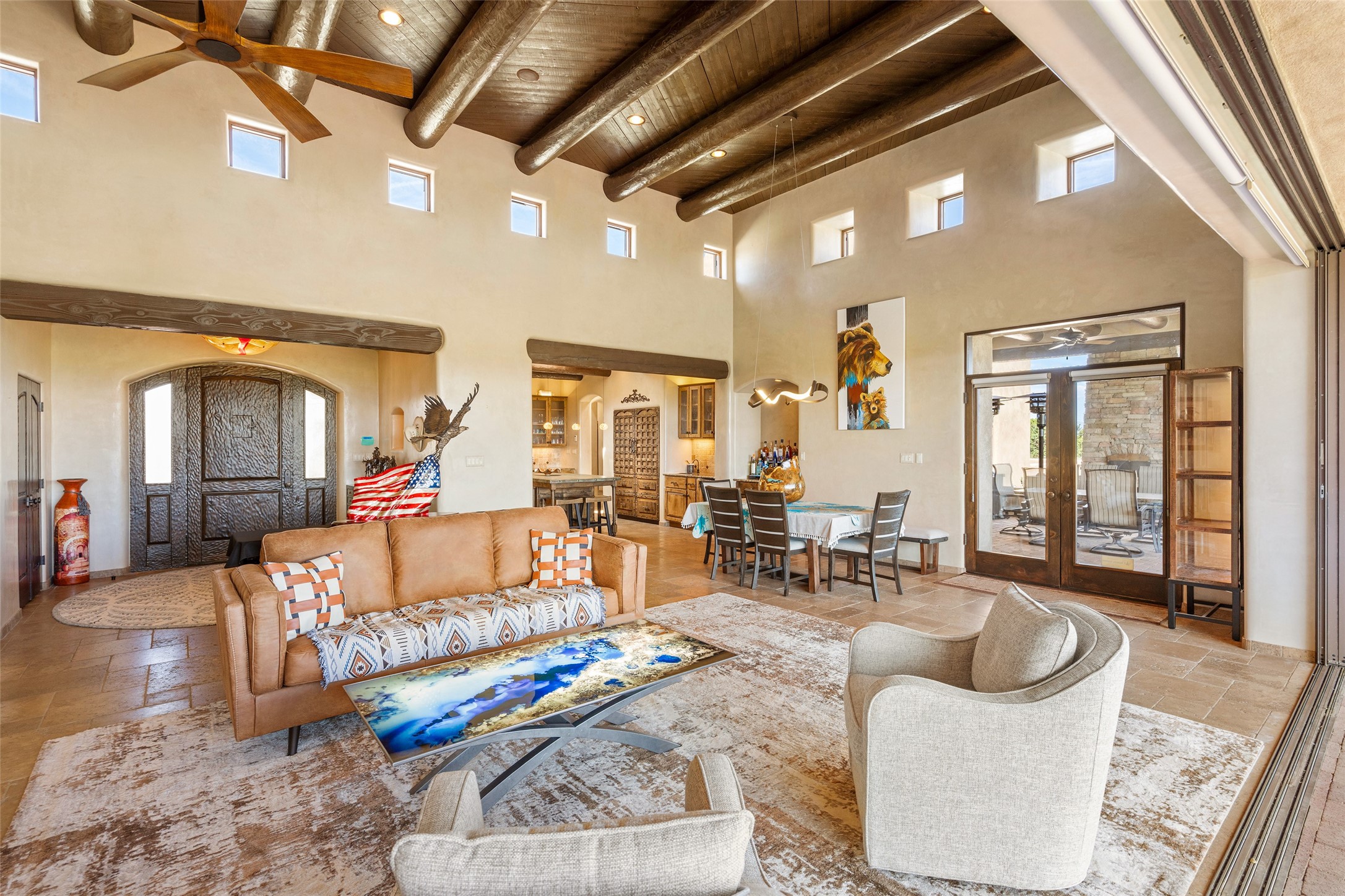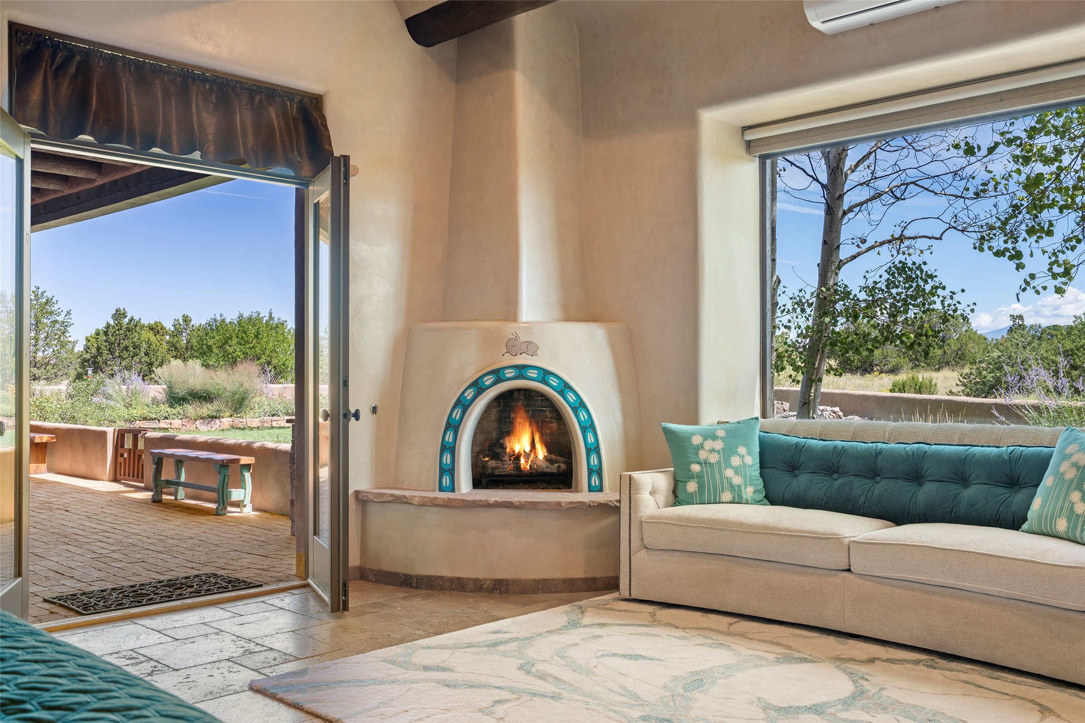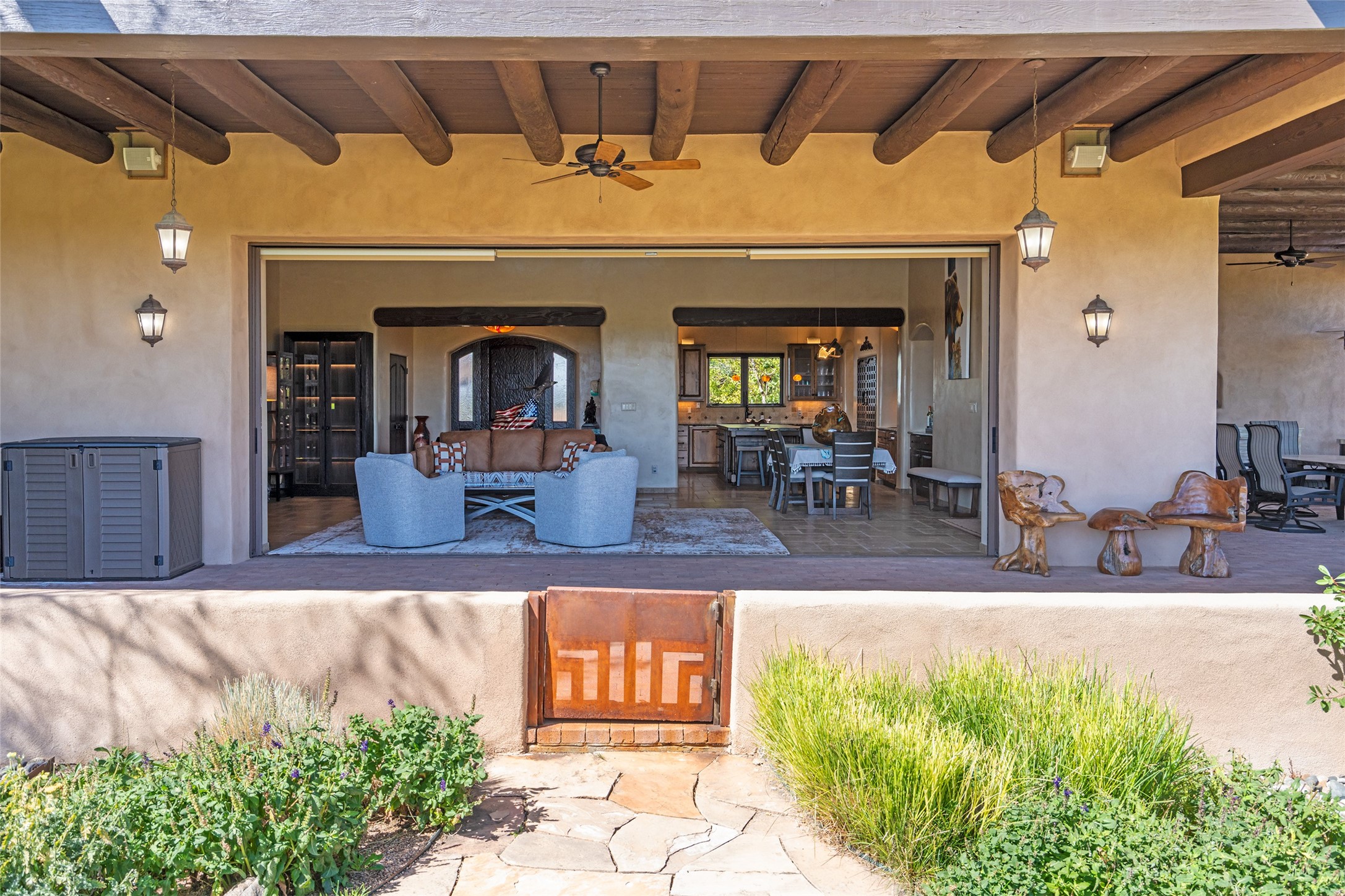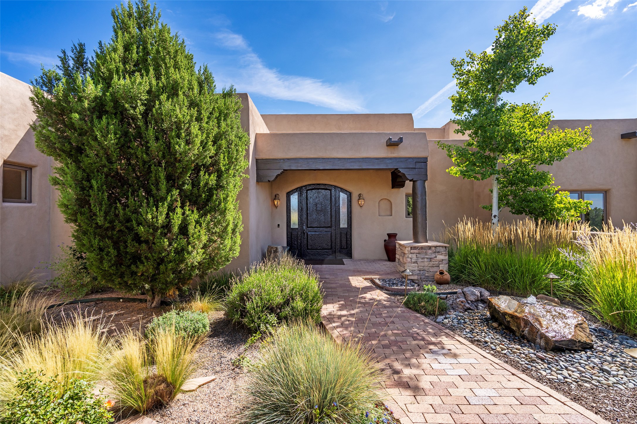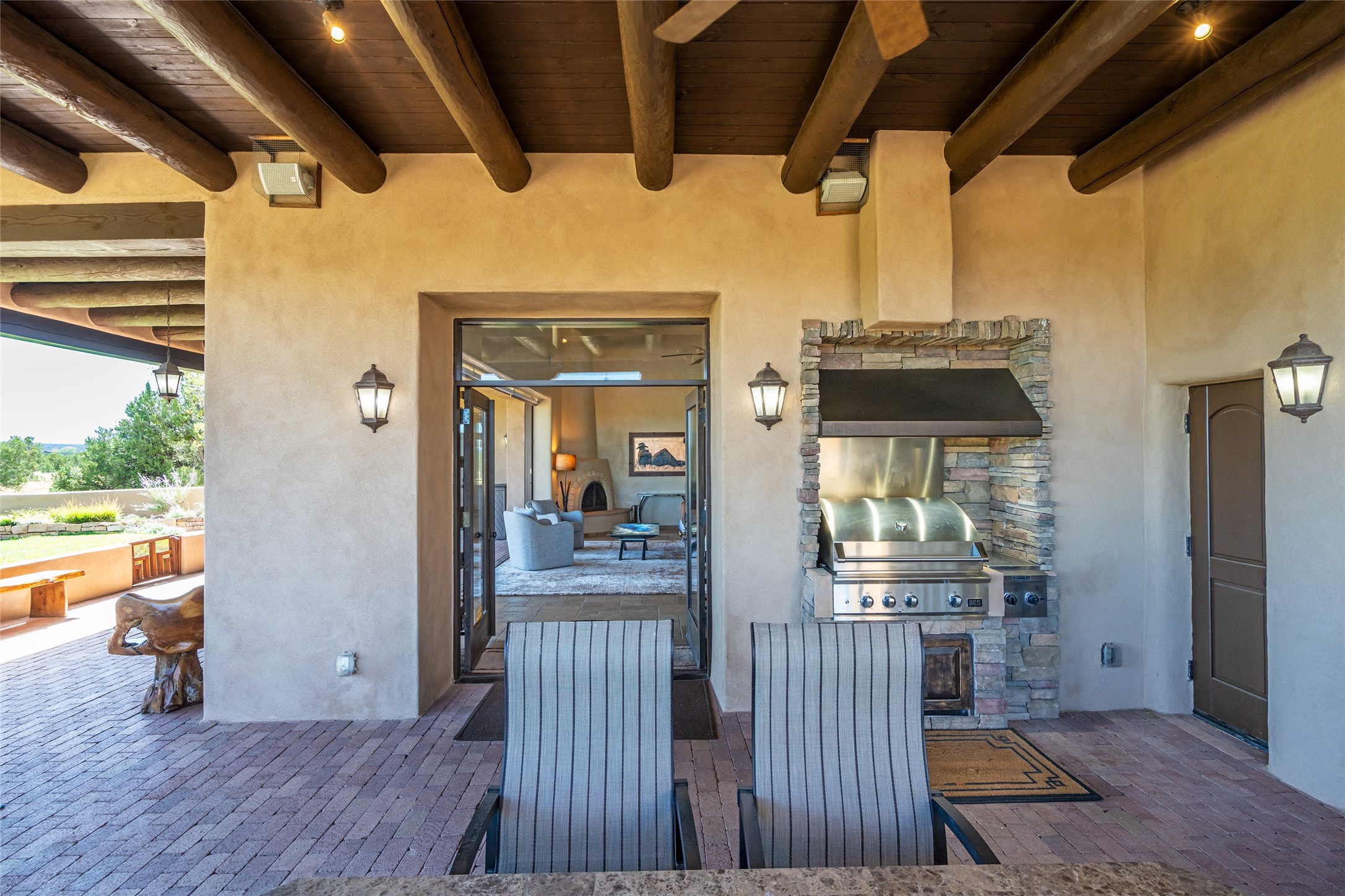 PANORAMIC VIEWS AND TIMELESS DESIGN IN LAS CAMPANAS. This refined residence in the Las Campanas community combines sweeping mountain vistas with many updates and enduring style in a hard-to-find 4 bedroom with a dramatic architecture. An inviting courtyard entry opens to generous living spaces framed by a dramatic sliding glass wall, creating seamless indoor-outdoor living. Towering viga-lined ceilings and plaster walls frame the spaces. The gourmet kitchen features dual Sub-Zero refrigerators, a Sub-Zero ice maker, and expanded storage. The owner's suite offers a quiet and spacious retreat, while a large media/game room provides flexibility for entertainment or relaxation. Recent enhancements include upgraded landscaping, refreshed interiors, and mechanical improvements that elevate both comfort and efficiency. Outdoor areas are designed for year-round enjoyment, with covered dining spaces, a pizza oven, and xeric, drip-irrigated gardens that are both lush and easy to maintain. Residents enjoy close proximity to The Club at Las Campanas, with spa, fitness, and dining amenities (membership available through the private Club at Las Campanas) as well as direct access to miles of walking paths. A move-in ready home blending elegant finishes, multiple upgrades, and the best of Santa Fe living.