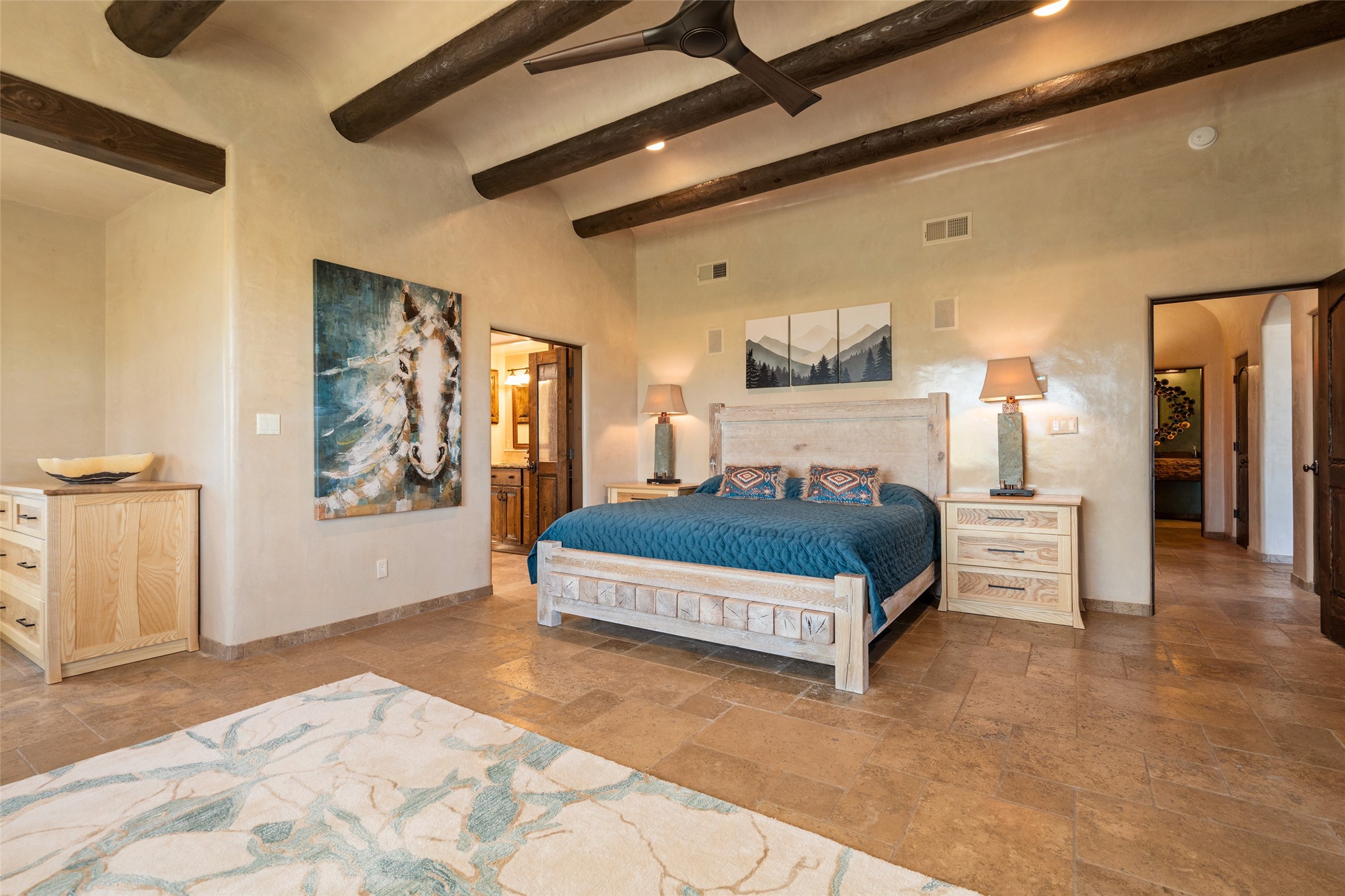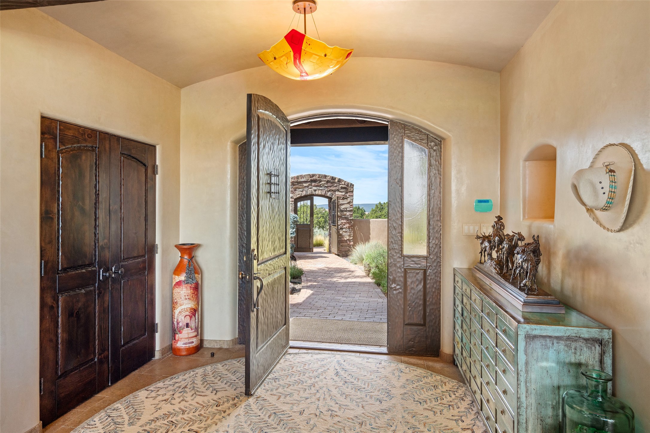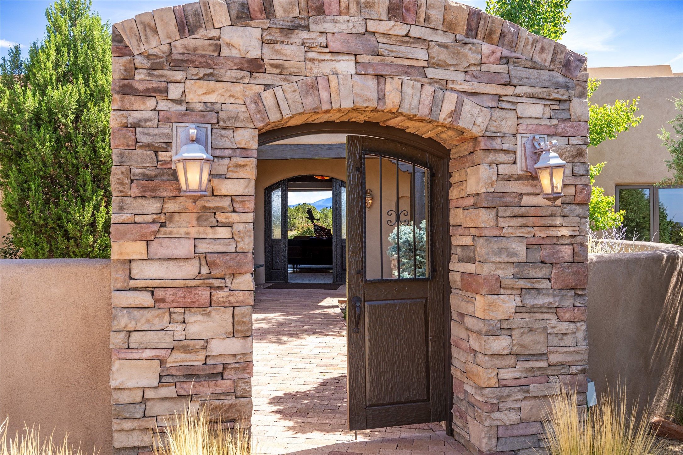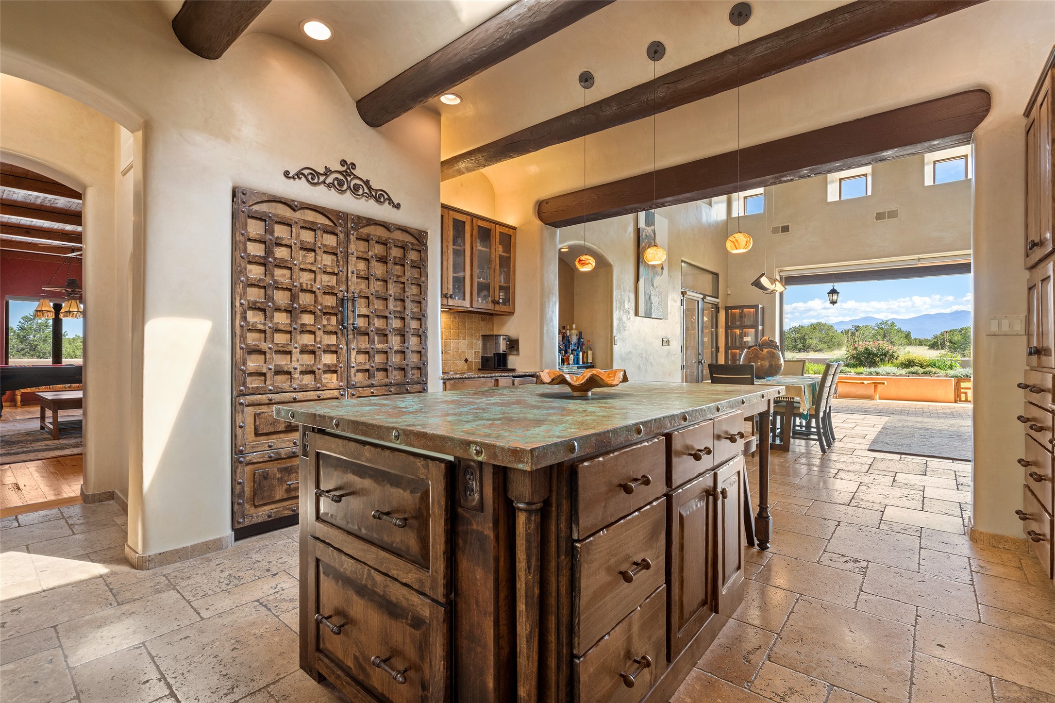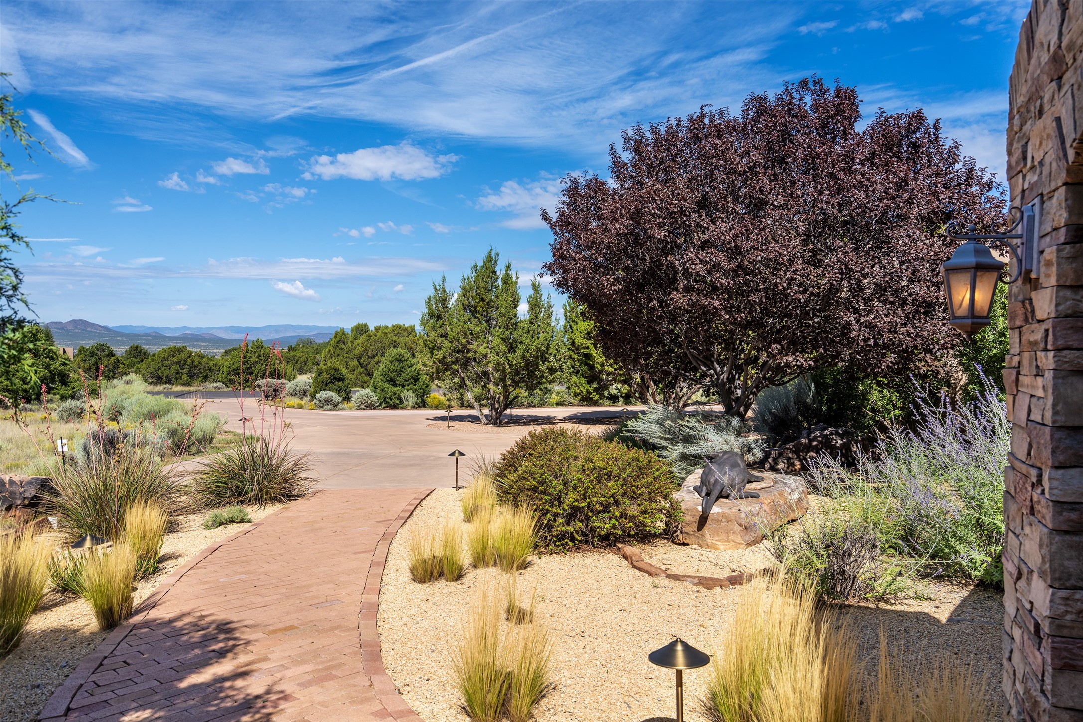 PANORAMIC VIEWS AND TIMELESS DESIGN IN LAS CAMPANAS. This refined residence in the Las Campanas community combines sweeping mountain vistas with many updates and enduring style in a hard-to-find 4 bedroom with a dramatic architecture. An inviting courtyard entry opens to generous living spaces framed by a dramatic sliding glass wall, creating seamless indoor-outdoor living. Towering viga-lined ceilings and plaster walls frame the spaces. The gourmet kitchen features dual Sub-Zero refrigerators, a Sub-Zero ice maker, and expanded storage. The owner's suite offers a quiet and spacious retreat, while a large media/game room provides flexibility for entertainment or relaxation. Recent enhancements include upgraded landscaping, refreshed interiors, and mechanical improvements that elevate both comfort and efficiency. Outdoor areas are designed for year-round enjoyment, with covered dining spaces, a pizza oven, and xeric, drip-irrigated gardens that are both lush and easy to maintain. Residents enjoy close proximity to The Club at Las Campanas, with spa, fitness, and dining amenities (membership available through the private Club at Las Campanas) as well as direct access to miles of walking paths. A move-in ready home blending elegant finishes, multiple upgrades, and the best of Santa Fe living.