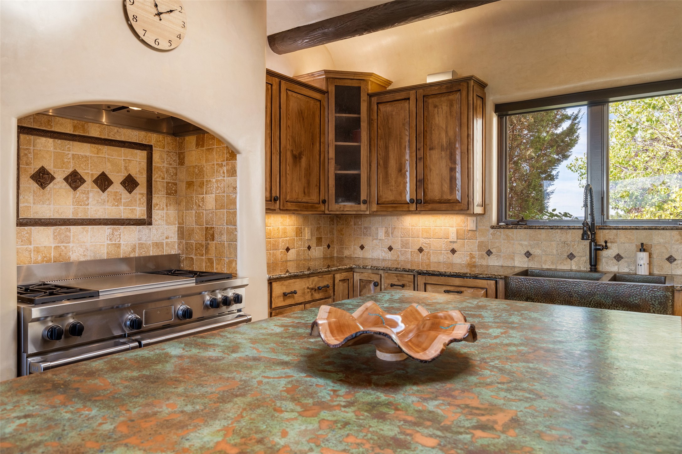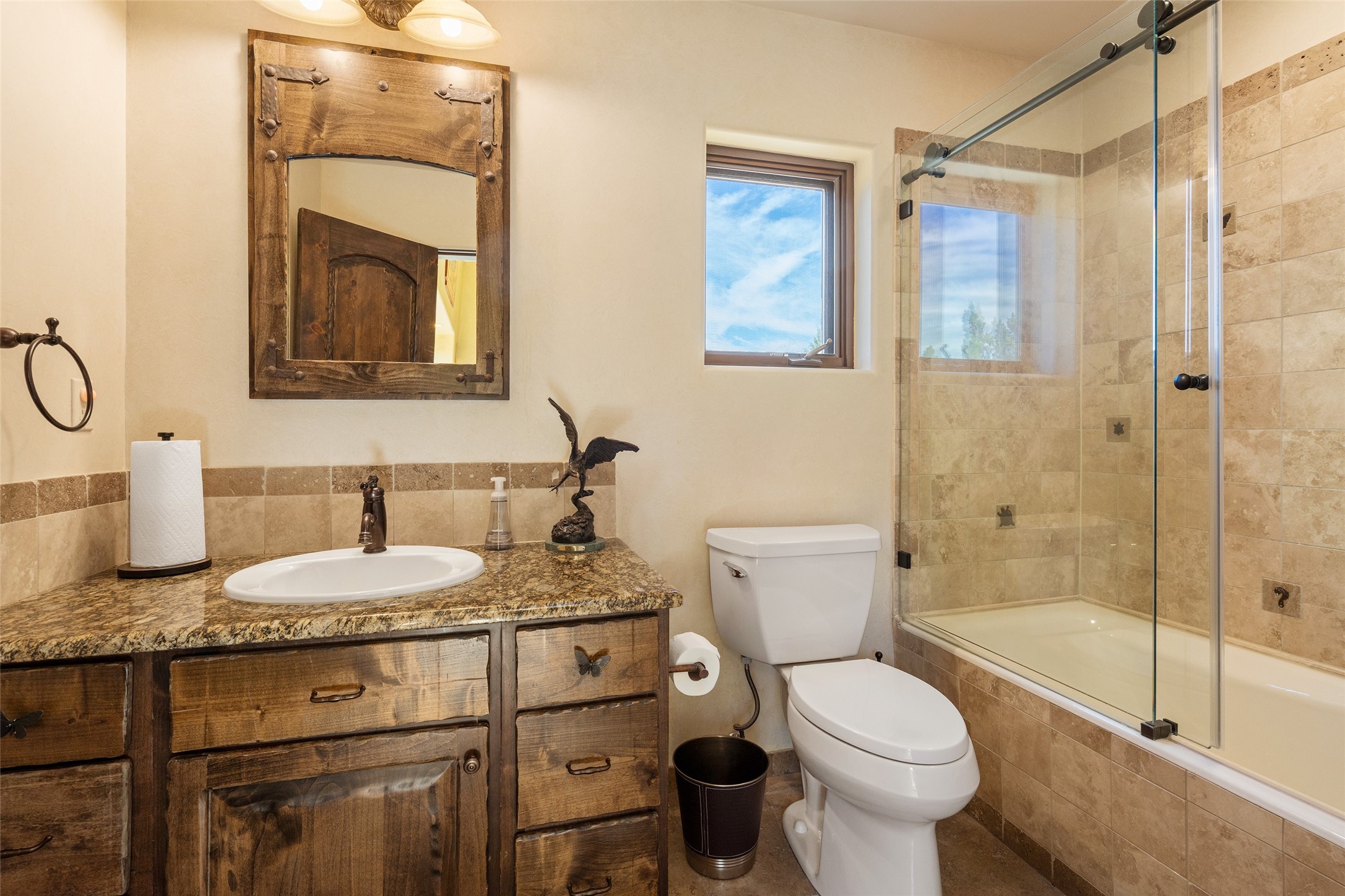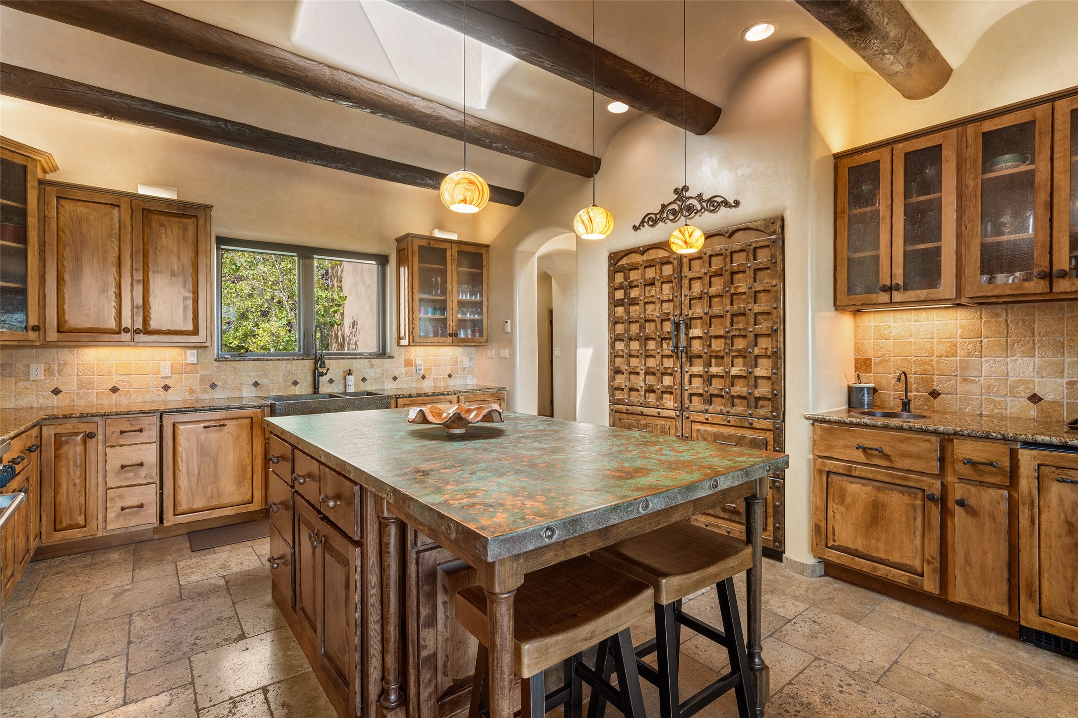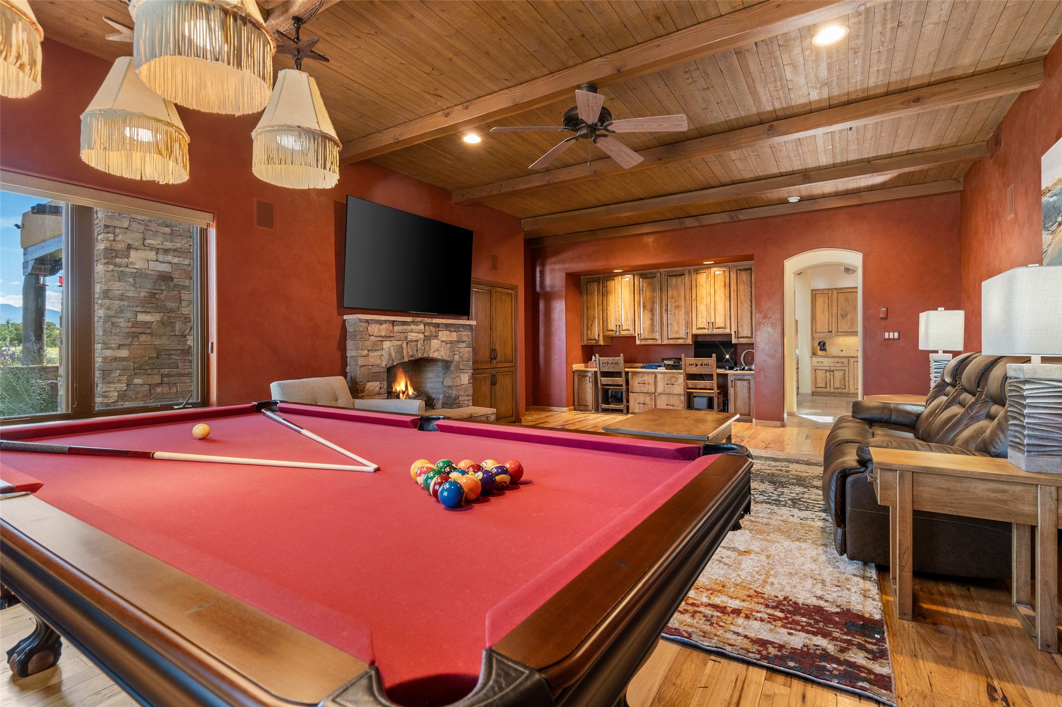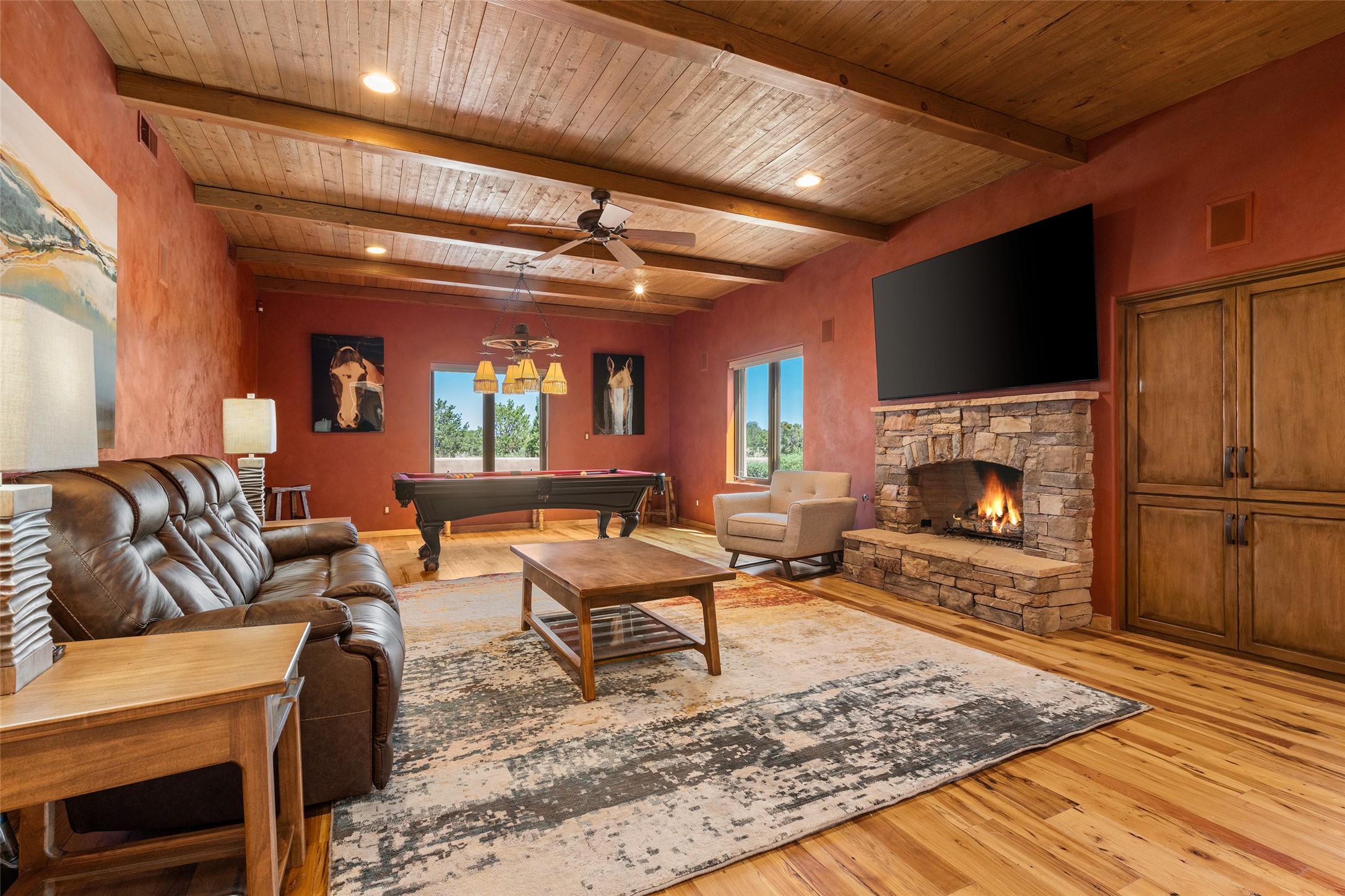 PANORAMIC VIEWS AND TIMELESS DESIGN IN LAS CAMPANAS. This refined residence in the Las Campanas community combines sweeping mountain vistas with many updates and enduring style in a hard-to-find 4 bedroom with a dramatic architecture. An inviting courtyard entry opens to generous living spaces framed by a dramatic sliding glass wall, creating seamless indoor-outdoor living. Towering viga-lined ceilings and plaster walls frame the spaces. The gourmet kitchen features dual Sub-Zero refrigerators, a Sub-Zero ice maker, and expanded storage. The owner's suite offers a quiet and spacious retreat, while a large media/game room provides flexibility for entertainment or relaxation. Recent enhancements include upgraded landscaping, refreshed interiors, and mechanical improvements that elevate both comfort and efficiency. Outdoor areas are designed for year-round enjoyment, with covered dining spaces, a pizza oven, and xeric, drip-irrigated gardens that are both lush and easy to maintain. Residents enjoy close proximity to The Club at Las Campanas, with spa, fitness, and dining amenities (membership available through the private Club at Las Campanas) as well as direct access to miles of walking paths. A move-in ready home blending elegant finishes, multiple upgrades, and the best of Santa Fe living.
