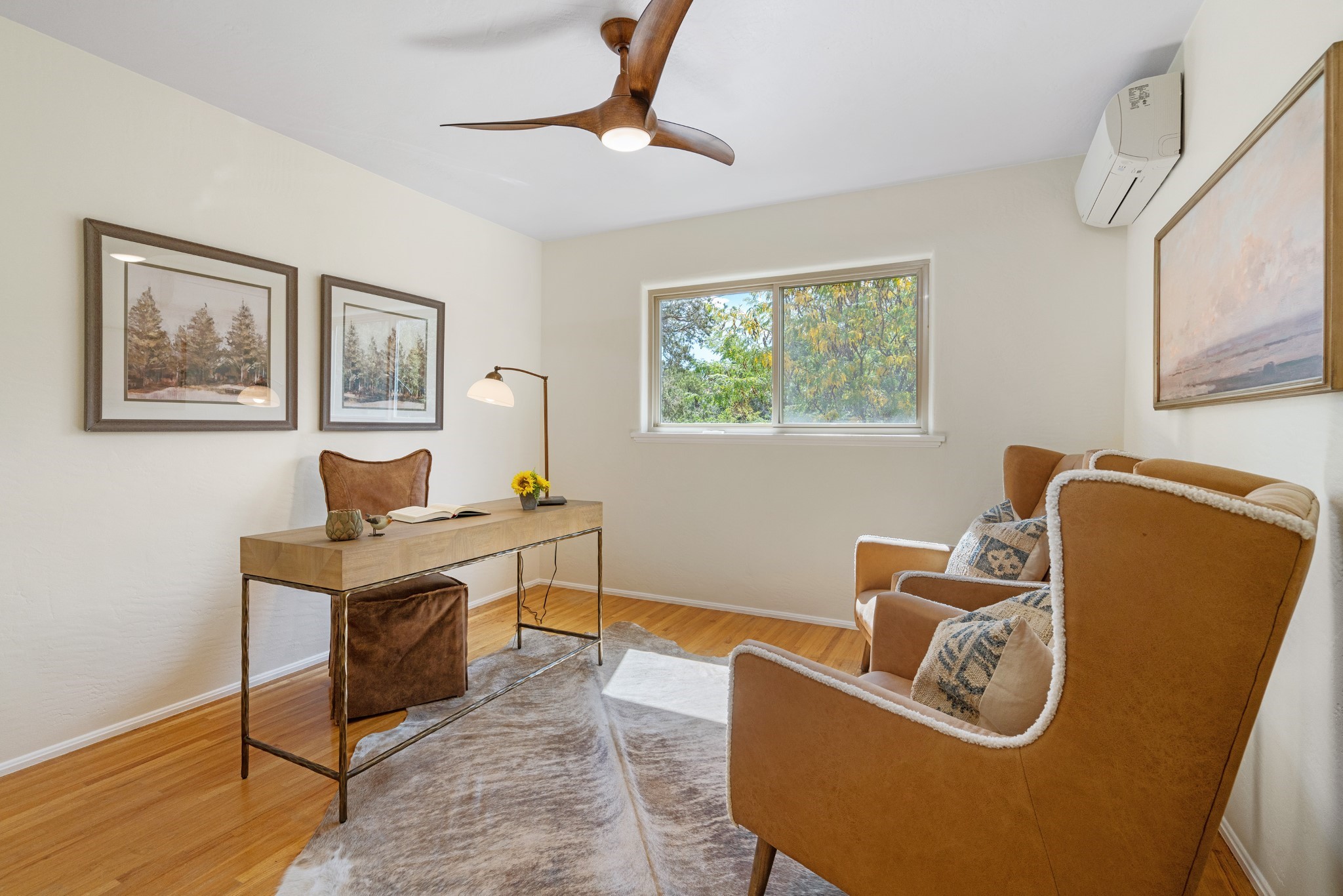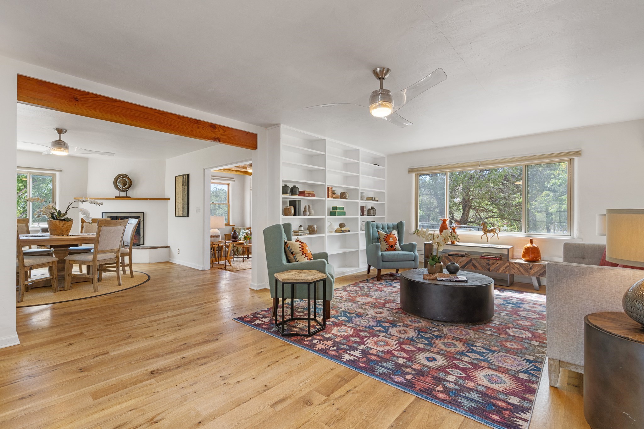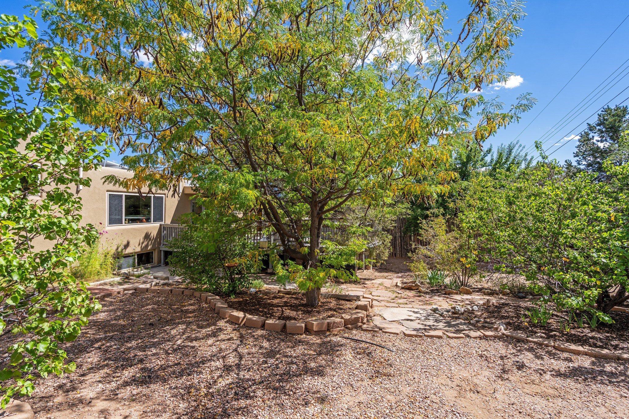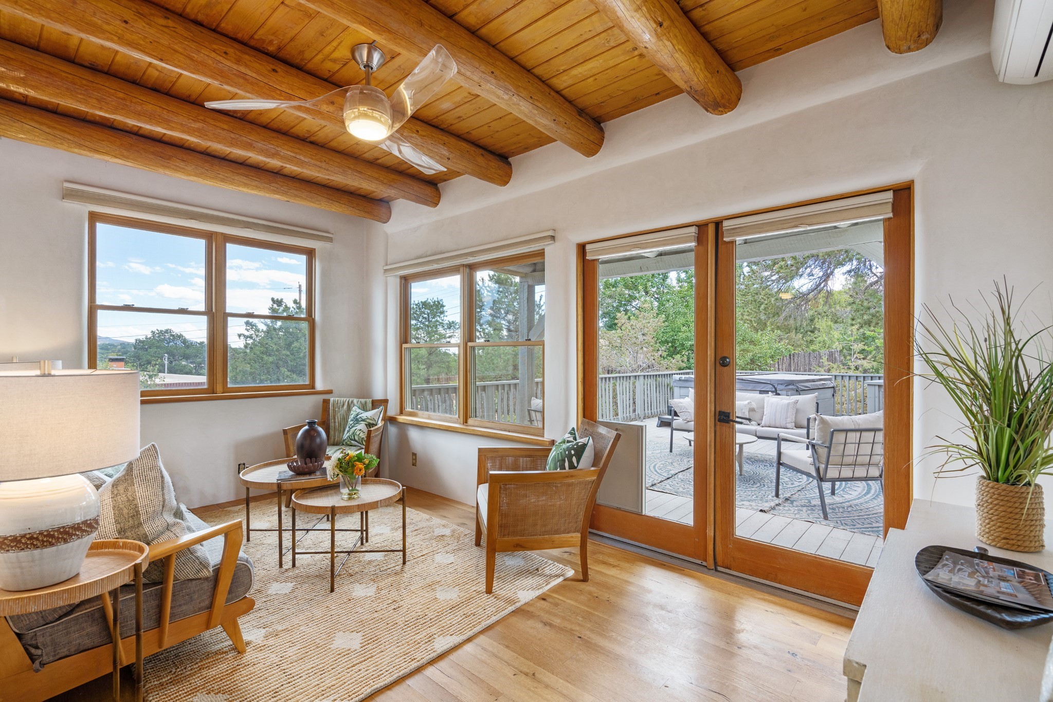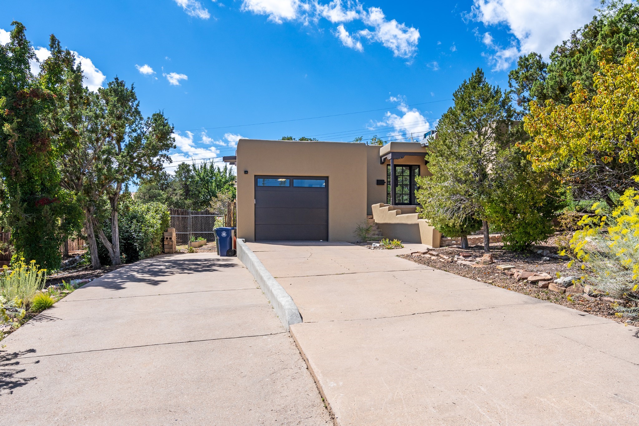 Perched above Santa Fe, this updated Casa Solana home frames mountain vistas by day and city lights by night. Backed by the Dog park and set near the end of a low-traffic street, it offers privacy just a mile to the Plaza and an easy commute to Los Alamos. Inside, nearly 1,900 square feet of light-filled living space flows seamlessly across hardwood floors with a bright, open plan. The main level includes four bedrooms and two baths, with a primary suite featuring a custom closet. French doors open to a spacious deck designed for entertaining, stargazing, or soaking in a hot tub. The finished 700+ square foot basement is a rare find in Santa Fe, offering flexible space for a media room, guest suite, gym, or studio. It connects directly to the finished, heated garage--ideal for a workshop, flex space, or even a potential casita.The quarter-acre, fully fenced backyard features a private gate that opens onto a secluded trail into one of Santa Fe's largest dog-friendly parks. Generous off-street parking provides room for multiple vehicles--bring your RV. Recent upgrades include: New 8.8 kW solar system, Mini-splits in every room, 4-year-old roof, On-demand hot water heater, High-efficiency heating system and New Stucco. This Casa Solana property offers space, flexibility, and modern updates in one of Santa Fe's most established neighborhoods.