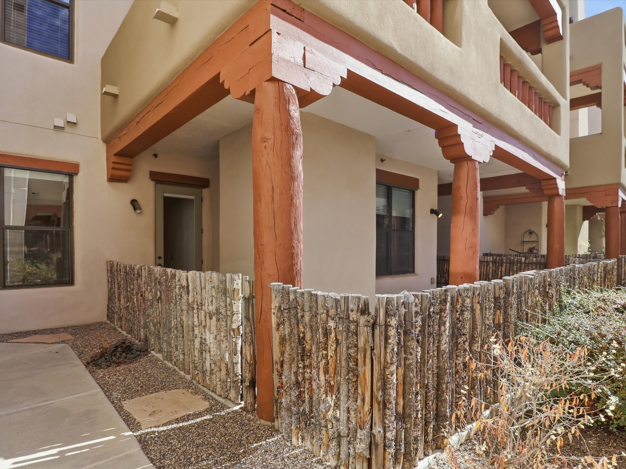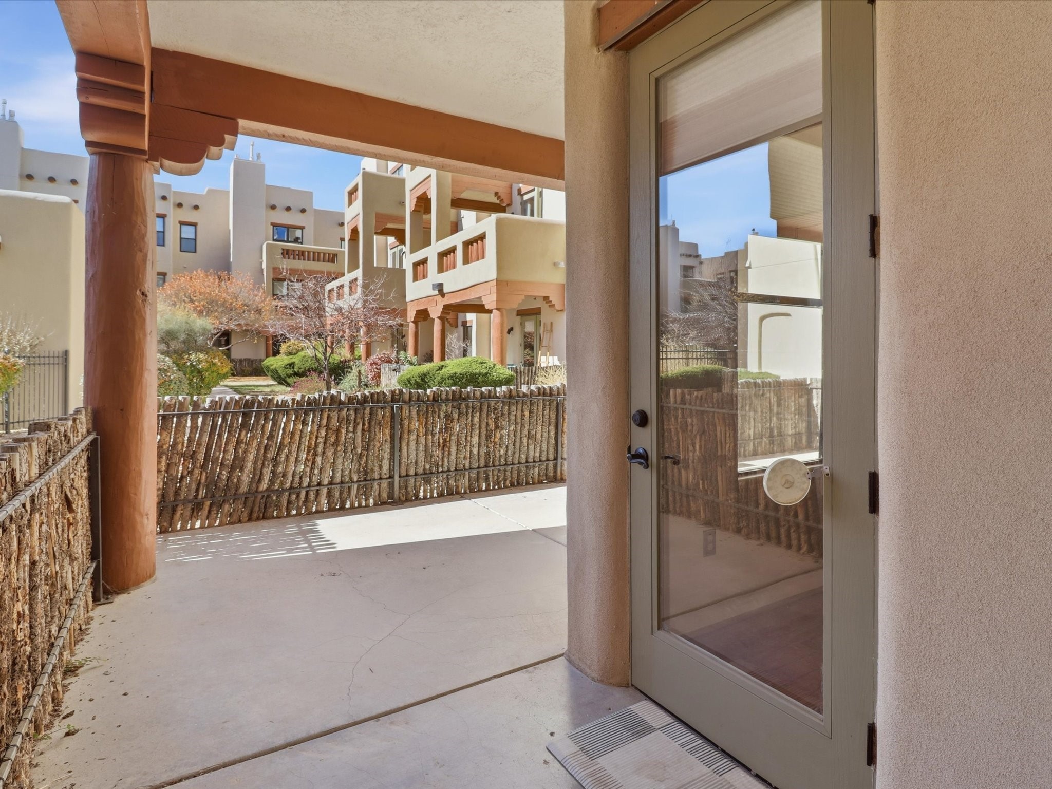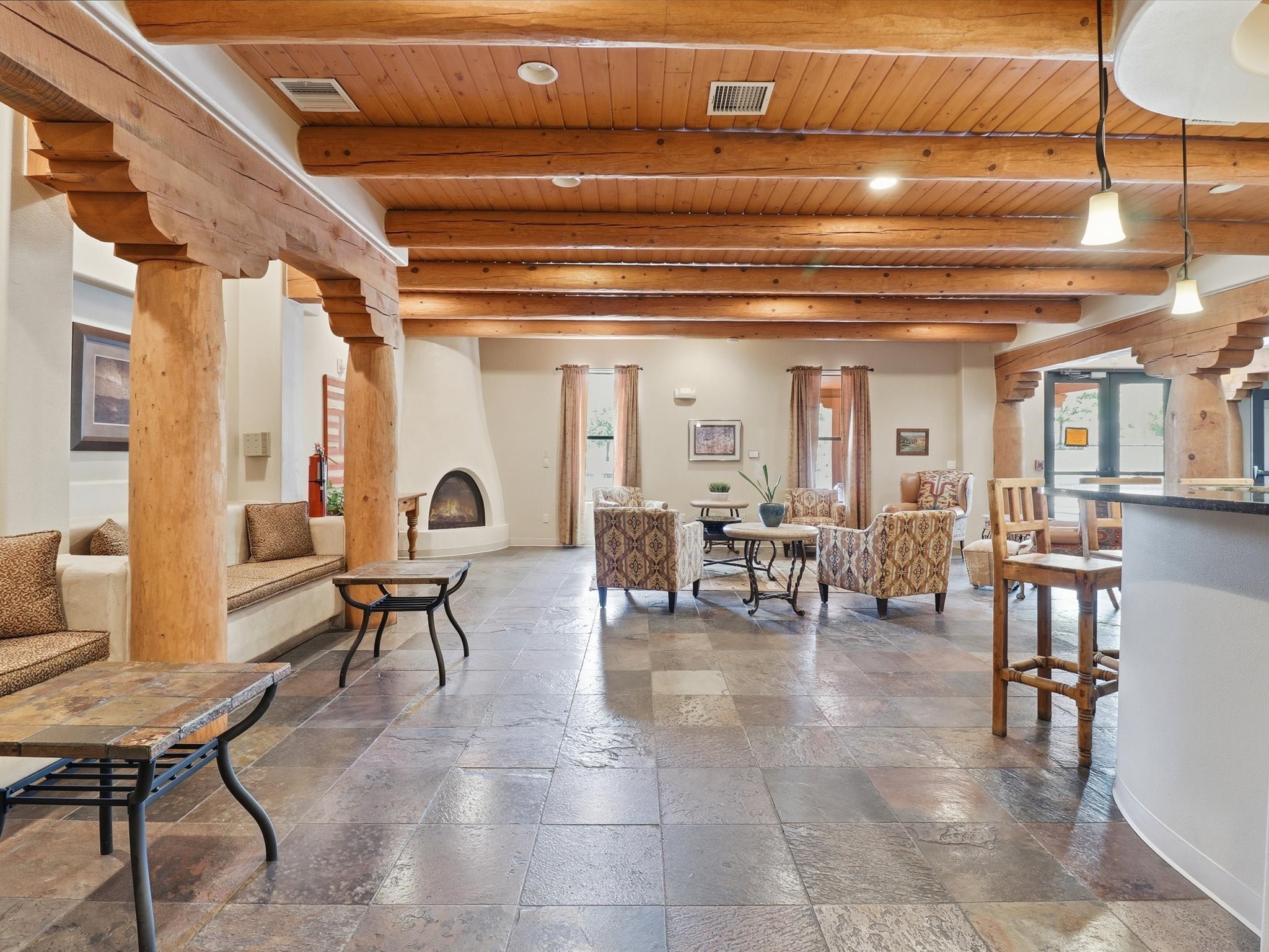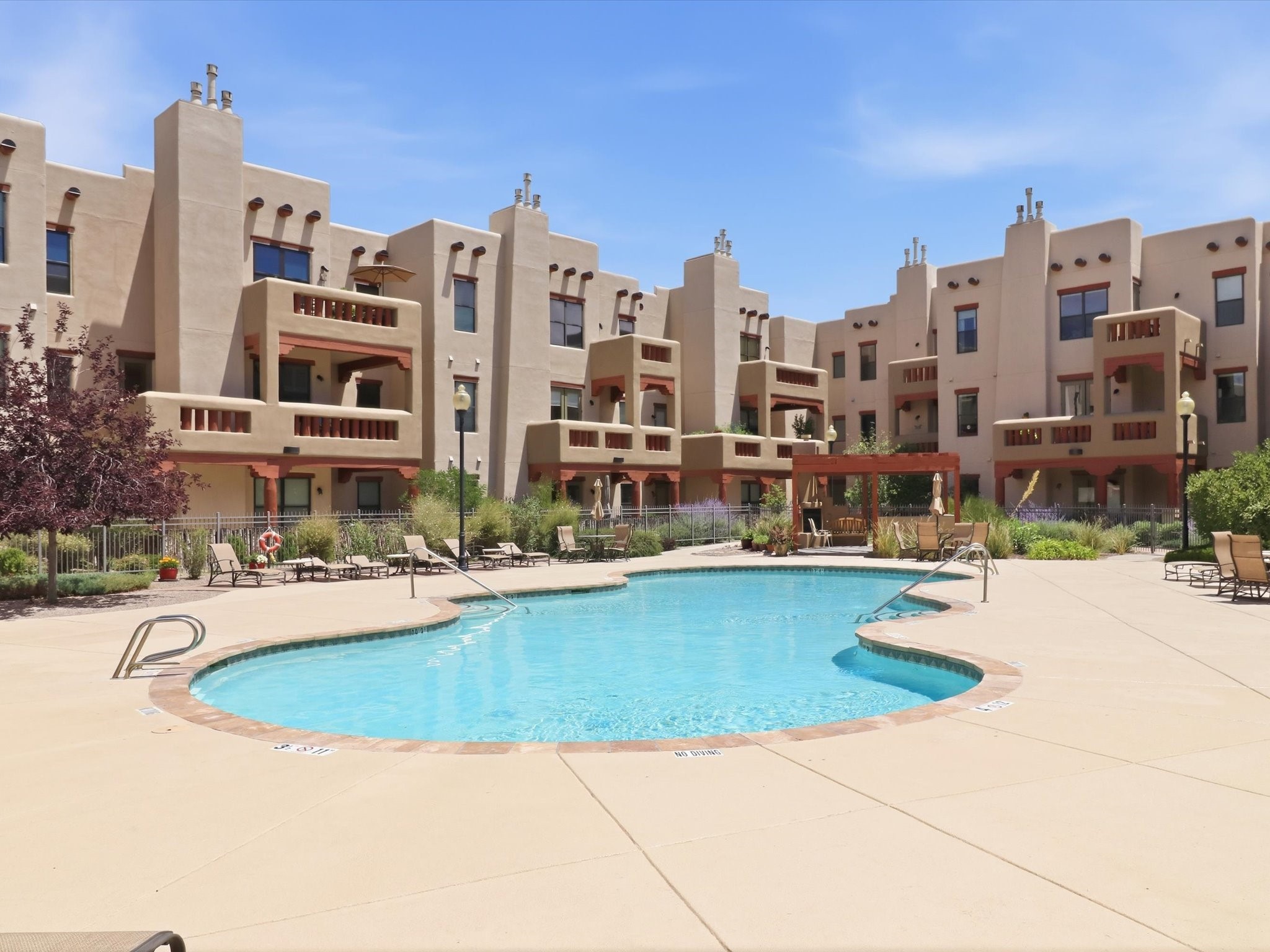 Welcome to this beautiful corner unit in the desirable Alameda Condos! Having abundant natural light, this ground-floor gem has two bedrooms, each with its own full bathroom and walk-in closet. The primary bedroom offers a private patio entrance and an enclosed shower area, perfect for relaxing mornings.Enjoy an open-concept living and dining space centered around a cozy gas corner Kiva fireplace, while the kitchen is equipped with appliances for new homeowners daily use. Step outside to your fenced patio and take in serene pool views.With central refrigerated air conditioning, a host of community amenities--including a pool, gym, reading rooms, gated parking, on-site office, and building-wide WiFi--this condo is perfect for full-time living or a convenient lock-and-leave lifestyle. Comfort, style, and security all in one!