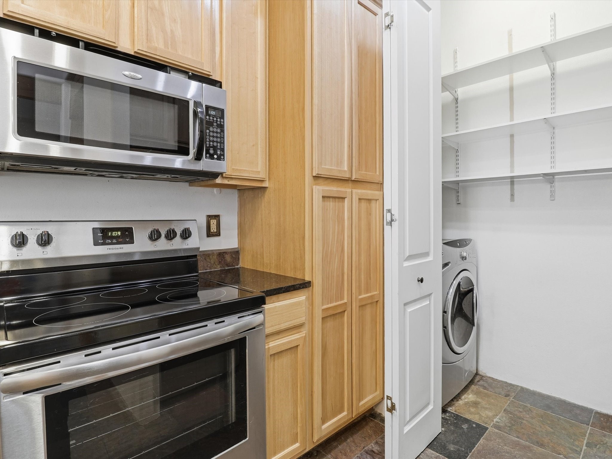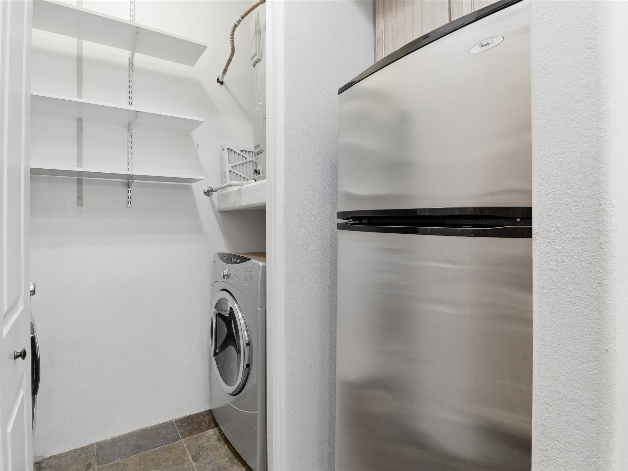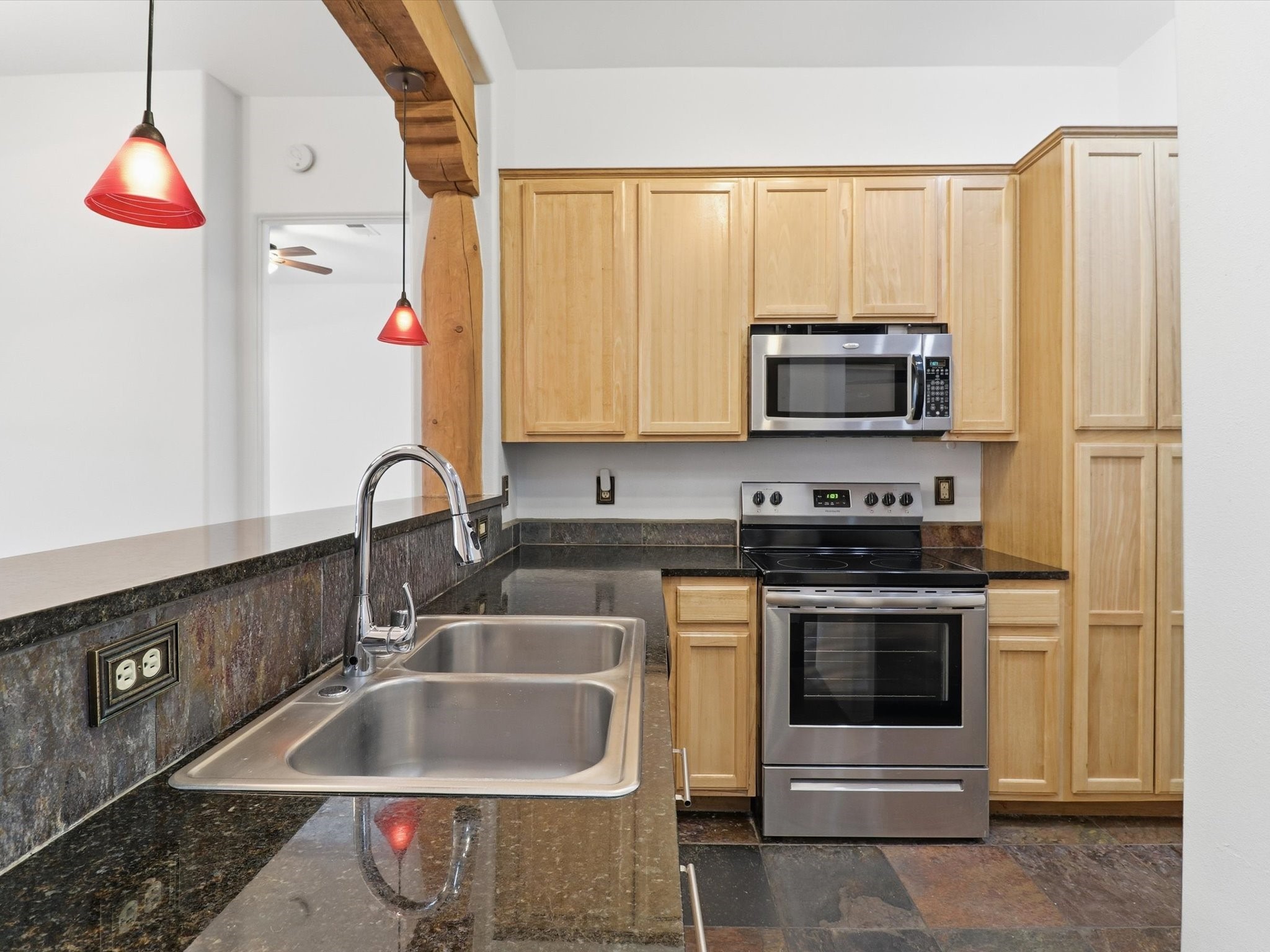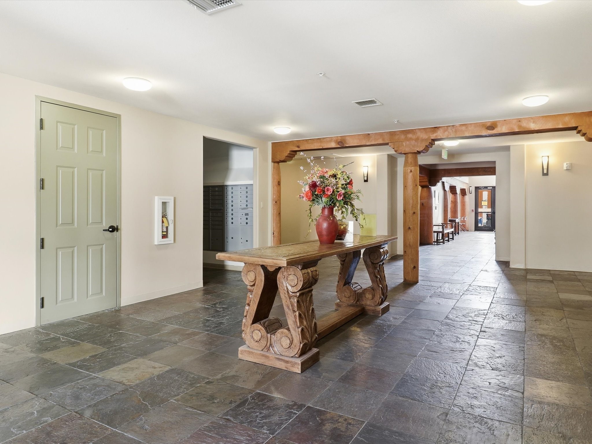 Welcome to this beautiful corner unit in the desirable Alameda Condos! Having abundant natural light, this ground-floor gem has two bedrooms, each with its own full bathroom and walk-in closet. The primary bedroom offers a private patio entrance and an enclosed shower area, perfect for relaxing mornings.Enjoy an open-concept living and dining space centered around a cozy gas corner Kiva fireplace, while the kitchen is equipped with appliances for new homeowners daily use. Step outside to your fenced patio and take in serene pool views.With central refrigerated air conditioning, a host of community amenities--including a pool, gym, reading rooms, gated parking, on-site office, and building-wide WiFi--this condo is perfect for full-time living or a convenient lock-and-leave lifestyle. Comfort, style, and security all in one!