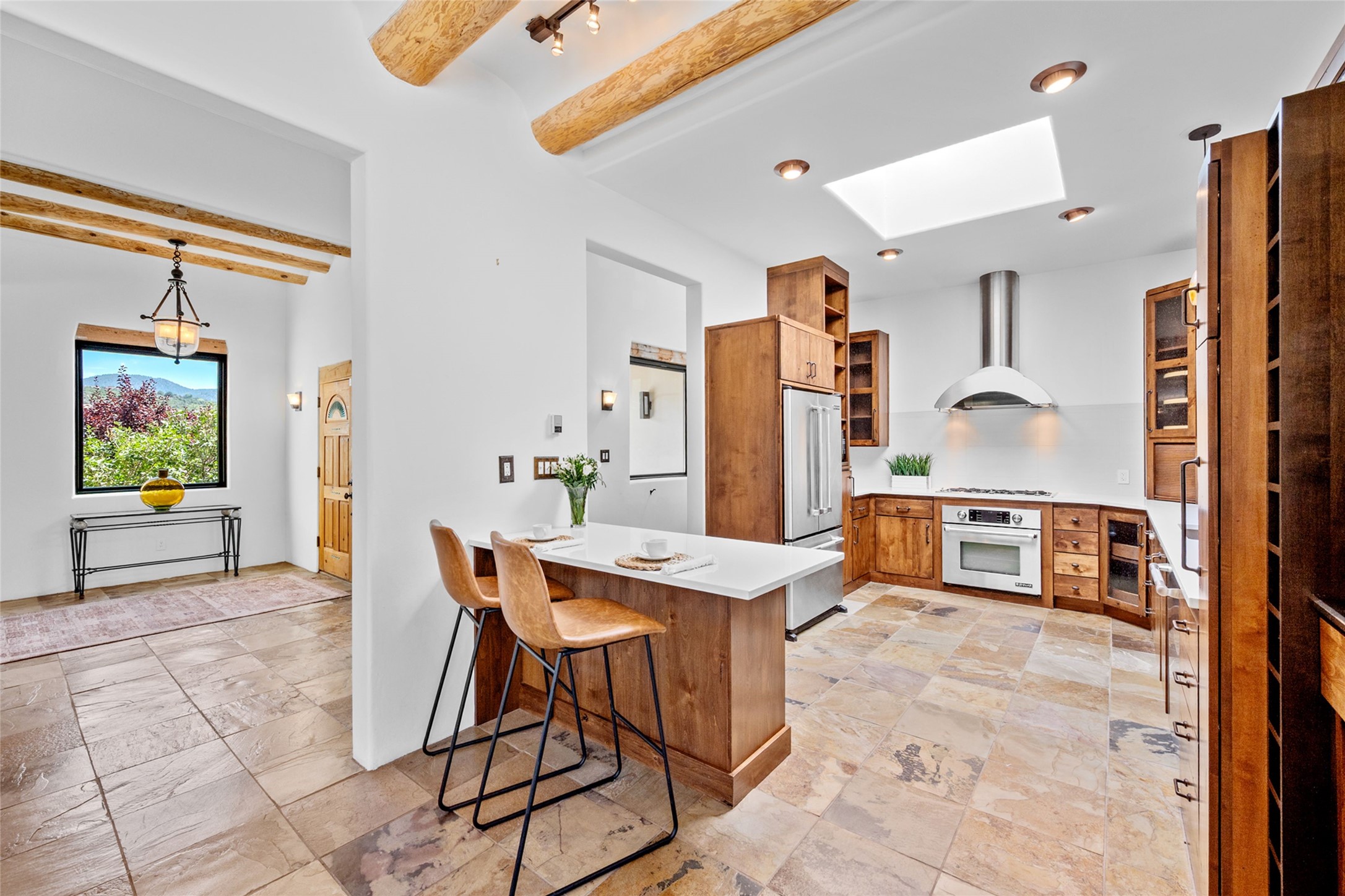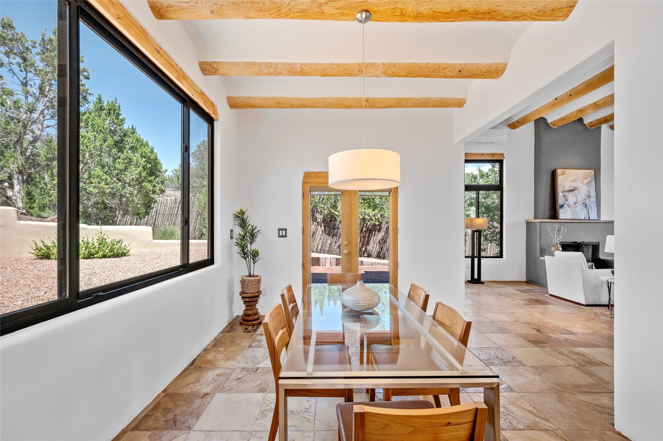 In the heart of the highly desirable Santa Fe Northside, this 4-bedroom, 2-bathroom bi-level home blends modern upgrades with timeless Santa Fe charm. Soaring ceilings, an open floor plan, and expansive picture windows flood the home with natural light and frame the surrounding landscape, seamlessly bringing the outdoors in.The kitchen features elegant glass-paned cabinetry, dual copper-toned lazy susans, and abundant storage--both functional and beautiful. The spacious primary suite includes a cozy wood-burning fireplace, a generous en-suite bath with walk-in closet, and direct access to a screened porch and private patio.Recent updates--new Anderson windows and efficient mini-splits ensure year-round comfort. The flexible bi-level layout and two-car garage add everyday convenience. Despite its serene setting, this home is just minutes from town--only a four-minute drive to the Plaza.Combining comfort, efficiency, and natural beauty, this inviting property is the perfect retreat in one of Santa Fe's most coveted locations.