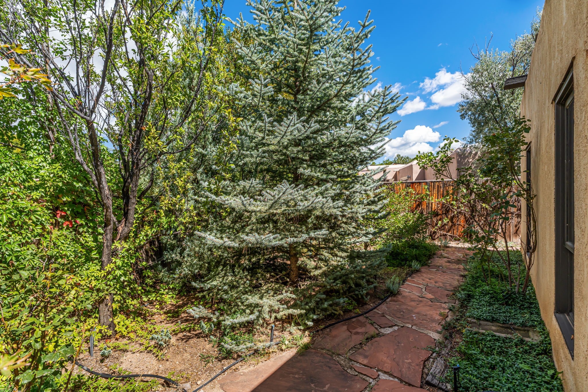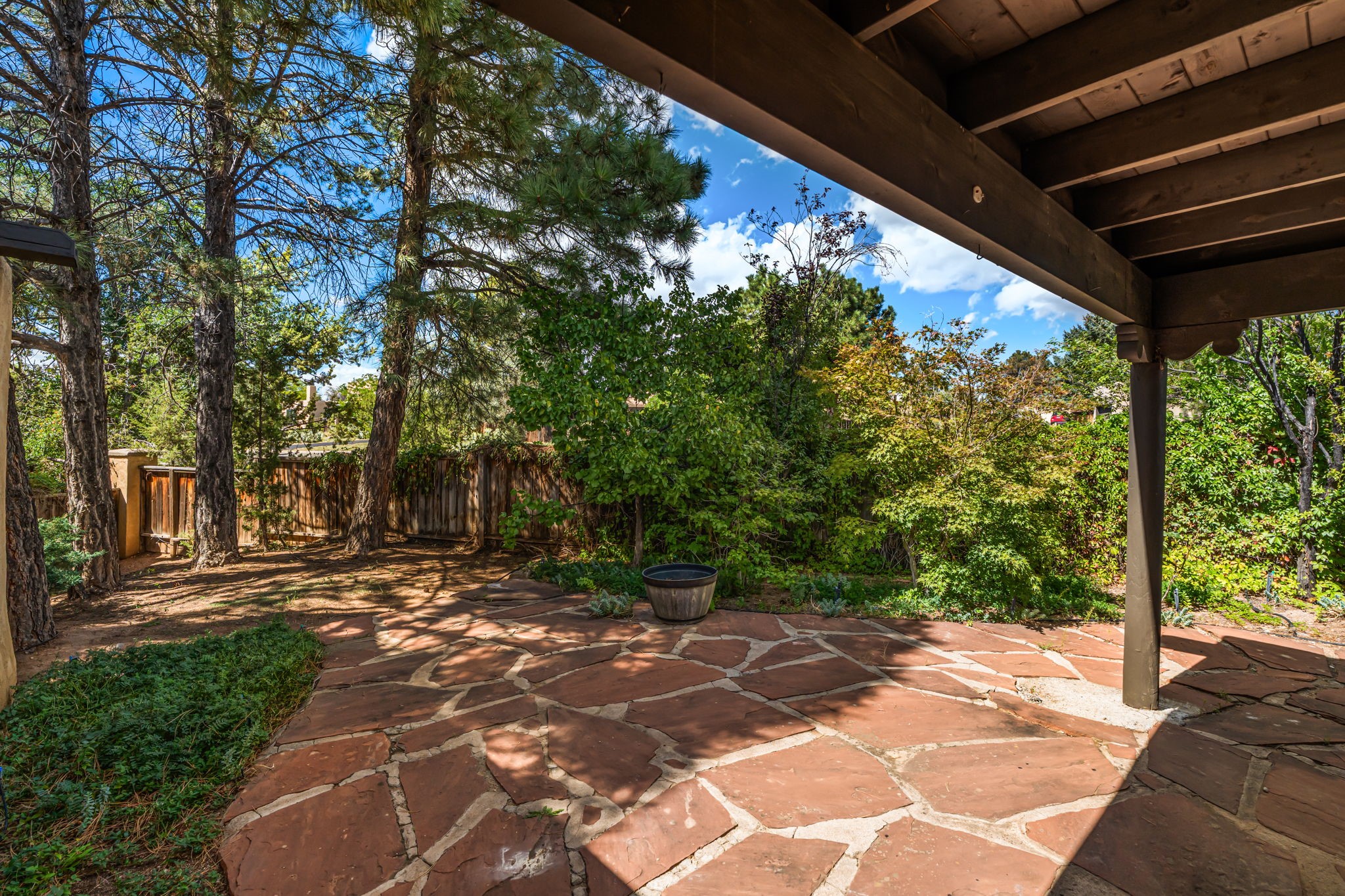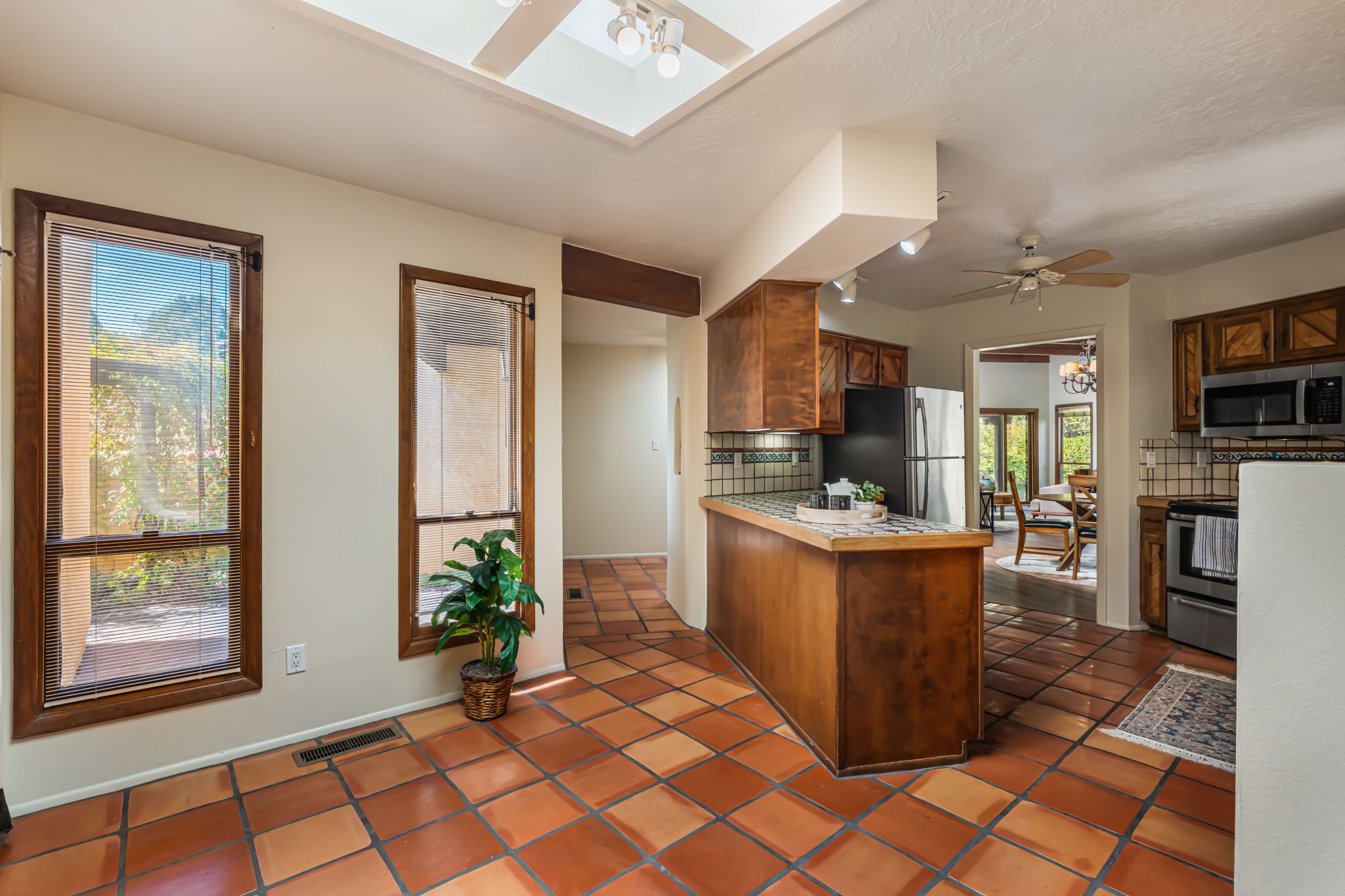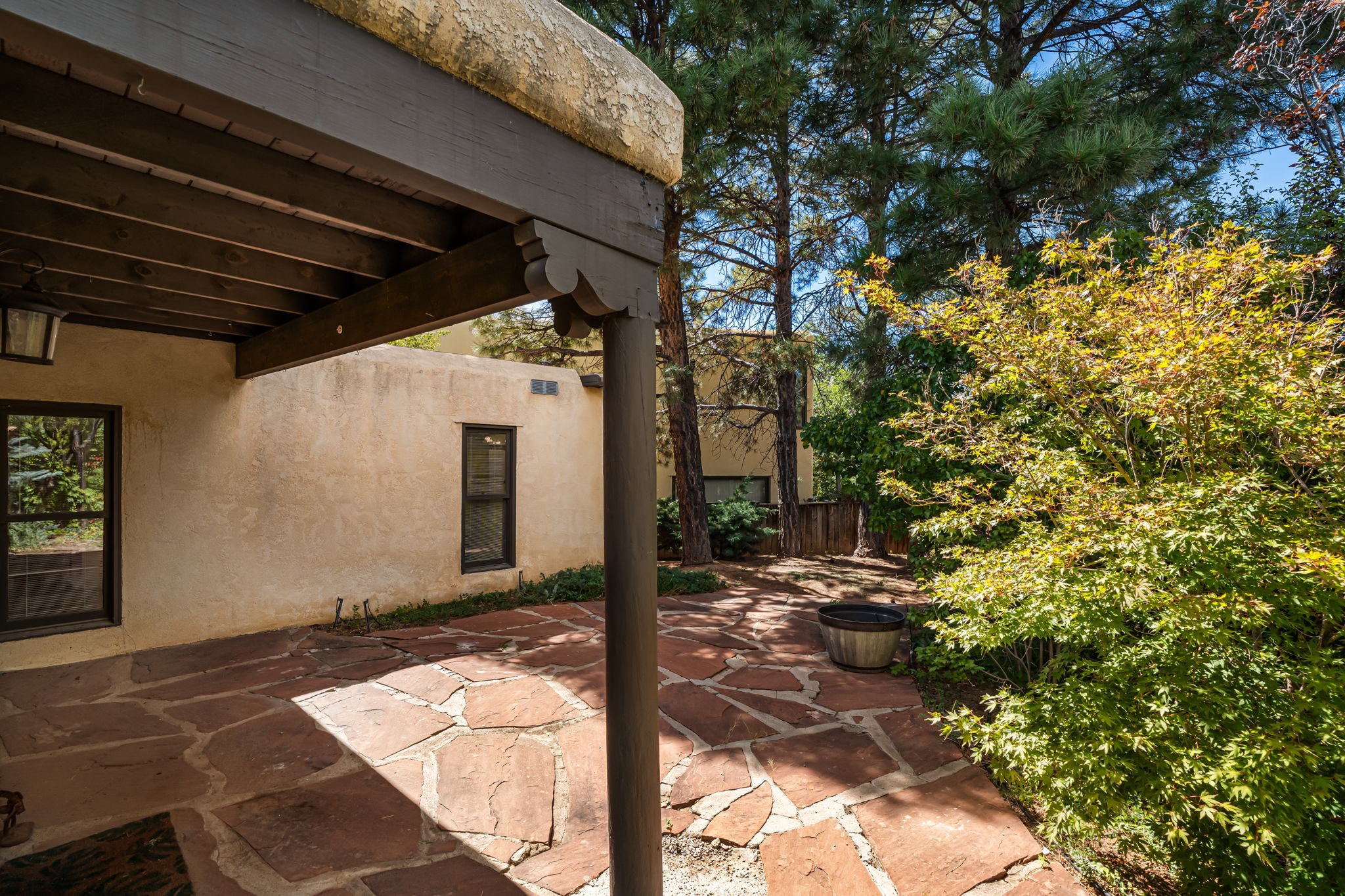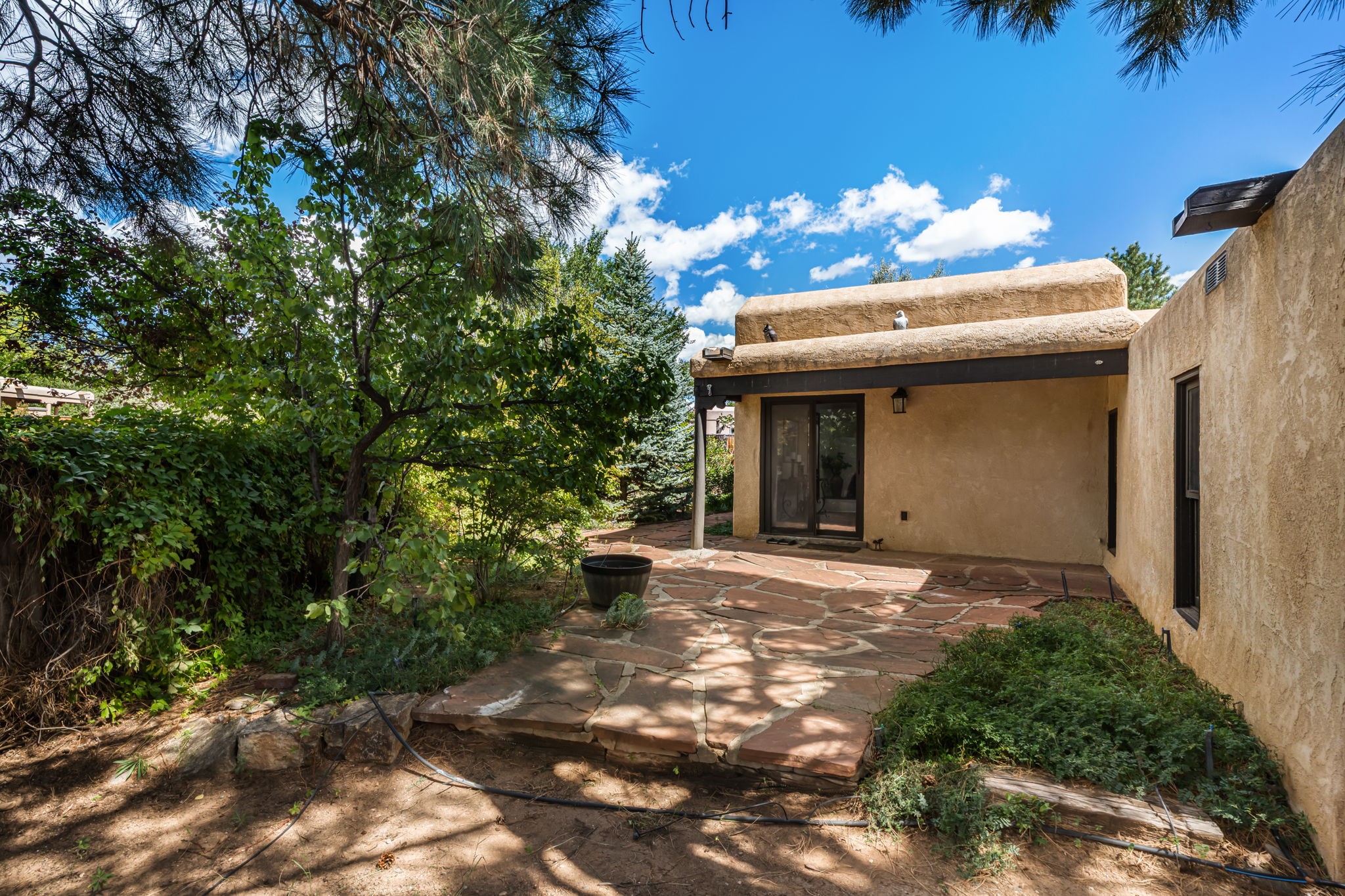 Welcome to this beautiful, single-level home in the quiet interior of Park Plazas, one of Santa Fe's most desirable neighborhoods. The spacious living and dining room is filled with natural light from clerestory windows with diffusers, and features a wood-burning corner Kiva fireplace with stone banco as well as sliding doors that open to a lovely flagstone patio and lush outdoor retreat. The kitchen offers matching, all stainless appliances, colorful Mexican tile counters, and a generous breakfast nook with a large skylight that connects conveniently to the two-car garage. The primary suite includes sliding doors to a private enclosed patio, a spacious walk-in closet, and an ensuite bath, while the second bedroom has two closets and the guest bath features a Talavera sink and skylight. Outdoors, the property delights with fruit trees--including apricot, plum, nectarine, and cooking cherries--along with grapevines, roses, and abundant plantings, all on a timed drip irrigation system. Stately evergreens line the west side of the yard in a graceful semi-circle, creating both beauty and privacy. With newer flooring throughout, fresh paint, forced-air heating, and refrigerated air conditioning, this home is move-in ready. Park Plazas residents enjoy miles of walking trails, a community garden, playground, basketball and tennis courts, and an off-leash dog park--all just minutes from Santa Fe's shopping, dining, and cultural attractions.