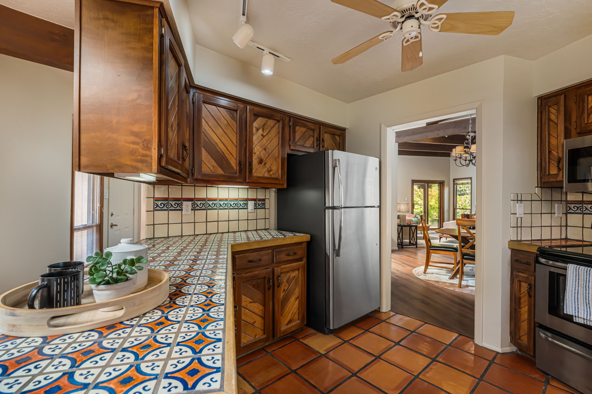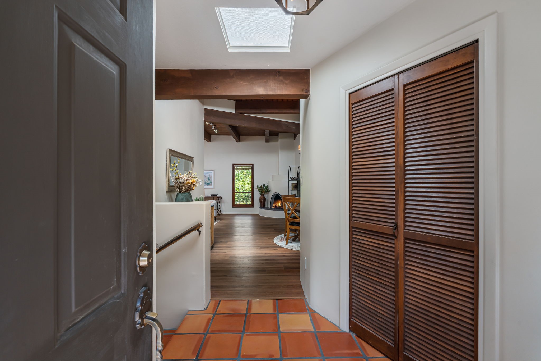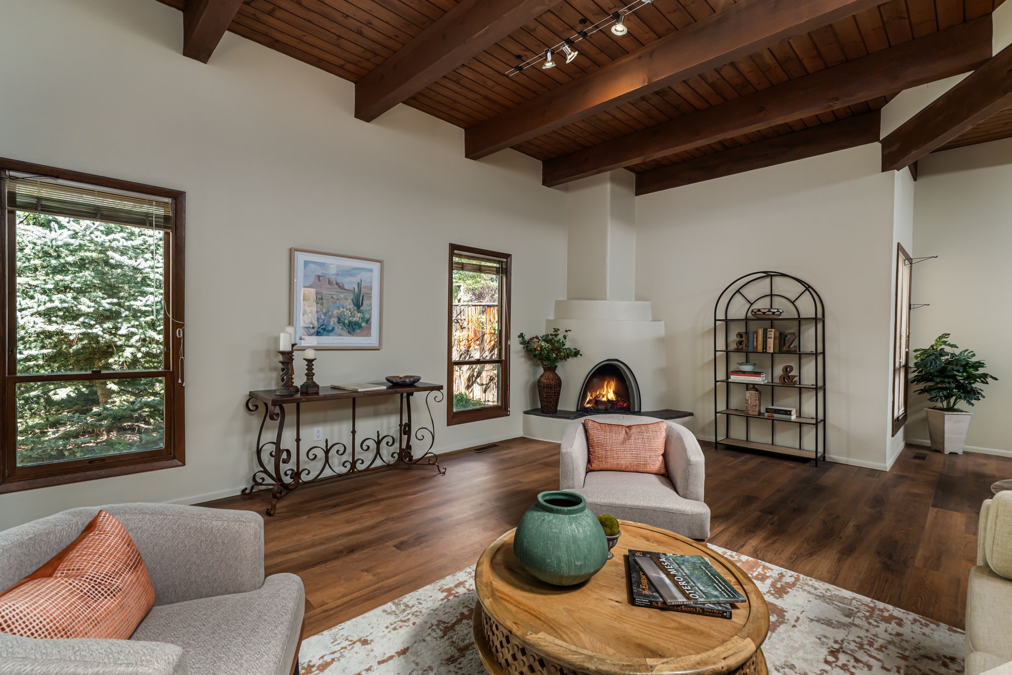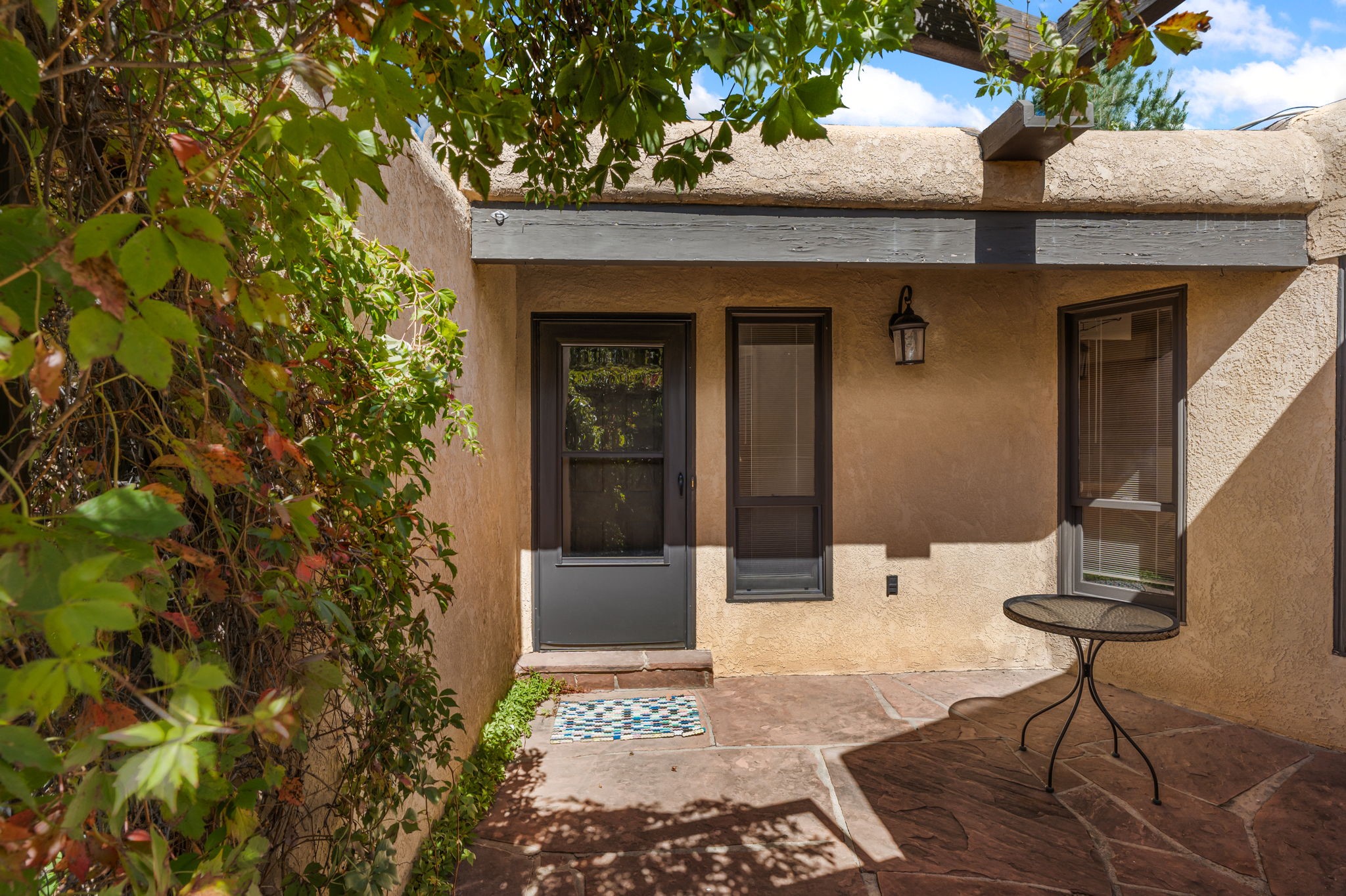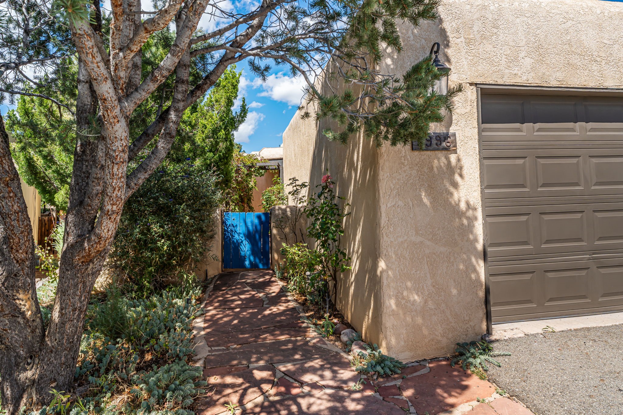 Welcome to this beautiful, single-level home in the quiet interior of Park Plazas, one of Santa Fe's most desirable neighborhoods. The spacious living and dining room is filled with natural light from clerestory windows with diffusers, and features a wood-burning corner Kiva fireplace with stone banco as well as sliding doors that open to a lovely flagstone patio and lush outdoor retreat. The kitchen offers matching, all stainless appliances, colorful Mexican tile counters, and a generous breakfast nook with a large skylight that connects conveniently to the two-car garage. The primary suite includes sliding doors to a private enclosed patio, a spacious walk-in closet, and an ensuite bath, while the second bedroom has two closets and the guest bath features a Talavera sink and skylight. Outdoors, the property delights with fruit trees--including apricot, plum, nectarine, and cooking cherries--along with grapevines, roses, and abundant plantings, all on a timed drip irrigation system. Stately evergreens line the west side of the yard in a graceful semi-circle, creating both beauty and privacy. With newer flooring throughout, fresh paint, forced-air heating, and refrigerated air conditioning, this home is move-in ready. Park Plazas residents enjoy miles of walking trails, a community garden, playground, basketball and tennis courts, and an off-leash dog park--all just minutes from Santa Fe's shopping, dining, and cultural attractions.