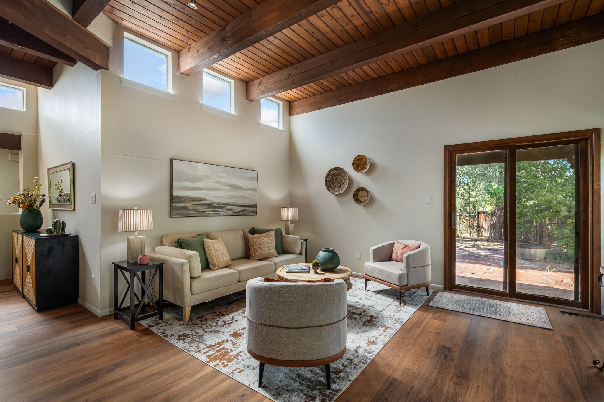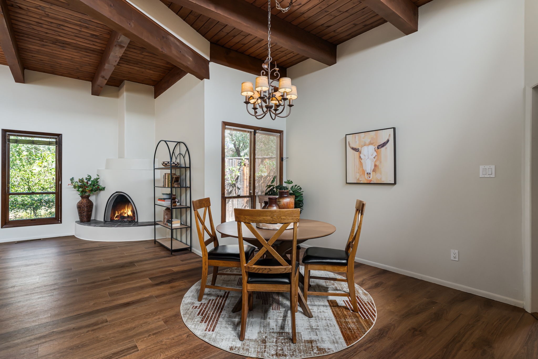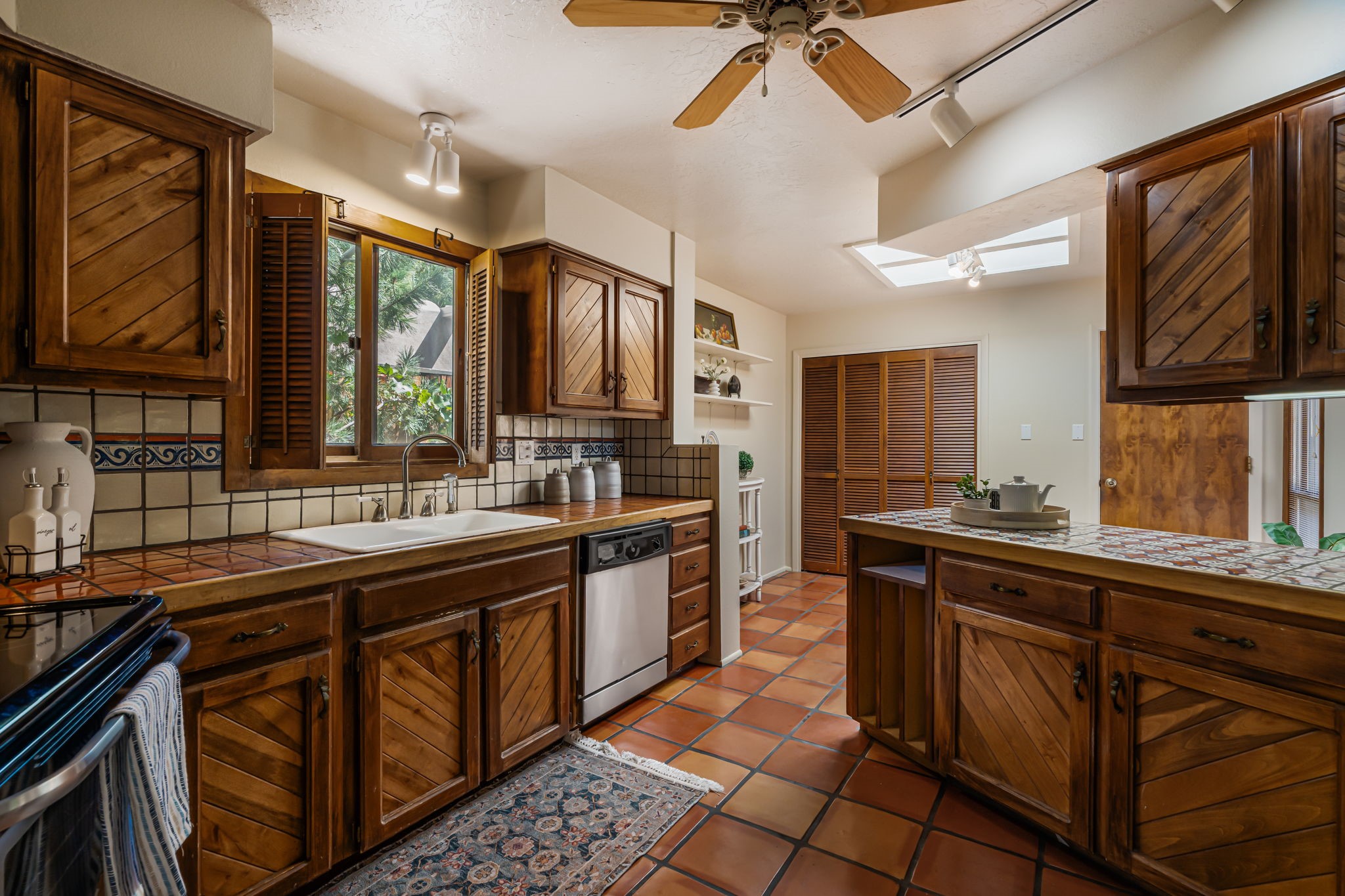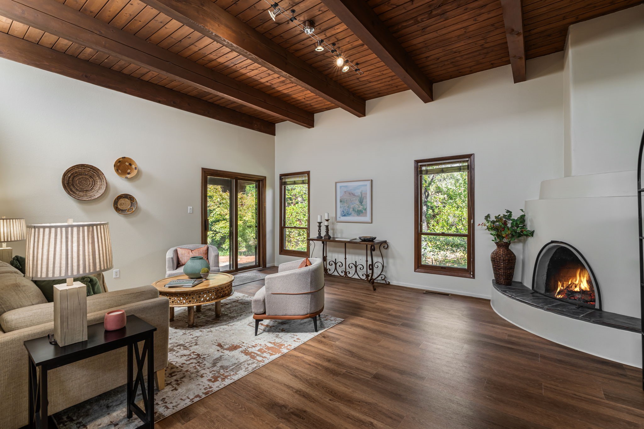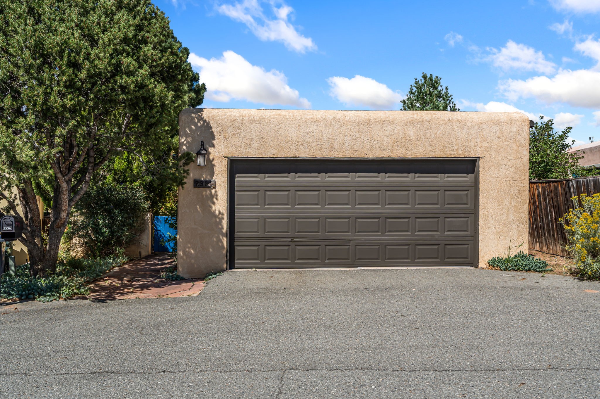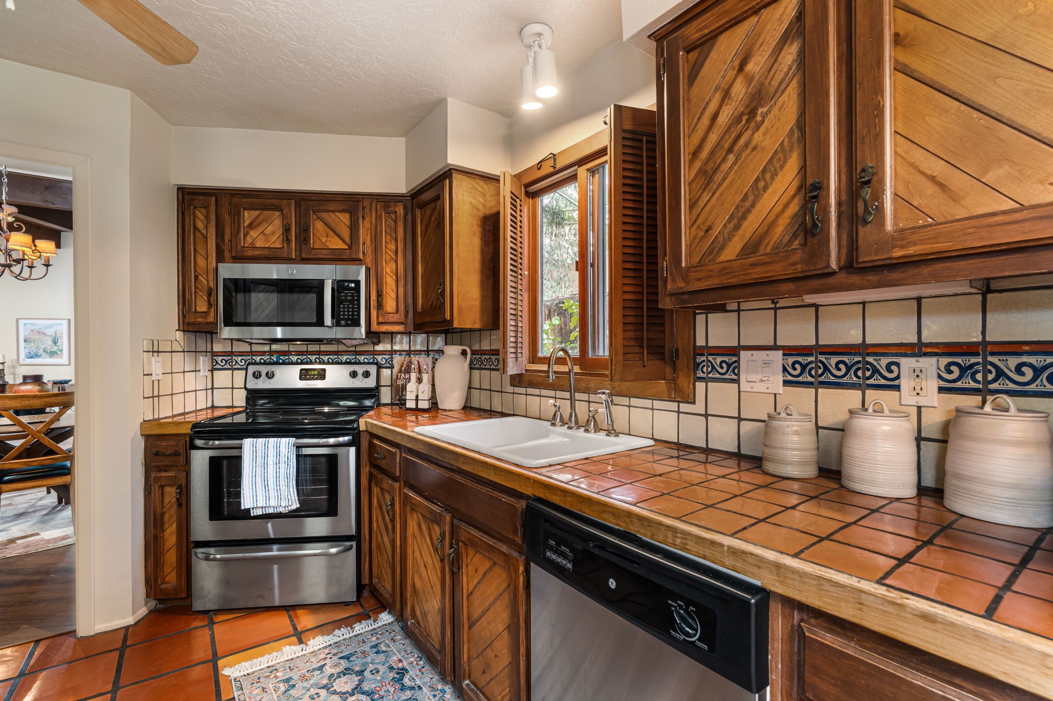 Welcome to this beautiful, single-level home in the quiet interior of Park Plazas, one of Santa Fe's most desirable neighborhoods. The spacious living and dining room is filled with natural light from clerestory windows with diffusers, and features a wood-burning corner Kiva fireplace with stone banco as well as sliding doors that open to a lovely flagstone patio and lush outdoor retreat. The kitchen offers matching, all stainless appliances, colorful Mexican tile counters, and a generous breakfast nook with a large skylight that connects conveniently to the two-car garage. The primary suite includes sliding doors to a private enclosed patio, a spacious walk-in closet, and an ensuite bath, while the second bedroom has two closets and the guest bath features a Talavera sink and skylight. Outdoors, the property delights with fruit trees--including apricot, plum, nectarine, and cooking cherries--along with grapevines, roses, and abundant plantings, all on a timed drip irrigation system. Stately evergreens line the west side of the yard in a graceful semi-circle, creating both beauty and privacy. With newer flooring throughout, fresh paint, forced-air heating, and refrigerated air conditioning, this home is move-in ready. Park Plazas residents enjoy miles of walking trails, a community garden, playground, basketball and tennis courts, and an off-leash dog park--all just minutes from Santa Fe's shopping, dining, and cultural attractions.