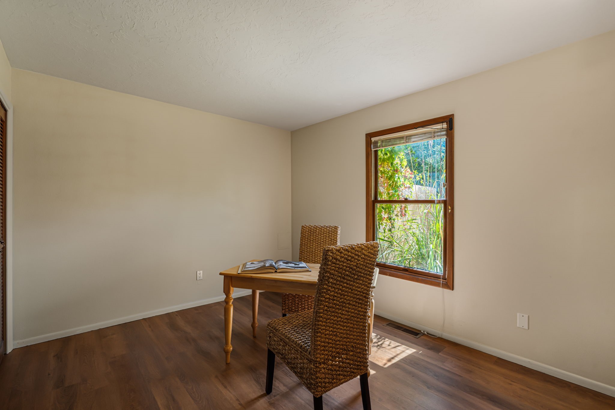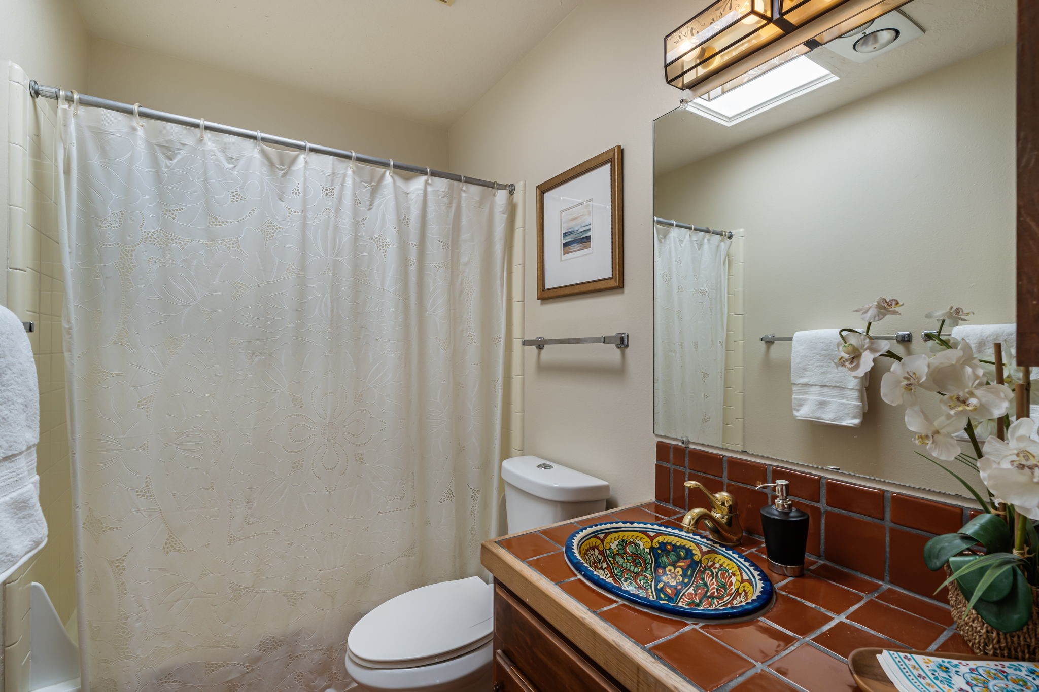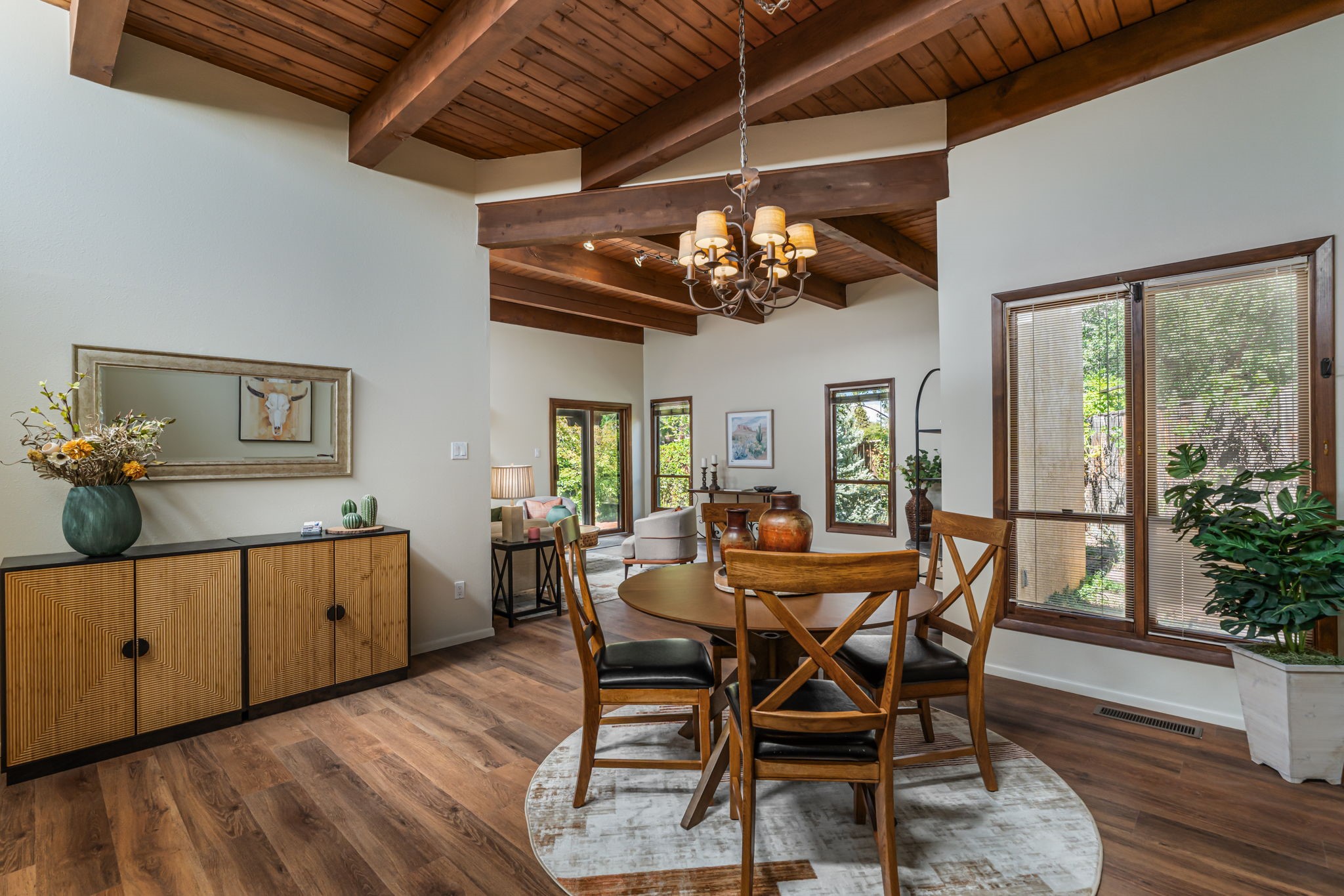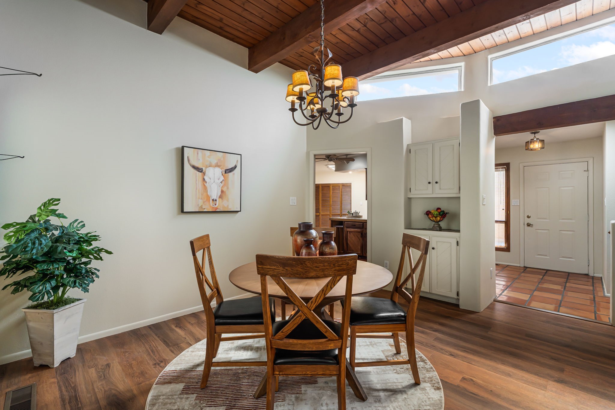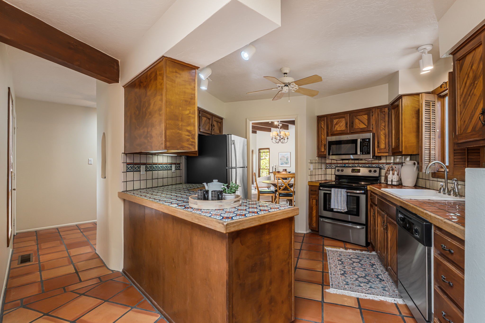 Welcome to this beautiful, single-level home in the quiet interior of Park Plazas, one of Santa Fe's most desirable neighborhoods. The spacious living and dining room is filled with natural light from clerestory windows with diffusers, and features a wood-burning corner Kiva fireplace with stone banco as well as sliding doors that open to a lovely flagstone patio and lush outdoor retreat. The kitchen offers matching, all stainless appliances, colorful Mexican tile counters, and a generous breakfast nook with a large skylight that connects conveniently to the two-car garage. The primary suite includes sliding doors to a private enclosed patio, a spacious walk-in closet, and an ensuite bath, while the second bedroom has two closets and the guest bath features a Talavera sink and skylight. Outdoors, the property delights with fruit trees--including apricot, plum, nectarine, and cooking cherries--along with grapevines, roses, and abundant plantings, all on a timed drip irrigation system. Stately evergreens line the west side of the yard in a graceful semi-circle, creating both beauty and privacy. With newer flooring throughout, fresh paint, forced-air heating, and refrigerated air conditioning, this home is move-in ready. Park Plazas residents enjoy miles of walking trails, a community garden, playground, basketball and tennis courts, and an off-leash dog park--all just minutes from Santa Fe's shopping, dining, and cultural attractions.