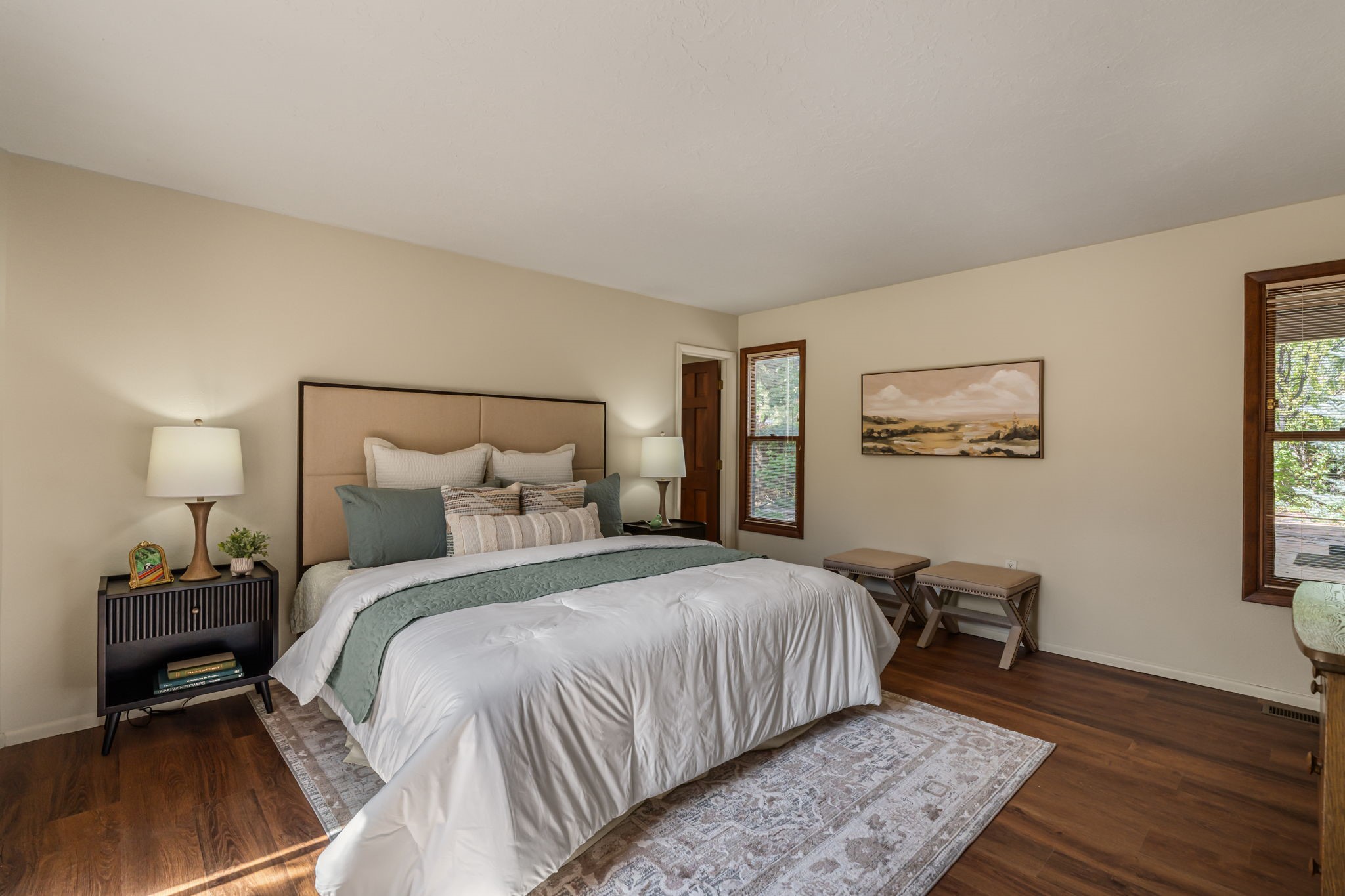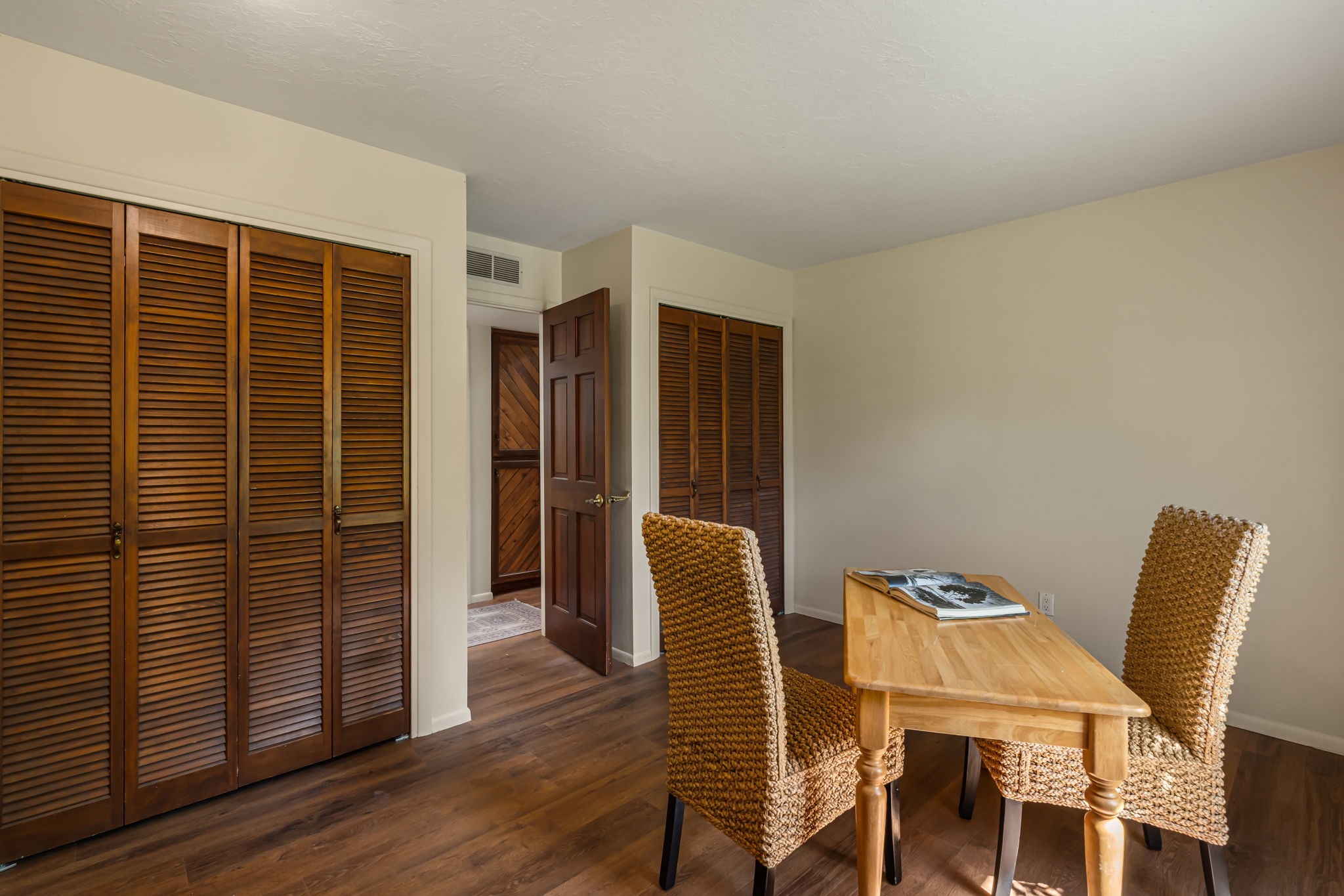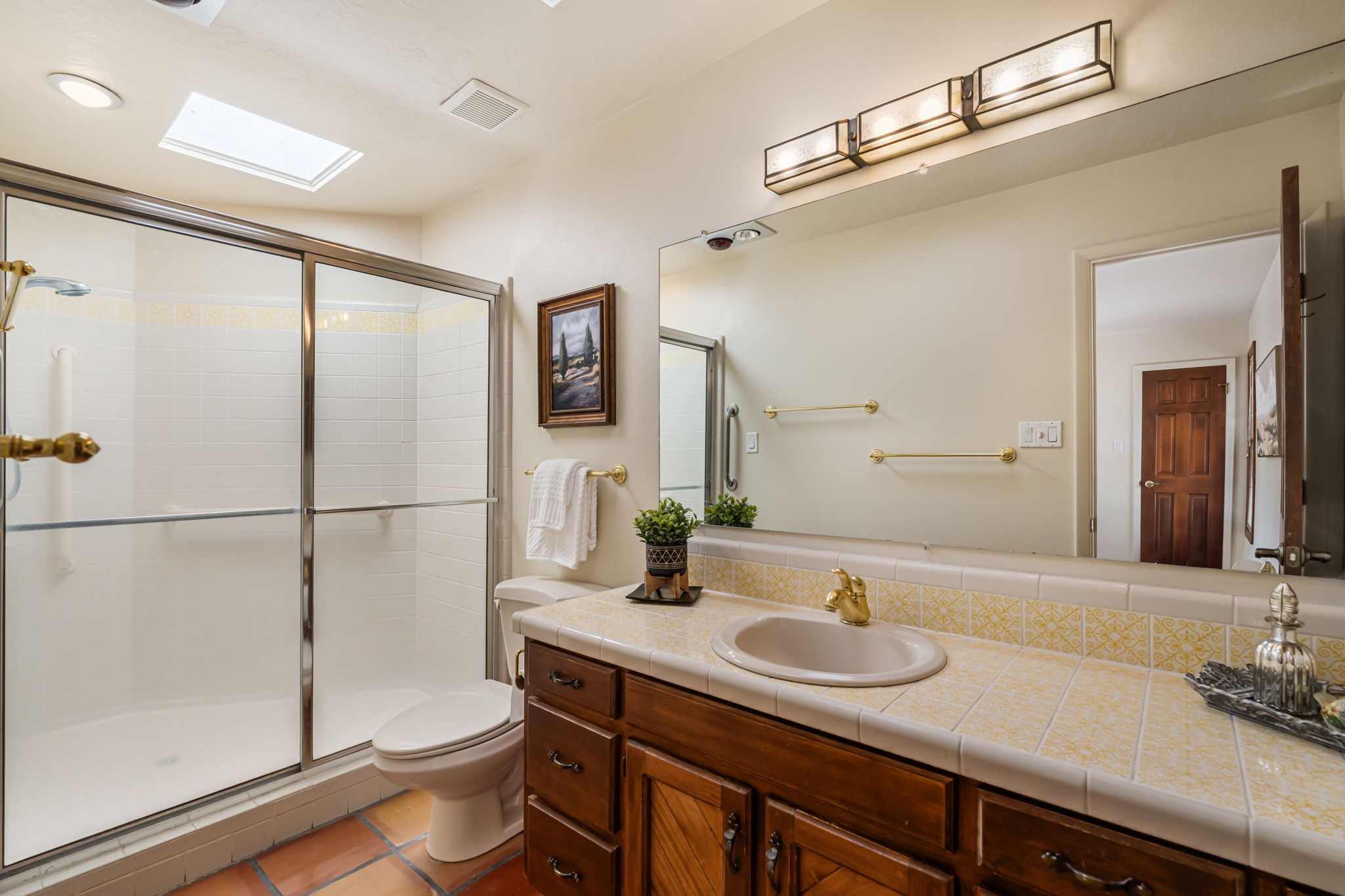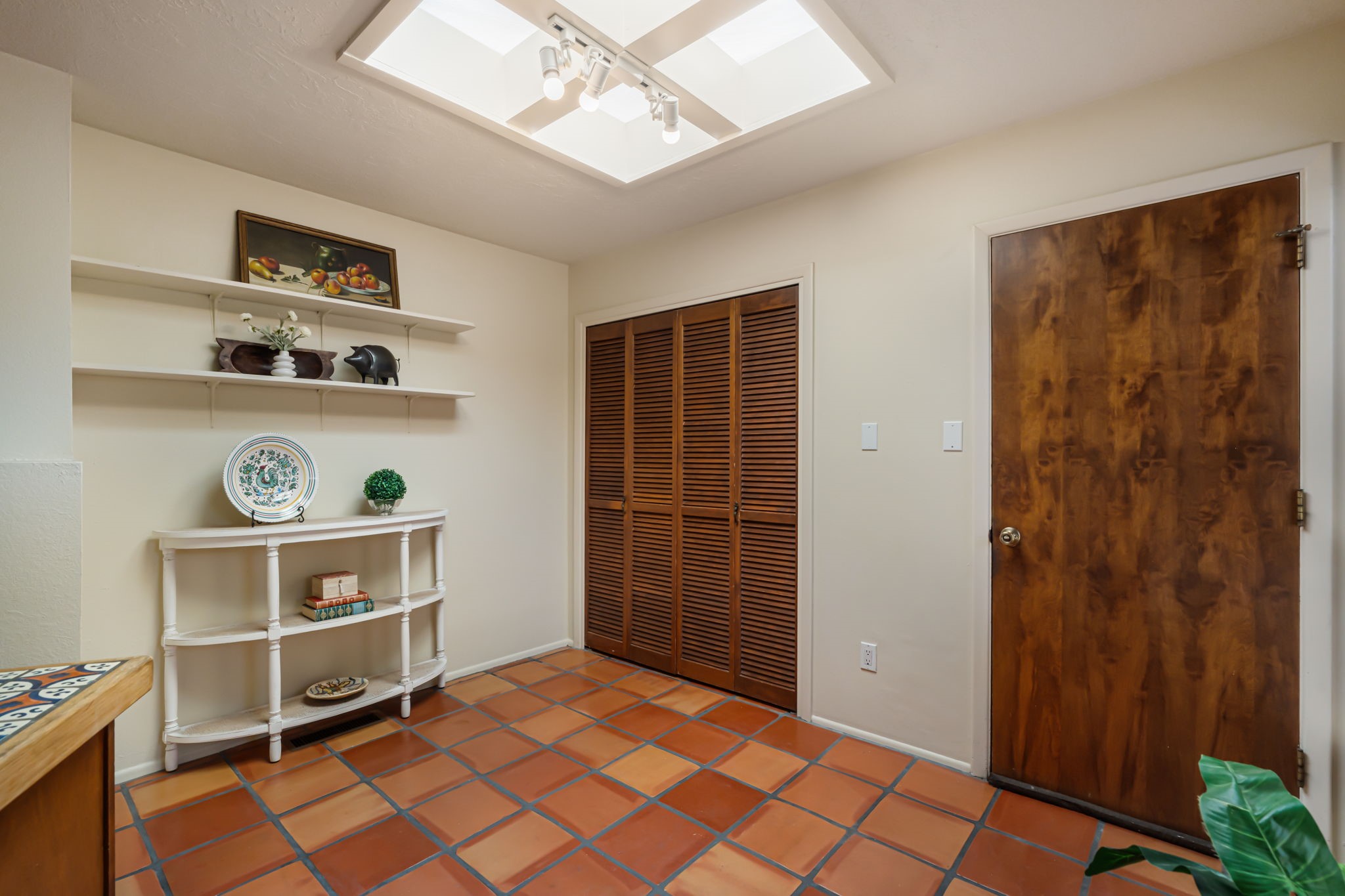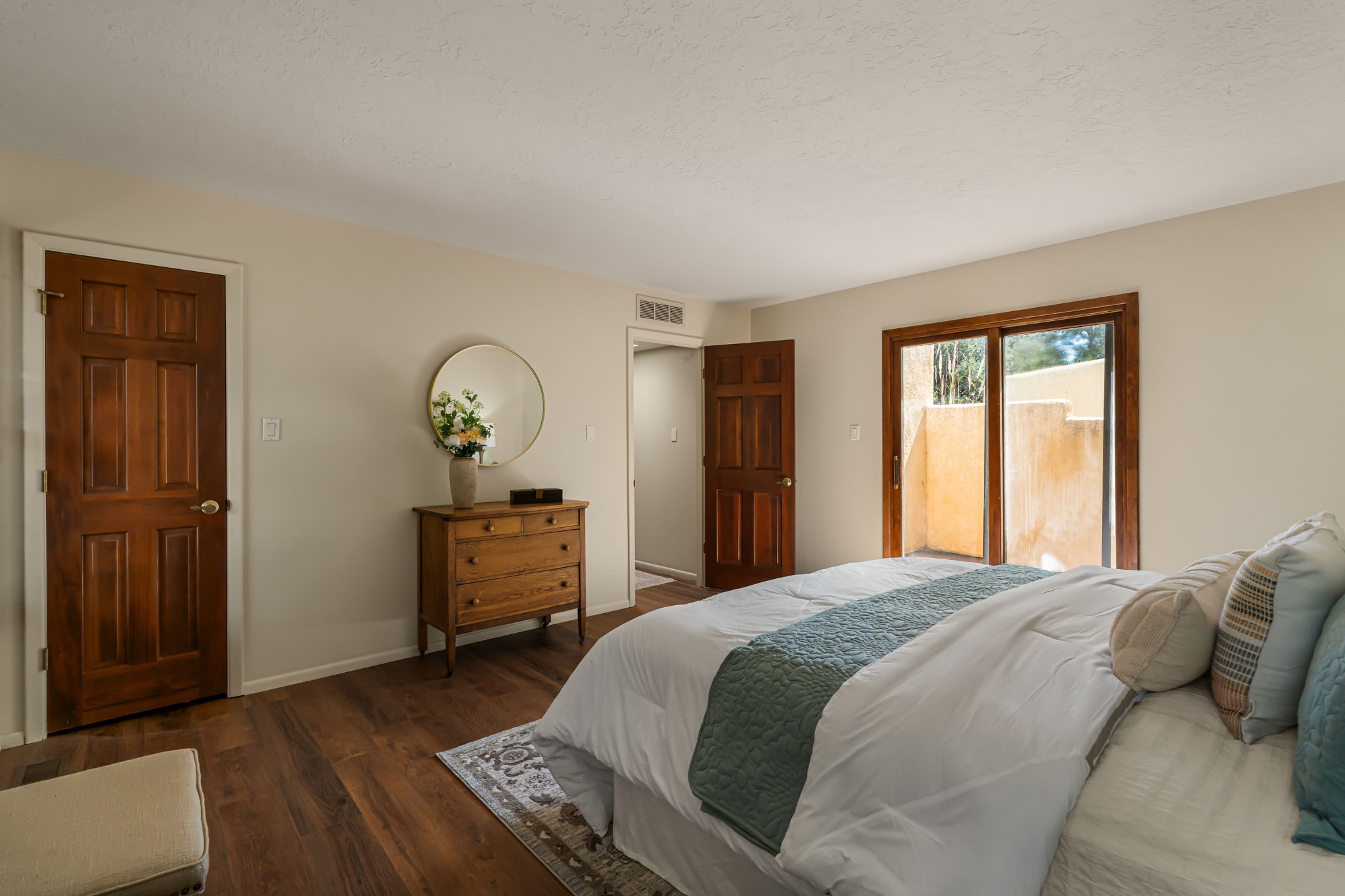 Welcome to this beautiful, single-level home in the quiet interior of Park Plazas, one of Santa Fe's most desirable neighborhoods. The spacious living and dining room is filled with natural light from clerestory windows with diffusers, and features a wood-burning corner Kiva fireplace with stone banco as well as sliding doors that open to a lovely flagstone patio and lush outdoor retreat. The kitchen offers matching, all stainless appliances, colorful Mexican tile counters, and a generous breakfast nook with a large skylight that connects conveniently to the two-car garage. The primary suite includes sliding doors to a private enclosed patio, a spacious walk-in closet, and an ensuite bath, while the second bedroom has two closets and the guest bath features a Talavera sink and skylight. Outdoors, the property delights with fruit trees--including apricot, plum, nectarine, and cooking cherries--along with grapevines, roses, and abundant plantings, all on a timed drip irrigation system. Stately evergreens line the west side of the yard in a graceful semi-circle, creating both beauty and privacy. With newer flooring throughout, fresh paint, forced-air heating, and refrigerated air conditioning, this home is move-in ready. Park Plazas residents enjoy miles of walking trails, a community garden, playground, basketball and tennis courts, and an off-leash dog park--all just minutes from Santa Fe's shopping, dining, and cultural attractions.