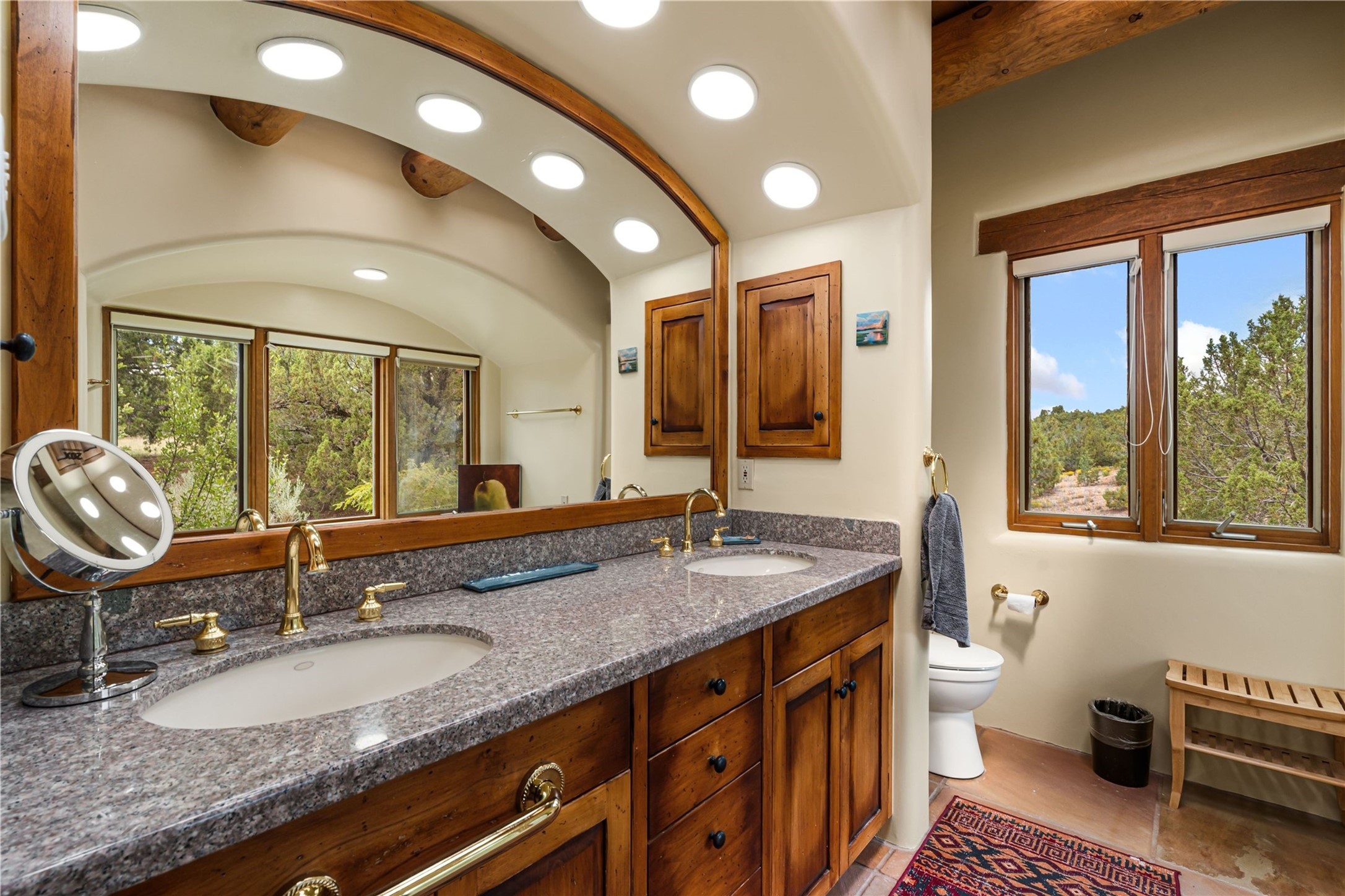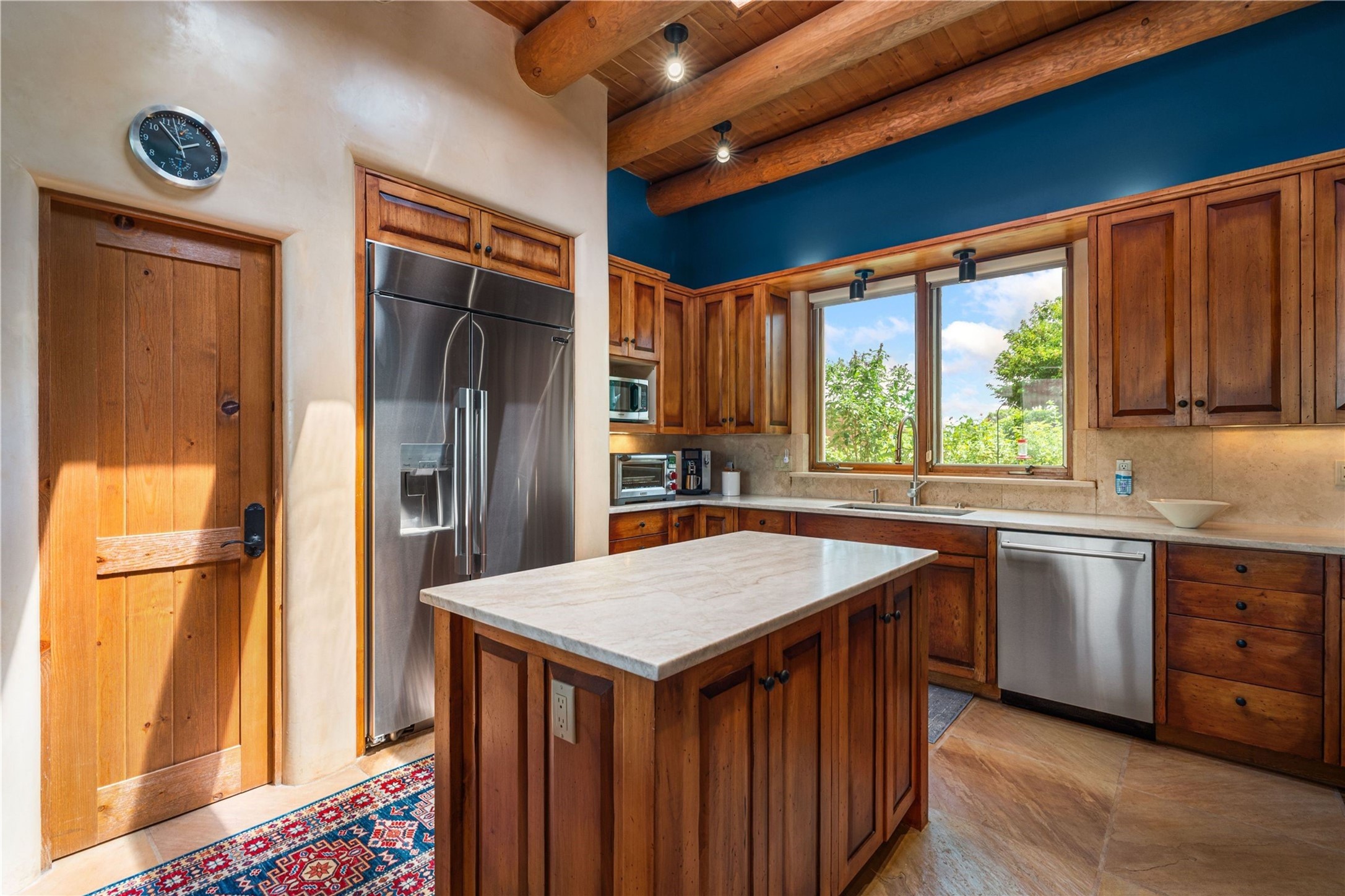Tucked high up in Las Campanas on a generous 2.4-acre lot, this gorgeous Kim Dressel pueblo-style home is all about views, vibes, and space to breathe. From the moment you stroll through the professionally landscaped courtyard, you'll feel the magic--unobstructed vistas of the Jemez Mountains and sunsets that'll make you stop mid-sentence just to stare. Inside, it's a custom masterpiece. Think flagstone floors, hand-hewn beams, and those classic vigas that give it that warm, earthy soul. The ceilings and walls? Absolutely stunning, with textures and treatments that make every room feel like a work of art. Natural light pours in through expansive skylights, bouncing off the hand-troweled plaster walls and stone floors, creating that signature New Mexican glow. The chef's kitchen is a showstopper--top-tier appliances, loads of granite counter space, and a butler's pantry that's ready for your next dinner party or midnight snack run. And if you've got guests (or just want a little extra privacy), the attached casita is a sweet bonus: separate entrance, kitchenette, and all the cozy charm. You'll find two primary suites plus two additional bedroom suites--one even has its own mini kitchen and sitting room, perfect for long-term guests or multi-gen living. Whether you're hosting a formal gathering or kicking back in the informal living spaces, this home flows effortlessly. Over 1,000 square feet of private outdoor space to soak in the views, sip your morning coffee, or toast the sunset. With its perch on one of the highest lots in the area, you'll enjoy peace, privacy, and those jaw-dropping Northwest views over untouched land. This isn't just a house--it's a lifestyle. Come see it, feel it, fall in love.