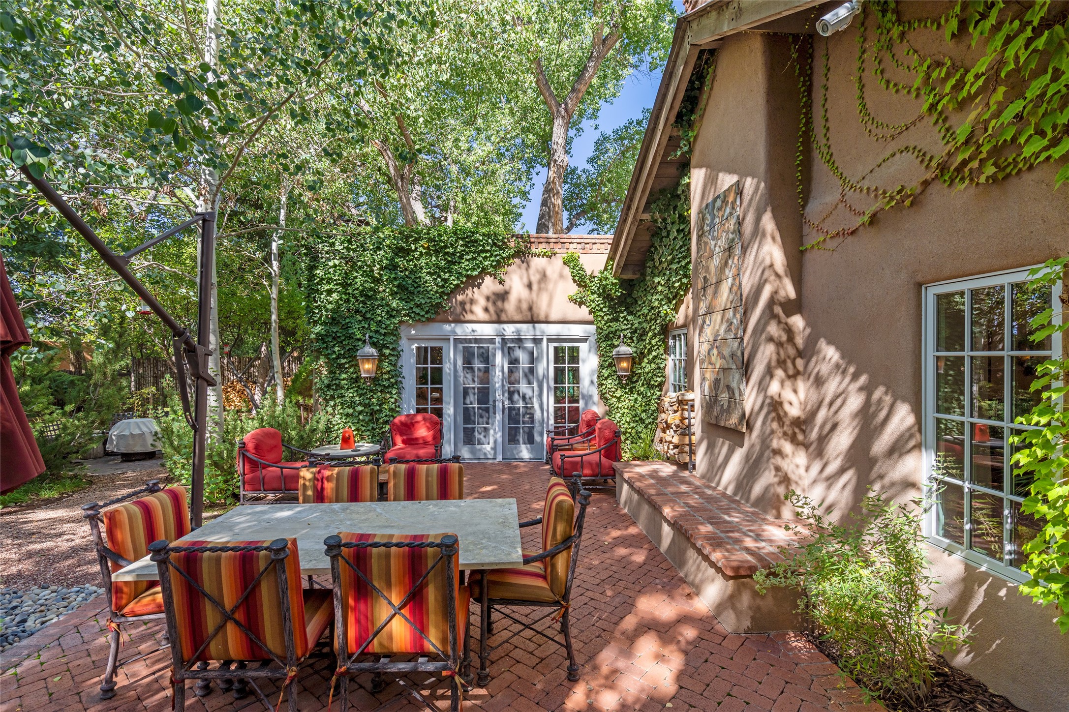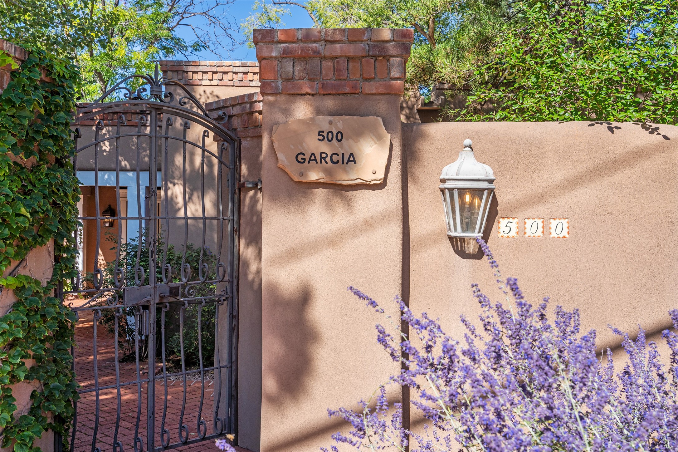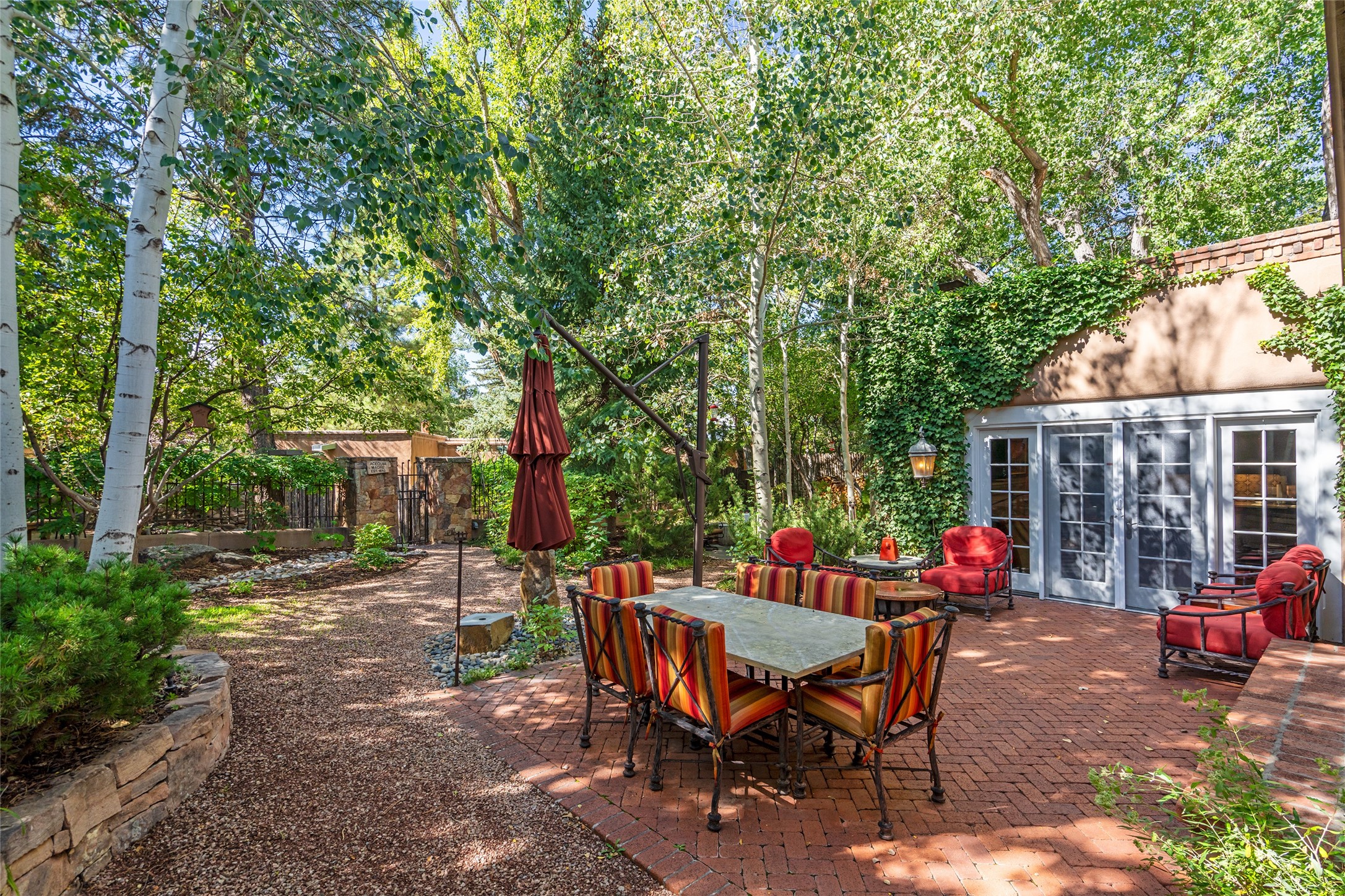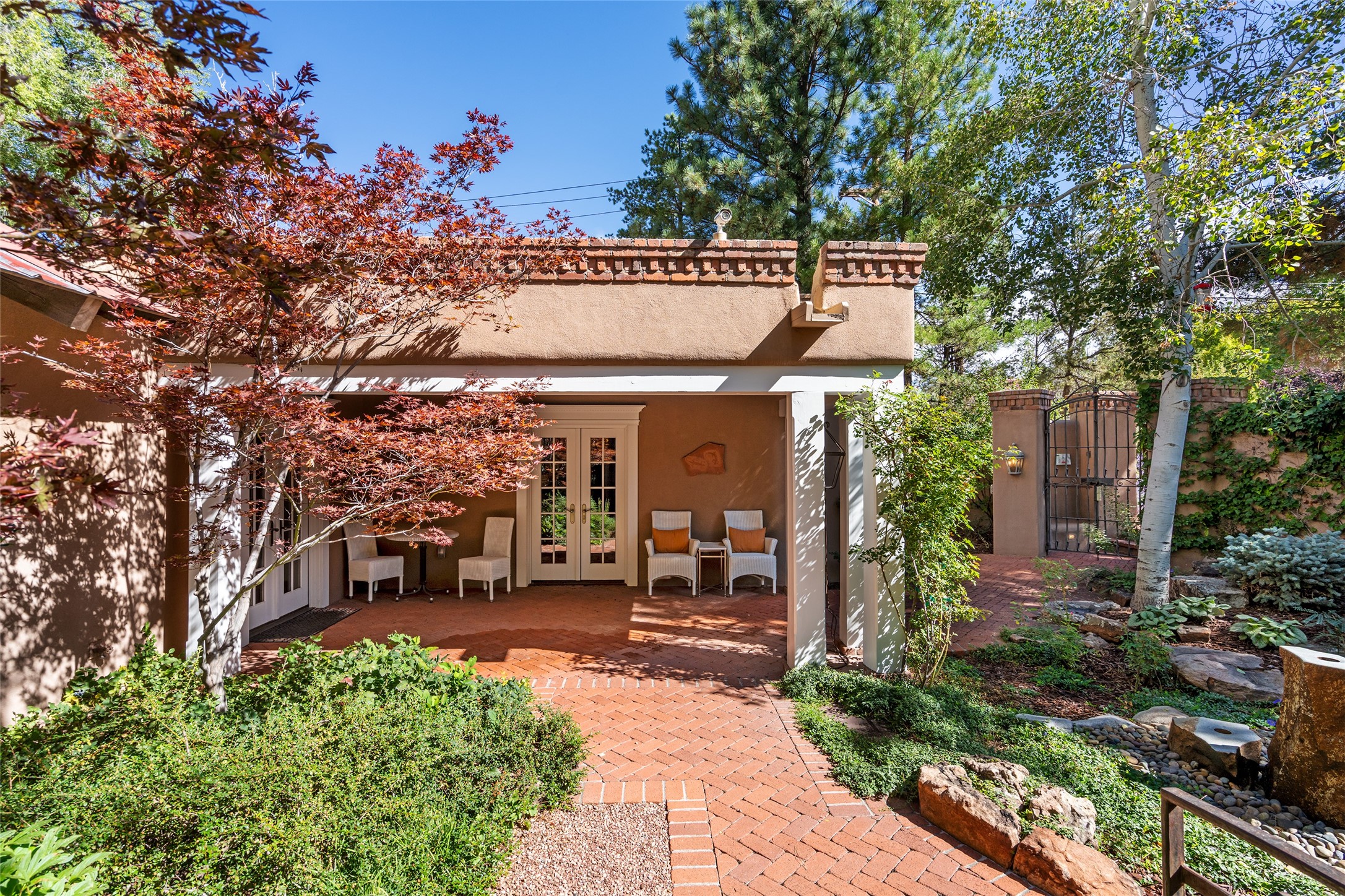 STATELY HISTORIC EASTSIDE BETTY STEWART HOME WITH PROVENANCE AND TRUE BLUE-CHIP LOCATION ON THE ACEQUIA MADRE. Rare offering for the ultimate downtown residence - everything from Downtown Subscription to fine dining, exploring Canyon Road, and enjoying the surrounding hills - all at your fingertips. Nestled in the epicenter of one of Santa Fe's most coveted locations, this exceptional residence seamlessly blends historic charm with refined updates. Surrounded by exquisite mature trees and vines; a winding path around the property shows a parade of color, seasonal landscape interest and multiple fountains that serve to enhance the natural outdoor experience year-round. Cross the wood bridge and sit by the Acequia - the ultimate Santa Fe respite. A Betty Stewart addition, executed to the highest standards, showcases vaulted ceilings, hand-carved woodwork, deep inset windows, and elegant chandeliers that fill the home with natural warmth. Classic brick floors flow throughout, leading to numerous patios perfect for entertaining. The large kitchen is both inviting and functional with a floating Kiva fireplace, Wolf/Sub-Zero/Thermador appliances, and pantry. The owner's suite offers a built-in study and an adjoining flex space ideal as a laundry, gym, or office. A private guest suite includes patio access and its own elevated Kiva fireplace. Gorgeous vigas and beams highlight the home's Southwestern character. Additional features include an office/study or third bedroom, an oversized detached two-car garage, multiple mini-splits for cooling, and two radon mitigation systems. Optional Acequia irrigation rights further enhance the lust setting. Just moments from galleries, restaurants, and cultural landmarks, this property represents the rare opportunity to own a piece of Santa Fe history while enjoying modern comfort in an unparalleled location.