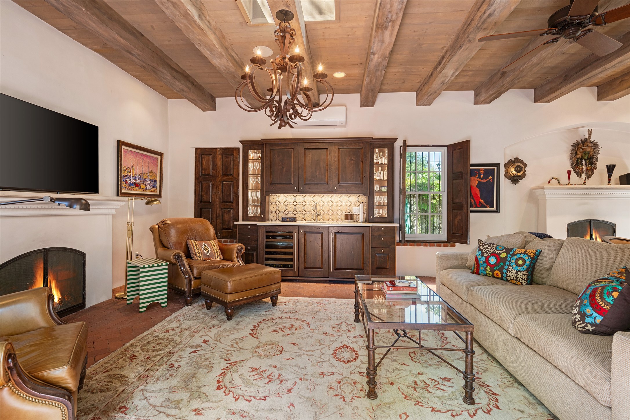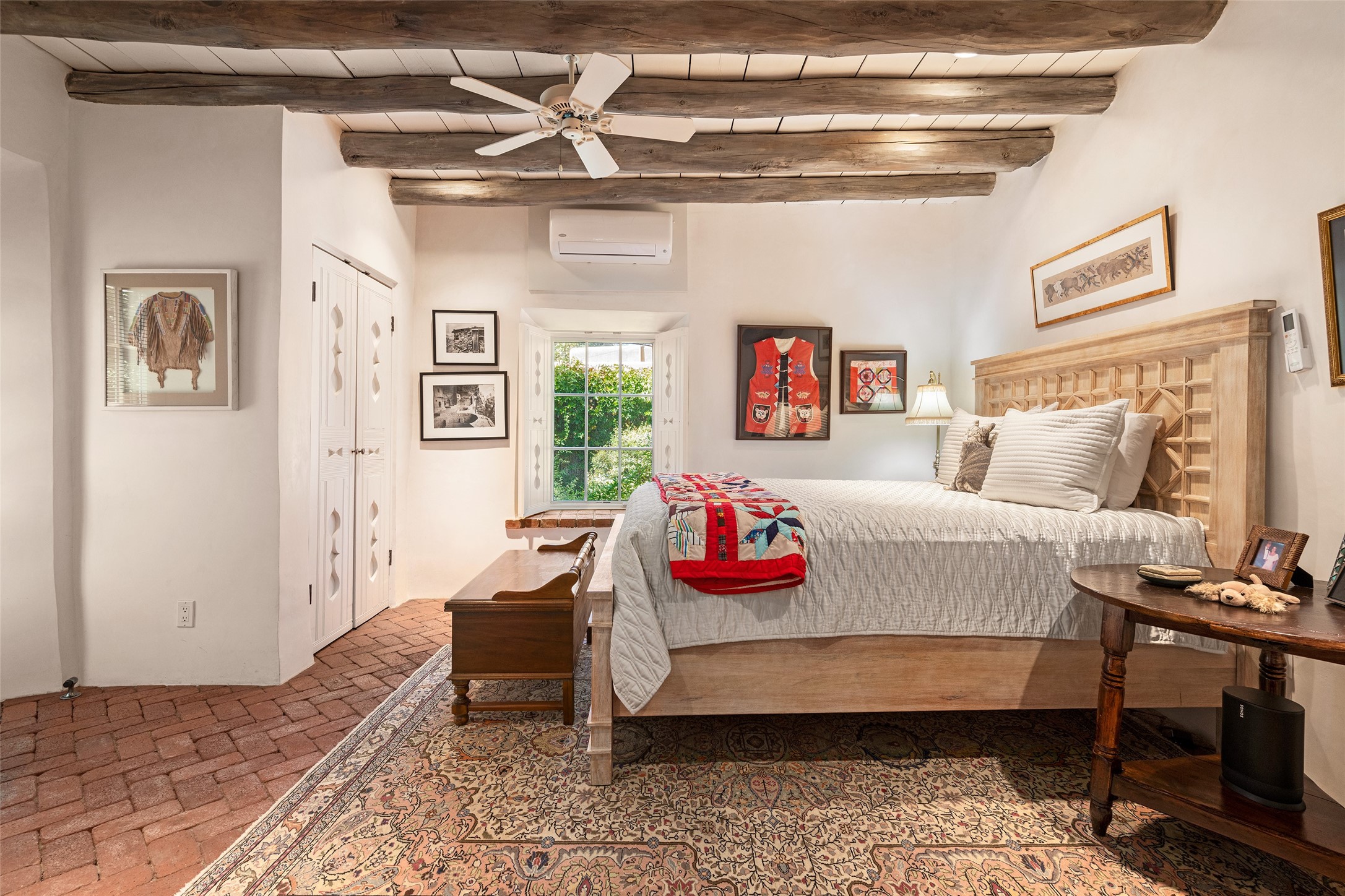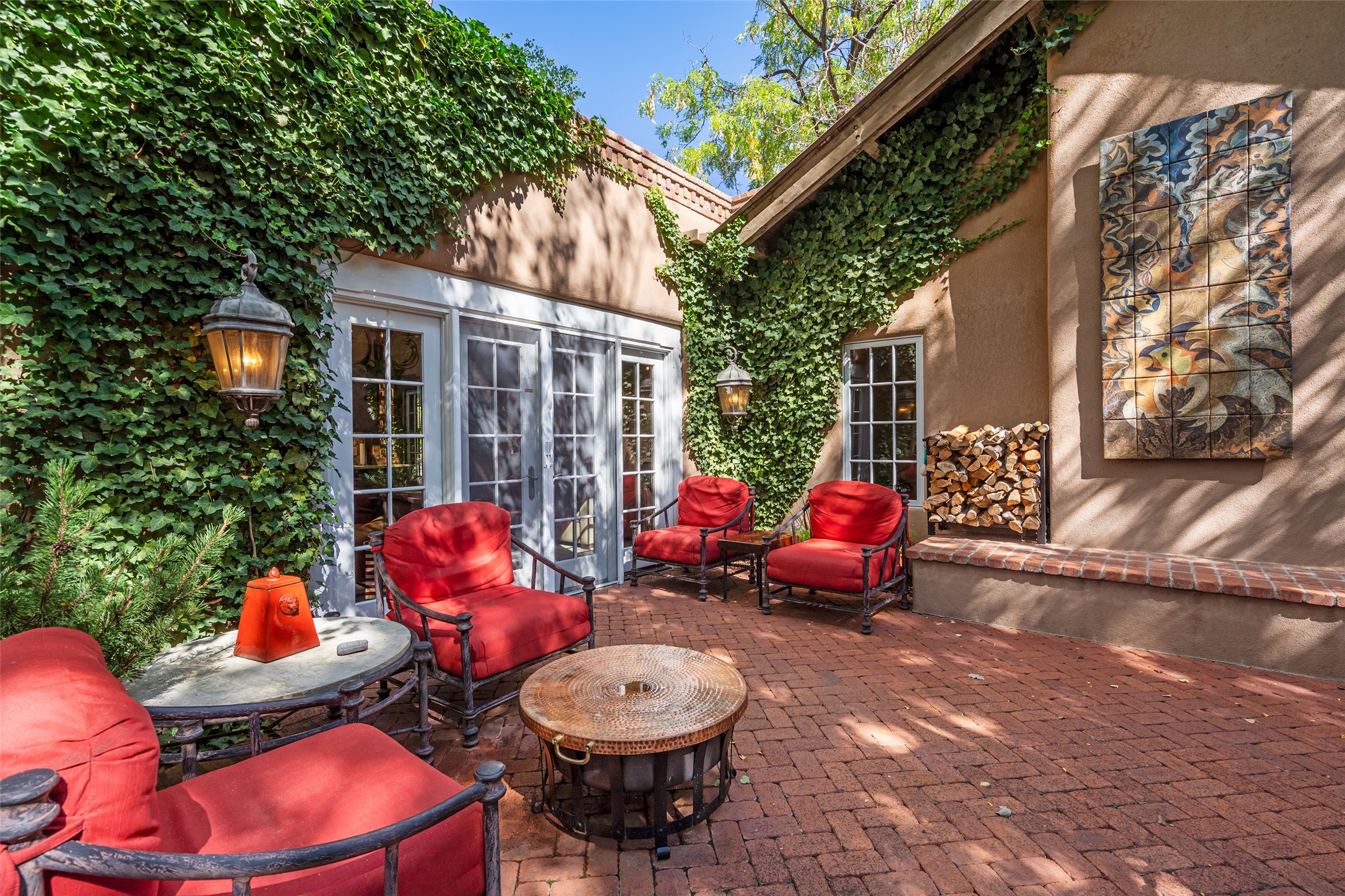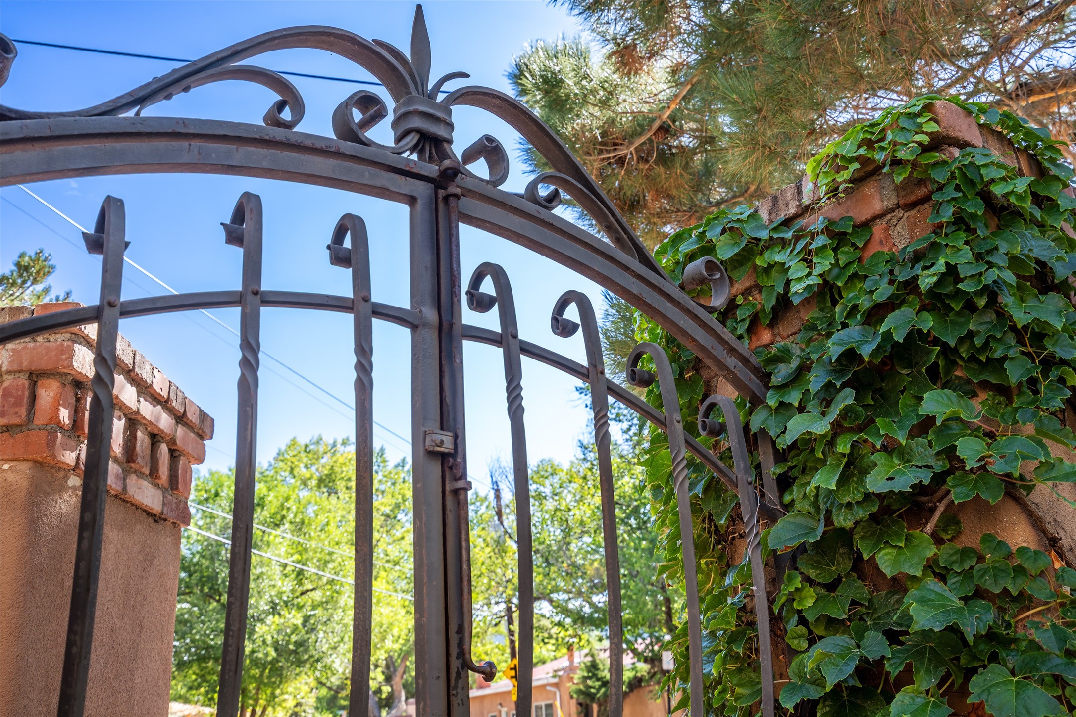 STATELY HISTORIC EASTSIDE BETTY STEWART HOME WITH PROVENANCE AND TRUE BLUE-CHIP LOCATION ON THE ACEQUIA MADRE. Rare offering for the ultimate downtown residence - everything from Downtown Subscription to fine dining, exploring Canyon Road, and enjoying the surrounding hills - all at your fingertips. Nestled in the epicenter of one of Santa Fe's most coveted locations, this exceptional residence seamlessly blends historic charm with refined updates. Surrounded by exquisite mature trees and vines; a winding path around the property shows a parade of color, seasonal landscape interest and multiple fountains that serve to enhance the natural outdoor experience year-round. Cross the wood bridge and sit by the Acequia - the ultimate Santa Fe respite. A Betty Stewart addition, executed to the highest standards, showcases vaulted ceilings, hand-carved woodwork, deep inset windows, and elegant chandeliers that fill the home with natural warmth. Classic brick floors flow throughout, leading to numerous patios perfect for entertaining. The large kitchen is both inviting and functional with a floating Kiva fireplace, Wolf/Sub-Zero/Thermador appliances, and pantry. The owner's suite offers a built-in study and an adjoining flex space ideal as a laundry, gym, or office. A private guest suite includes patio access and its own elevated Kiva fireplace. Gorgeous vigas and beams highlight the home's Southwestern character. Additional features include an office/study or third bedroom, an oversized detached two-car garage, multiple mini-splits for cooling, and two radon mitigation systems. Optional Acequia irrigation rights further enhance the lust setting. Just moments from galleries, restaurants, and cultural landmarks, this property represents the rare opportunity to own a piece of Santa Fe history while enjoying modern comfort in an unparalleled location.