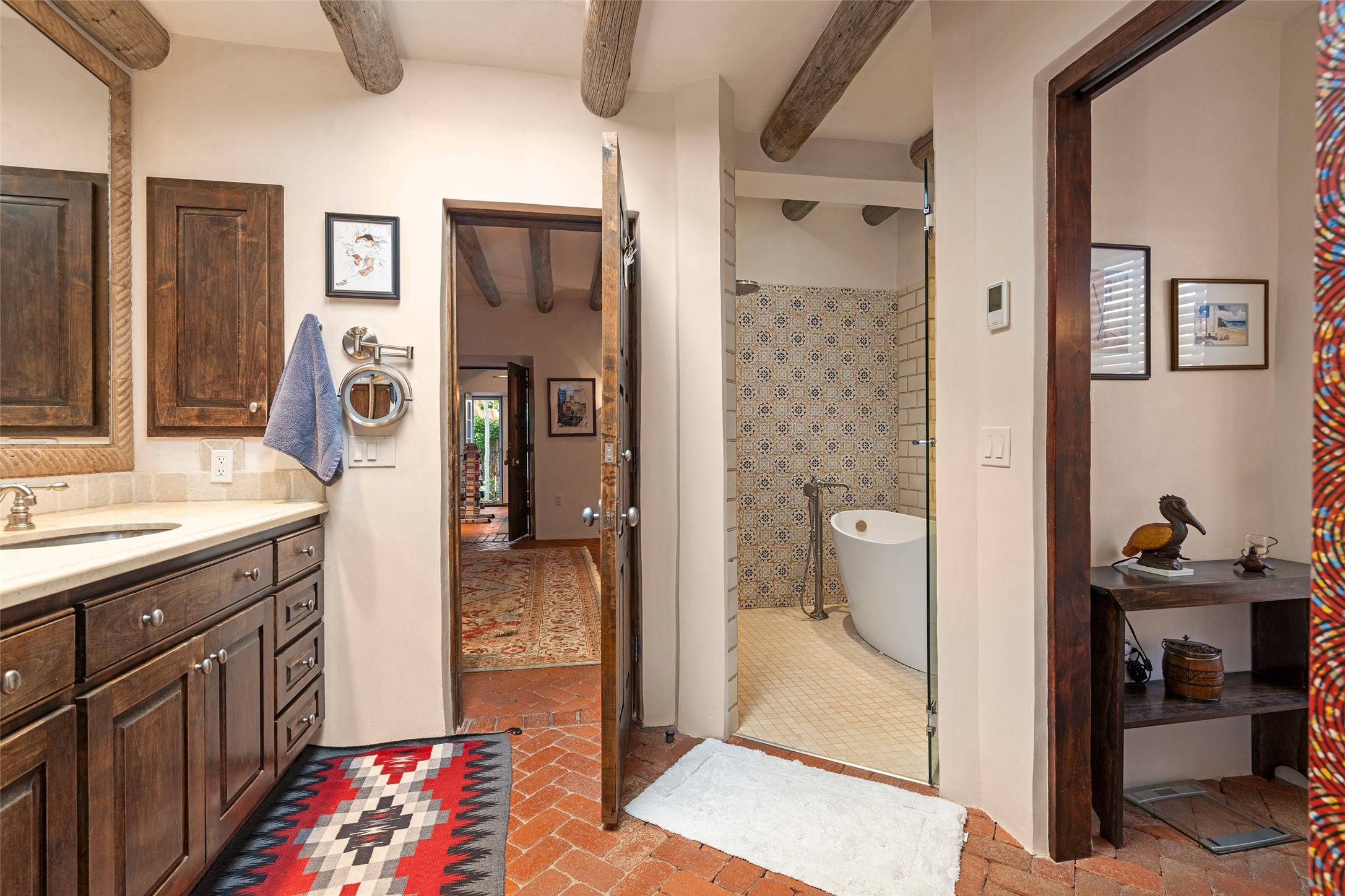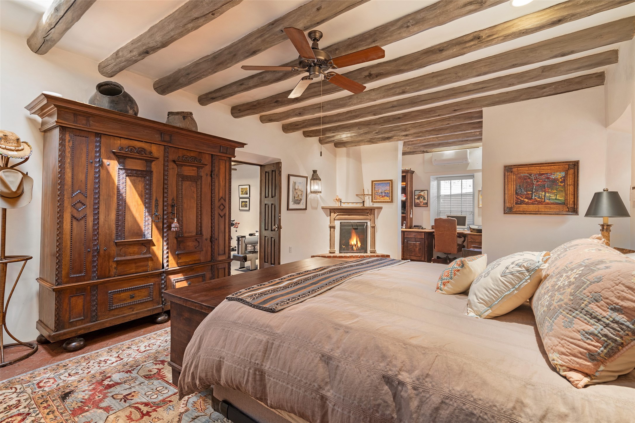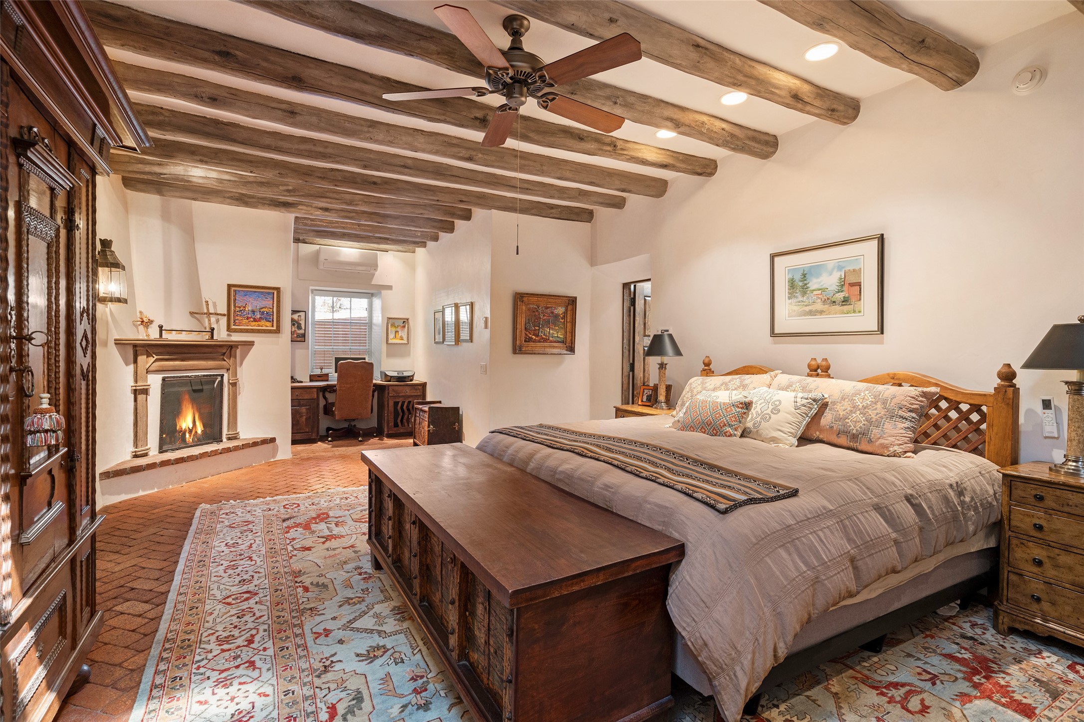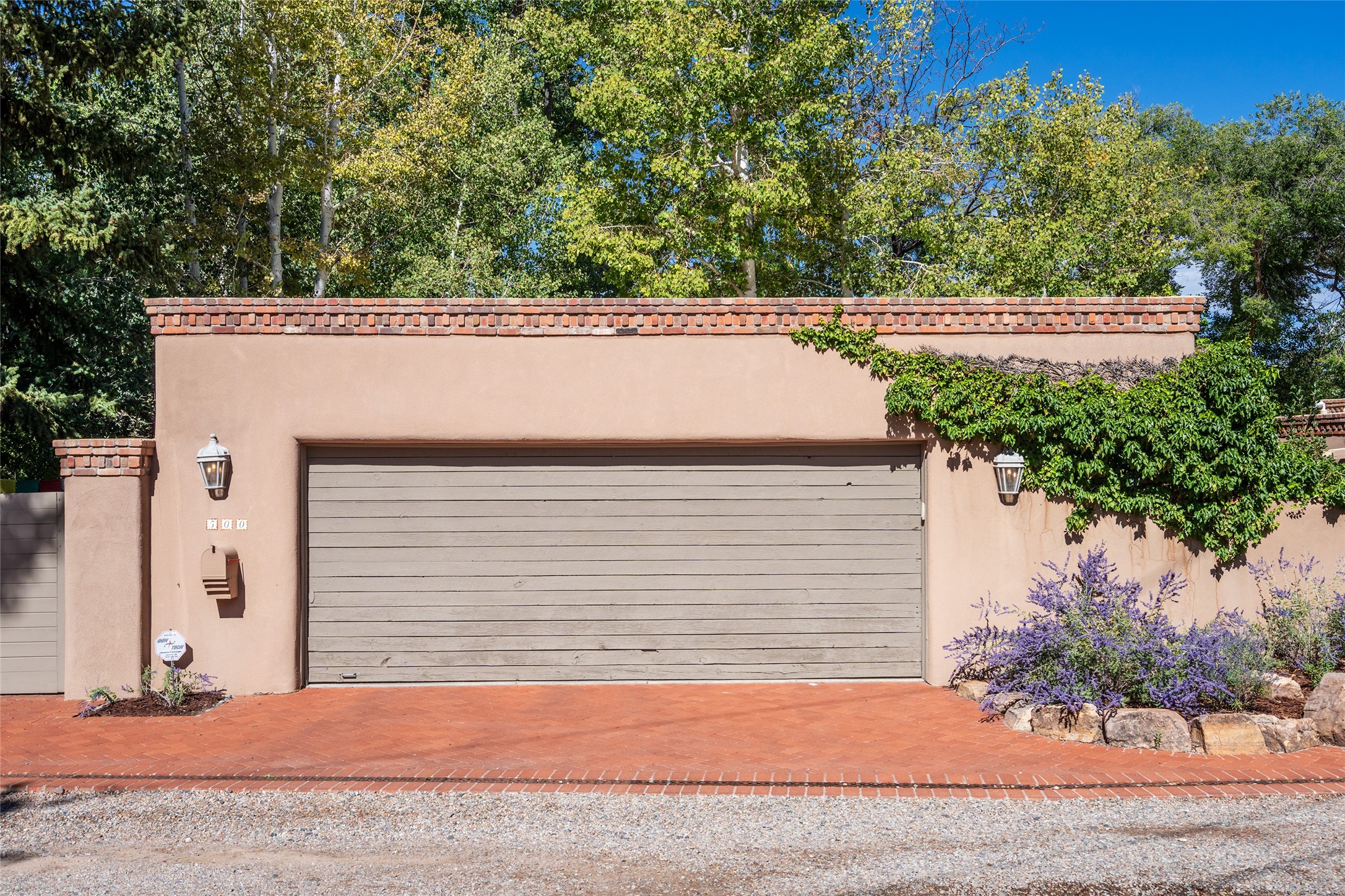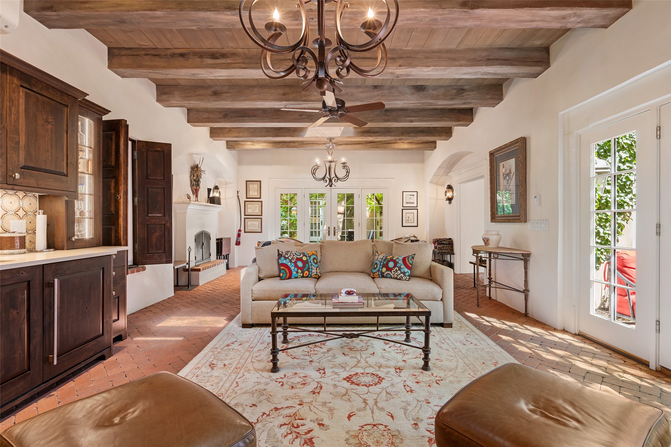 STATELY HISTORIC EASTSIDE BETTY STEWART HOME WITH PROVENANCE AND TRUE BLUE-CHIP LOCATION ON THE ACEQUIA MADRE. Rare offering for the ultimate downtown residence - everything from Downtown Subscription to fine dining, exploring Canyon Road, and enjoying the surrounding hills - all at your fingertips. Nestled in the epicenter of one of Santa Fe's most coveted locations, this exceptional residence seamlessly blends historic charm with refined updates. Surrounded by exquisite mature trees and vines; a winding path around the property shows a parade of color, seasonal landscape interest and multiple fountains that serve to enhance the natural outdoor experience year-round. Cross the wood bridge and sit by the Acequia - the ultimate Santa Fe respite. A Betty Stewart addition, executed to the highest standards, showcases vaulted ceilings, hand-carved woodwork, deep inset windows, and elegant chandeliers that fill the home with natural warmth. Classic brick floors flow throughout, leading to numerous patios perfect for entertaining. The large kitchen is both inviting and functional with a floating Kiva fireplace, Wolf/Sub-Zero/Thermador appliances, and pantry. The owner's suite offers a built-in study and an adjoining flex space ideal as a laundry, gym, or office. A private guest suite includes patio access and its own elevated Kiva fireplace. Gorgeous vigas and beams highlight the home's Southwestern character. Additional features include an office/study or third bedroom, an oversized detached two-car garage, multiple mini-splits for cooling, and two radon mitigation systems. Optional Acequia irrigation rights further enhance the lust setting. Just moments from galleries, restaurants, and cultural landmarks, this property represents the rare opportunity to own a piece of Santa Fe history while enjoying modern comfort in an unparalleled location.