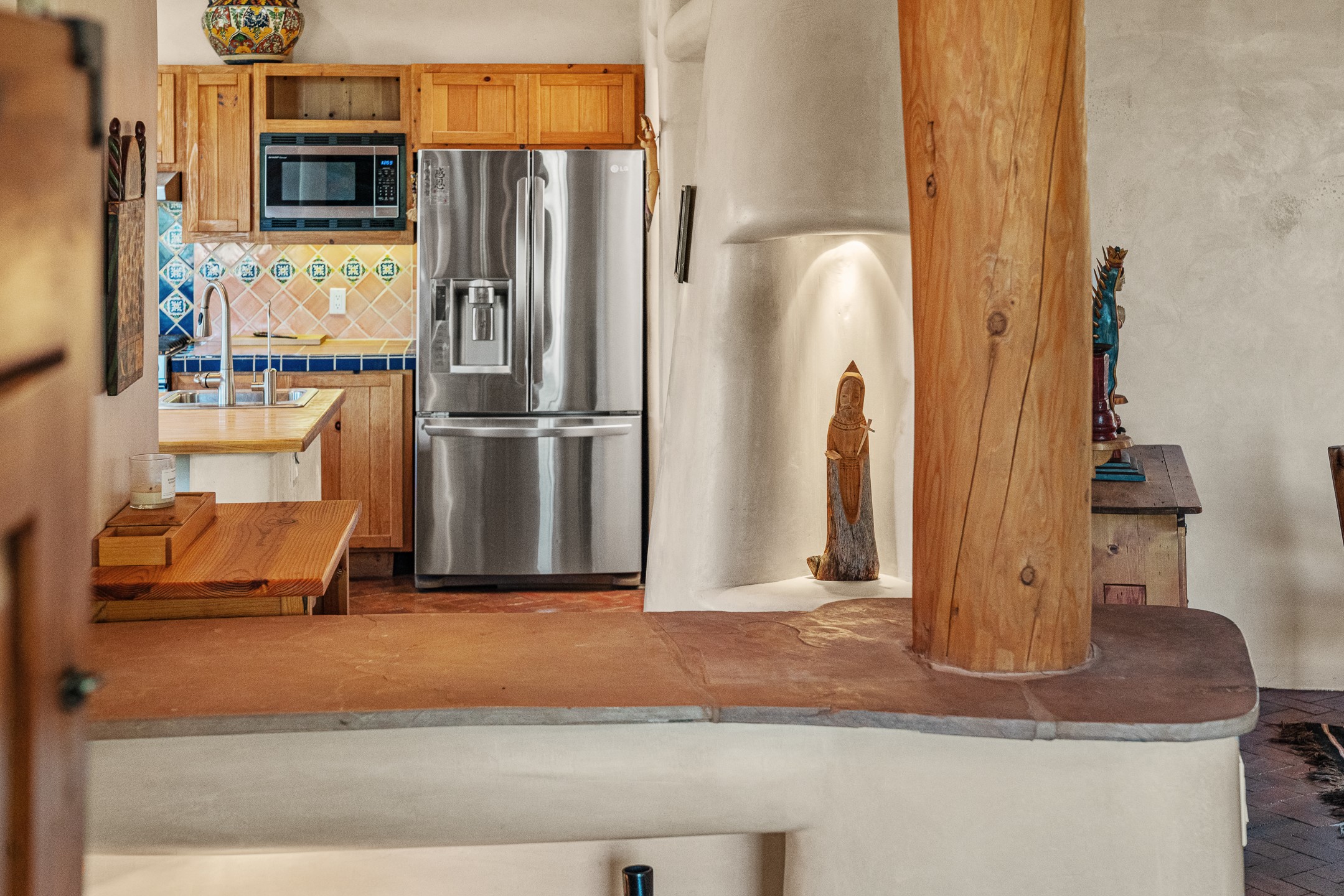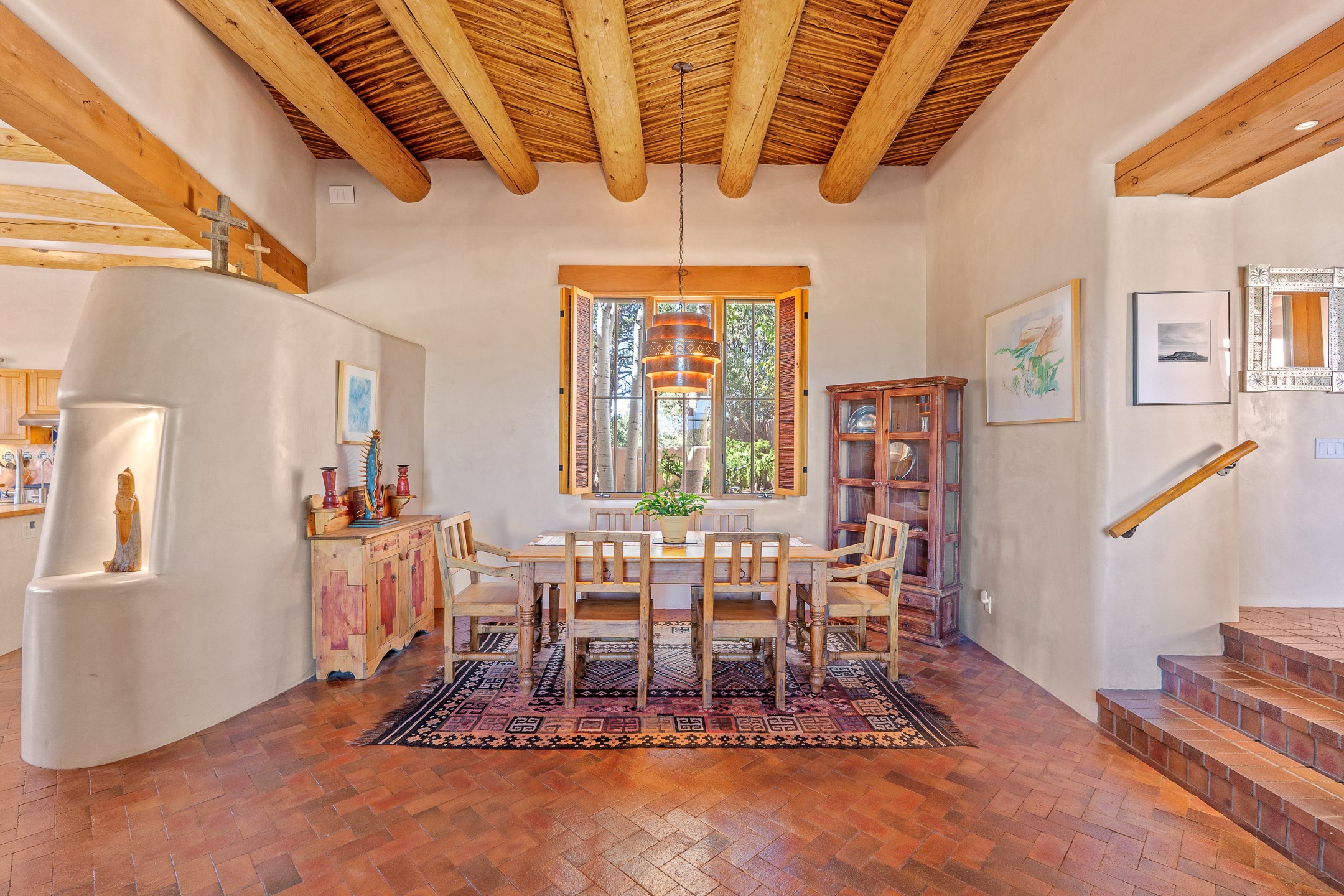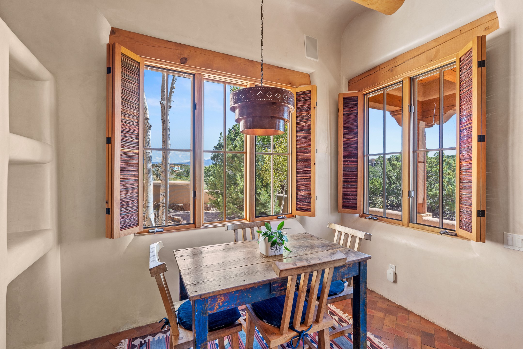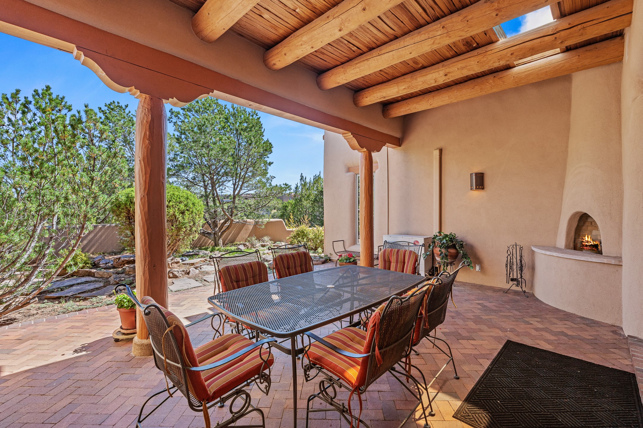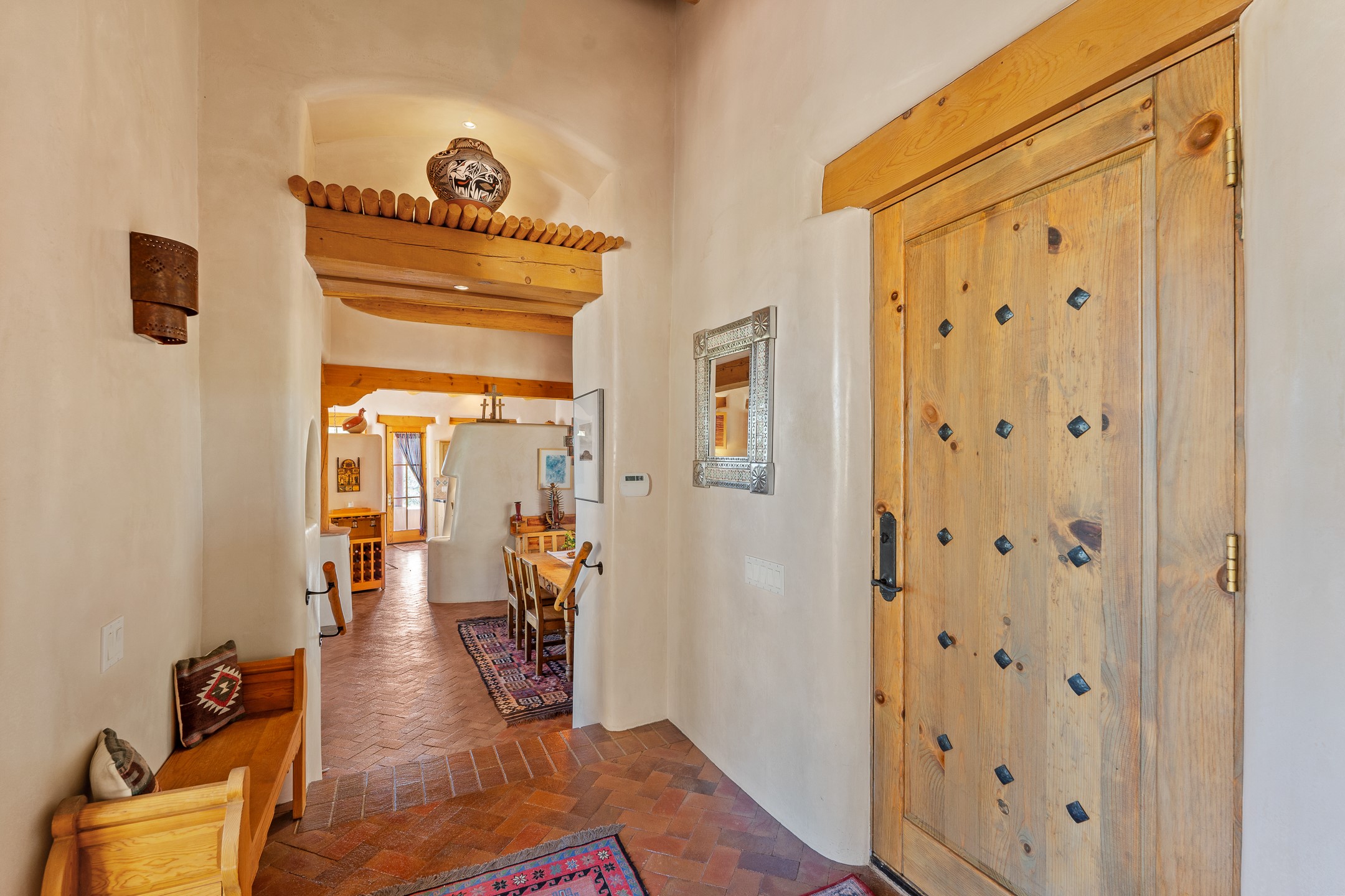 Welcome to this enchanting custom adobe home in Las Campanas, Estates II, where breathtaking views of the Sangre de Cristo Mountains greet you from the living room and primary suite. Nestled off of Sunflower Drive, this 3 bedroom, 2 bath retreat offers a sense of privacy and comfort from the moment you arrive. Step inside and discover brick herringbone floors, coved ceiling with vigas, smooth diamond plaster walls and handcrafted salt cedar shutters, all signature Santa Fe details that bring warmth and character to every room. Three kiva fireplaces invite cozy gatherings, while natural light fills the home. Outdoors there are two covered portals, and landscaped grounds that create the perfect setting for relaxing evenings or entertaining. This is Santa Fe living at its best.