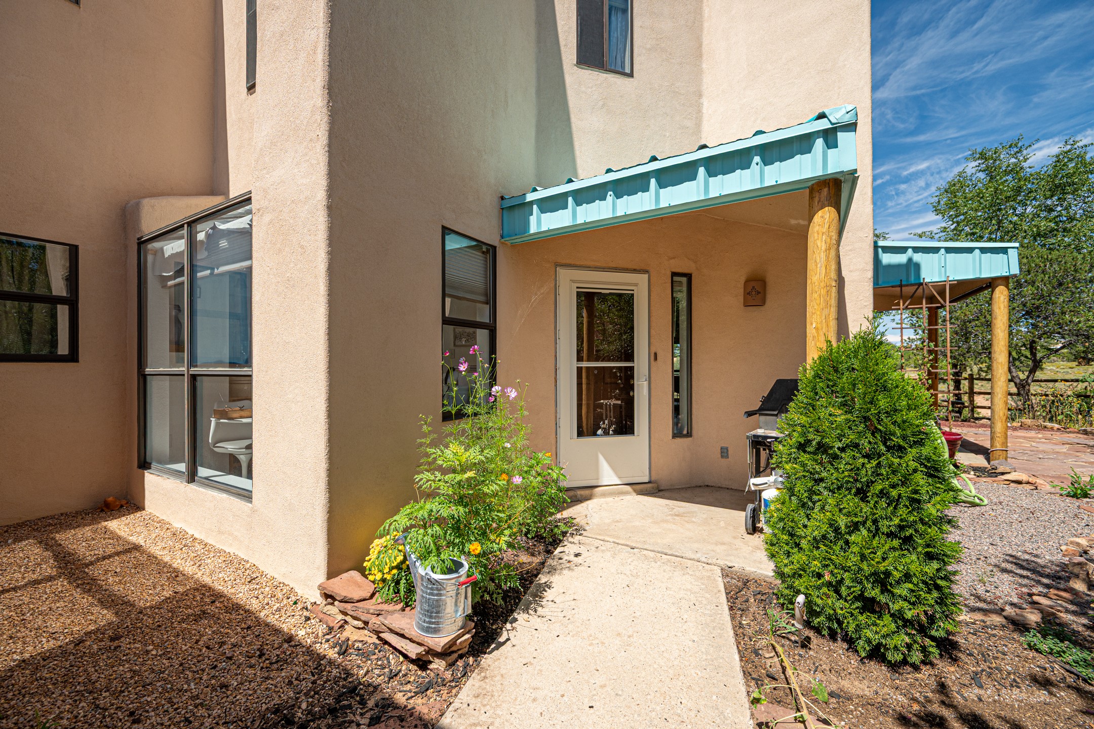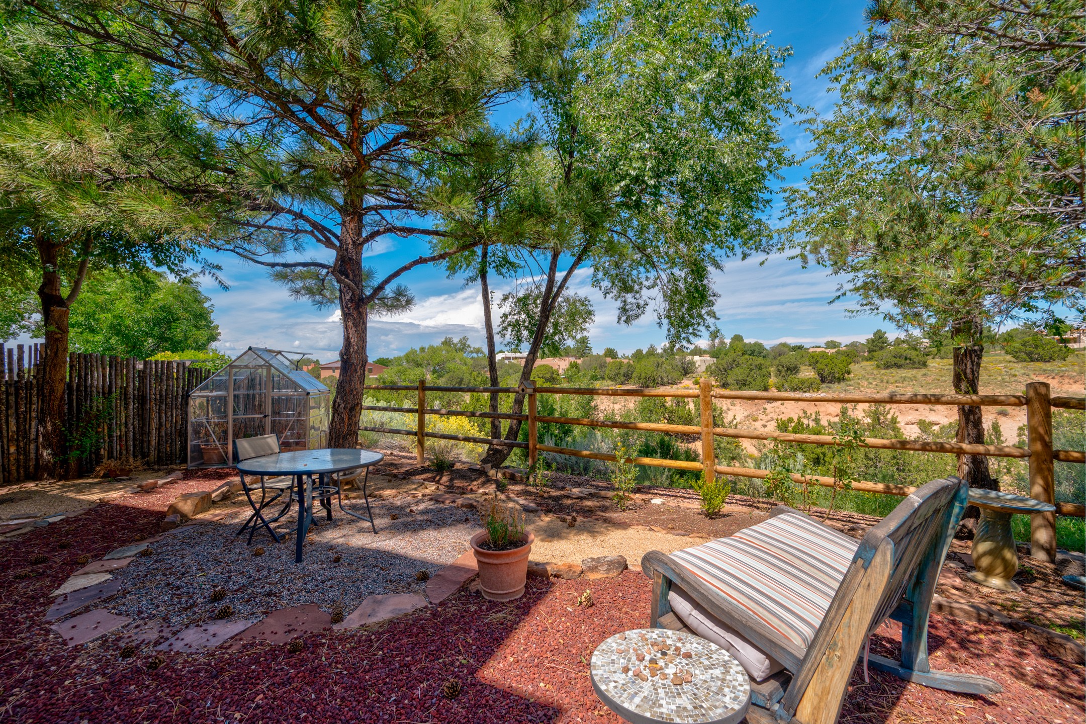 This inviting two-bedroom, two-and-a-half-bath home, located in the desirable Via Caballeros neighborhood, features 1400+/- square feet of interior space on two levels. The living room, with its soaring ceilings, abundant natural light, wood-like floors, and a charming Kiva fireplace, is warm and inviting. The spacious kitchen is appointed with wood cabinets and butcher-block countertops to add timeless appeal. Also on the main level you will find a convenient powder room, dedicated laundry room, and direct access to a 2-car garage. Upstairs, each bedroom has its own full bathroom and lots of closet space. This end unit backs onto a greenbelt, with a sublimely private wrap-around yard shaded by mature trees, with a standalone greenhouse, and xeriscaped for ease of maintenance. Local parks and amenities nearby make this an ideal starter home or investment, blending of modern updates, traditional New Mexican charm, and a central location for everyone to love.