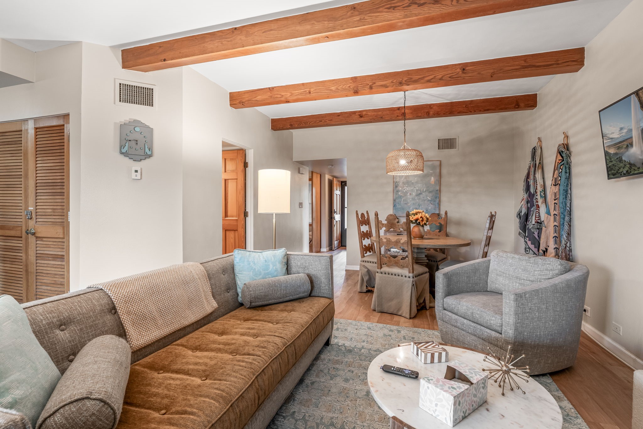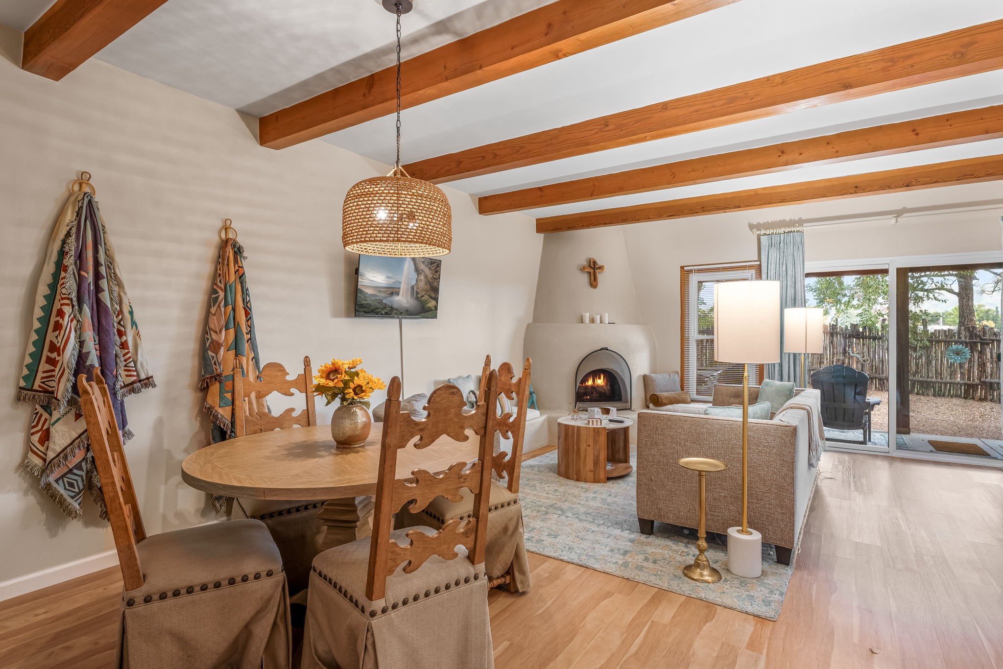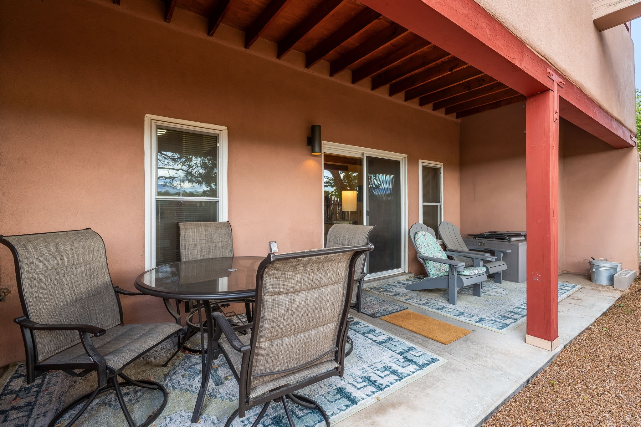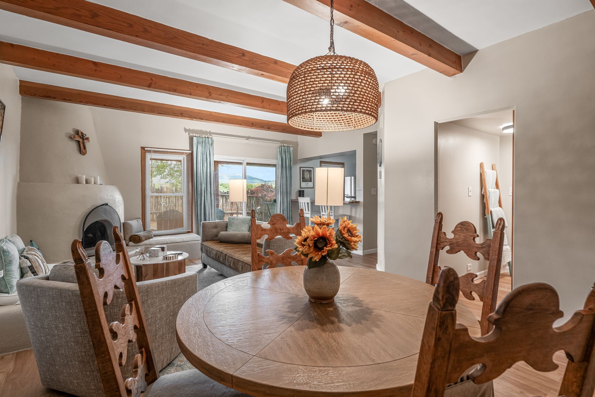 A cute and well-located Northside condo! This is a remodeled fully-furnished short term rental, with 2 beds and 2 baths. This house is recently updated, with all new HVAC, new kitchen cabinets, countertops, sink and disposal, all new flooring, new bathroom vanities, and more in 2024. Appreciate a magnificent view of the Sangre de Cristo Mountains from a private back patio, and enjoy community amenities including a barbecue grill. A very convenient 2-minute drive to the plaza. This is an easy lock and leave condo or full time residence!