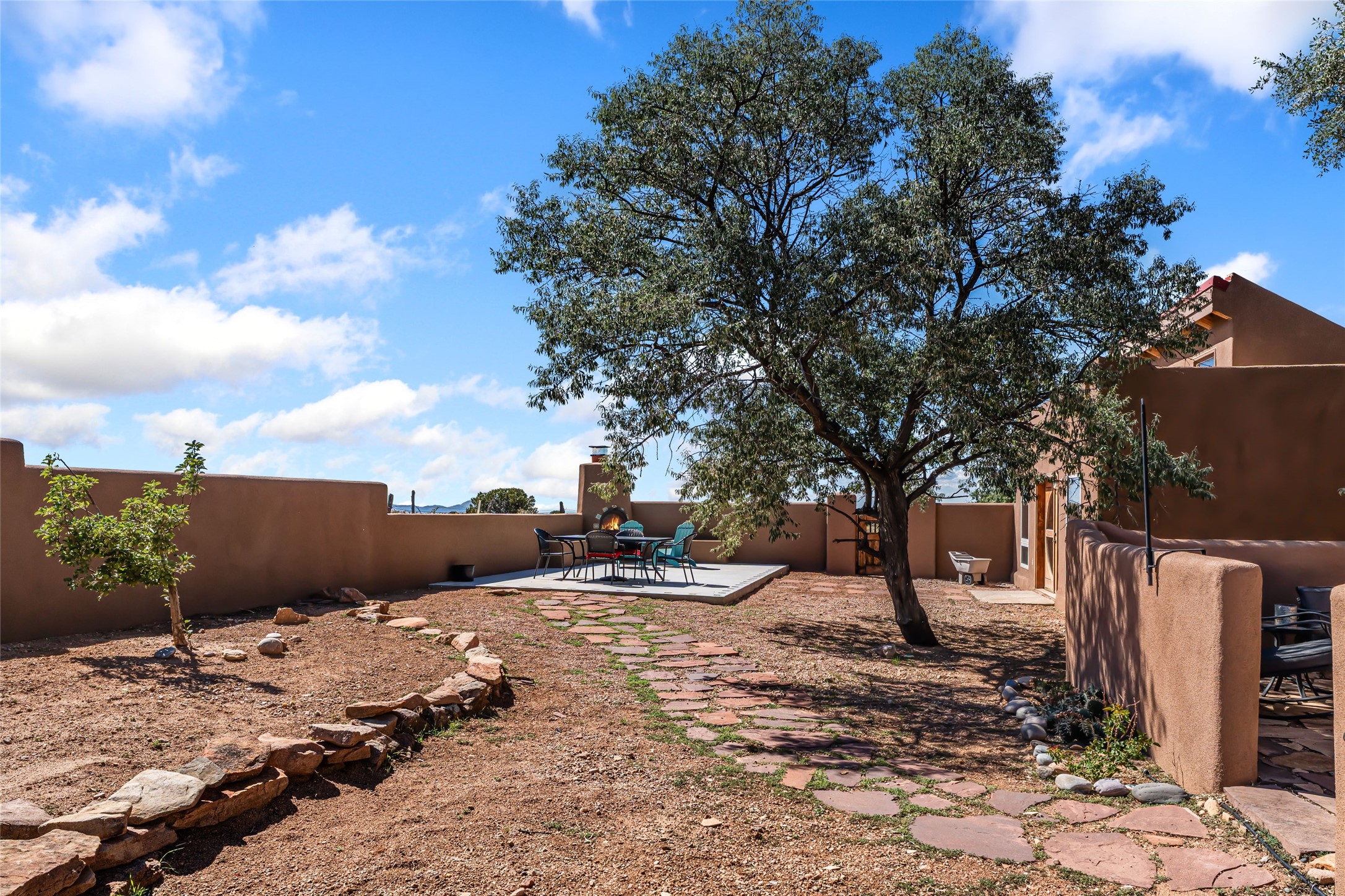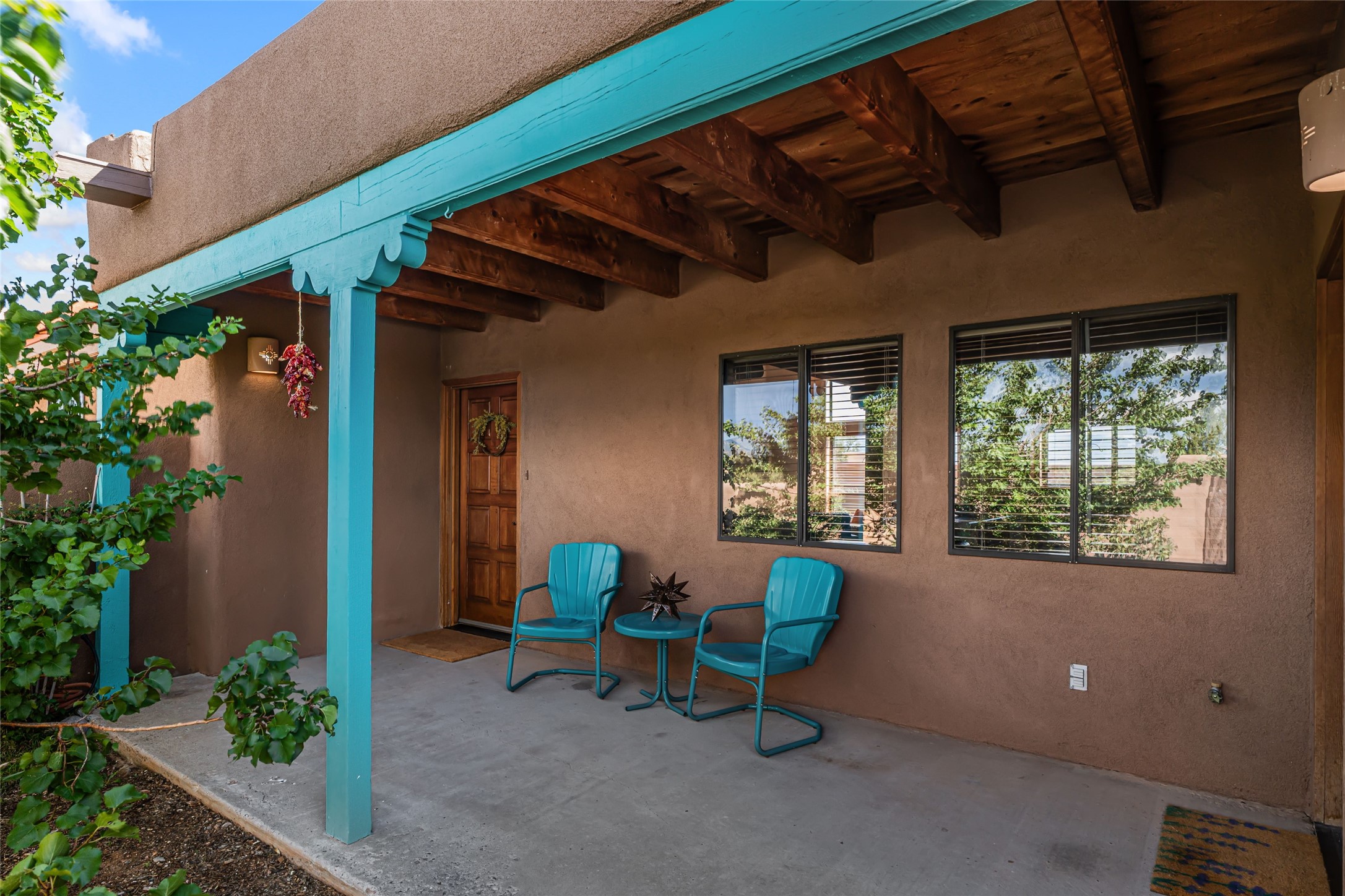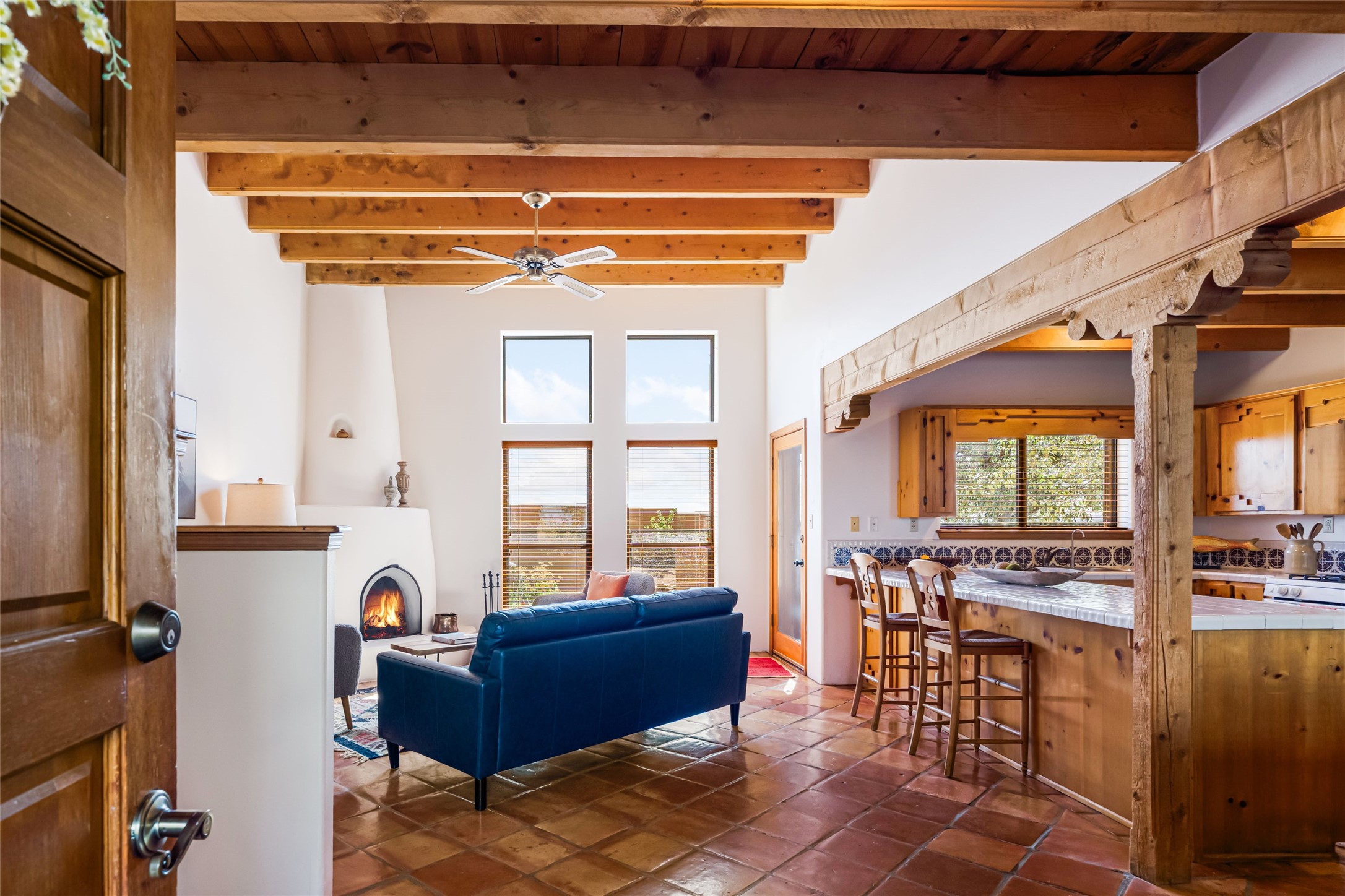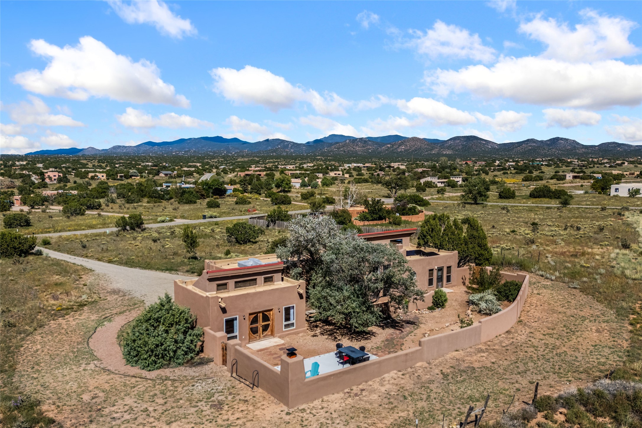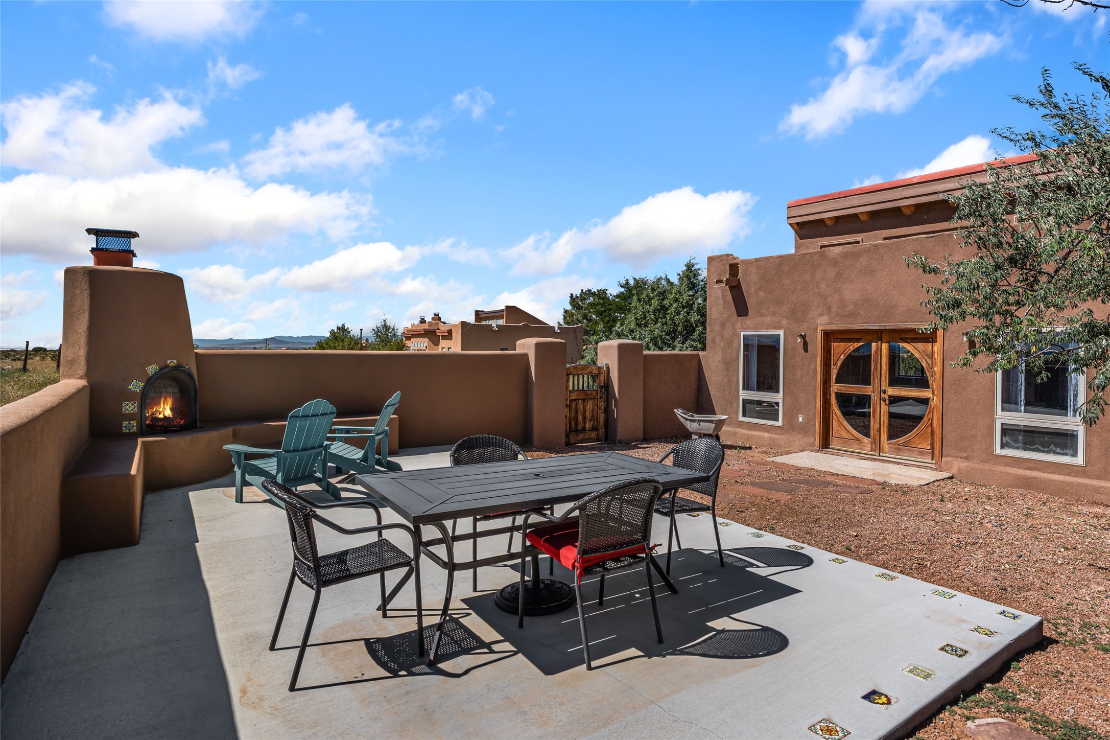 Charming Eldorado Home + Studio & Mountain Views -- Enjoy sweeping views of three mountain ranges from this light-filled Eldorado home with a versatile detached studio. Nestled on a private lot bordering ranch land, this property offers peace, privacy, and natural beauty.Inside, soaring ceilings and abundant natural light create a warm and inviting atmosphere. Traditional Southwestern touches include vigas, Saltillo tile floors, Talavera tile accents, and a cozy corner kiva fireplace in the open concept living room.The primary suite features a walk-in closet, ensuite bath, and direct patio access with a doggie door, while the secondary bedrooms enjoy mountain views, lofted ceilings and a shared bath. The spacious studio with bath and separate entry is perfect for a home office, guest suite, or creative space.Outdoor living is a dream with newly installed patios, one with a kiva fireplace, ideal for entertaining, enjoying seasonal blooms of cacti and chamisa, or stargazing under the Milky Way in its full glory above the property. The walled yard is great for pets, and raised organic garden beds with drip irrigation and fruit trees (apricot and apple) add to the charm.Energy efficiency includes an owned solar panel system, a shared well with a 1,000-gallon reservoir, keeping utility costs low year-round. Many improvements include a new washer and dryer, smart thermostat, HVAC unit, partial roof replacement, and more. A rare blend of character, functionality, and serene natural surroundings -- this is Eldorado living at its best.