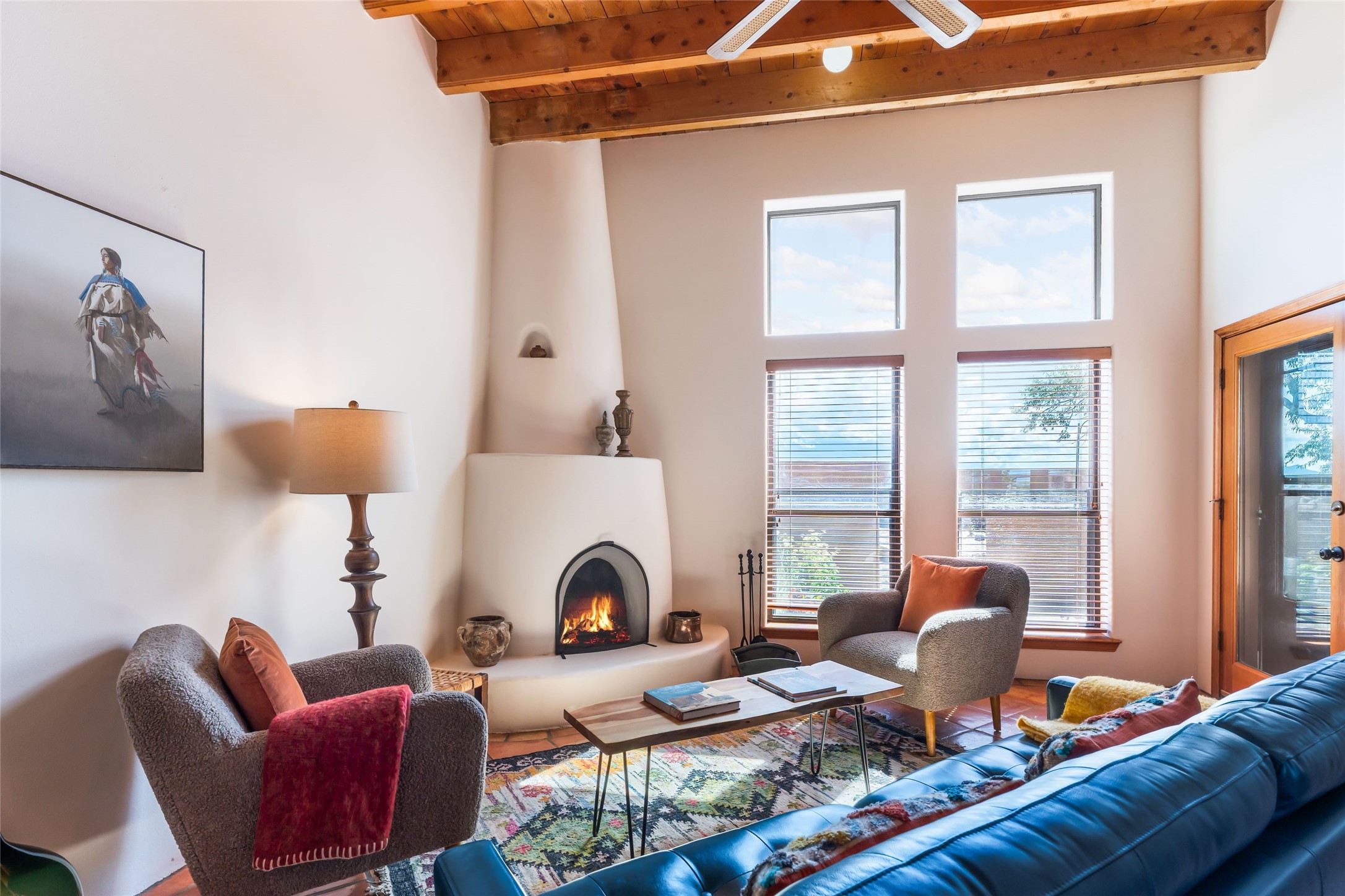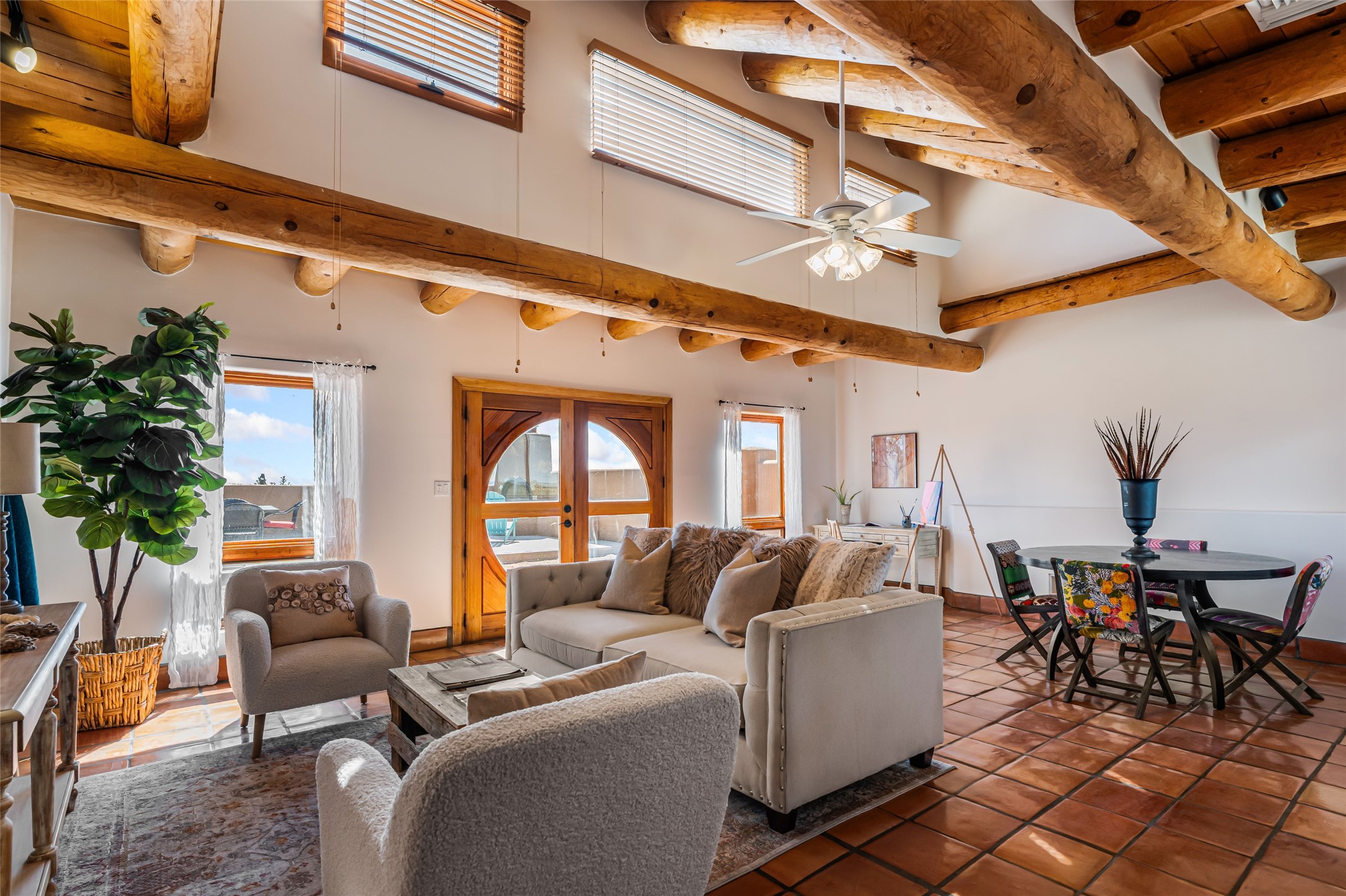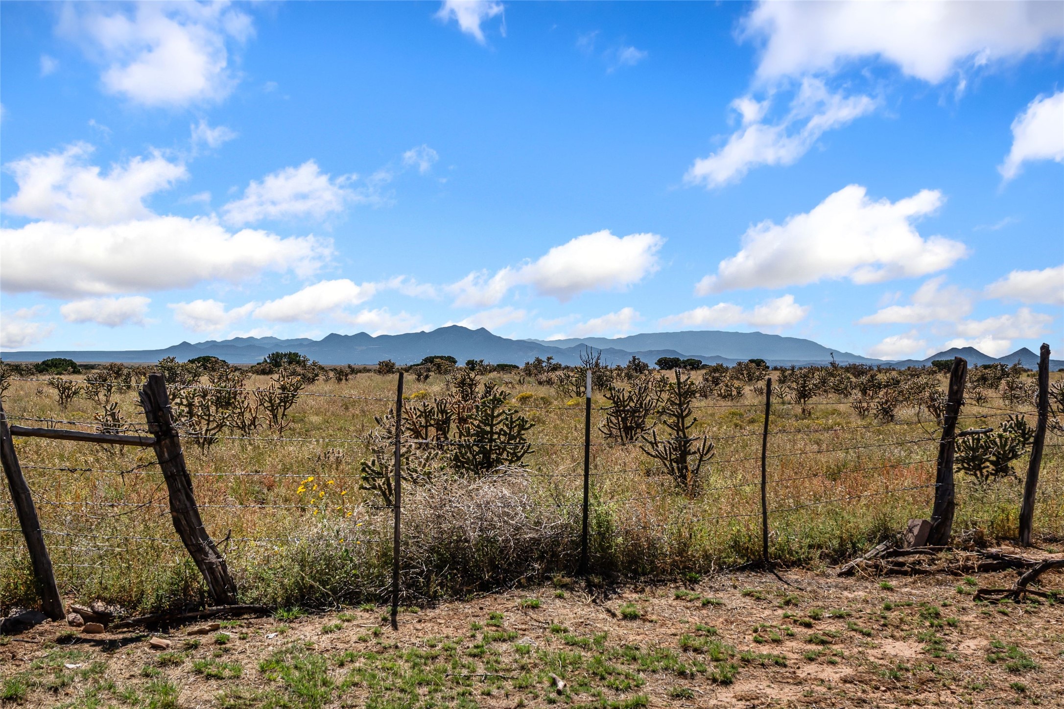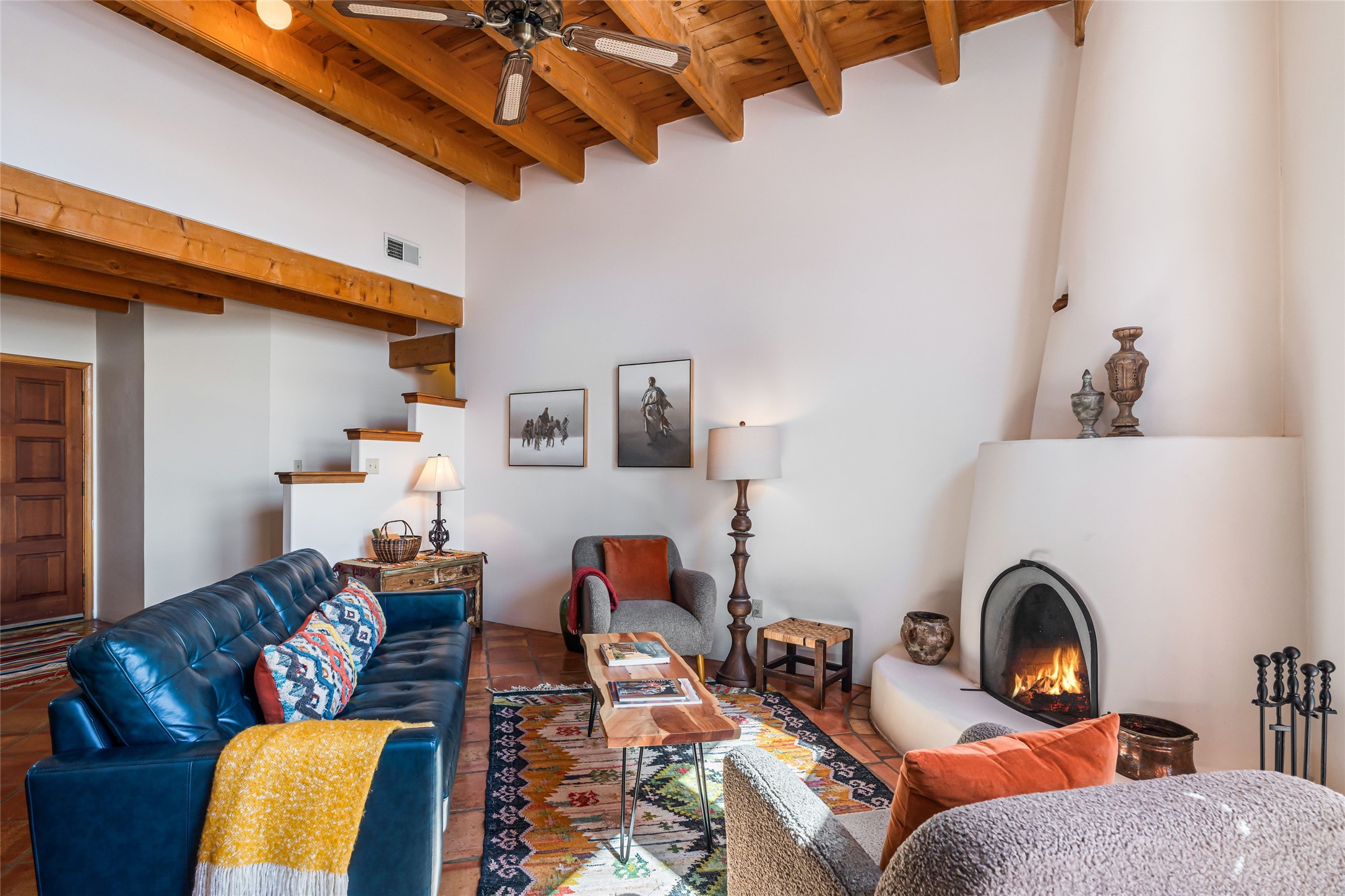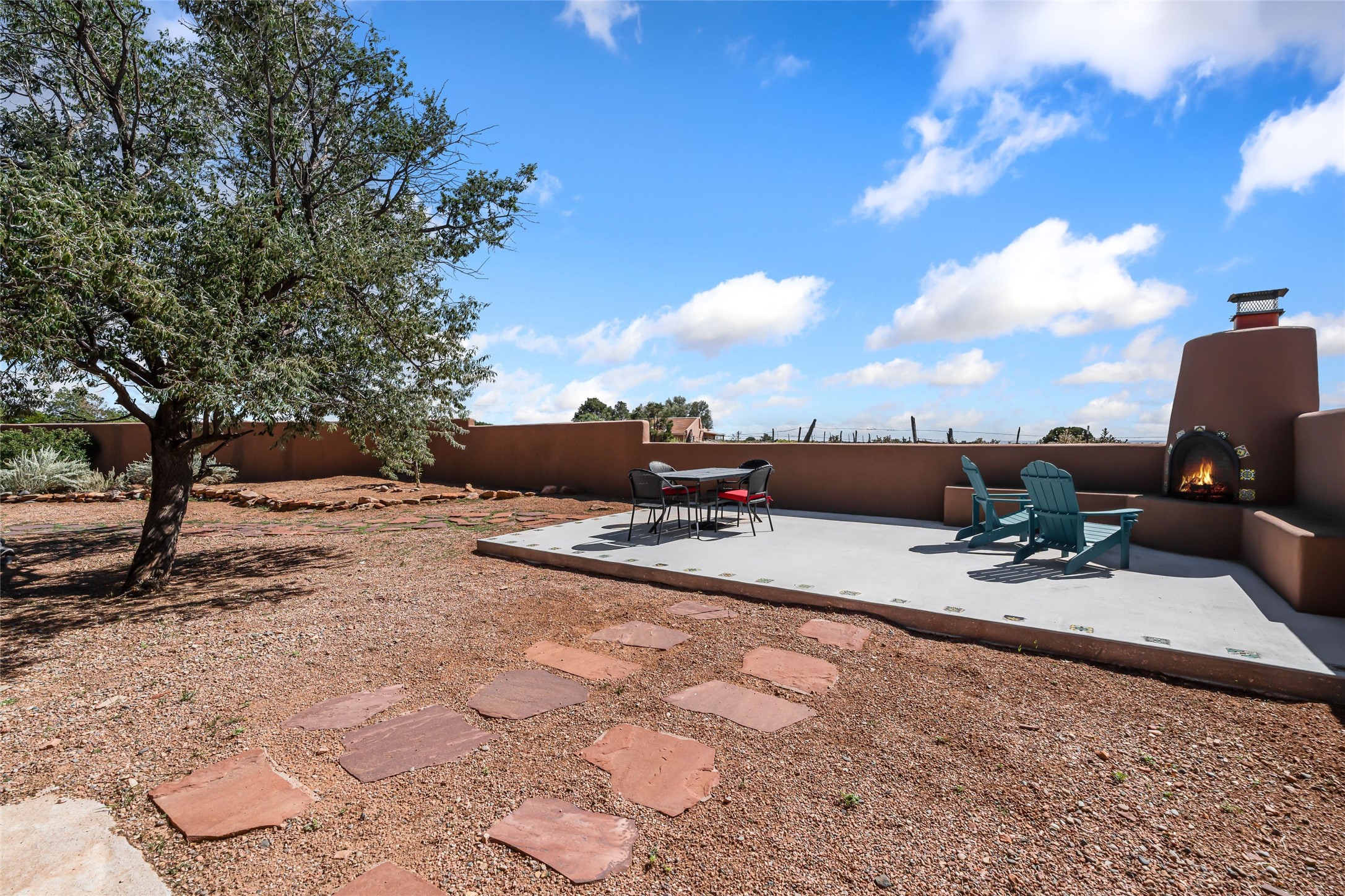 Charming Eldorado Home + Studio & Mountain Views -- Enjoy sweeping views of three mountain ranges from this light-filled Eldorado home with a versatile detached studio. Nestled on a private lot bordering ranch land, this property offers peace, privacy, and natural beauty.Inside, soaring ceilings and abundant natural light create a warm and inviting atmosphere. Traditional Southwestern touches include vigas, Saltillo tile floors, Talavera tile accents, and a cozy corner kiva fireplace in the open concept living room.The primary suite features a walk-in closet, ensuite bath, and direct patio access with a doggie door, while the secondary bedrooms enjoy mountain views, lofted ceilings and a shared bath. The spacious studio with bath and separate entry is perfect for a home office, guest suite, or creative space.Outdoor living is a dream with newly installed patios, one with a kiva fireplace, ideal for entertaining, enjoying seasonal blooms of cacti and chamisa, or stargazing under the Milky Way in its full glory above the property. The walled yard is great for pets, and raised organic garden beds with drip irrigation and fruit trees (apricot and apple) add to the charm.Energy efficiency includes an owned solar panel system, a shared well with a 1,000-gallon reservoir, keeping utility costs low year-round. Many improvements include a new washer and dryer, smart thermostat, HVAC unit, partial roof replacement, and more. A rare blend of character, functionality, and serene natural surroundings -- this is Eldorado living at its best.