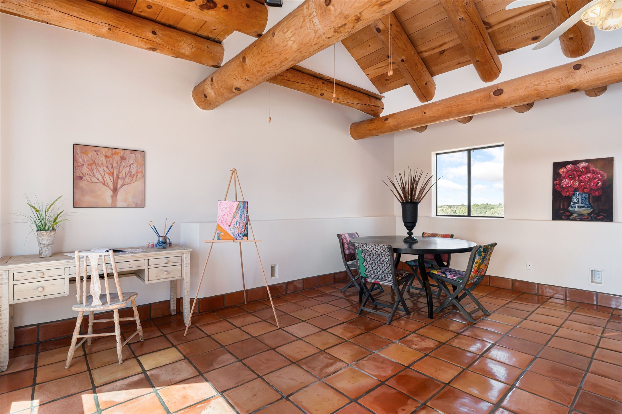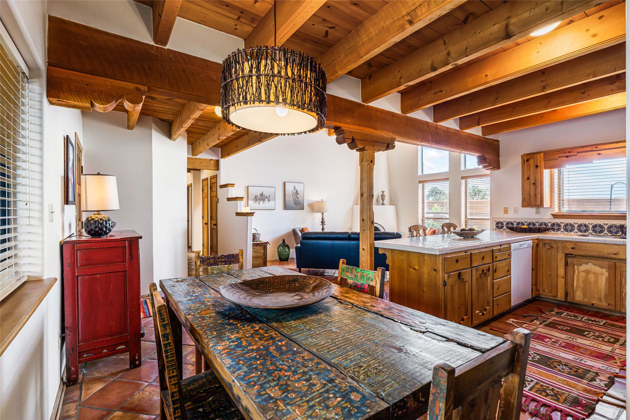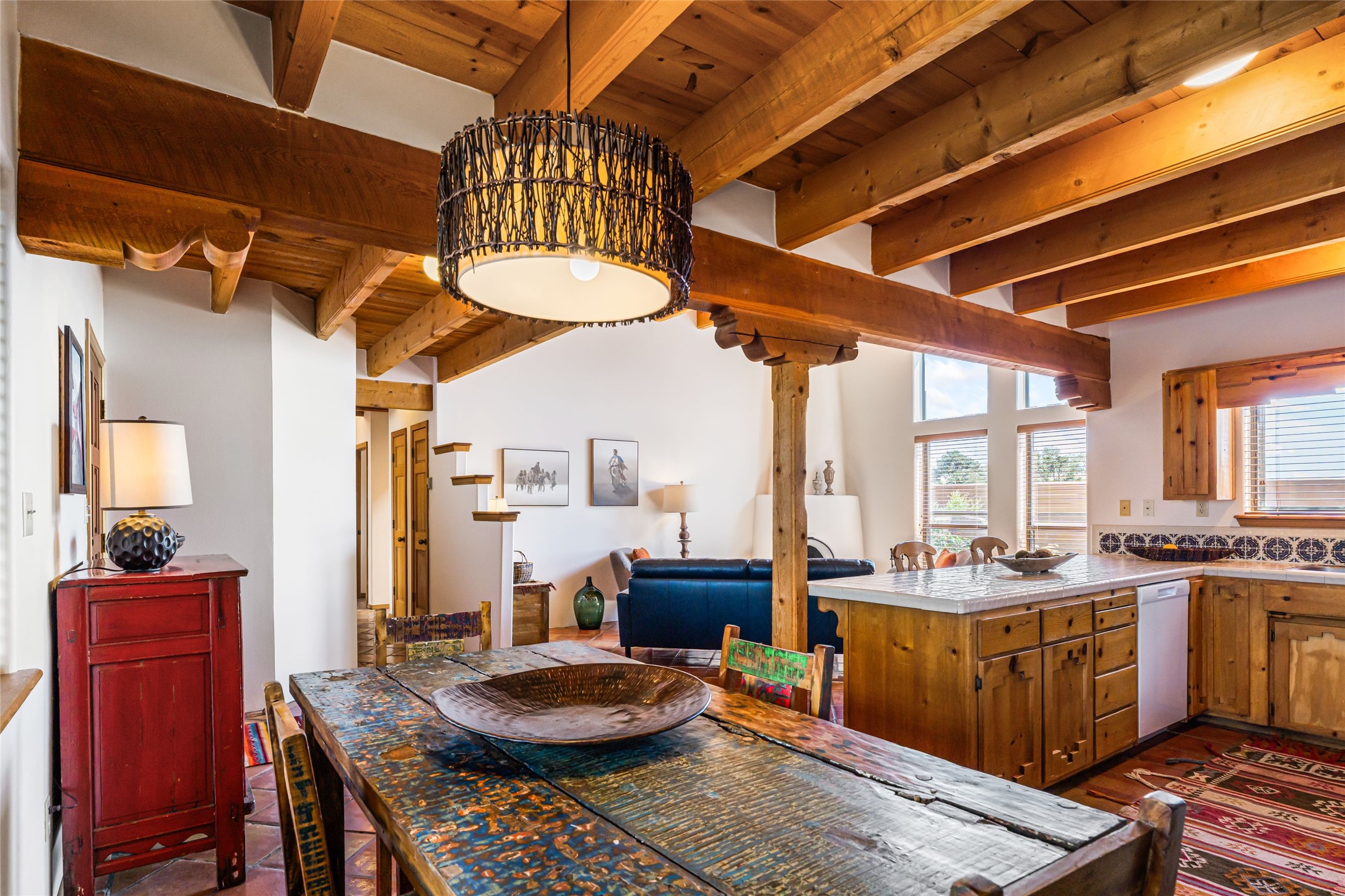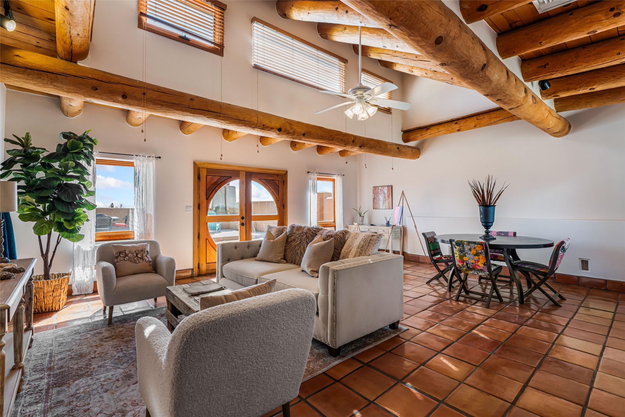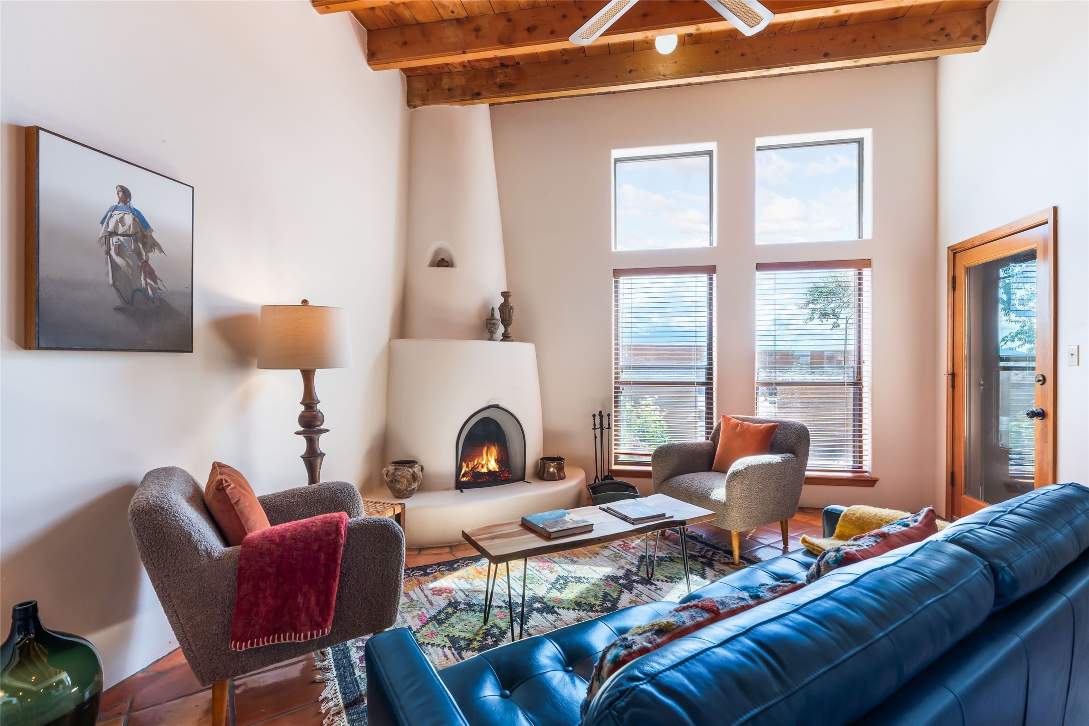 Charming Eldorado Home + Studio & Mountain Views -- Enjoy sweeping views of three mountain ranges from this light-filled Eldorado home with a versatile detached studio. Nestled on a private lot bordering ranch land, this property offers peace, privacy, and natural beauty.Inside, soaring ceilings and abundant natural light create a warm and inviting atmosphere. Traditional Southwestern touches include vigas, Saltillo tile floors, Talavera tile accents, and a cozy corner kiva fireplace in the open concept living room.The primary suite features a walk-in closet, ensuite bath, and direct patio access with a doggie door, while the secondary bedrooms enjoy mountain views, lofted ceilings and a shared bath. The spacious studio with bath and separate entry is perfect for a home office, guest suite, or creative space.Outdoor living is a dream with newly installed patios, one with a kiva fireplace, ideal for entertaining, enjoying seasonal blooms of cacti and chamisa, or stargazing under the Milky Way in its full glory above the property. The walled yard is great for pets, and raised organic garden beds with drip irrigation and fruit trees (apricot and apple) add to the charm.Energy efficiency includes an owned solar panel system, a shared well with a 1,000-gallon reservoir, keeping utility costs low year-round. Many improvements include a new washer and dryer, smart thermostat, HVAC unit, partial roof replacement, and more. A rare blend of character, functionality, and serene natural surroundings -- this is Eldorado living at its best.