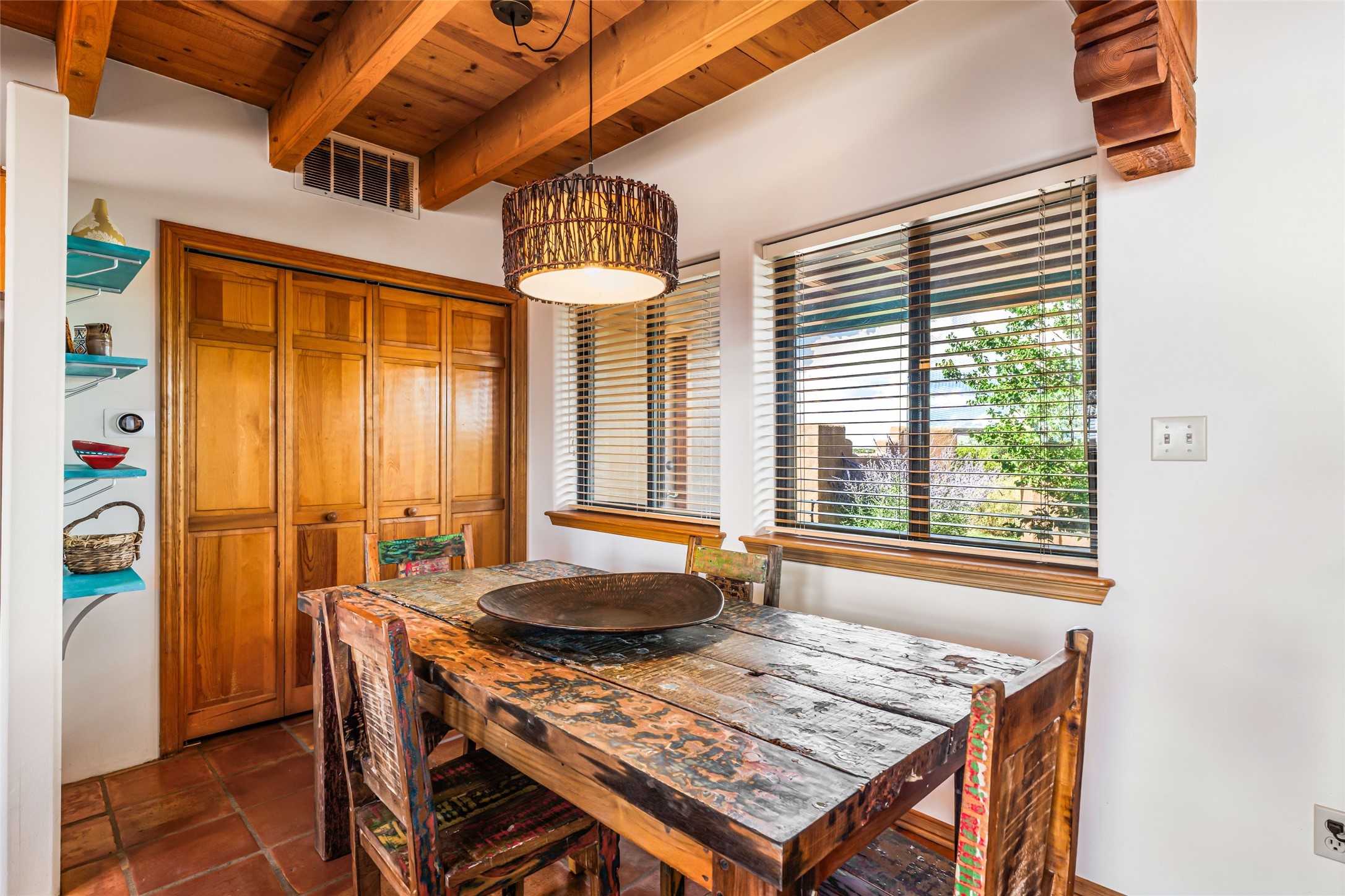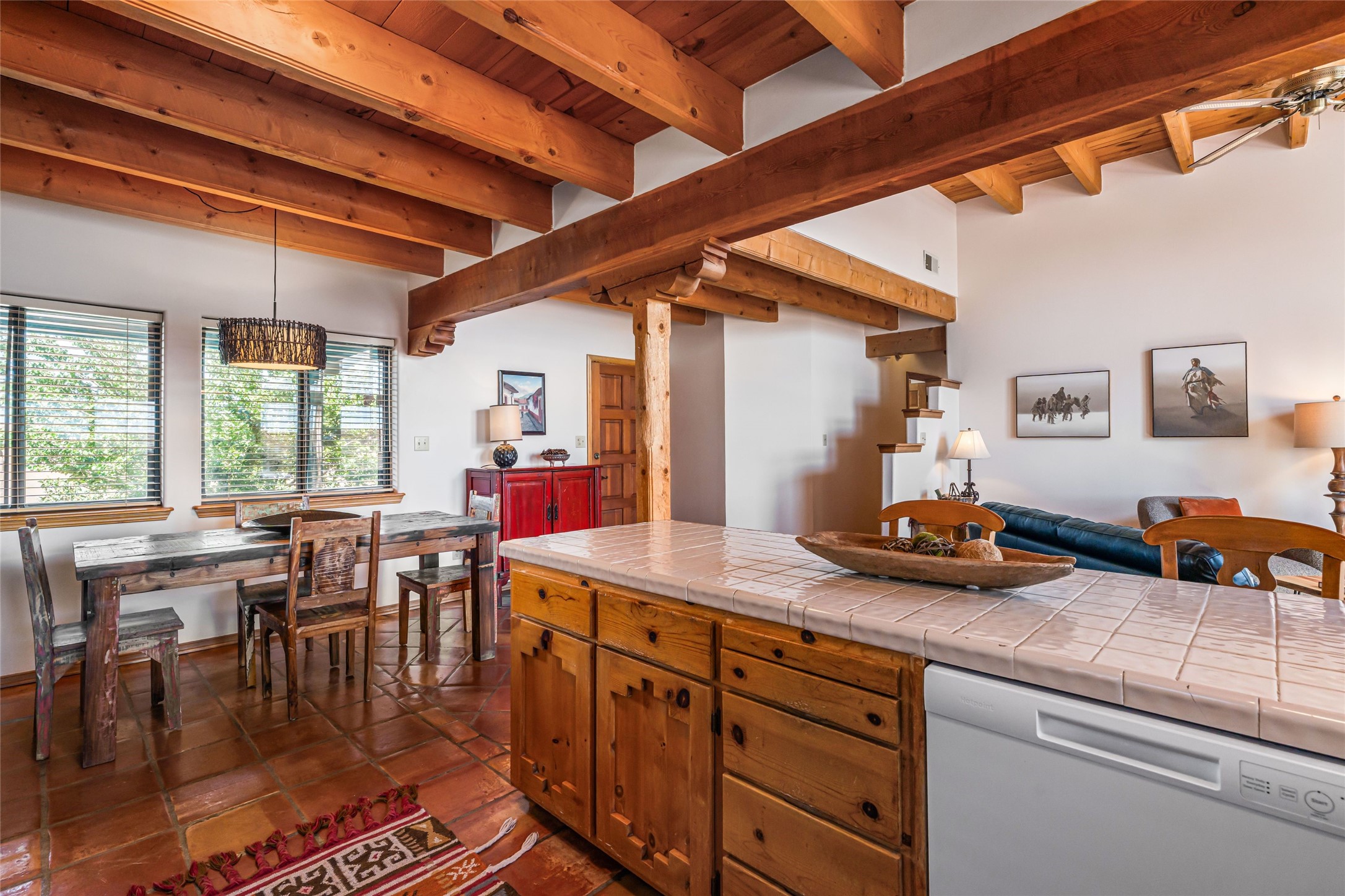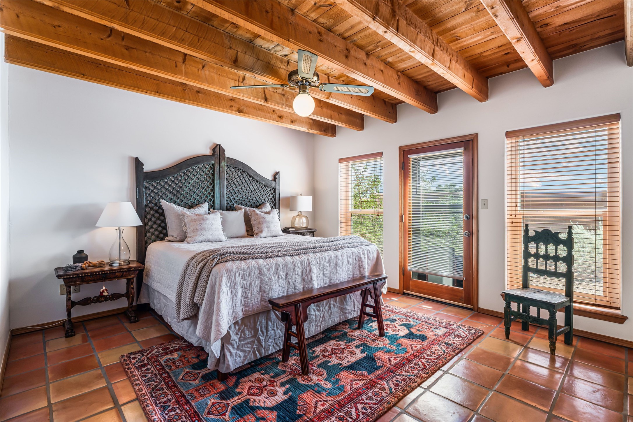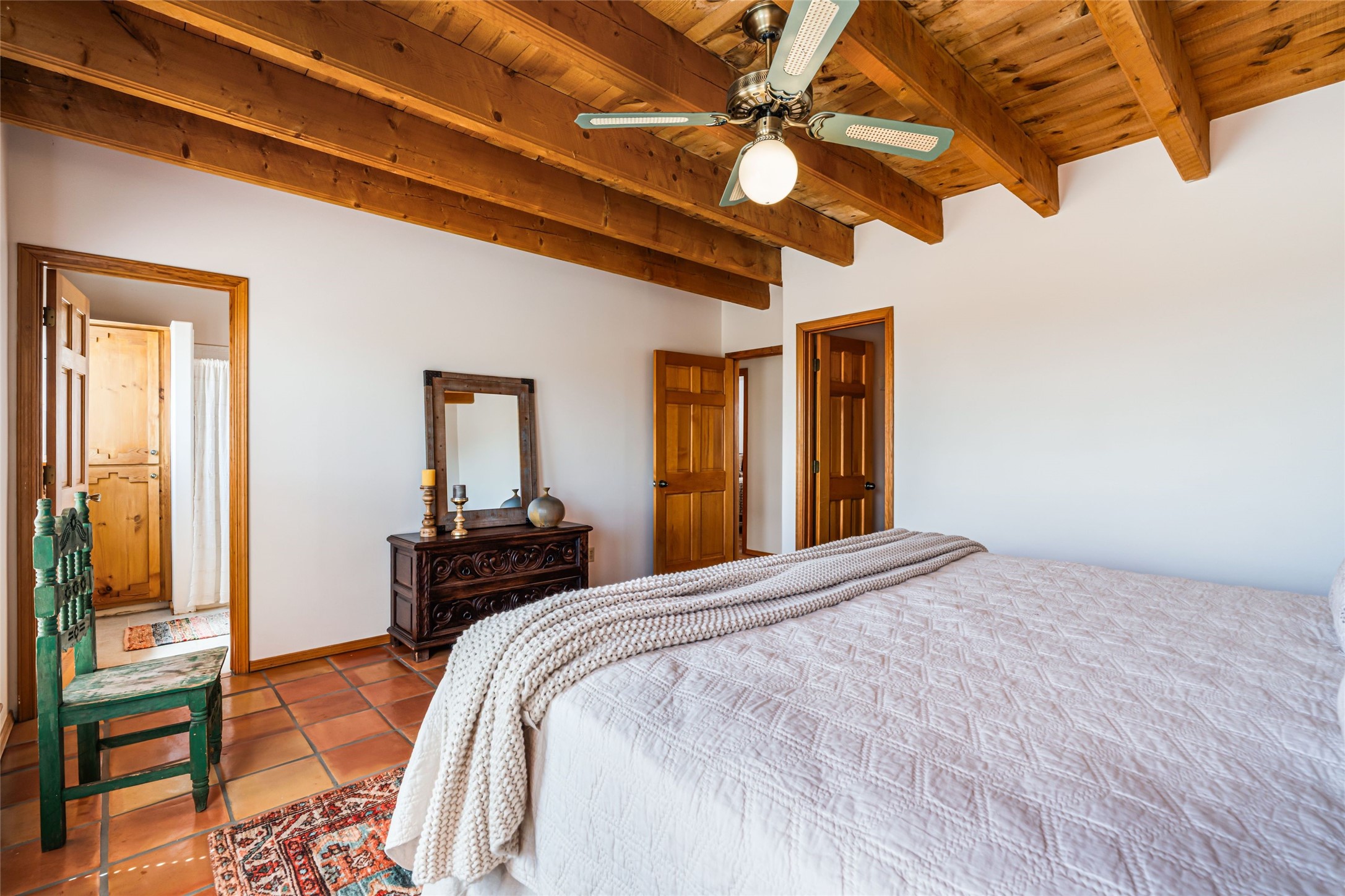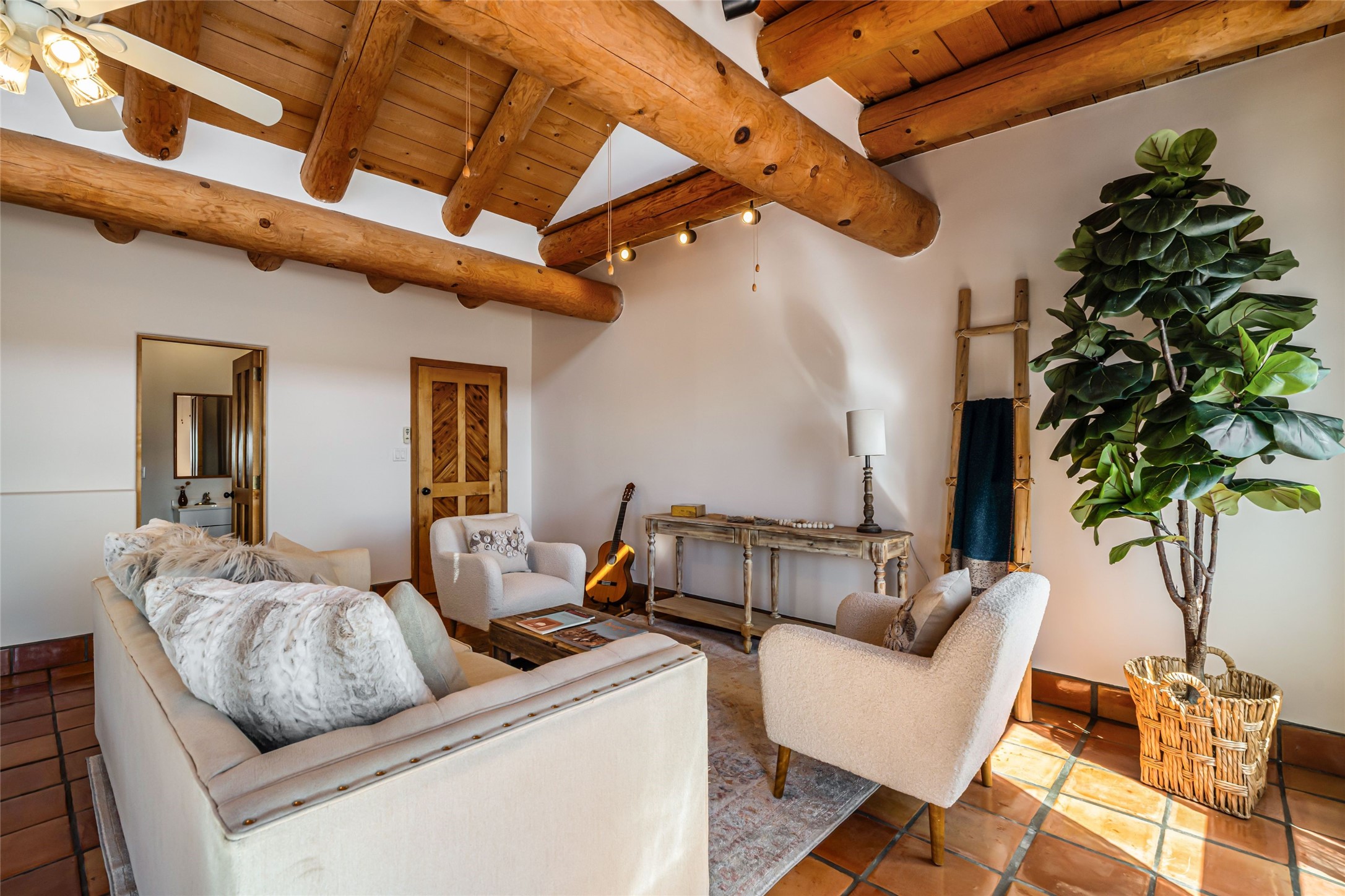 Charming Eldorado Home + Studio & Mountain Views -- Enjoy sweeping views of three mountain ranges from this light-filled Eldorado home with a versatile detached studio. Nestled on a private lot bordering ranch land, this property offers peace, privacy, and natural beauty.Inside, soaring ceilings and abundant natural light create a warm and inviting atmosphere. Traditional Southwestern touches include vigas, Saltillo tile floors, Talavera tile accents, and a cozy corner kiva fireplace in the open concept living room.The primary suite features a walk-in closet, ensuite bath, and direct patio access with a doggie door, while the secondary bedrooms enjoy mountain views, lofted ceilings and a shared bath. The spacious studio with bath and separate entry is perfect for a home office, guest suite, or creative space.Outdoor living is a dream with newly installed patios, one with a kiva fireplace, ideal for entertaining, enjoying seasonal blooms of cacti and chamisa, or stargazing under the Milky Way in its full glory above the property. The walled yard is great for pets, and raised organic garden beds with drip irrigation and fruit trees (apricot and apple) add to the charm.Energy efficiency includes an owned solar panel system, a shared well with a 1,000-gallon reservoir, keeping utility costs low year-round. Many improvements include a new washer and dryer, smart thermostat, HVAC unit, partial roof replacement, and more. A rare blend of character, functionality, and serene natural surroundings -- this is Eldorado living at its best.