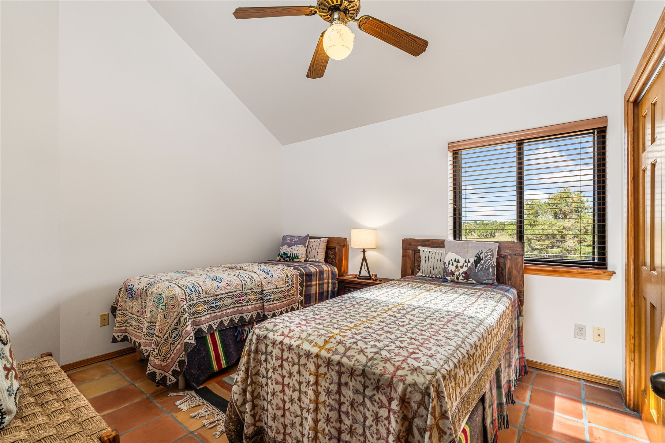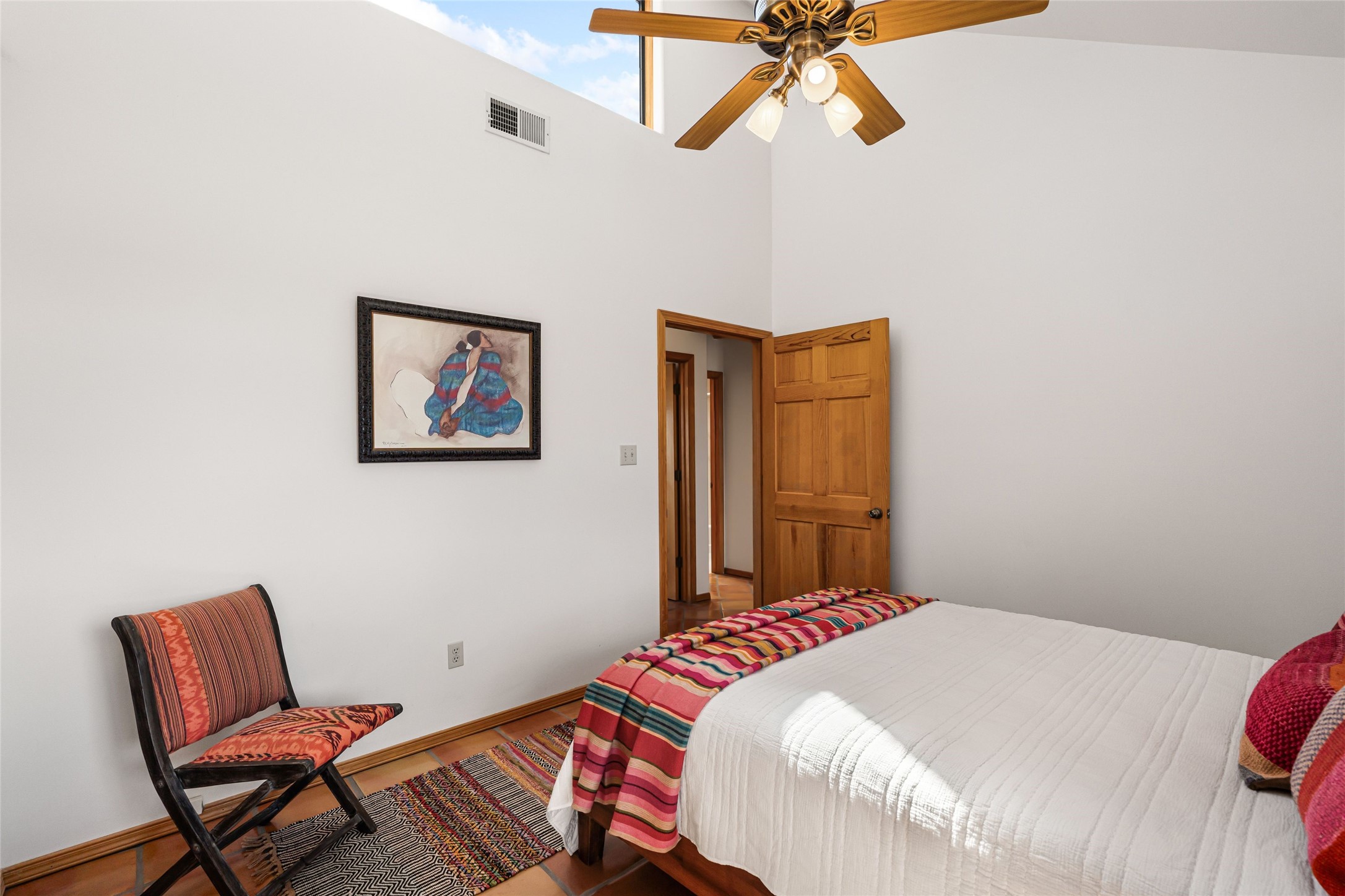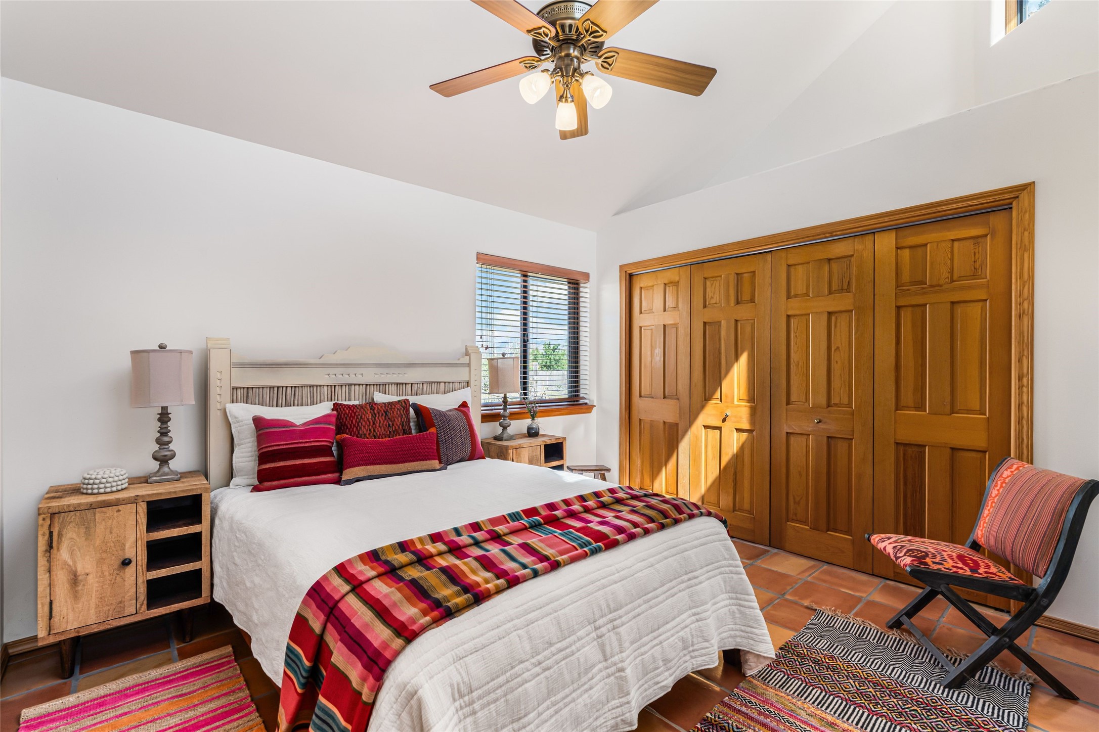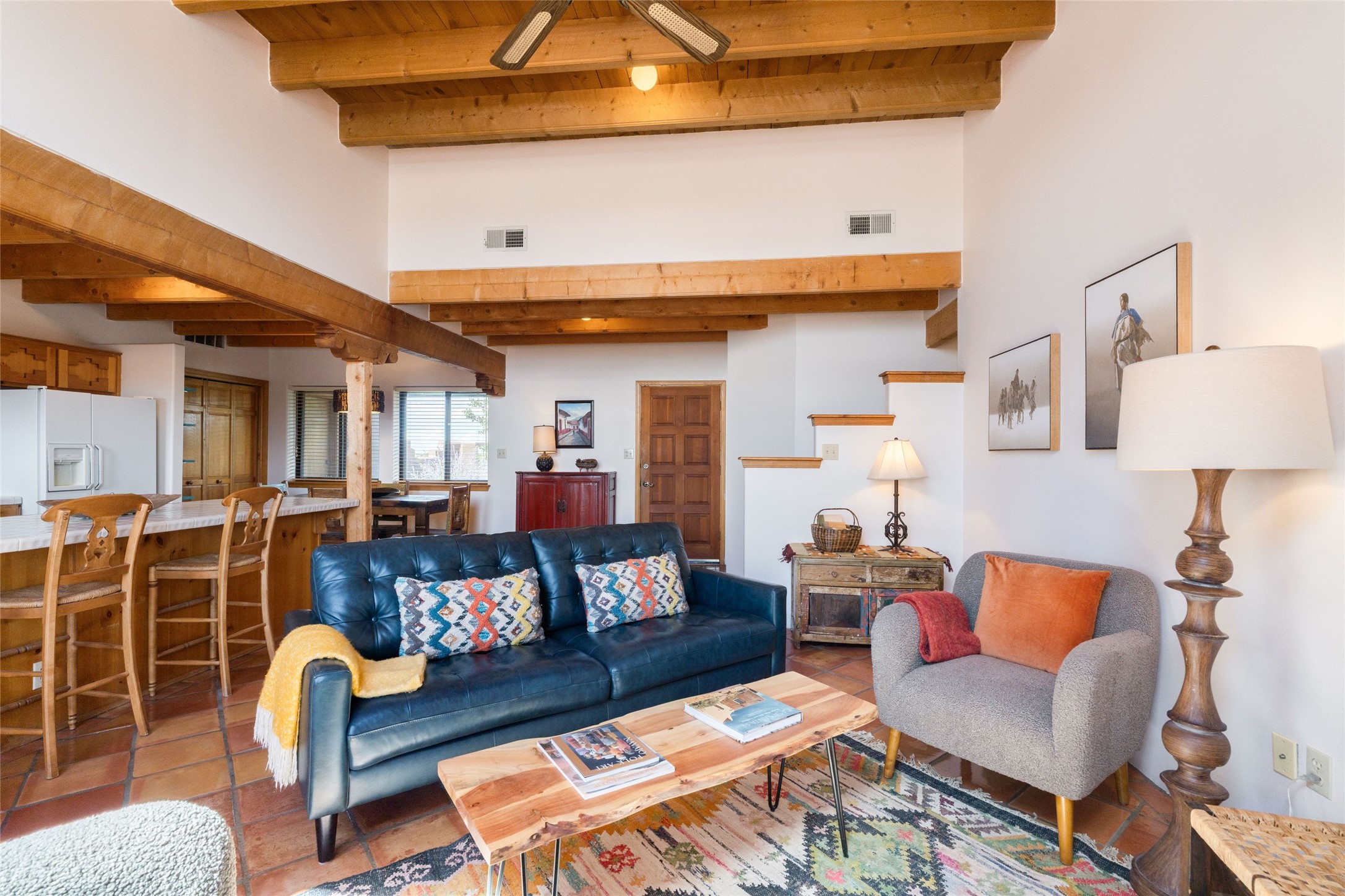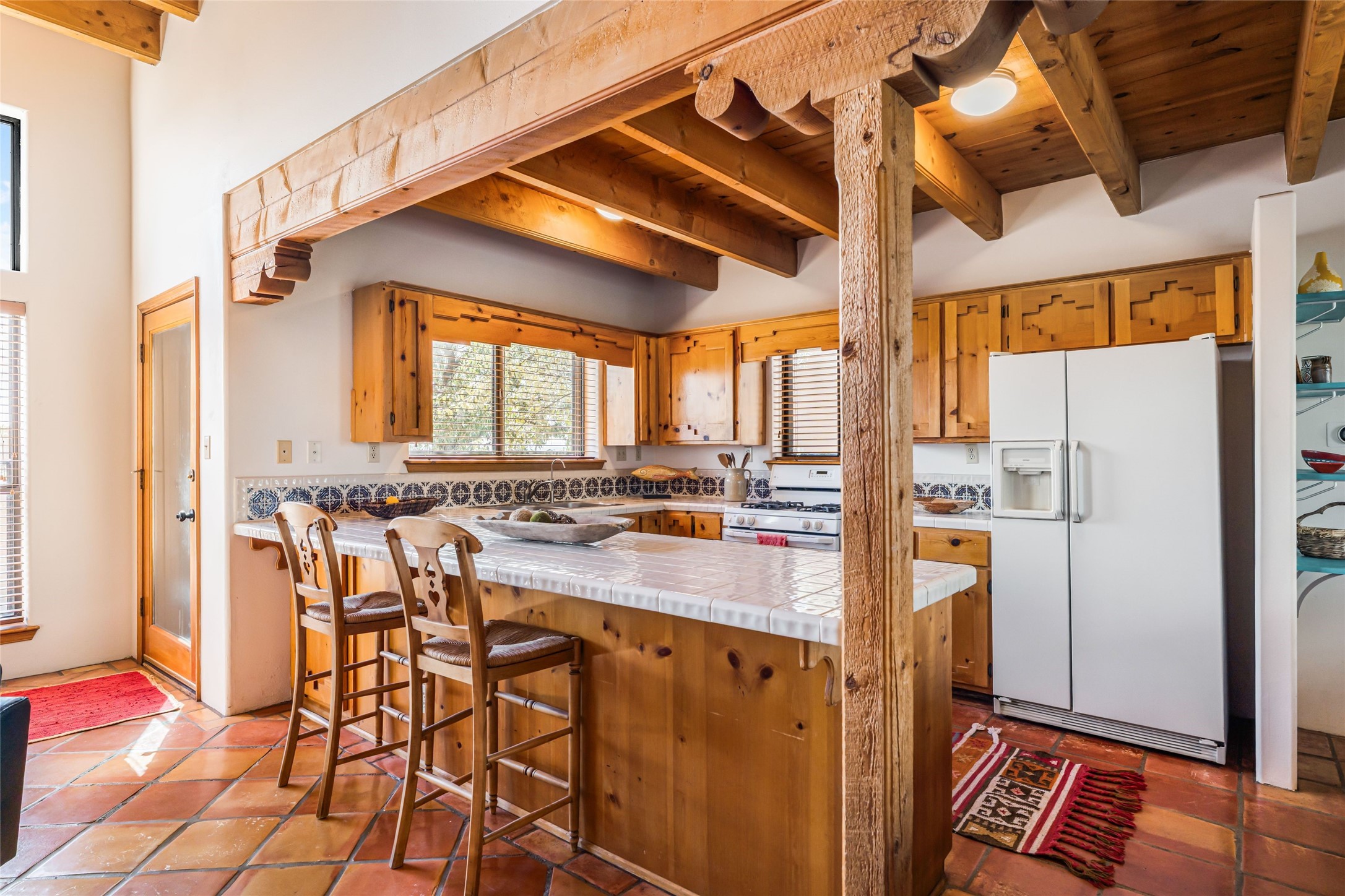 Charming Eldorado Home + Studio & Mountain Views -- Enjoy sweeping views of three mountain ranges from this light-filled Eldorado home with a versatile detached studio. Nestled on a private lot bordering ranch land, this property offers peace, privacy, and natural beauty.Inside, soaring ceilings and abundant natural light create a warm and inviting atmosphere. Traditional Southwestern touches include vigas, Saltillo tile floors, Talavera tile accents, and a cozy corner kiva fireplace in the open concept living room.The primary suite features a walk-in closet, ensuite bath, and direct patio access with a doggie door, while the secondary bedrooms enjoy mountain views, lofted ceilings and a shared bath. The spacious studio with bath and separate entry is perfect for a home office, guest suite, or creative space.Outdoor living is a dream with newly installed patios, one with a kiva fireplace, ideal for entertaining, enjoying seasonal blooms of cacti and chamisa, or stargazing under the Milky Way in its full glory above the property. The walled yard is great for pets, and raised organic garden beds with drip irrigation and fruit trees (apricot and apple) add to the charm.Energy efficiency includes an owned solar panel system, a shared well with a 1,000-gallon reservoir, keeping utility costs low year-round. Many improvements include a new washer and dryer, smart thermostat, HVAC unit, partial roof replacement, and more. A rare blend of character, functionality, and serene natural surroundings -- this is Eldorado living at its best.