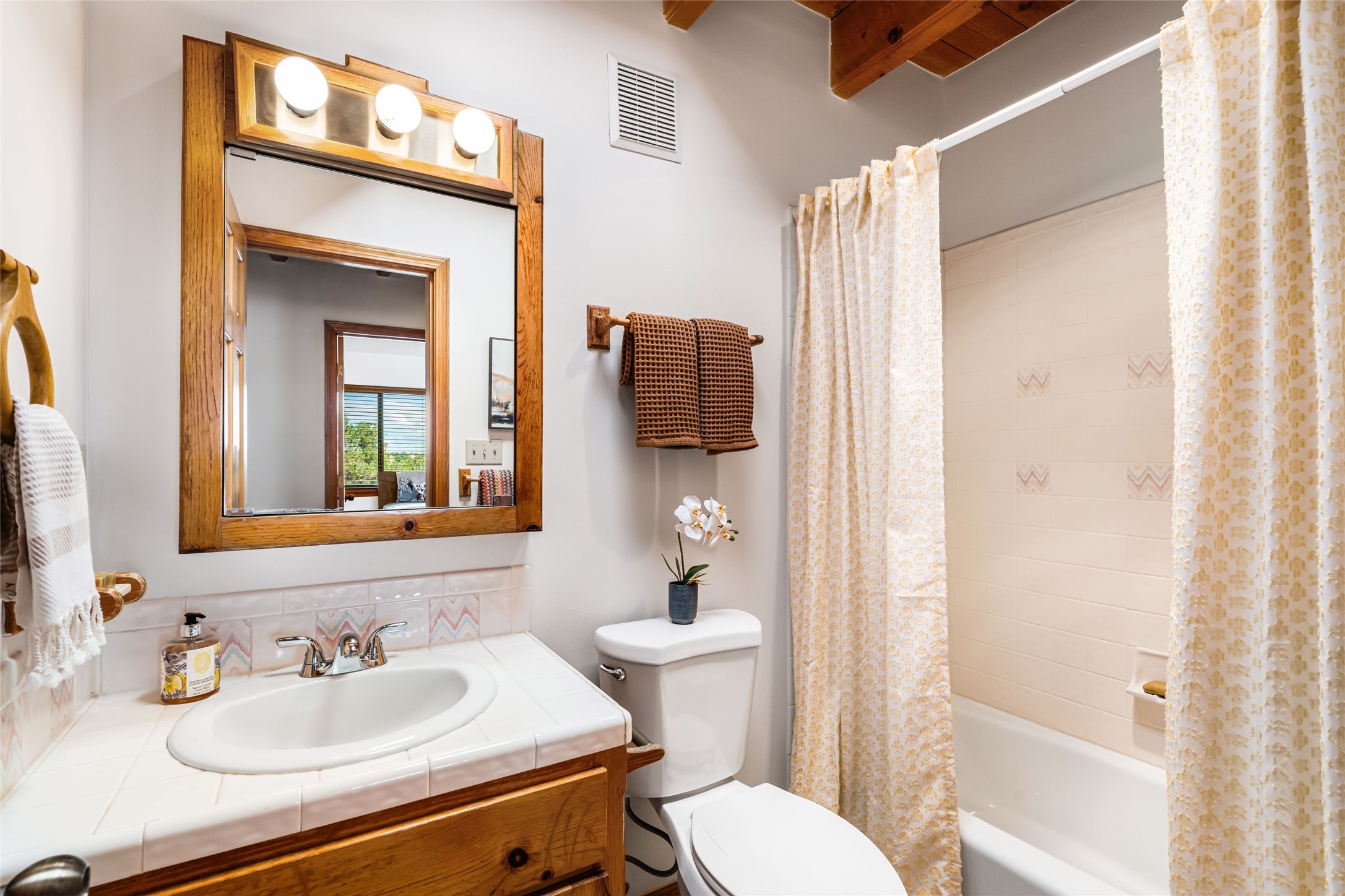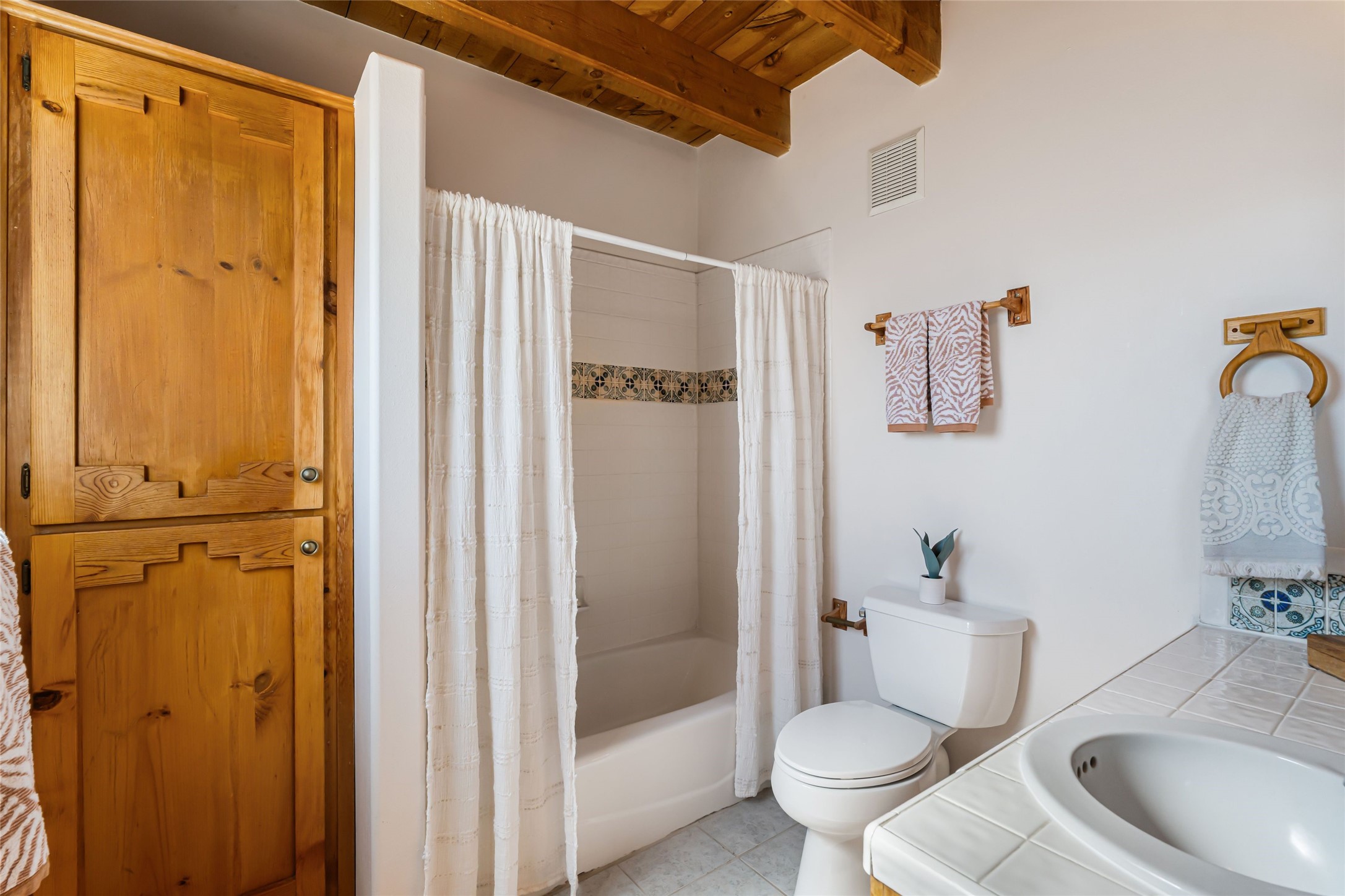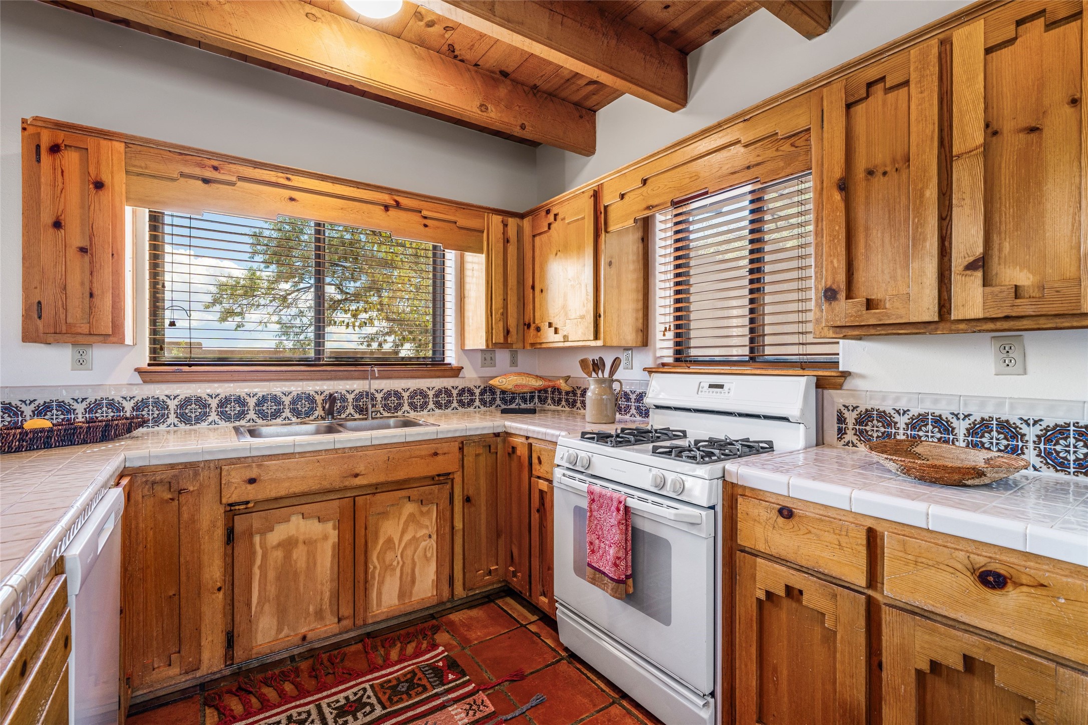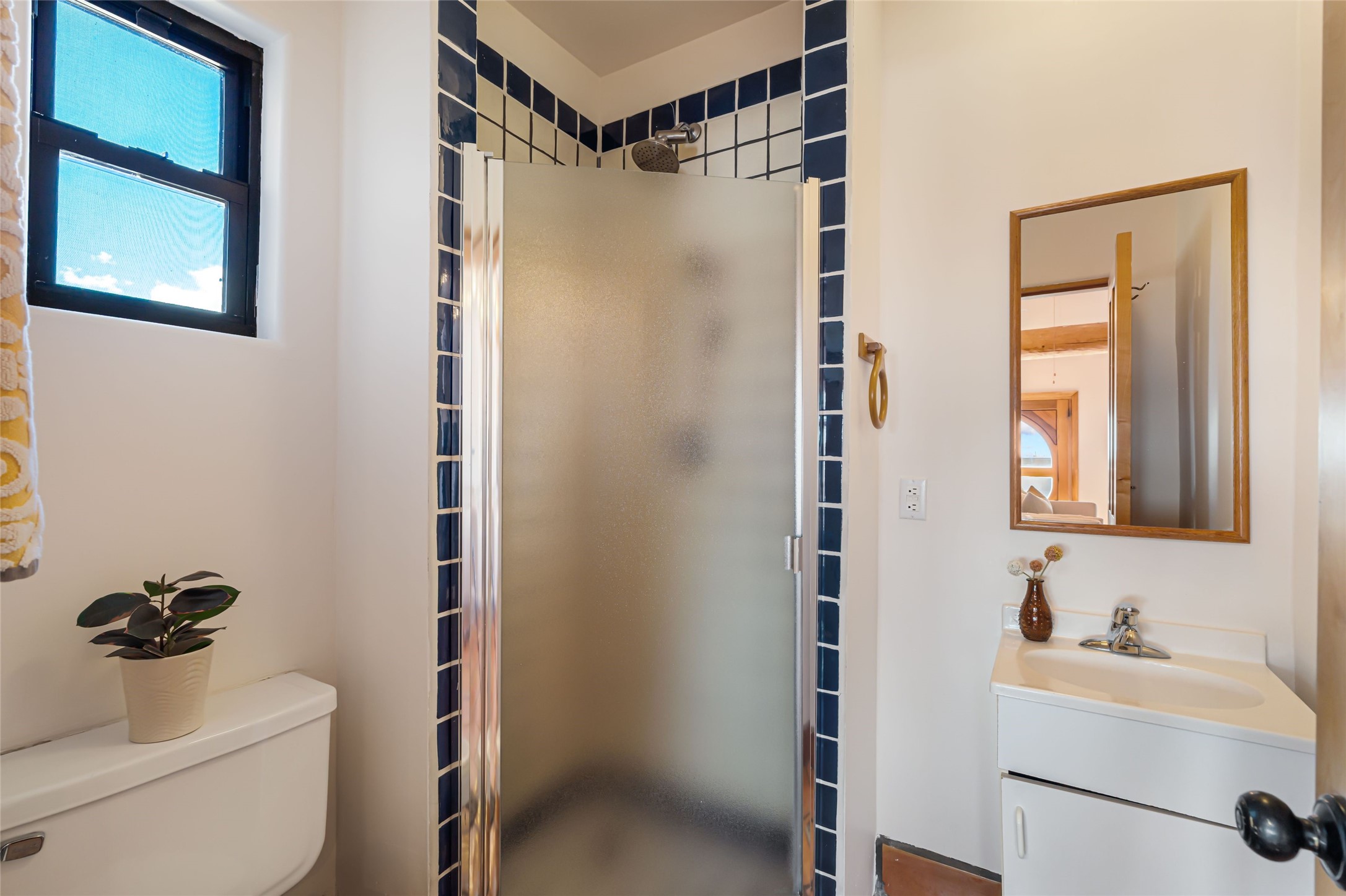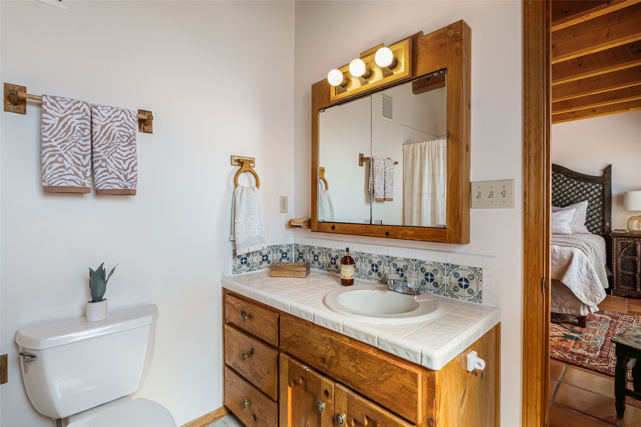 Charming Eldorado Home + Studio & Mountain Views -- Enjoy sweeping views of three mountain ranges from this light-filled Eldorado home with a versatile detached studio. Nestled on a private lot bordering ranch land, this property offers peace, privacy, and natural beauty.Inside, soaring ceilings and abundant natural light create a warm and inviting atmosphere. Traditional Southwestern touches include vigas, Saltillo tile floors, Talavera tile accents, and a cozy corner kiva fireplace in the open concept living room.The primary suite features a walk-in closet, ensuite bath, and direct patio access with a doggie door, while the secondary bedrooms enjoy mountain views, lofted ceilings and a shared bath. The spacious studio with bath and separate entry is perfect for a home office, guest suite, or creative space.Outdoor living is a dream with newly installed patios, one with a kiva fireplace, ideal for entertaining, enjoying seasonal blooms of cacti and chamisa, or stargazing under the Milky Way in its full glory above the property. The walled yard is great for pets, and raised organic garden beds with drip irrigation and fruit trees (apricot and apple) add to the charm.Energy efficiency includes an owned solar panel system, a shared well with a 1,000-gallon reservoir, keeping utility costs low year-round. Many improvements include a new washer and dryer, smart thermostat, HVAC unit, partial roof replacement, and more. A rare blend of character, functionality, and serene natural surroundings -- this is Eldorado living at its best.