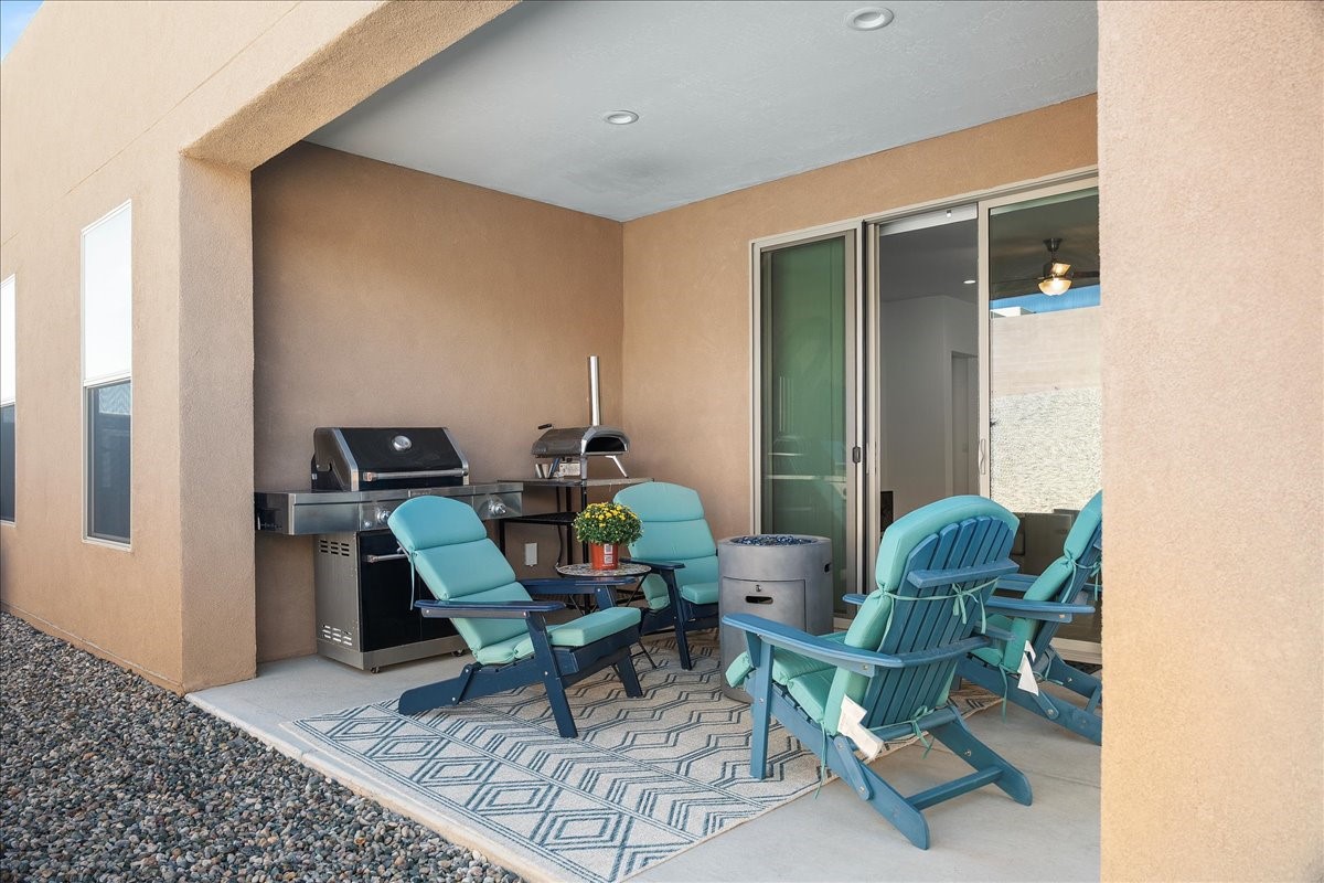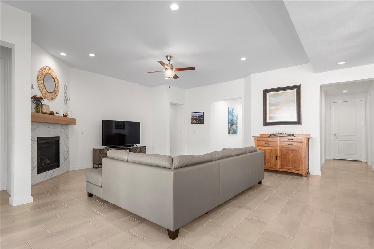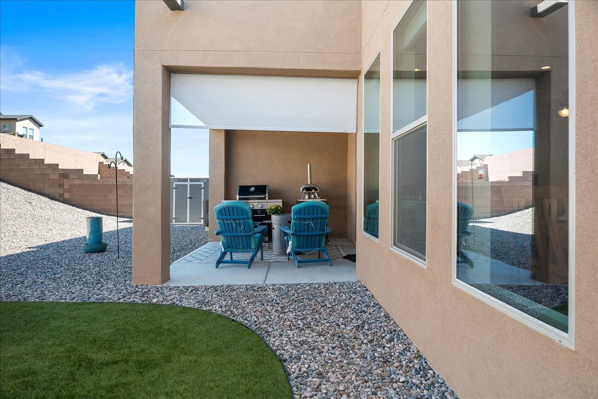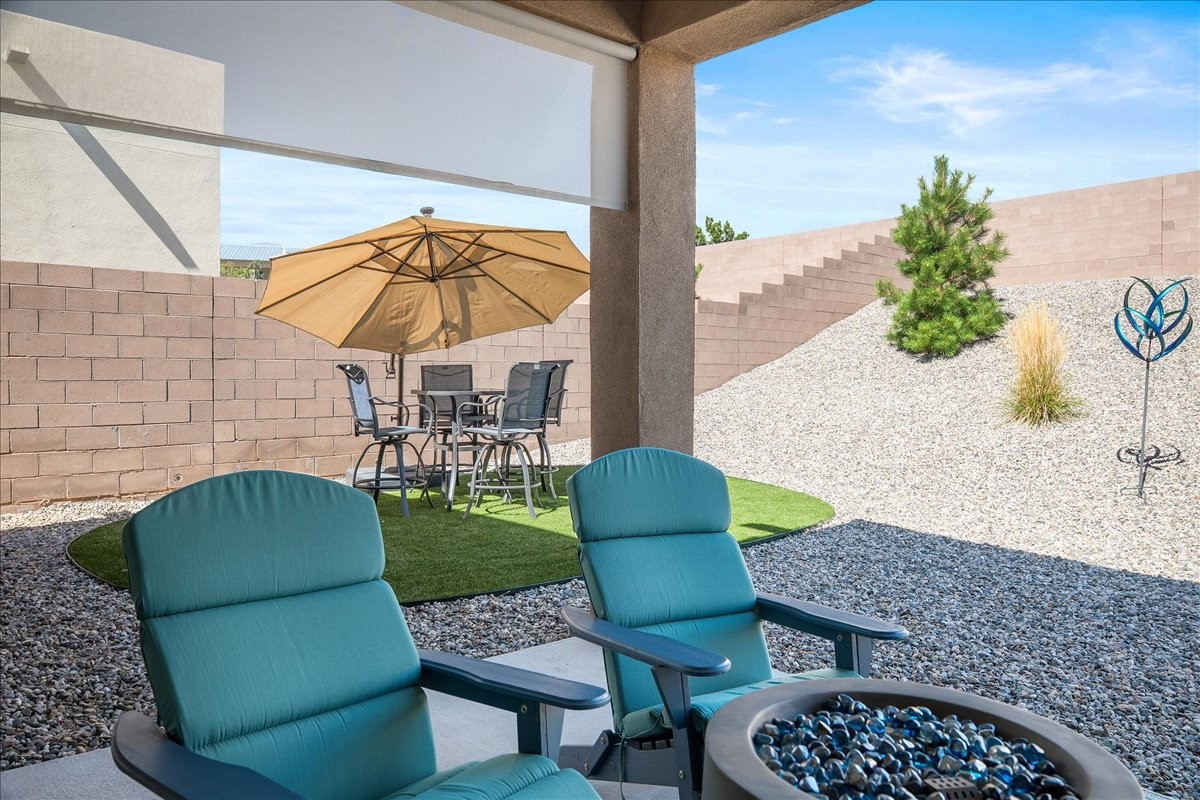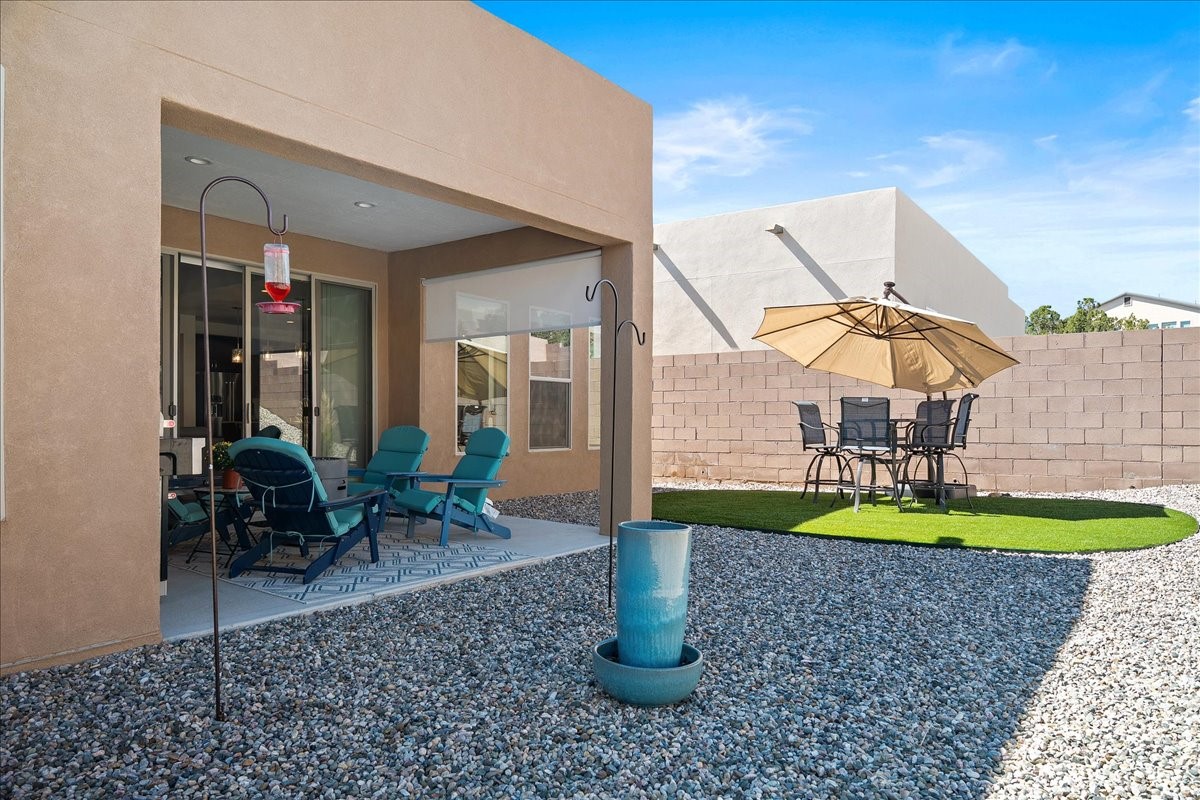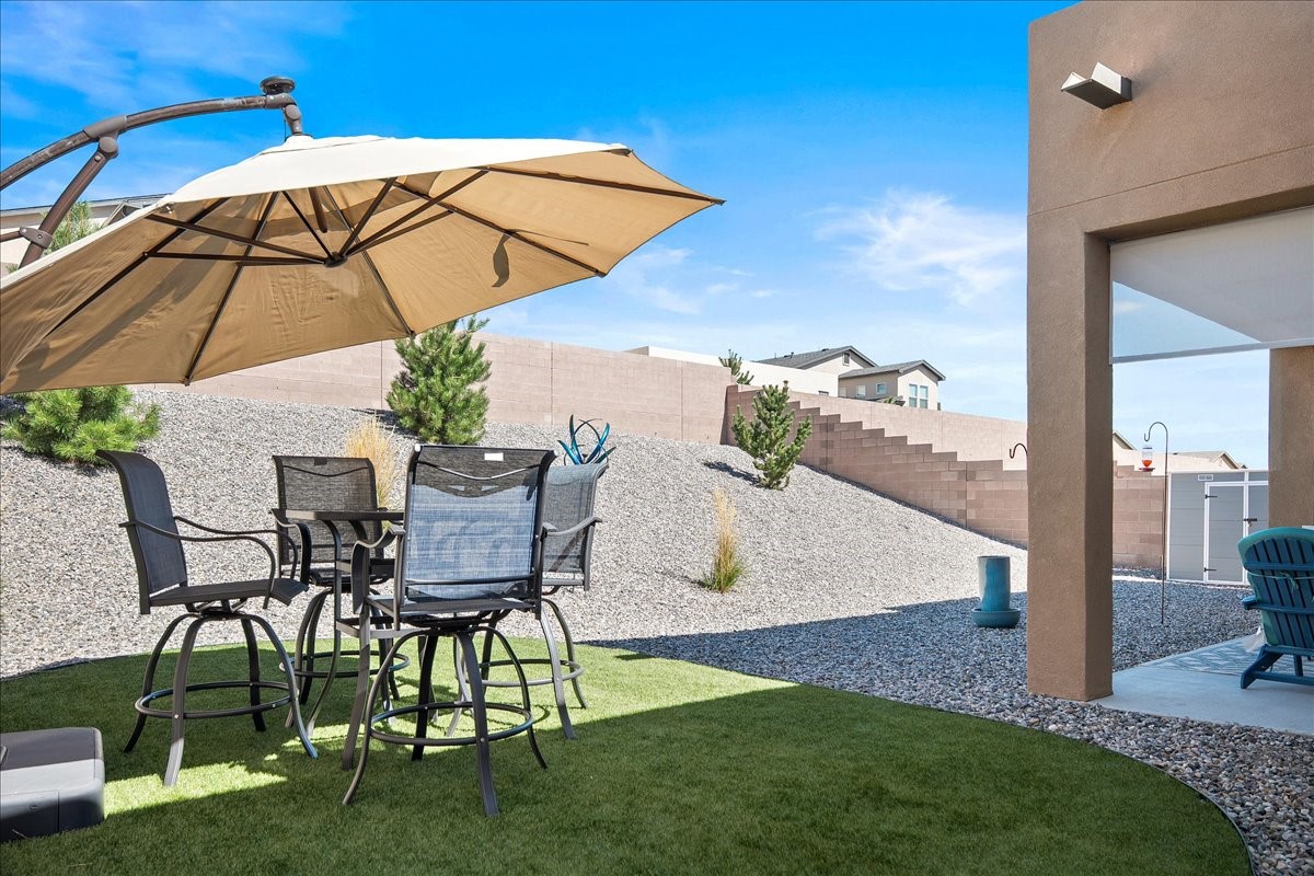 Welcome to this bright and beautiful home, just minutes from LANL. Built in 2021 and move-in ready, it features $35,000 in thoughtful builder upgrades, modern finishes, and a functional layout perfect for today's lifestyle. The open-concept design is filled with natural light and includes a stylish kitchen with granite countertops, stainless steel appliances, 42-inch cabinetry, decorative backsplash, pantry, and a large island. The dining and living areas flow seamlessly together, anchored by a cozy gas fireplace. The primary suite offers a spacious retreat with dual vanities, a walk-in shower, a tub, and a large walk-in closet. Additional bedrooms and a dedicated office with French doors provide flexibility for guests, work, or hobbies. Enjoy outdoor living in the fenced backyard, complete with a covered patio, and low-maintenance landscaping with automatic sprinkler system. Garage storage system conveys with property. With a transferable builder warranty and a location close to schools, parks, shopping, and dining, this home is ready for you to move right in. Schedule your showing today!