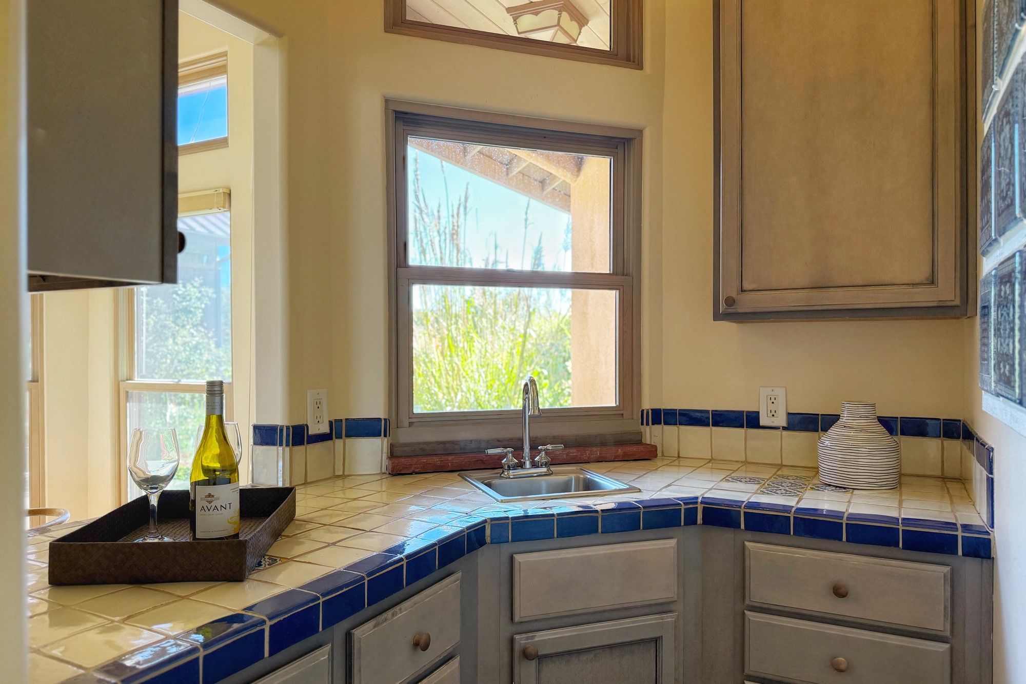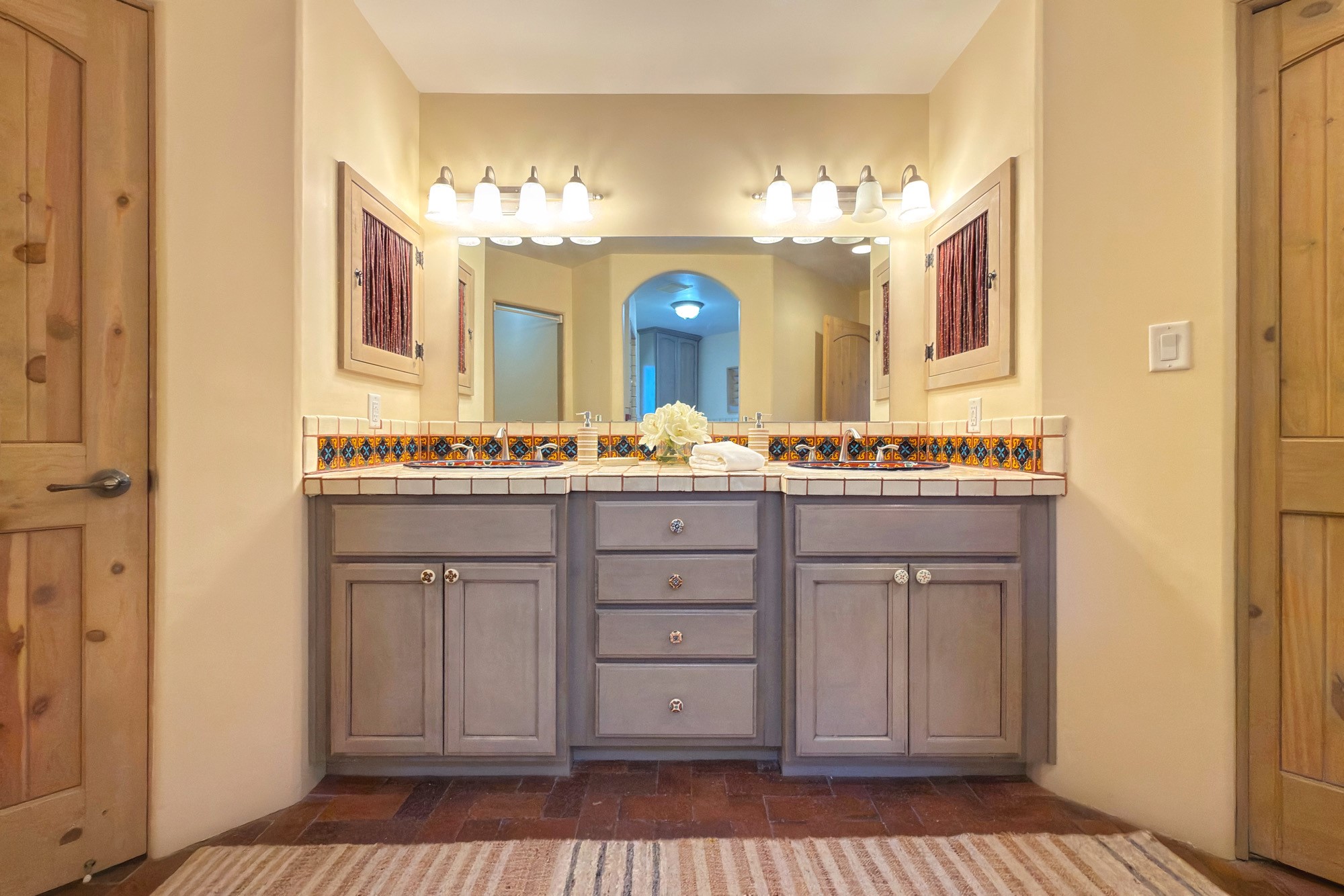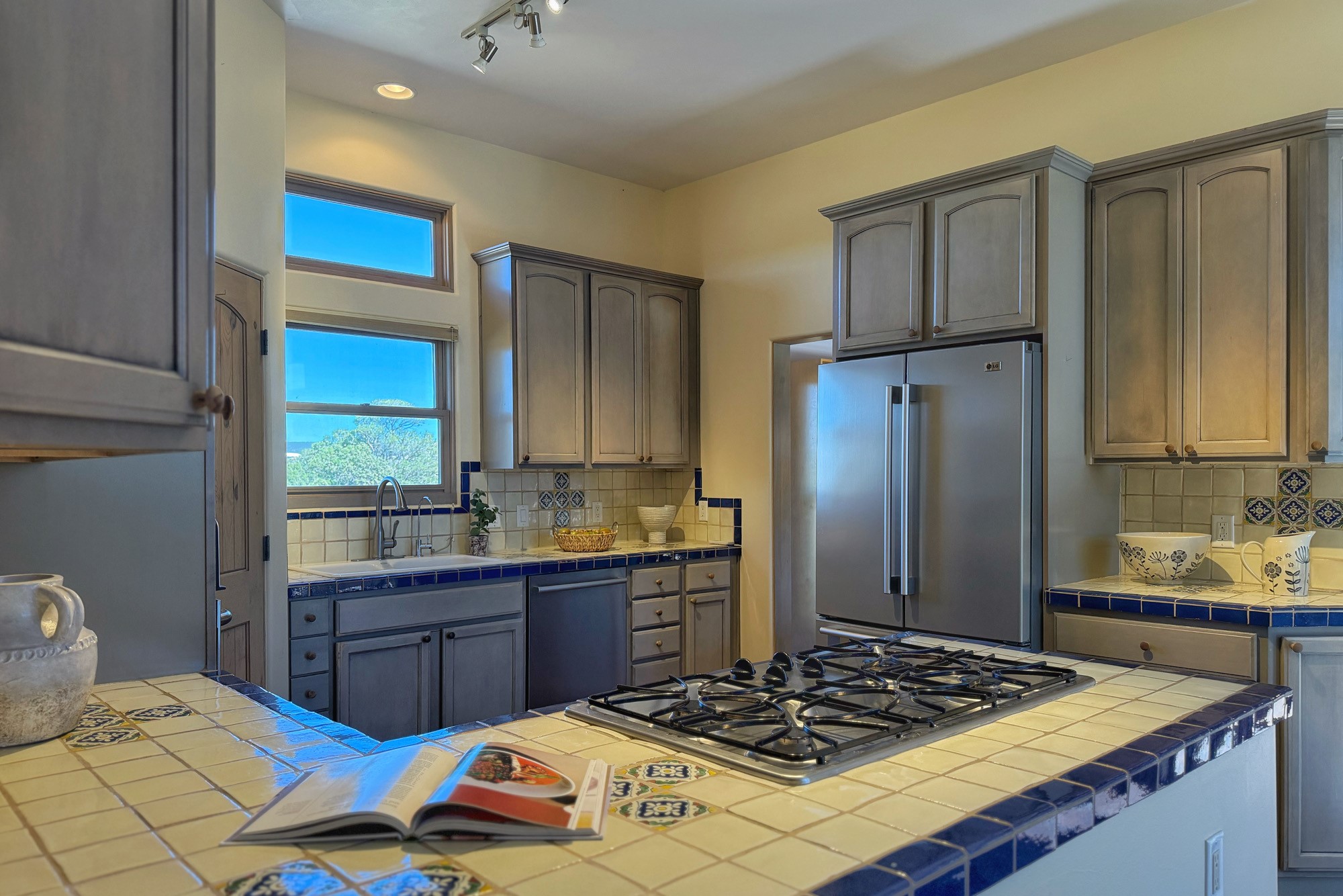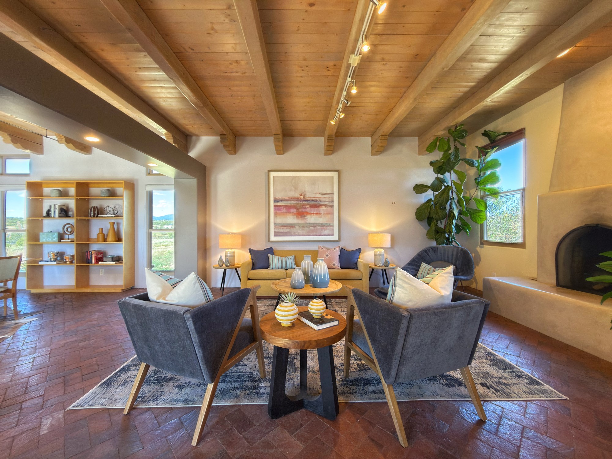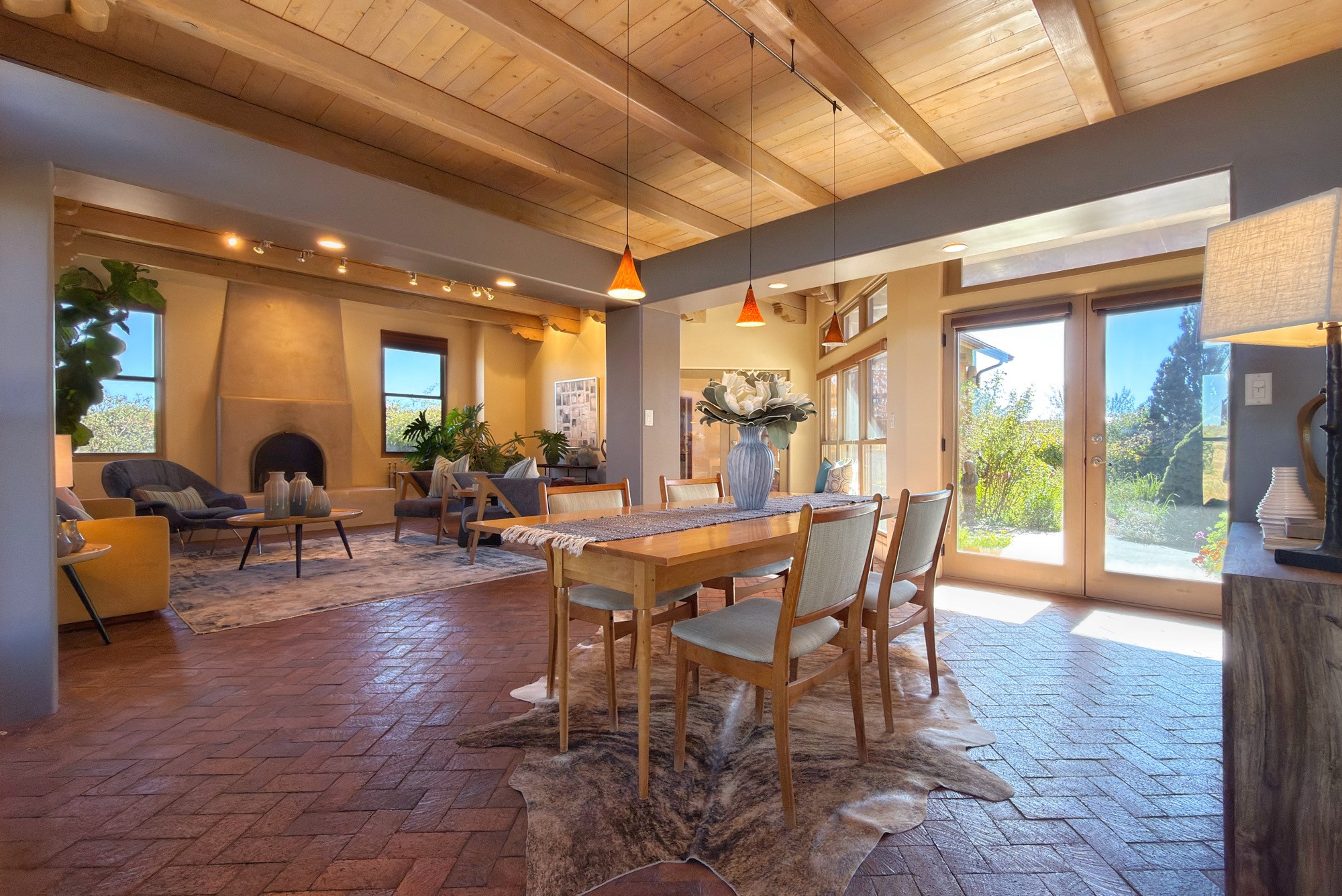 This single-level home, built in 2005, offers the perfect blend of traditional Northern New Mexico architecture and modern comforts. Set on 1.44+/- acres with adjoining open space in the subdivision, the property welcomes you with lush, mature gardens and a beautiful entryway, framed by mountain views and proximity to equestrian facilities. Spanning approximately 2,272 sq. ft. the home features 3 bedrooms and 2 full baths. The spacious living room boasts high ceilings with wooden beams and corbels, a kiva fireplace, and brick floors that extend throughout. The kitchen includes stainless steel appliances, a walk-in pantry, custom cabinets, Mexican tile accents, and an eat-in breakfast nook. The primary suite is a private retreat with a generous walk-in closet and a large bathroom featuring double sinks, a jetted tub, and a separate shower. Two thoughtfully positioned guest bedrooms share a full bath with double sinks. Additional highlights include in-floor radiant heat, split units for supplemental heating and cooling and a two-car garage that offers a built-in workbench, custom cabinetry, and attic storage. Ideally located just minutes from Eldorado, this home is close to shopping, restaurants, gyms, banks, a post office, hardware stores, and pet services.