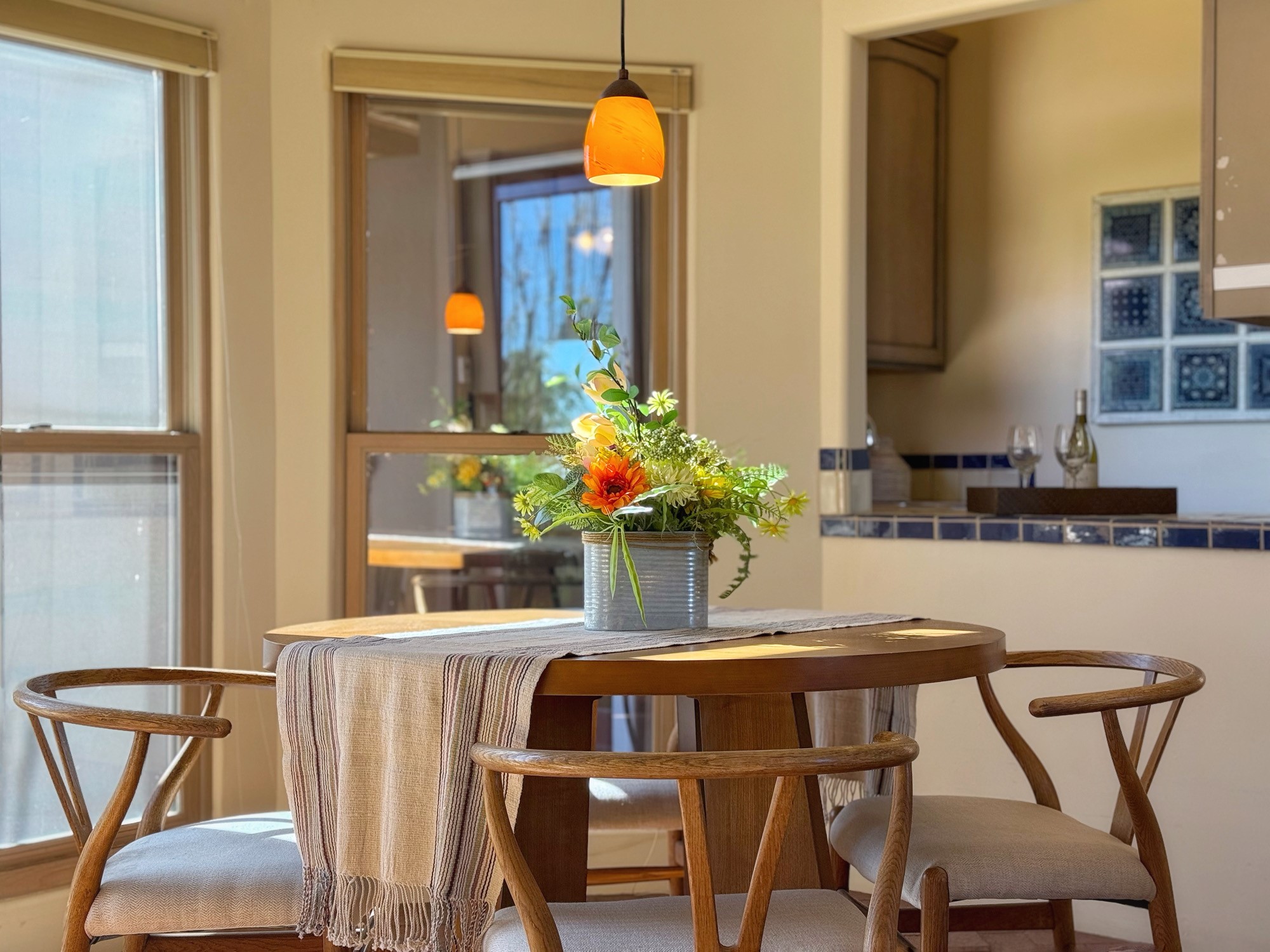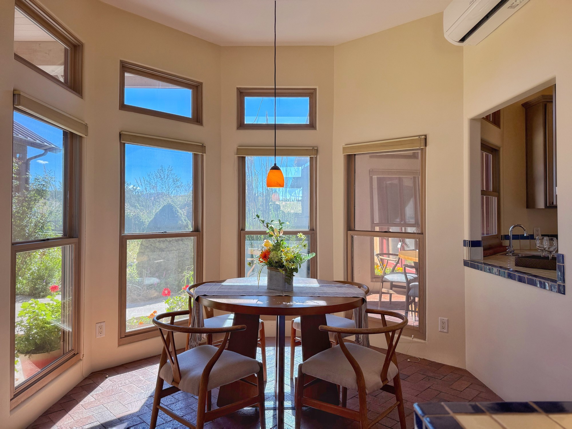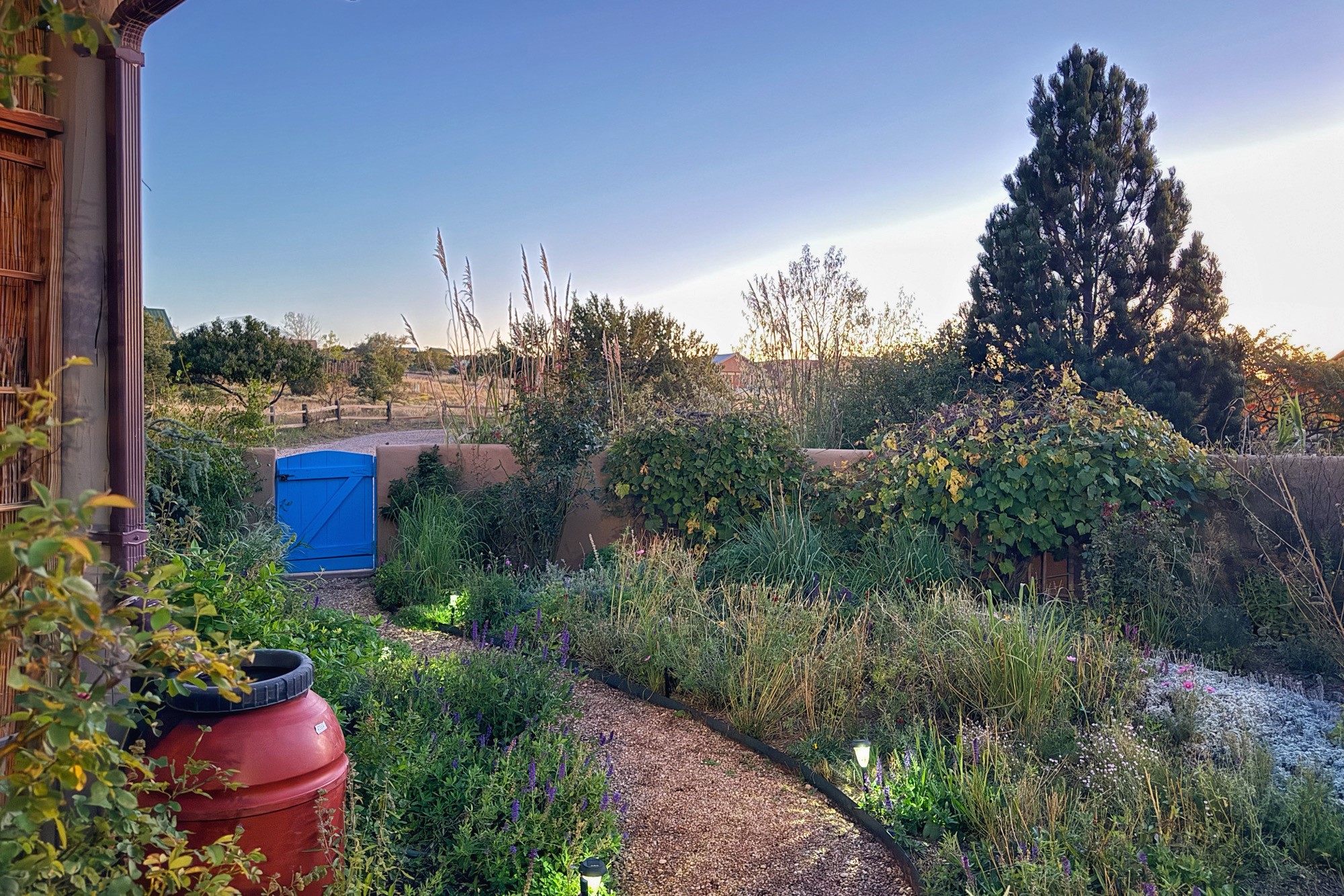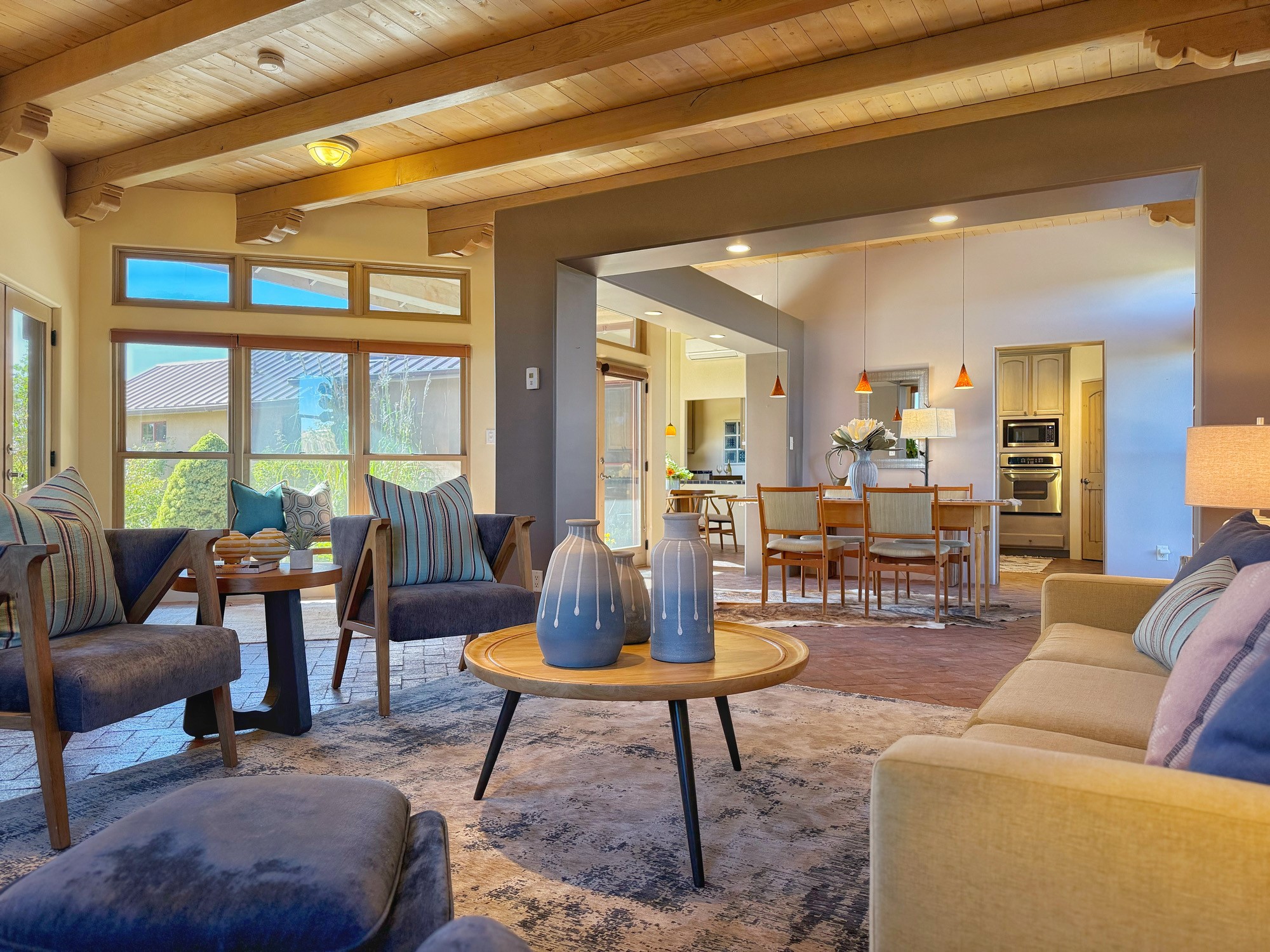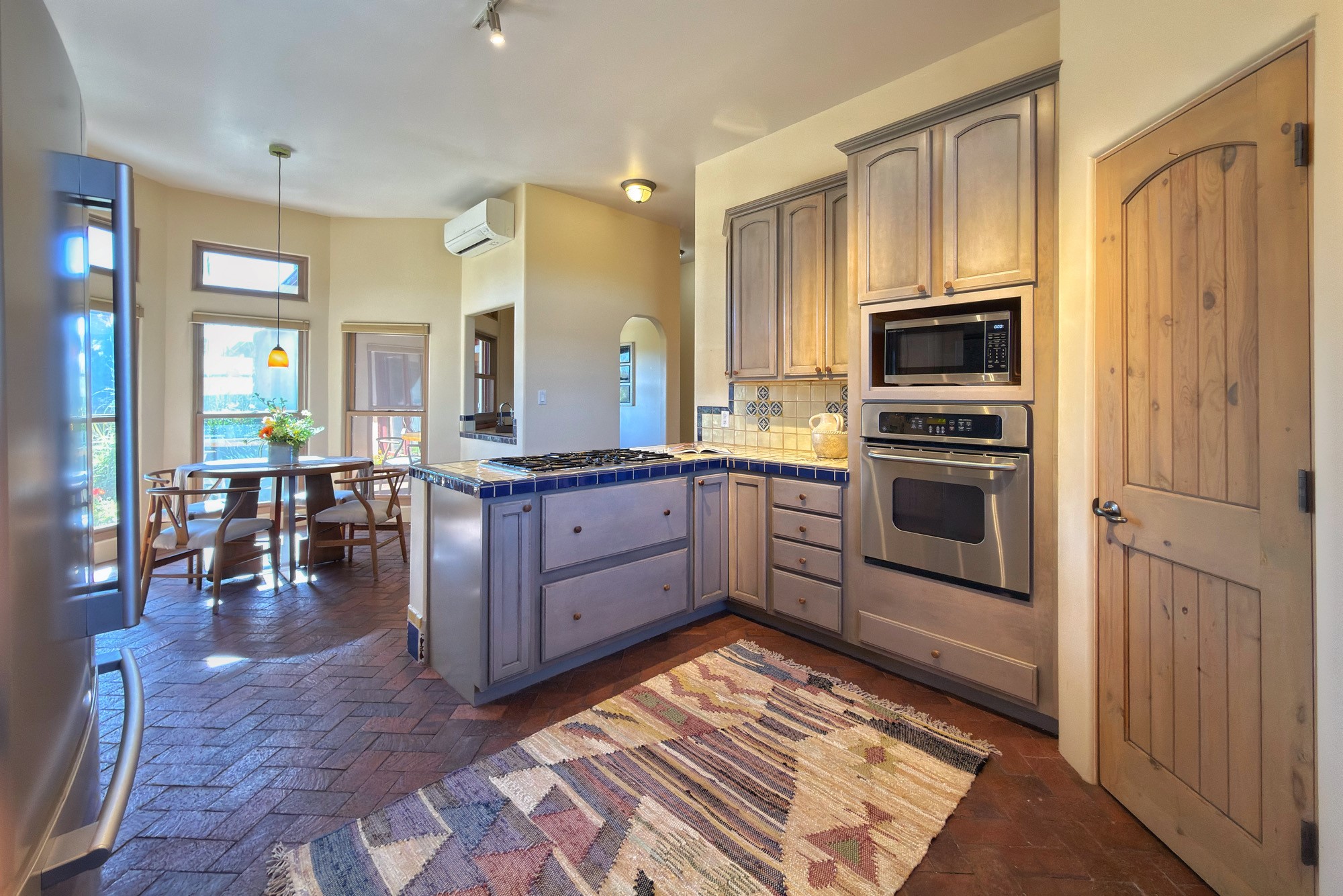This single-level home, built in 2005, offers the perfect blend of traditional Northern New Mexico architecture and modern comforts. Set on 1.44+/- acres with adjoining open space in the subdivision, the property welcomes you with lush, mature gardens and a beautiful entryway, framed by mountain views and proximity to equestrian facilities. Spanning approximately 2,272 sq. ft. the home features 3 bedrooms and 2 full baths. The spacious living room boasts high ceilings with wooden beams and corbels, a kiva fireplace, and brick floors that extend throughout. The kitchen includes stainless steel appliances, a walk-in pantry, custom cabinets, Mexican tile accents, and an eat-in breakfast nook. The primary suite is a private retreat with a generous walk-in closet and a large bathroom featuring double sinks, a jetted tub, and a separate shower. Two thoughtfully positioned guest bedrooms share a full bath with double sinks. Additional highlights include in-floor radiant heat, split units for supplemental heating and cooling and a two-car garage that offers a built-in workbench, custom cabinetry, and attic storage. Ideally located just minutes from Eldorado, this home is close to shopping, restaurants, gyms, banks, a post office, hardware stores, and pet services.