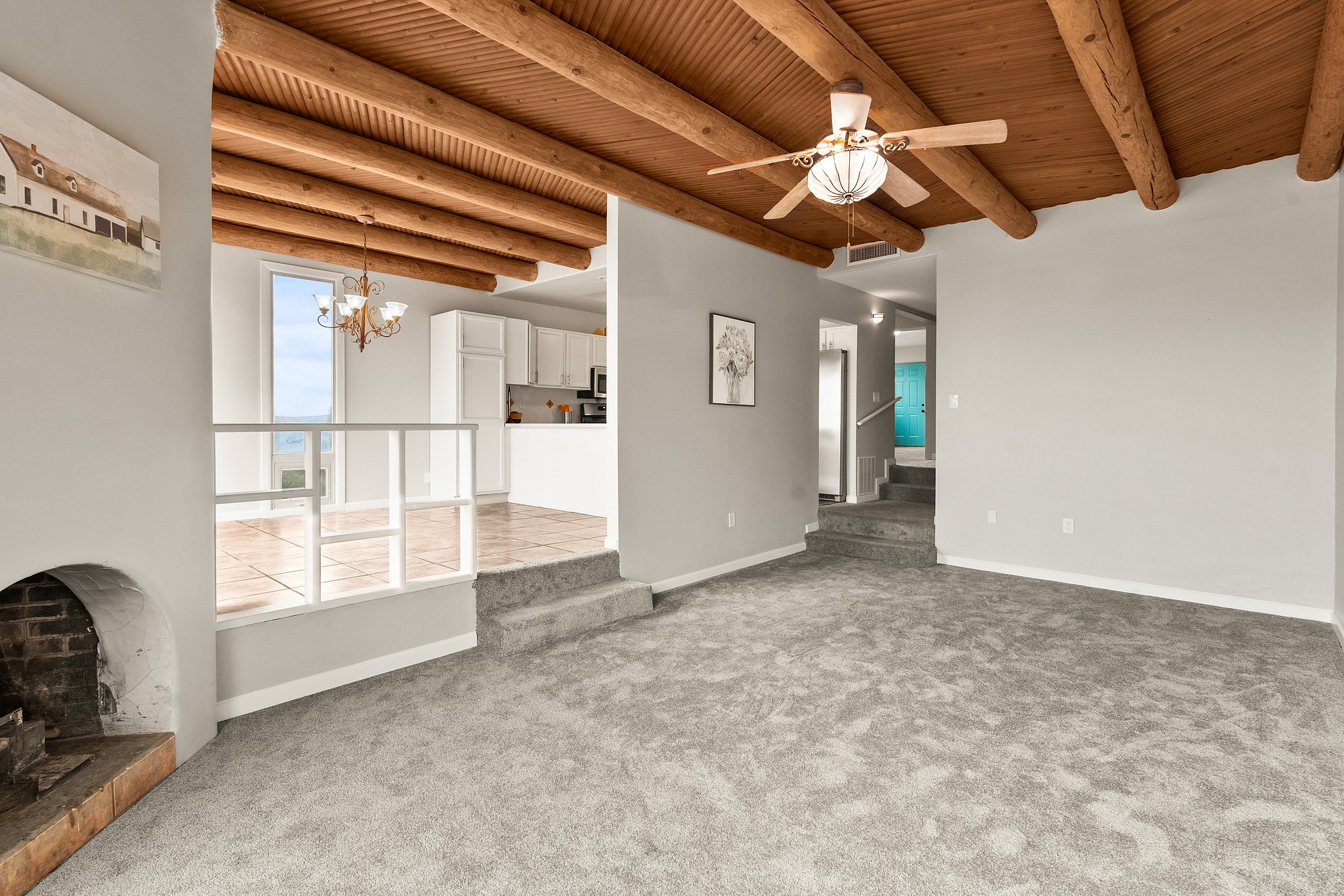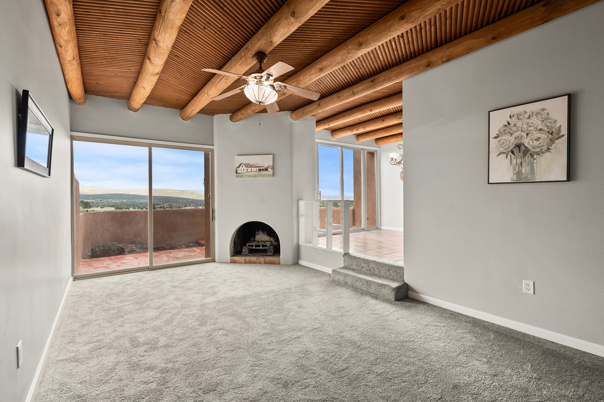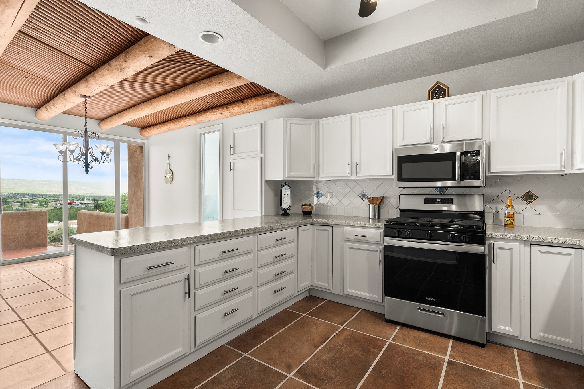 Extensively updated multi level townhome that is move in ready and on an end lot! Exterior features a new roof, new stucco, and a new swamp cooler. Inside: fresh paint, new carpet, new tile in kitchen & primary bath, updated kitchen, and new appliances. The garage features a new insulated door, epoxy floor, and fresh paint. Bathrooms have new toilets, shower fixtures, and upgraded shower door. Bright, open spaces with great natural lighting, show casing vigas, and a cozy Kiva fireplace. The spacious primary bedroom offers a walkout balcony with stunning views. Minutes from Cochiti golf course and Cochiti lake, with breathtaking skies and scenic views all around! Don't miss out on this spectacular home! Washer/dryer and pool table included. Ask for amenities list for all details.