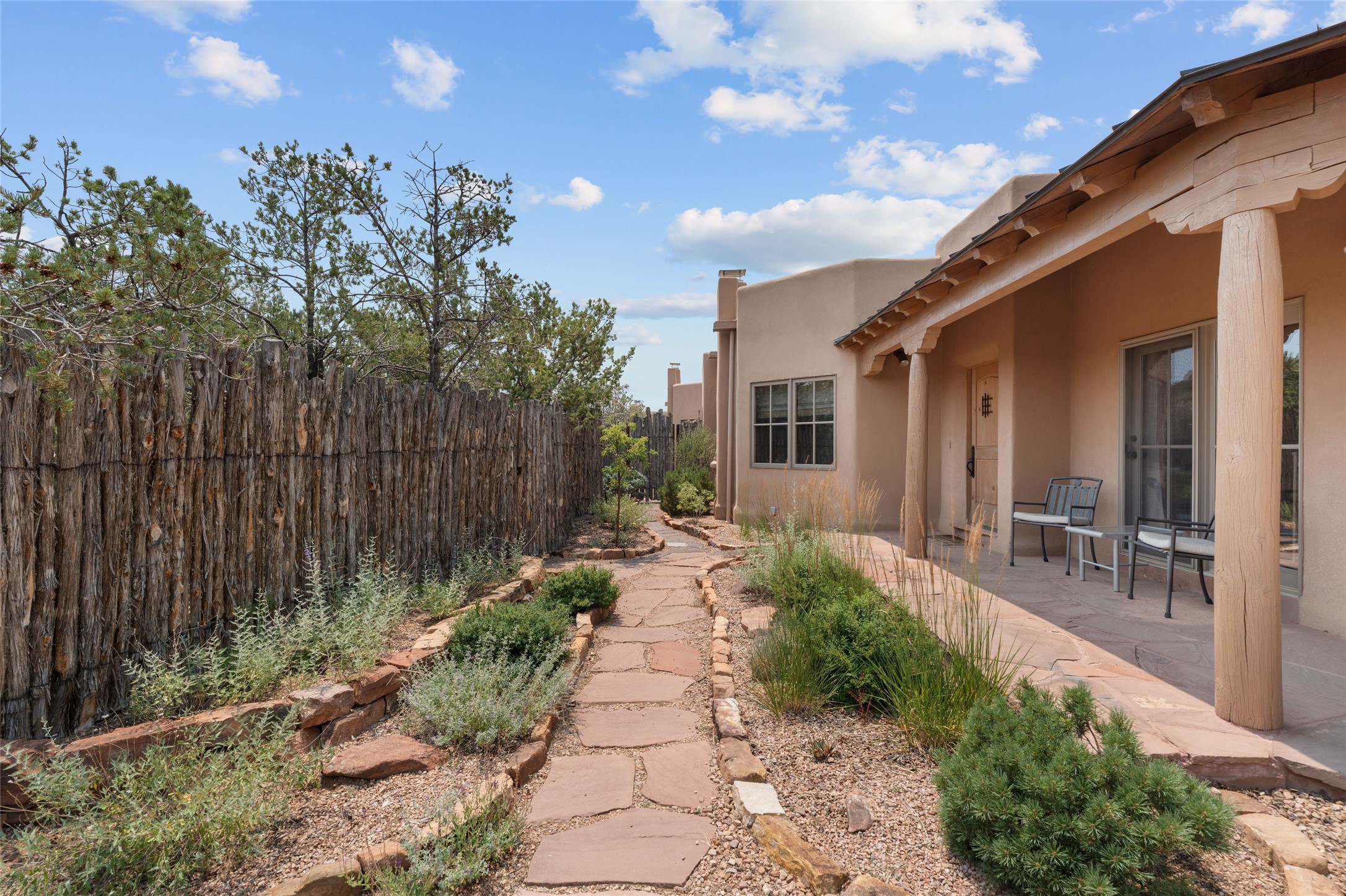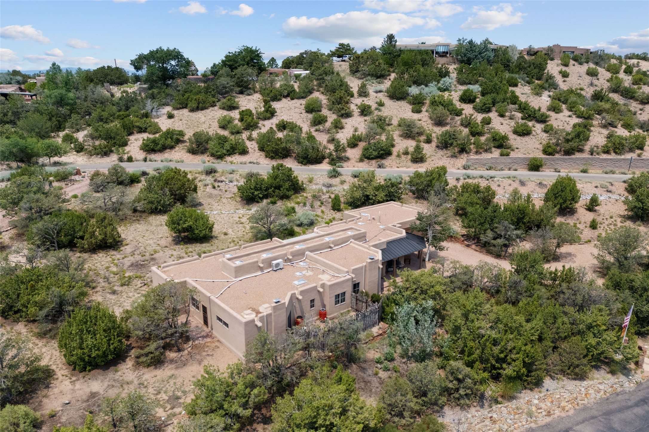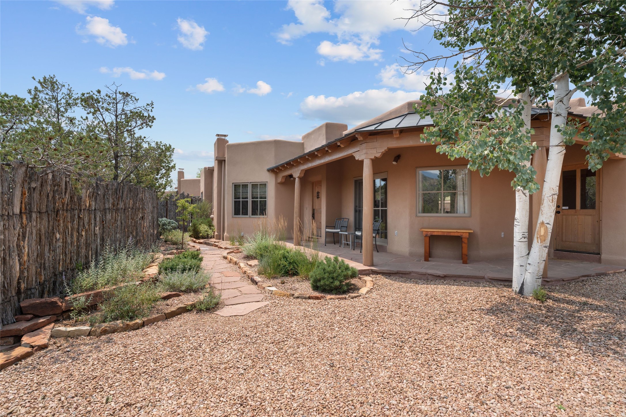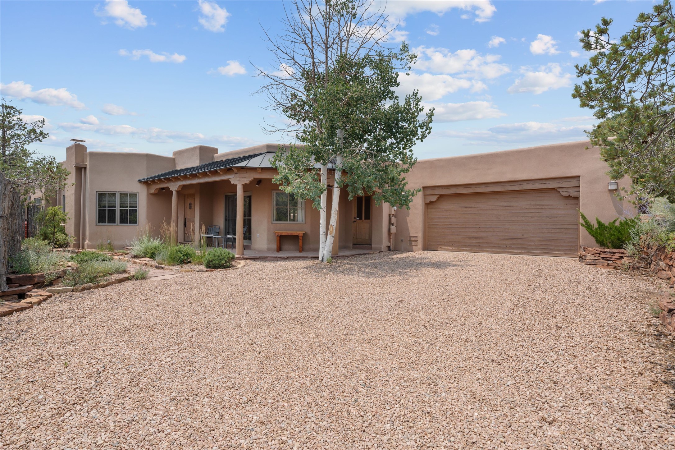 Prime Northside 3-bedroom, 2.5 home sited amidst Aspen and Pion trees with stunning views of the Sangre de Cristo Mountains. This single-level residence features no interior steps. Embracing the iconic Santa Fe style, the home showcases Saltillo tile floors, banco seating, and elegant plaster walls, complemented by traditional vigas and latillas. Two kiva fireplaces add warmth and character. The separate dining area offers captivating views of the Sangres, creating a delightful backdrop for mealtime. The updated kitchen is designed with a large island for casual seating and French doors that open to a covered patio, ideal for outdoor dining or relaxation. The primary suite features its own kiva fireplace, along with a separate office or exercise space and an outdoor patio. Additionally, the home includes a two-car garage with extra storage, enhancing convenience. Surrounded by natural landscaping, this property offers a tranquil setting while being just under two miles from the vibrant heart of downtown Santa Fe.
