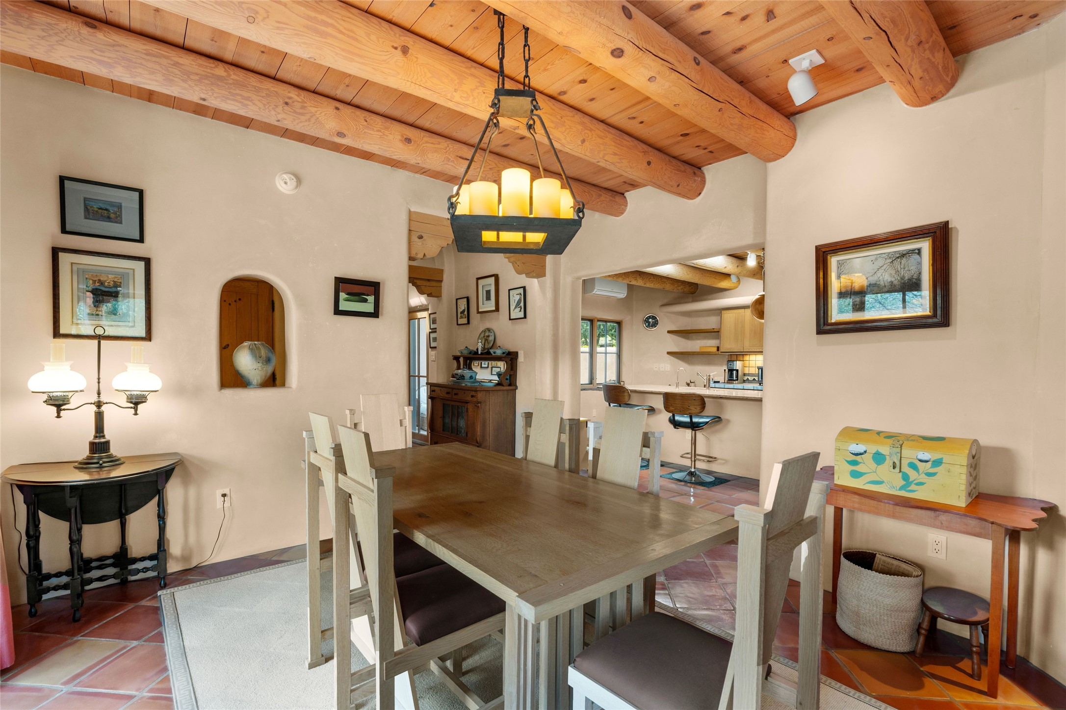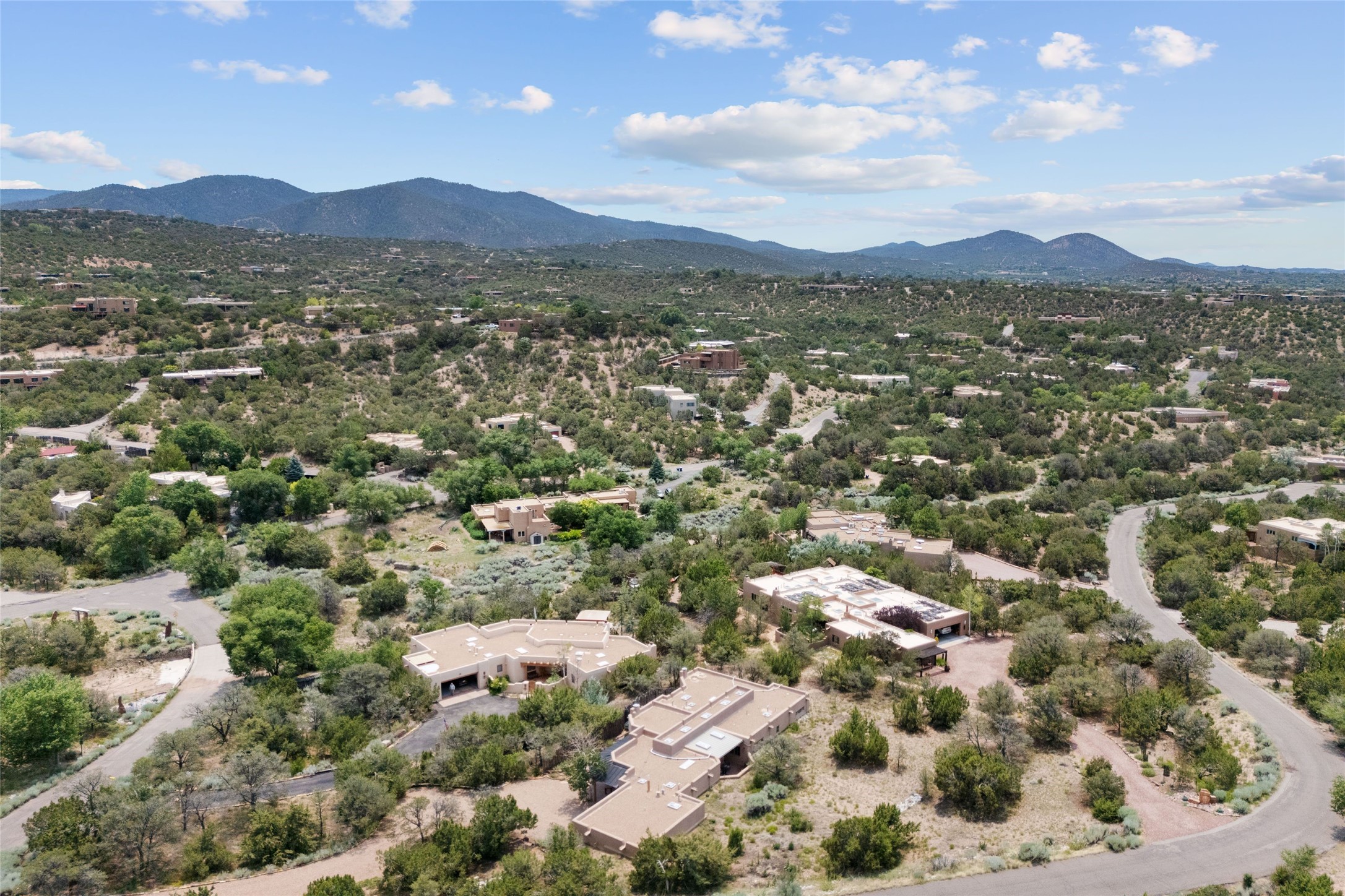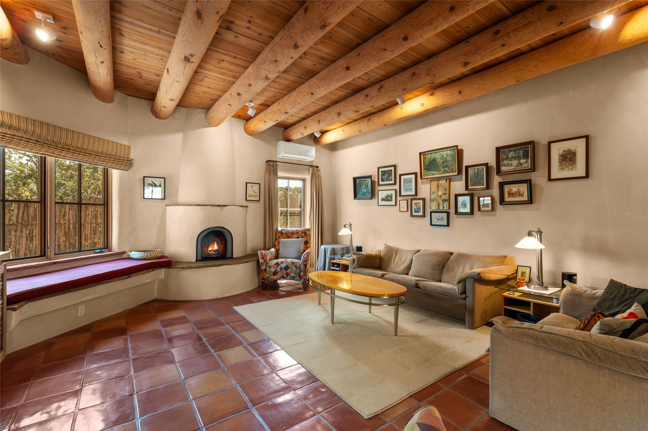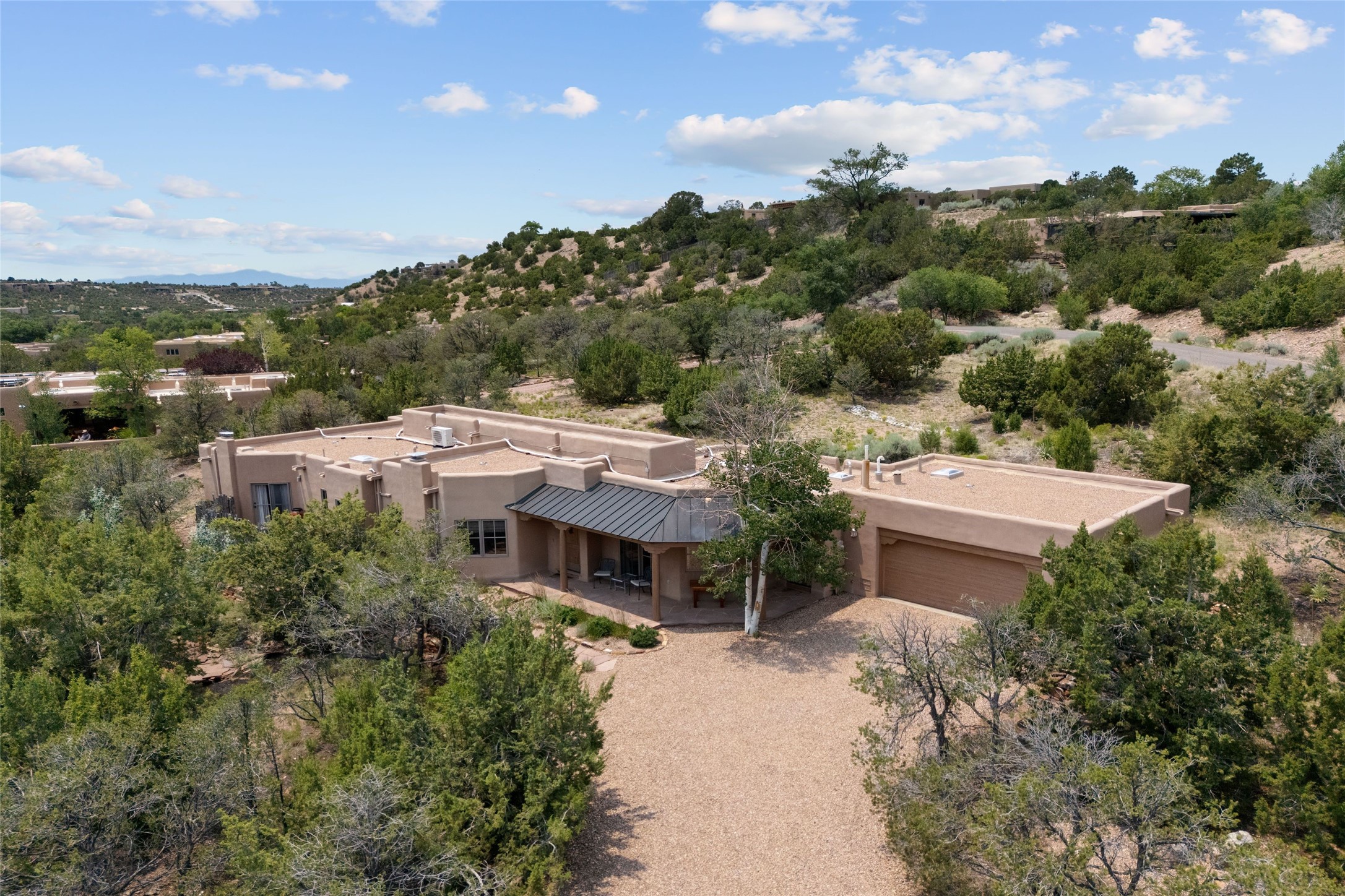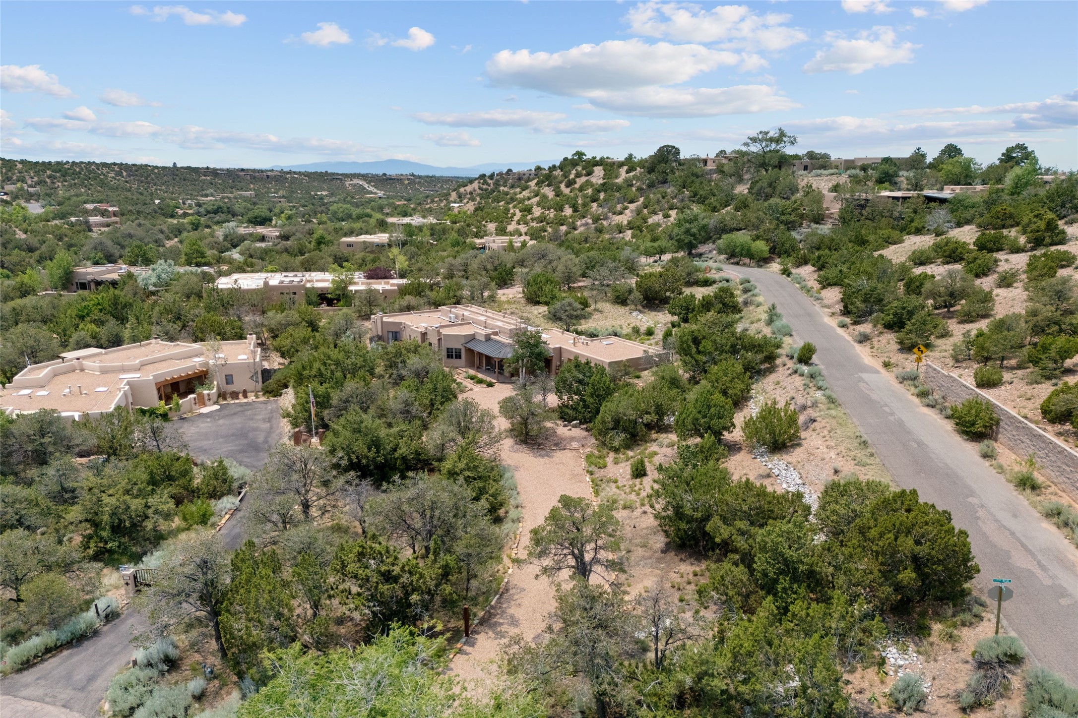 Prime Northside 3-bedroom, 2.5 home sited amidst Aspen and Pion trees with stunning views of the Sangre de Cristo Mountains. This single-level residence features no interior steps. Embracing the iconic Santa Fe style, the home showcases Saltillo tile floors, banco seating, and elegant plaster walls, complemented by traditional vigas and latillas. Two kiva fireplaces add warmth and character. The separate dining area offers captivating views of the Sangres, creating a delightful backdrop for mealtime. The updated kitchen is designed with a large island for casual seating and French doors that open to a covered patio, ideal for outdoor dining or relaxation. The primary suite features its own kiva fireplace, along with a separate office or exercise space and an outdoor patio. Additionally, the home includes a two-car garage with extra storage, enhancing convenience. Surrounded by natural landscaping, this property offers a tranquil setting while being just under two miles from the vibrant heart of downtown Santa Fe.