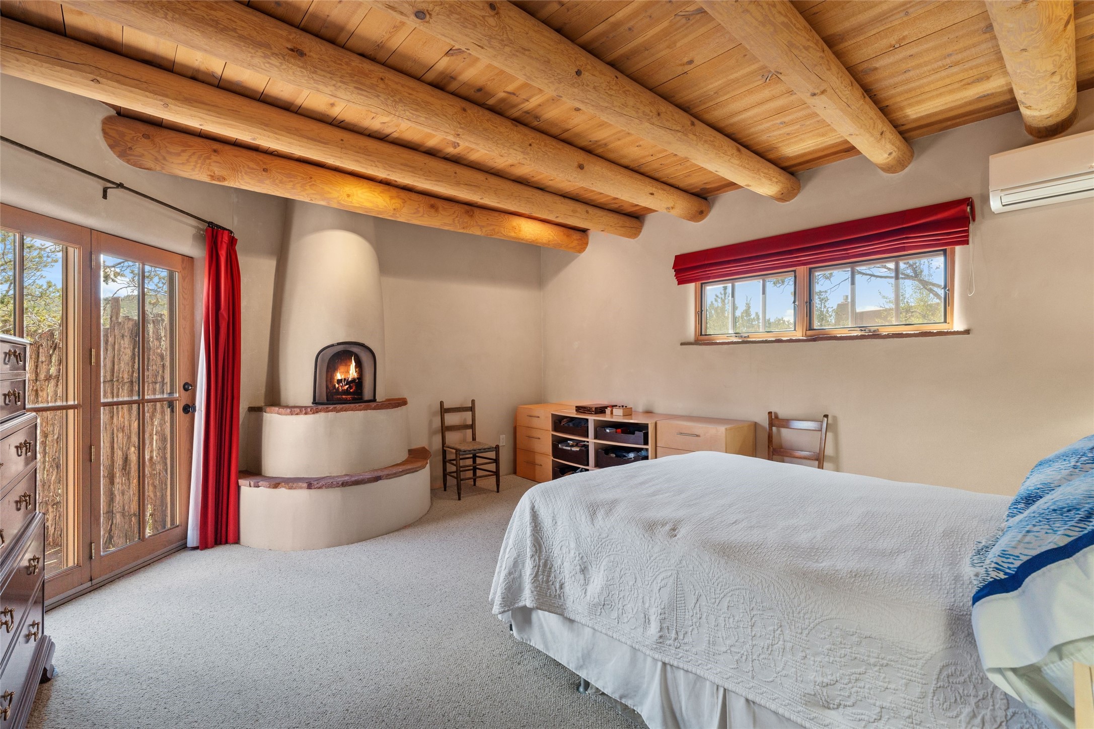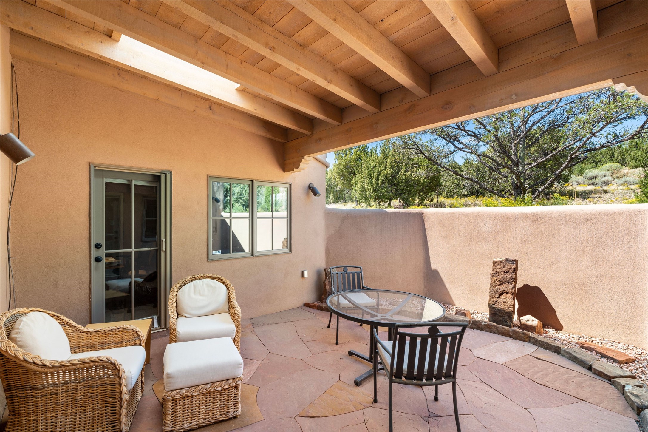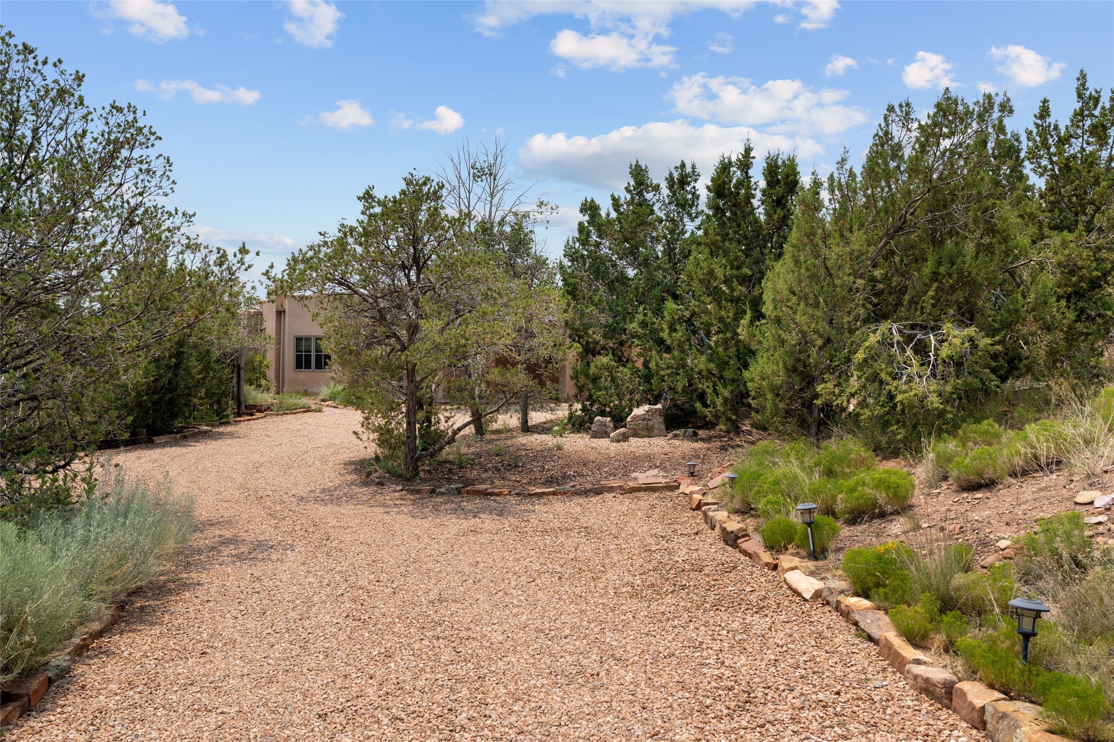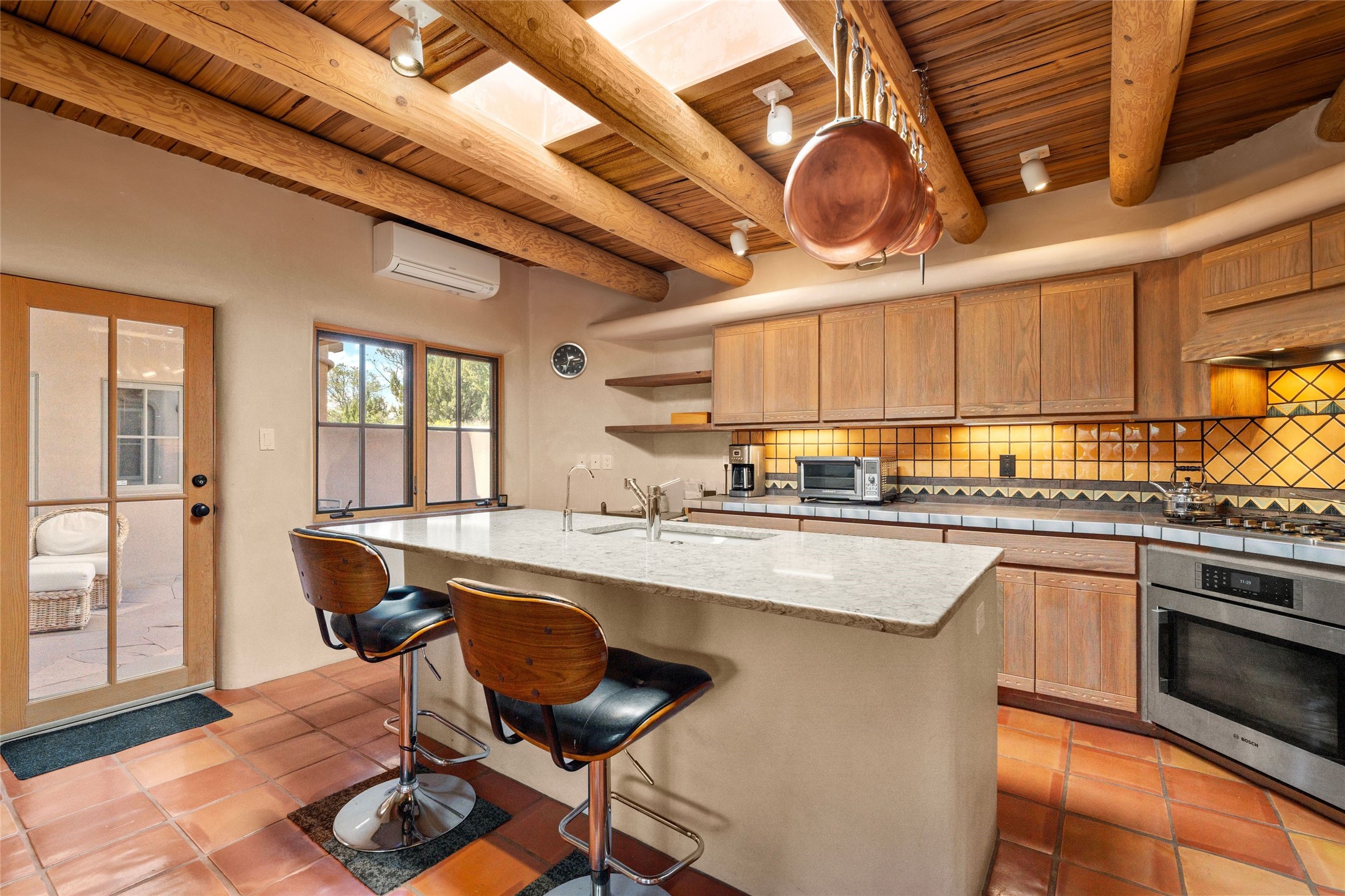 Prime Northside 3-bedroom, 2.5 home sited amidst Aspen and Pion trees with stunning views of the Sangre de Cristo Mountains. This single-level residence features no interior steps. Embracing the iconic Santa Fe style, the home showcases Saltillo tile floors, banco seating, and elegant plaster walls, complemented by traditional vigas and latillas. Two kiva fireplaces add warmth and character. The separate dining area offers captivating views of the Sangres, creating a delightful backdrop for mealtime. The updated kitchen is designed with a large island for casual seating and French doors that open to a covered patio, ideal for outdoor dining or relaxation. The primary suite features its own kiva fireplace, along with a separate office or exercise space and an outdoor patio. Additionally, the home includes a two-car garage with extra storage, enhancing convenience. Surrounded by natural landscaping, this property offers a tranquil setting while being just under two miles from the vibrant heart of downtown Santa Fe.